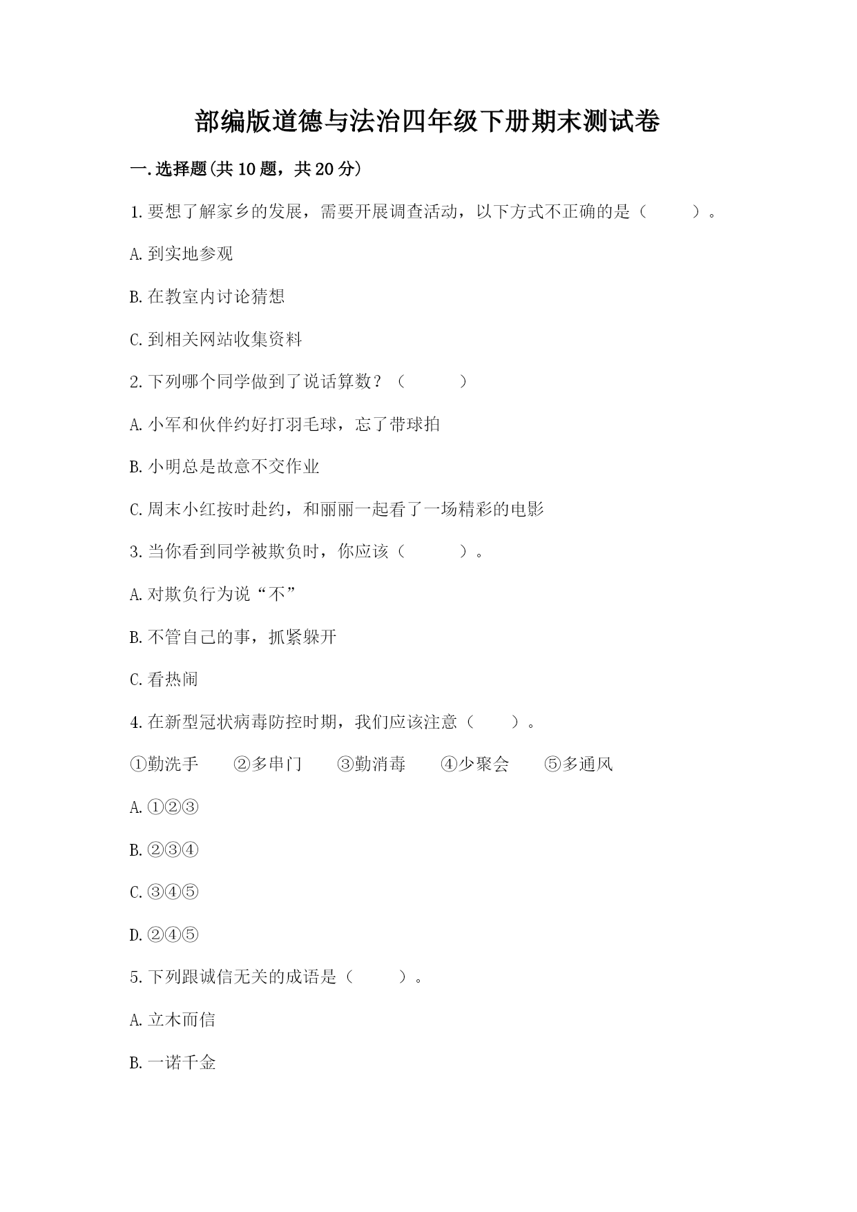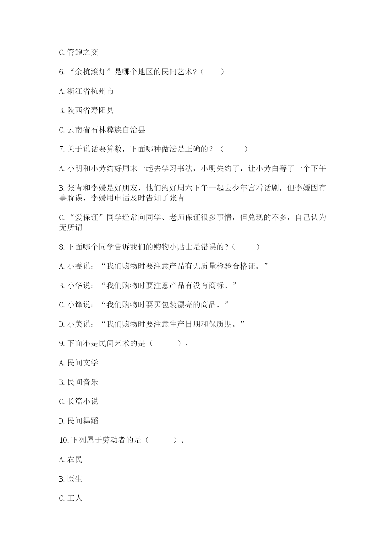 部编版道德与法治四年级下册期末测试卷 一.选择题(共10题,共20分) 1.要想了解家乡的发展,需要开展调查活动,以下方式不正确的是()。 A.到实地参观 B.在教室内讨论猜想 C.到相关网站收集资料 2.下列哪个同学做到了说话算数?() A.小军和伙伴约好打羽毛球,忘了带球拍 B.小明总是故意不交作业 C.周末小红按时赴约,和丽丽一起看了一场精彩的电影 3.当你看到同学被欺负时,你应该()。 A.对欺负行为说“不” B.不管自己的事,抓紧躲开 C.看热闹 4.在新型冠状病毒防控时期,我们应该注意()。 ①勤洗手②多串门③勤消毒④少聚会⑤多通风 A.①②③ B.②③④ C.③④⑤ D.②④⑤ 5.下列跟诚信无关的成语是()。 A.立木而信 B.一诺千金 C.管鲍之交 6.“余杭滚灯”是哪个地区的民间艺术?() A.浙江省杭州市 B.陕西省寿阳县 C.云南省石林彝族自治县 7.关于说话要算数,下面哪种做法是正确的?() A.小明和小芳约好周末一起去学习书法,小明失约了,让小芳白等了一个下午 B.张青和李媛是好朋友,他们约好周六下午一起去少年宫看话剧,但李媛因有事耽误,李媛用电话及时告知了张青 C.“爱保证”同学经常向同学、老师保证很多事情,但兑现的不多,自己认为无所谓 8.下面哪个同学告诉我们的购物小贴士是错误的?() A.小雯说:“我们购物时要注意产品有无质量检验合格证。” B.小华说:“我们购物时要注意产品有没有商标。” C.小锋说:“我们购物时要买包装漂亮的商品。” D.小美说:“我们购物时要注意生产日期和保质期。” 9.下面不是民间艺术的是()。 A.民间文学 B.民间音乐 C.长篇小说 D.民间舞蹈 10.下列属于劳动者的是()。 A.农民 B.医生 C.工人 D.以上都是 二.填空题(共10题,共28分) 1.民间艺术的组成部分包括()、()、()、民间美术、民间手工艺等。 2.学会(),根据实际需求合理消费,是拥有健康生活的重要条件。 3.在校外受到欺负时,首先要想到(),不能蛮干。 4.购买食品时,看好()日期和()期,尽量购买绿色、天然的产品。 5.要对别人说话算数,也要对()说话算数。 6.说到做到是一个人()的重要标志,一旦对他人做出保证就要想办法尽力完成。 7.民间艺术的产生和发展离不开()的聪明才智。 8.购物时需要()。 9.我们家庭中的成员每天都会接受来自各行各业劳动者的()。 10.农历五月初五是()节,民间有戴香包,(),赛龙舟的习俗。 三.判断题(共10题,共20分) 1.我们要坚持对别人说到做到,对自己就不用那么认真了。() 2.“十里不同风,百里不同俗。”这句话的意思是说不同地区的风俗习惯都一样。() 3.各行各业的劳动者每天辛勤地劳动,为我们的生活提供服务。() 4.我们只有用心对待别人,帮助别人,才能够交到好朋友。() 5.对别人说话不算数没关系,对自己说话一定要算数。() 6.小谭总是把过错推卸给别人,这样做不会影响自己交朋友。() 7.合理的开支就是一味省钱。() 8.在我国传统文化中,蕴含着许多劝导人们为人处世要讲信用的教诲。() 9.中国制造固然值得骄傲,但还不够,更需要中国创造。() 10.所有商品包装上一般只有有厂名厂址、使用说明、生产日期这些商品信息。() 四.连线题(共1题,共4分) 1.快乐连连看。 中秋节饺子 端午节元宵 元宵节粽子 春节月饼 五.填表题(共1题,共12分) 1.填表题。 六.简答题(共6题,共32分) 1.请你说一说发票的重要性。 2.说一说种植业给人们的生活带来了什么。 3.你有什么想要的东西,说一说你的心愿,并分析一下这个心愿对于自己的家庭支出来说是否合理。 4.商家是否有权搜查顾客的身体或背包?为什么? 5.在学校生活四年了,我交到了不少朋友哟!我的交友小秘诀:(至少两条) 处小秘诀: 当朋友有困难时,我愿尽力帮助。 当朋友犯错误时,我()。 当朋友()时,我()。 6.请你说一说合理消费的好处。 七.辨析题(共1题,共8分) 1.今年春节,三个小伙伴讨论让父母买过年的礼物。小红:今年流行蓝色派克服,我想买一件,穿上别人准羡慕。小强:我同桌有双名牌旅游鞋,我也要买一双,穿上准帅气。小雯:我的书包坏了,我想买一个价格不贵,但好看点的书包。你认为谁的购物要求更合理些?为什么? 八.材料题(共1题,共4分) 1.小明在去姥姥家的小路上,被三个六年级的学生堵住了,其中一个冲着他喊:“嘿,小子,有钱吗?”小明说:“没有”!另一个男孩对于同伴使了一个眼色,说道:“搜他”! 如果你是小明,你应该怎么办? 九.综合题(共3题,共17分) 1.今天我们和小丽在一起吃饭,妈妈说要多点一些菜,不要让人家说我们小气。你想对妈妈说些什么呢? 2. 想到朋友,很多同学