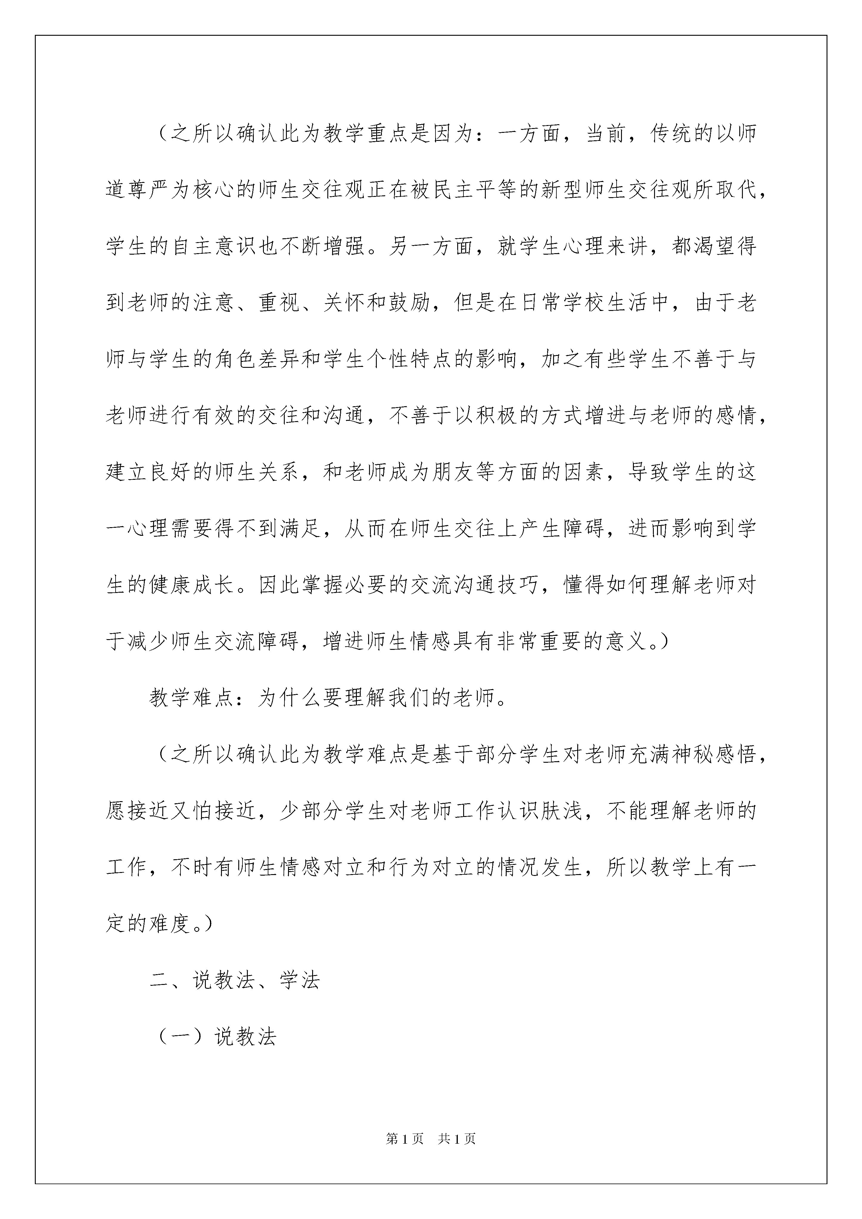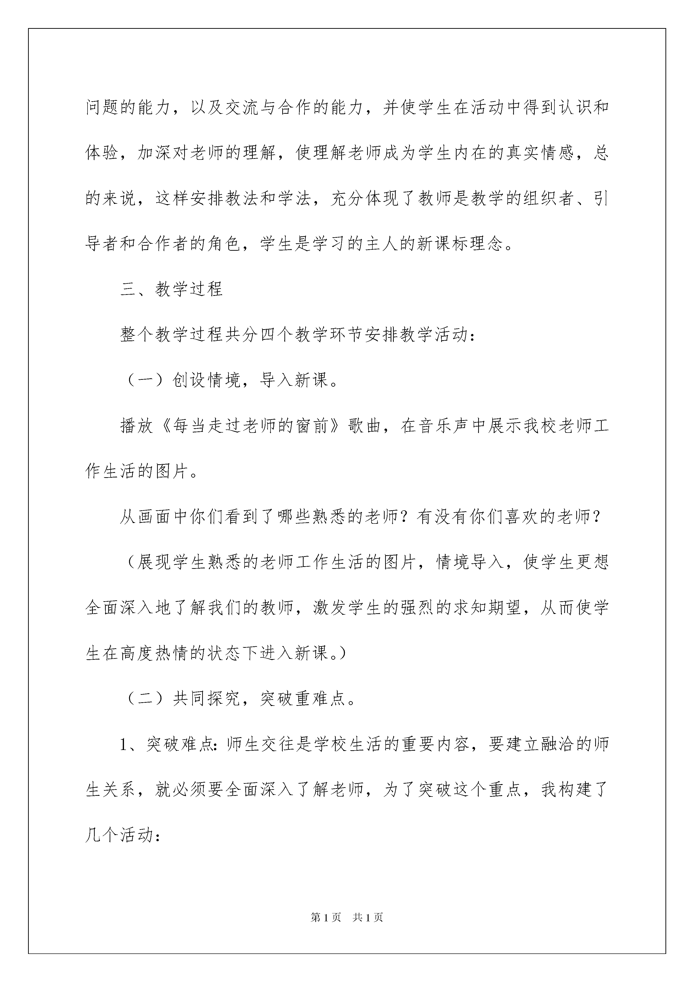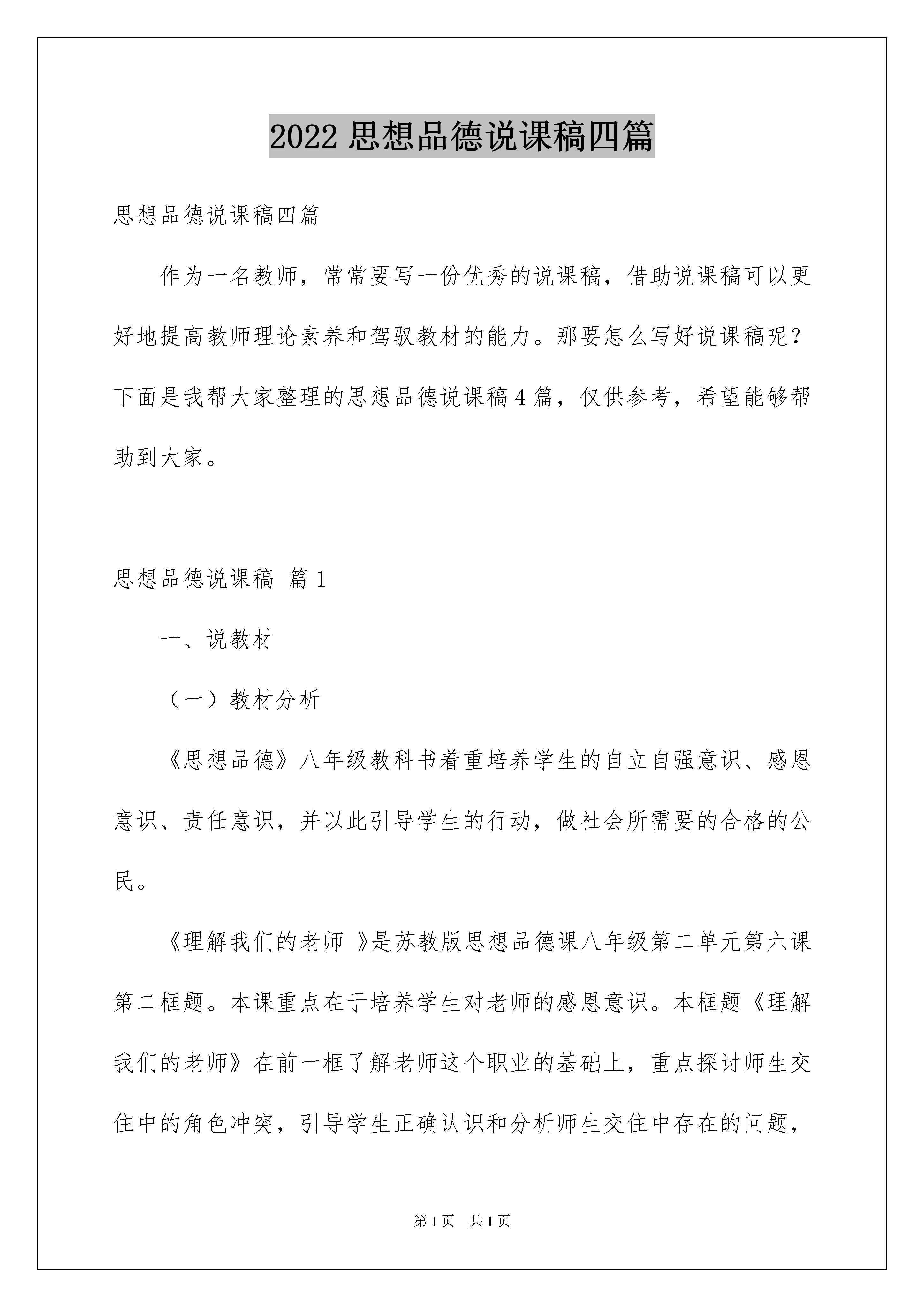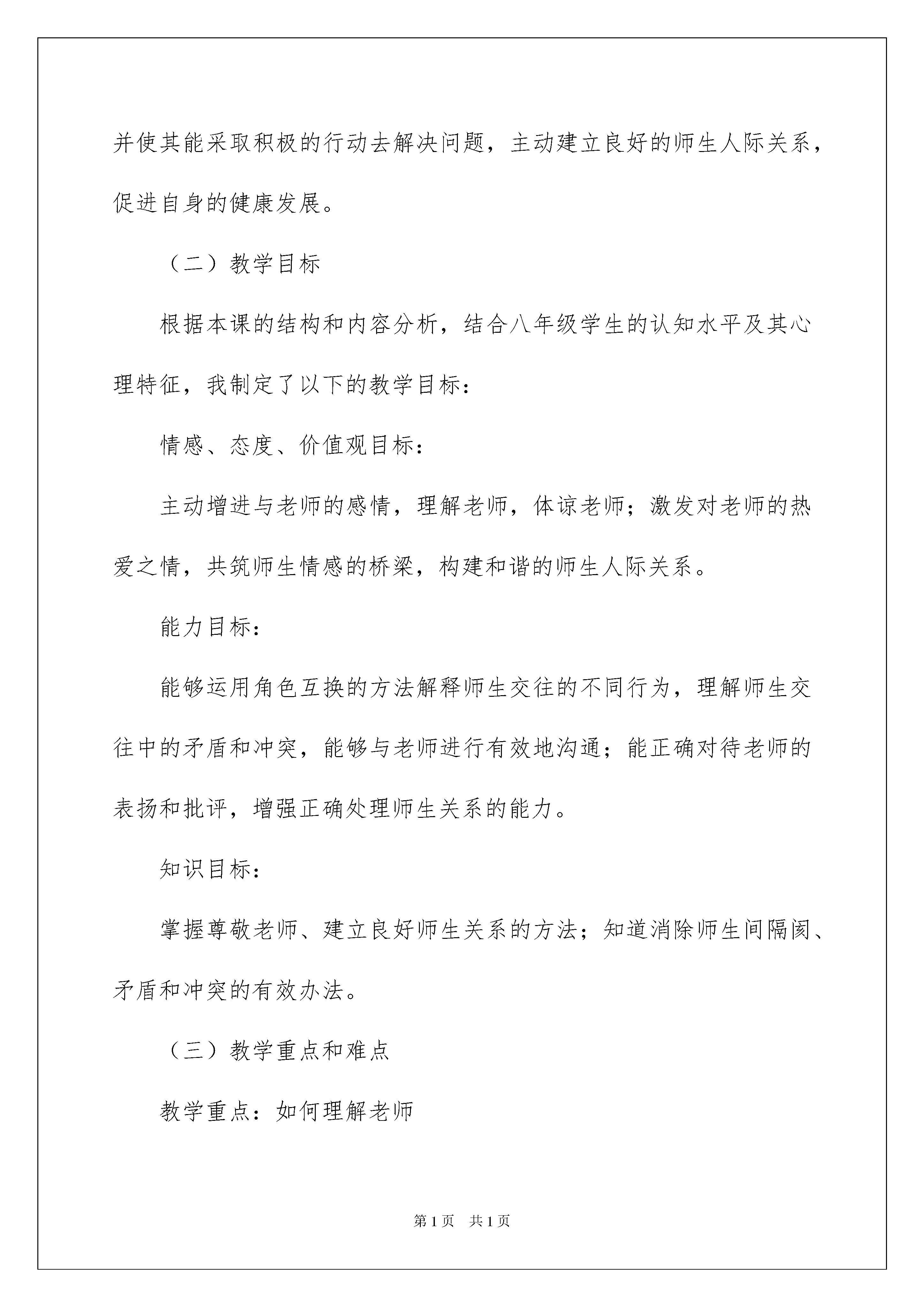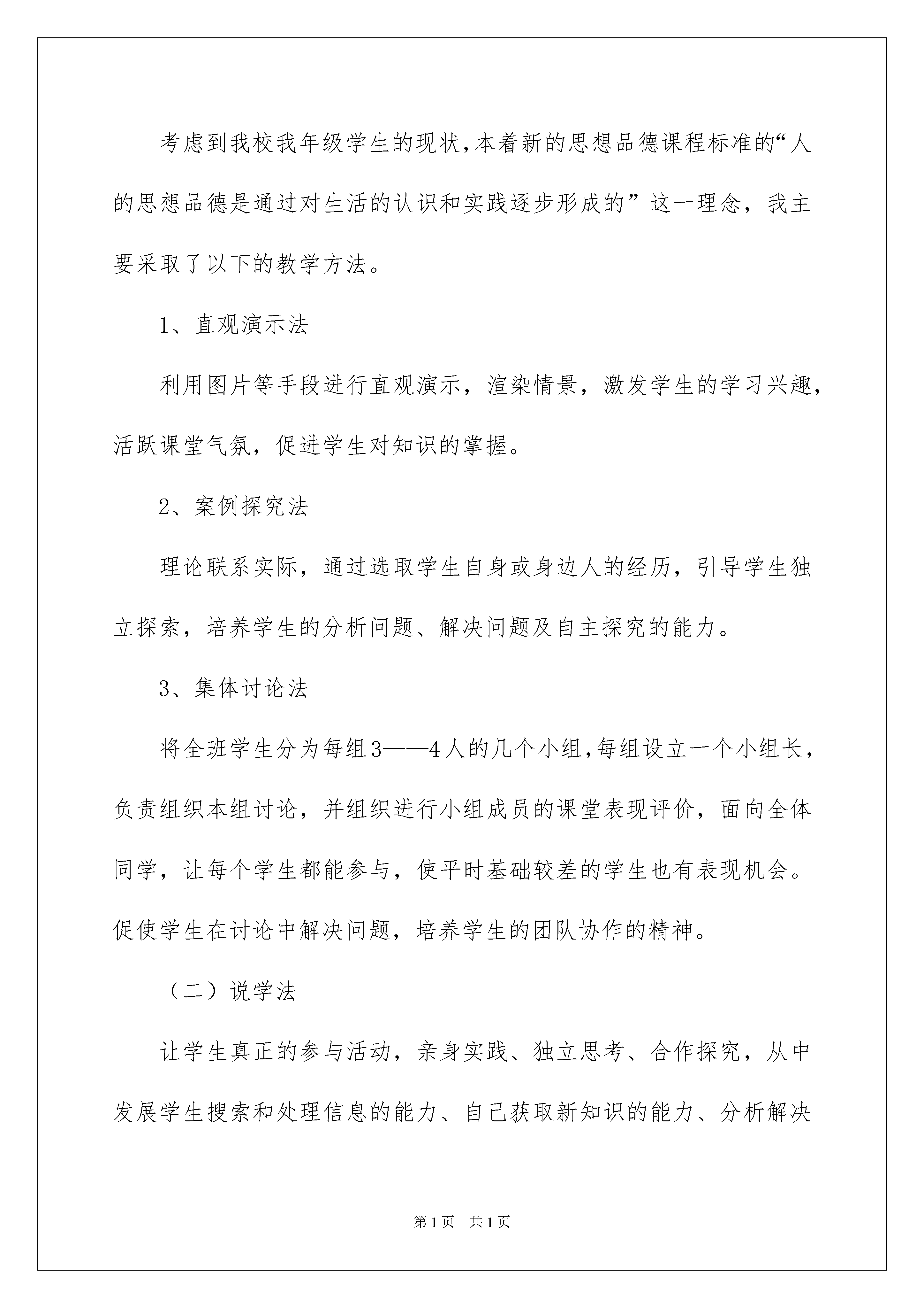 2022思想品德说课稿四篇思想品德说课稿四篇作为一名教师,常常要写一份优秀的说课稿,借助说课稿可以更好地提高教师理论素养和驾驭教材的能力。那要怎么写好说课稿呢?下面是我帮大家整理的思想品德说课稿4篇,仅供参考,希望能够帮助到大家。思想品德说课稿篇1一、说教材(一)教材分析《思想品德》八年级教科书着重培养学生的自立自强意识、感恩意识、责任意识,并以此引导学生的行动,做社会所需要的合格的公民。《理解我们的老师》是苏教版思想品德课八年级第二单元第六课第二框题。本课重点在于培养学生对老师的感恩意识。本框题《理解我们的老师》在前一框了解老师这个职业的基础上,重点探讨师生交住中的角色冲突,引导学生正确认识和分析师生交住中存在的问题,并使其能采取积极的行动去解决问题,主动建立良好的师生人际关系,促进自身的健康发展。(二)教学目标根据本课的结构和内容分析,结合八年级学生的认知水平及其心理特征,我制定了以下的教学目标:情感、态度、价值观目标:主动增进与老师的感情,理解老师,体谅老师;激发对老师的热爱之情,共筑师生情感的桥梁,构建和谐的师生人际关系。能力目标:能够运用角色互换的方法解释师生交往的不同行为,理解师生交往中的矛盾和冲突,能够与老师进行有效地沟通;能正确对待老师的表扬和批评,增强正确处理师生关系的能力。知识目标:掌握尊敬老师、建立良好师生关系的方法;知道消除师生间隔阂、矛盾和冲突的有效办法。(三)教学重点和难点教学重点:如何理解老师(之所以确认此为教学重点是因为:一方面,当前,传统的以师道尊严为核心的师生交往观正在被民主平等的新型师生交往观所取代,学生的自主意识也不断增强。另一方面,就学生心理来讲,都渴望得到老师的注意、重视、关怀和鼓励,但是在日常学校生活中,由于老师与学生的角色差异和学生个性特点的影响,加之有些学生不善于与老师进行有效的交往和沟通,不善于以积极的方式增进与老师的感情,建立良好的师生关系,和老师成为朋友等方面的因素,导致学生的这一心理需要得不到满足,从而在师生交往上产生障碍,进而影响到学生的健康成长。因此掌握必要的交流沟通技巧,懂得如何理解老师对于减少师生交流障碍,增进师生情感具有非常重要的意义。)教学难点:为什么要理解我们的老师。(之所以确认此为教学难点是基于部分学生对老师充满神秘感悟,愿接近又怕接近,少部分学生对老师工作认识肤浅,不能理解老师的工作,不时有师生情感对立和行为对立的情况发生,所以教学上有一定的难度。)二、说教法、学法(一)说教法考虑到我校我年级学生的现状,本着新的思想品德课程标准的“人的思想品德是通过对生活的认识和实践逐步形成的”这一理念,我主要采取了以下的教学方法。1、直观演示法利用图片等手段进行直观演示,渲染情景,激发学生的学习兴趣,活跃课堂气氛,促进学生对知识的掌握。2、案例探究法理论联系实际,通过选取学生自身或身边人的经历,引导学生独立探索,培养学生的分析问题、解决问题及自主探究的能力。3、集体讨论法将全班学生分为每组3——4人的几个小组,每组设立一个小组长,负责组织本组讨论,并组织进行小组成员的课堂表现评价,面向全体同学,让每个学生都能参与,使平时基础较差的学生也有表现机会。促使学生在讨论中解决问题,培养学生的团队协作的精神。(二)说学法让学生真正的参与活动,亲身实践、独立思考、合作探究,从中发展学生搜索和处理信息的能力、自己获取新知识的能力、分析解决问题的能力,以及交流与合作的能力,并使学生在活动中得到认识和体验,加深对老师的理解,使理解老师成为学生内在的真实情感,总的来说,这样安排教法和学法,充分体现了教师是教学的组织者、引导者和合作者的角色,学生是学习的主人的新课标理念。三、教学过程整个教学过程共分四个教学环节安排教学活动:(一)创设情境,导入新课。播放《每当走过老师的窗前》歌曲,在音乐声中展示我校老师工作生活的图片。从画面中你们看到了哪些熟悉的老师?有没有你们喜欢的老师?(展现学生熟悉的老师工作生活的图片,情境导入,使学生更想全面深入地了解我们的教师,激发学生的强烈的求知期望,从而使学生在高度热情的状态下进入新课。)(二)共同探究,突破重难点。1、突破难点:师生交往是学校生活的重要内容,要建立融洽的师生关系,就必须要全面深入了解老师,为了突破这个重点,我构建了几个活动:活动一:实话实说:(1)你喜欢什么样的老师?(2)说说与老师在交往中的烦恼事思考:当老师不符合你心目中好老师标准时,你心理是什么感觉?那么老师为什么要跟学生过不去,不做我们心目中的好老师呢(通过活动让学生亲自参与,在体验的过程中进行了思考和认知,有助于提高学生的兴趣