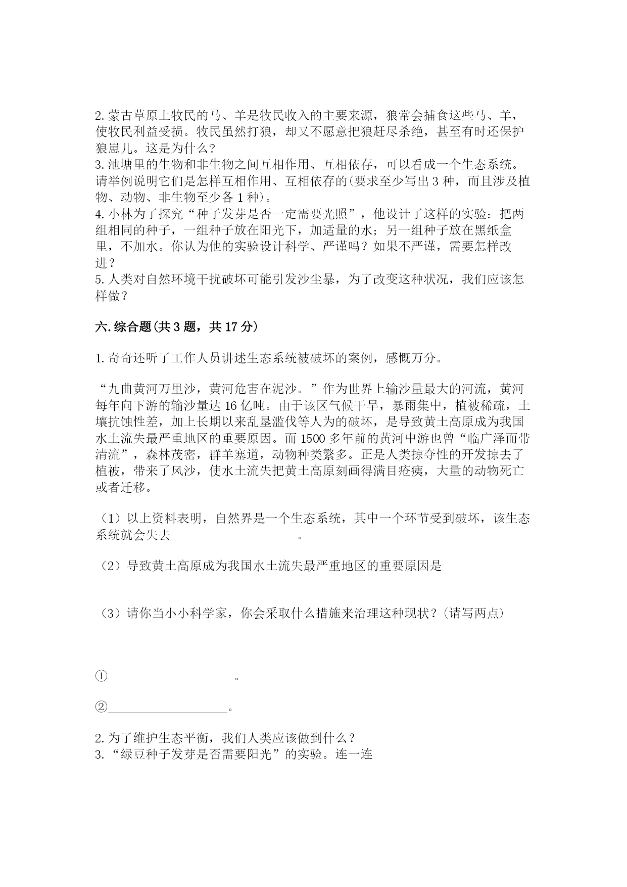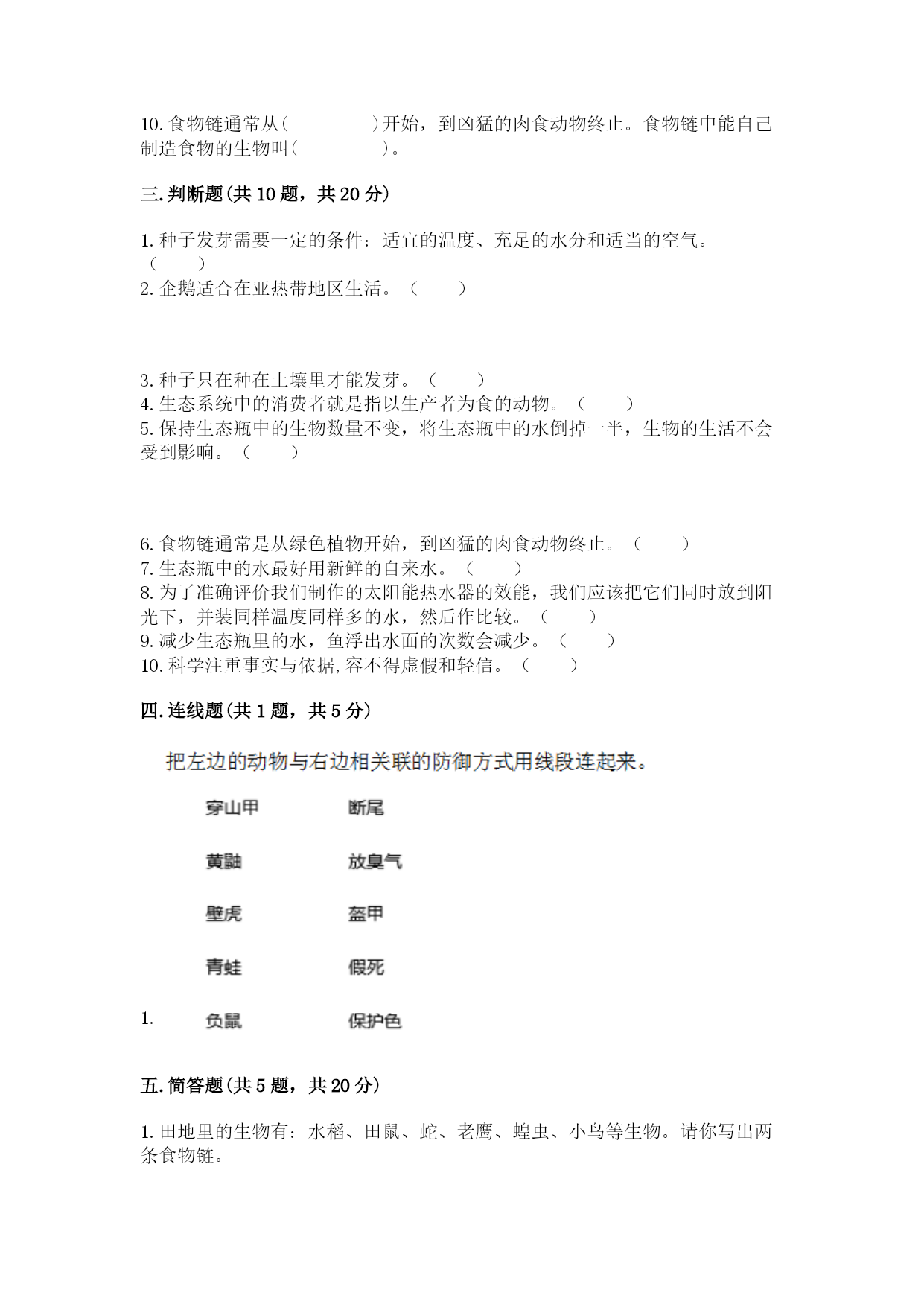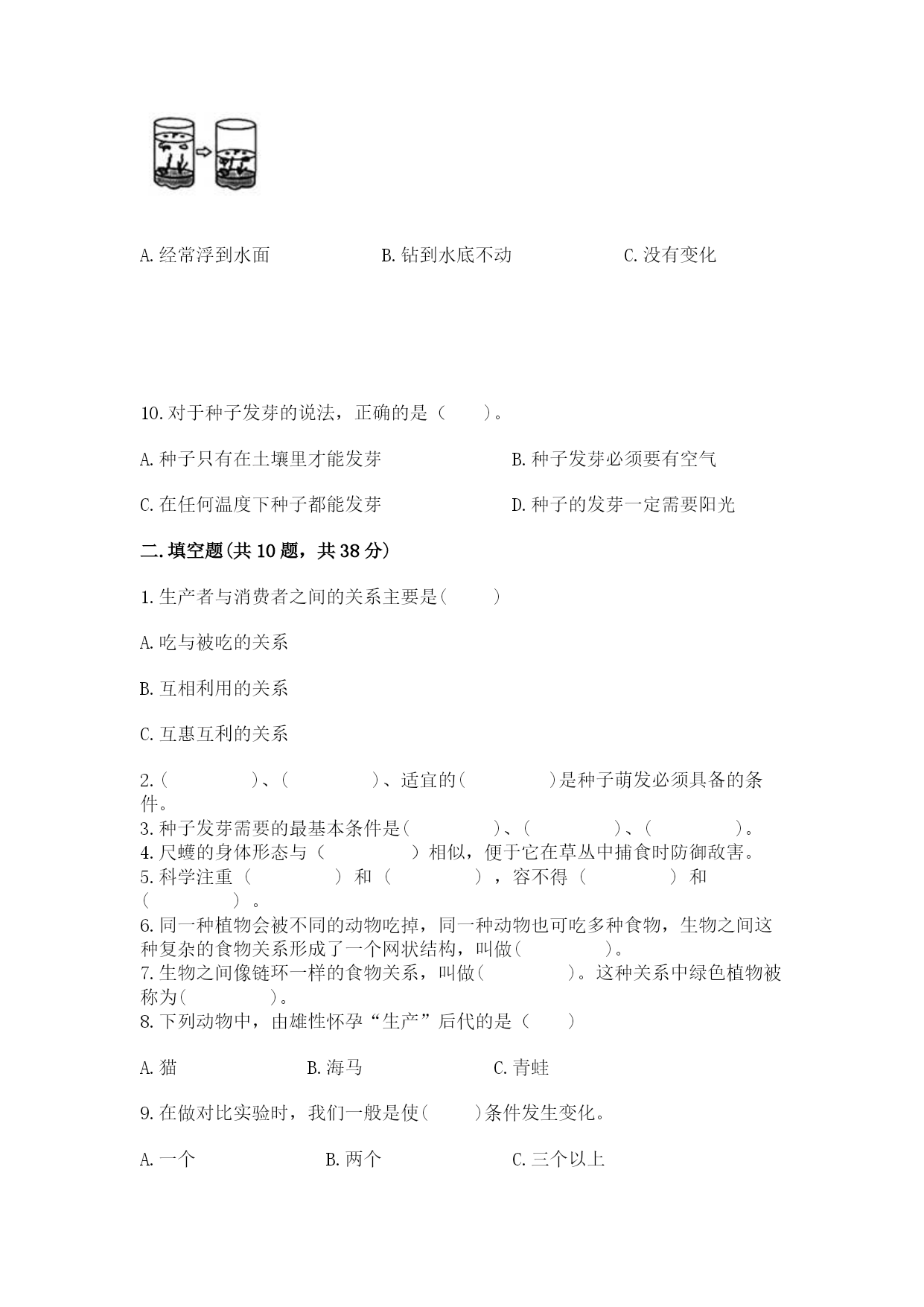教科版科学五年级下册第一单元《生物与环境》测试卷 一.选择题(共10题,共30分) 1.(1)什么是沙尘暴?沙尘暴的起因是什么? (2)为了保持草原生态系统的平衡,人类应该禁止的行为有哪些?(至少写出3条) 2.对种子发芽说法正确的是()。 A.种子只有在土壤里才会发芽 B.在任何温度下都会发芽 C.种子发芽必须要有空气 3.实验一:种子发芽实验 实验器材:一次性水杯,纸巾、纸盒、完好具有活性的种子 实验步骤: ①准备好6个水杯,每个水杯都放好纸巾(中间挖两个洞)贴上标签 ②将若干相同数量的种子放入洞中 ③6个水杯中,1号杯不加水,其余的都滴上适量的水。 ④3号杯加水至完全淹没种子。 ⑤将5号杯放入冰箱中,用纸箱罩住6号杯,放在温暖处。 ⑥将1号杯和2号杯,3号杯和4号杯,5号杯和6号杯进行对比。 实验现象:号杯中种子不发芽,种子发芽。 实验结论:种子发芽需要、和。 4.下列几个环境因素中,对于蚕豆种子萌发有较大影响的是()。 A.光照的强弱 B.土壤的肥沃程度 C.温度的高低 5.如果在实验中观察到()现象,能说明绿豆种子发芽与水无关。 A.水浸泡过的绿豆种子大多数发芽了,没被浸泡过的种子没有发芽 B.不管是否被水浸泡过,温暖地方的绿豆种子绝大多数发芽了 C.水浸泡过的绿豆种子没有发芽,没被水浸泡过的种子绝大多数发芽了 6.绿豆种子发芽需要的最基本条件有()。 A.光照、水分、温度、空气和土壤 B.一定的水分、适宜的温度和空气 C.光照、水分、温度和空气 7.制作生态瓶的正确顺序是() ①在瓶中种上水草,在水面放上浮萍 ②植物存活后,放入小鱼、小虾等小动物 ③找一个透明的大塑料瓶,洗干净后减去上半部分 ④在瓶的底部铺上一层干净的沙子,再装入大半瓶水。 A.④②①③B.③④②①C.③④①② 8.生产者与消费者之间的关系主要是()。 A.互惠互利的关系 B.吃与被吃的关系 C.相互竞争的关系 9.如图所示,把生态瓶中的水减少很多,瓶中动物最有可能会() A.经常浮到水面B.钻到水底不动C.没有变化 10.对于种子发芽的说法,正确的是()。 A.种子只有在土壤里才能发芽B.种子发芽必须要有空气 C.在任何温度下种子都能发芽D.种子的发芽一定需要阳光 二.填空题(共10题,共38分) 1.生产者与消费者之间的关系主要是() A.吃与被吃的关系 B.互相利用的关系 C.互惠互利的关系 2.()、()、适宜的()是种子萌发必须具备的条件。 3.种子发芽需要的最基本条件是()、()、()。 4.尺蠖的身体形态与()相似,便于它在草丛中捕食时防御敌害。 5.科学注重()和(),容不得()和()。 6.同一种植物会被不同的动物吃掉,同一种动物也可吃多种食物,生物之间这种复杂的食物关系形成了一个网状结构,叫做()。 7.生物之间像链环一样的食物关系,叫做()。这种关系中绿色植物被称为()。 8.下列动物中,由雄性怀孕“生产”后代的是() A.猫B.海马C.青蛙 9.在做对比实验时,我们一般是使()条件发生变化。 A.一个B.两个C.三个以上 10.食物链通常从()开始,到凶猛的肉食动物终止。食物链中能自己制造食物的生物叫()。 三.判断题(共10题,共20分) 1.种子发芽需要一定的条件:适宜的温度、充足的水分和适当的空气。() 2.企鹅适合在亚热带地区生活。() 3.种子只在种在土壤里才能发芽。() 4.生态系统中的消费者就是指以生产者为食的动物。() 5.保持生态瓶中的生物数量不变,将生态瓶中的水倒掉一半,生物的生活不会受到影响。() 6.食物链通常是从绿色植物开始,到凶猛的肉食动物终止。() 7.生态瓶中的水最好用新鲜的自来水。() 8.为了准确评价我们制作的太阳能热水器的效能,我们应该把它们同时放到阳光下,并装同样温度同样多的水,然后作比较。() 9.减少生态瓶里的水,鱼浮出水面的次数会减少。() 10.科学注重事实与依据,容不得虚假和轻信。() 四.连线题(共1题,共5分) 1. 五.简答题(共5题,共20分) 1.田地里的生物有:水稻、田鼠、蛇、老鹰、蝗虫、小鸟等生物。请你写出两条食物链。 2.蒙古草原上牧民的马、羊是牧民收入的主要来源,狼常会捕食这些马、羊,使牧民利益受损。牧民虽然打狼,却又不愿意把狼赶尽杀绝,甚至有时还保护狼崽儿。这是为什么? 3.池塘里的生物和非生物之间互相作用、互相依存,可以看成一个生态系统。请举例说明它们是怎样互相作用、互相依存的(要求至少写出3种,而且涉及植物、动物、非生物至少各1种)。 4.小林为了探究“种子发芽是否一定需要光照”,他设计了这样的实验:把两组相同的种子,一组种子放在阳光下,加适量的水;另一组种子放在黑纸盒里,不加水。你认为他的实验设计科学、严谨吗?如果不严谨,需要怎样改进?