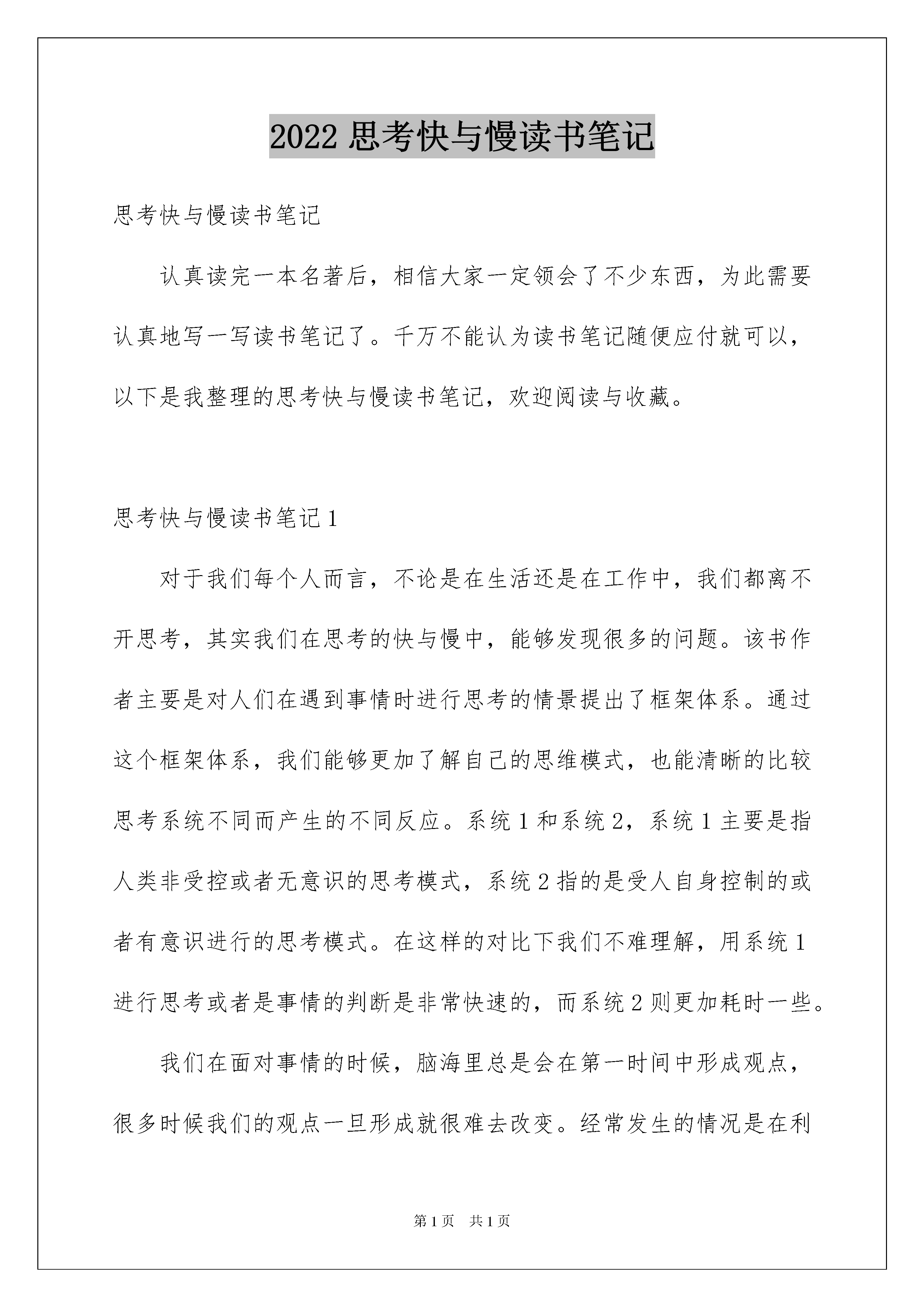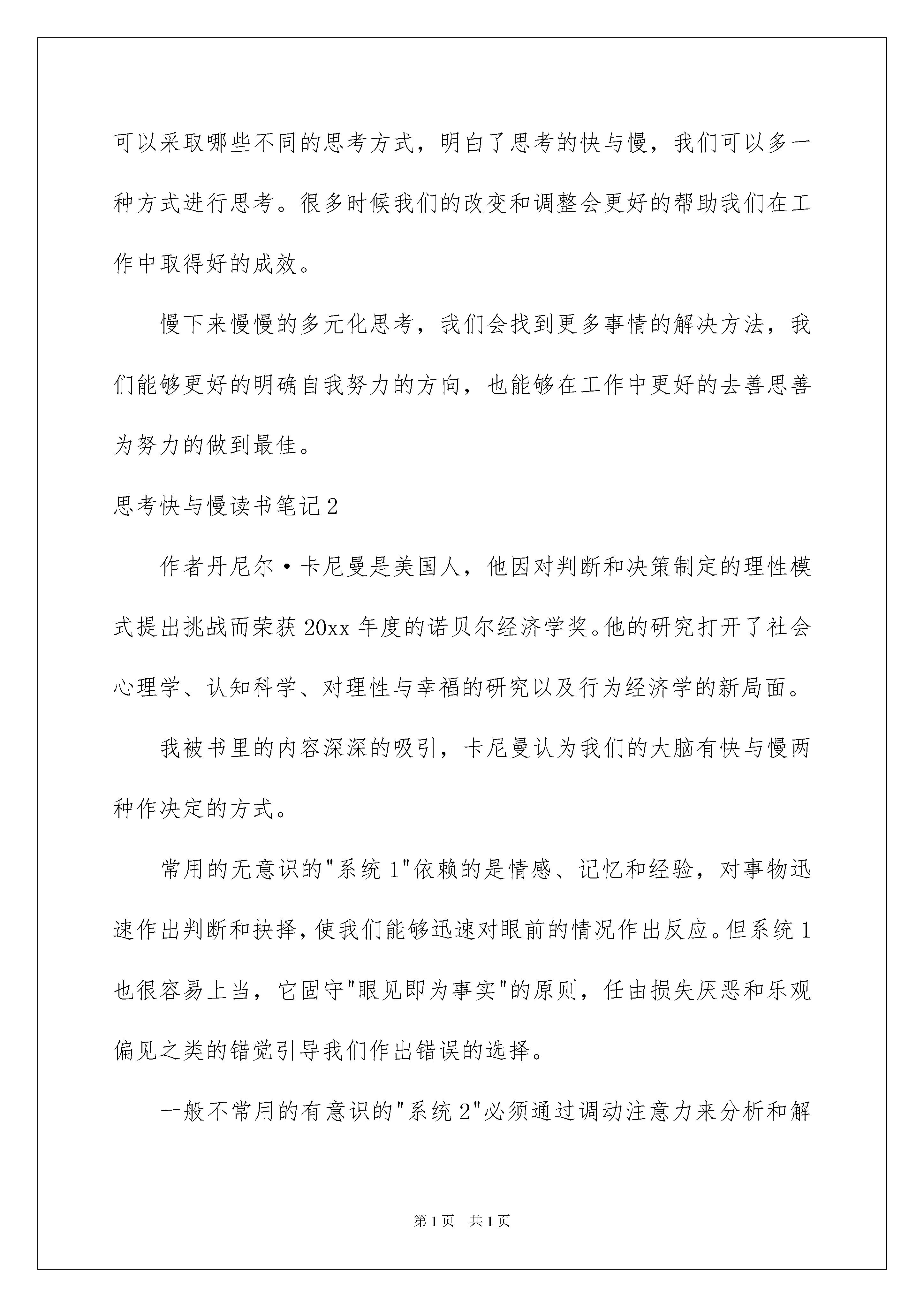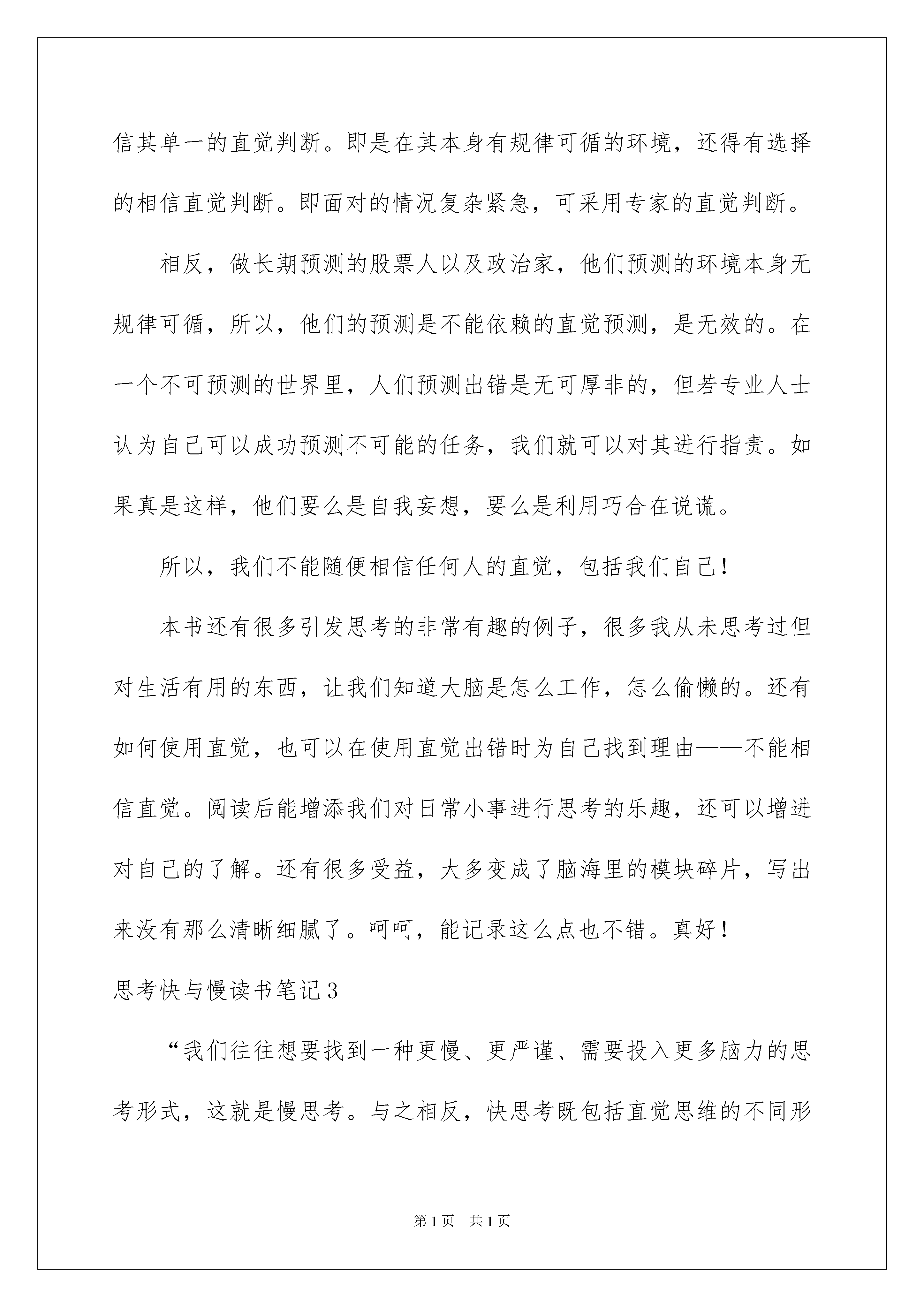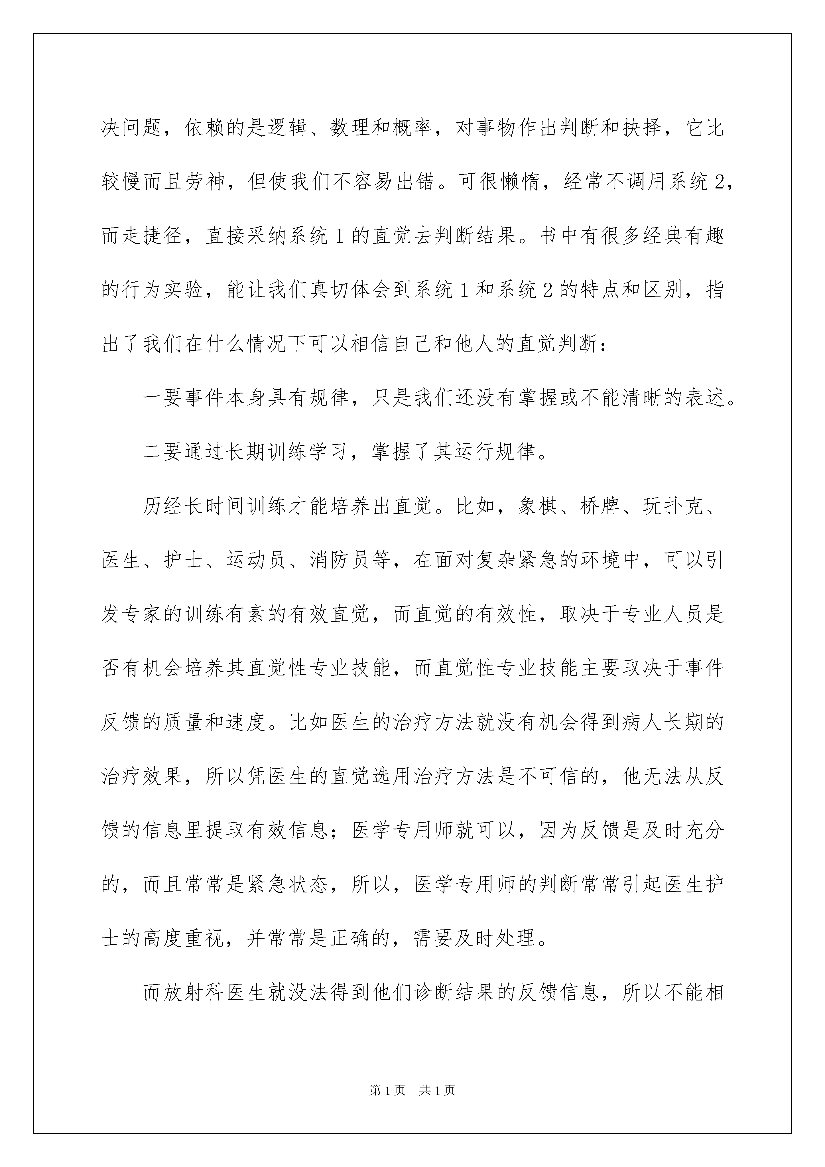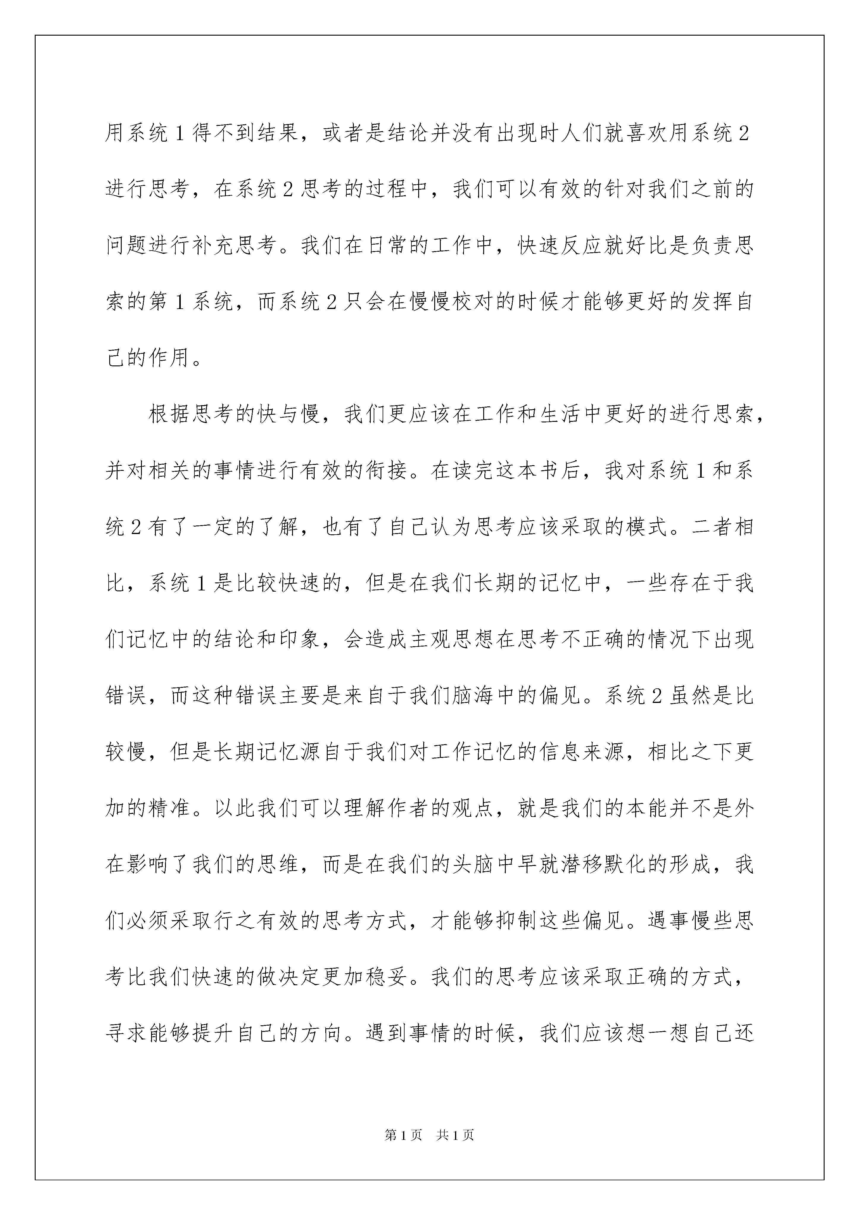 2022思考快与慢读书笔记思考快与慢读书笔记认真读完一本名著后,相信大家一定领会了不少东西,为此需要认真地写一写读书笔记了。千万不能认为读书笔记随便应付就可以,以下是我整理的思考快与慢读书笔记,欢迎阅读与收藏。思考快与慢读书笔记1对于我们每个人而言,不论是在生活还是在工作中,我们都离不开思考,其实我们在思考的快与慢中,能够发现很多的问题。该书作者主要是对人们在遇到事情时进行思考的情景提出了框架体系。通过这个框架体系,我们能够更加了解自己的思维模式,也能清晰的比较思考系统不同而产生的不同反应。系统1和系统2,系统1主要是指人类非受控或者无意识的思考模式,系统2指的是受人自身控制的或者有意识进行的思考模式。在这样的对比下我们不难理解,用系统1进行思考或者是事情的判断是非常快速的,而系统2则更加耗时一些。我们在面对事情的时候,脑海里总是会在第一时间中形成观点,很多时候我们的观点一旦形成就很难去改变。经常发生的情况是在利用系统1得不到结果,或者是结论并没有出现时人们就喜欢用系统2进行思考,在系统2思考的过程中,我们可以有效的针对我们之前的问题进行补充思考。我们在日常的工作中,快速反应就好比是负责思索的第1系统,而系统2只会在慢慢校对的时候才能够更好的发挥自己的作用。根据思考的快与慢,我们更应该在工作和生活中更好的进行思索,并对相关的事情进行有效的衔接。在读完这本书后,我对系统1和系统2有了一定的了解,也有了自己认为思考应该采取的模式。二者相比,系统1是比较快速的,但是在我们长期的记忆中,一些存在于我们记忆中的结论和印象,会造成主观思想在思考不正确的情况下出现错误,而这种错误主要是来自于我们脑海中的偏见。系统2虽然是比较慢,但是长期记忆源自于我们对工作记忆的信息来源,相比之下更加的精准。以此我们可以理解作者的观点,就是我们的本能并不是外在影响了我们的思维,而是在我们的头脑中早就潜移默化的形成,我们必须采取行之有效的思考方式,才能够抑制这些偏见。遇事慢些思考比我们快速的做决定更加稳妥。我们的思考应该采取正确的方式,寻求能够提升自己的方向。遇到事情的时候,我们应该想一想自己还可以采取哪些不同的思考方式,明白了思考的快与慢,我们可以多一种方式进行思考。很多时候我们的改变和调整会更好的帮助我们在工作中取得好的成效。慢下来慢慢的多元化思考,我们会找到更多事情的解决方法,我们能够更好的明确自我努力的方向,也能够在工作中更好的去善思善为努力的做到最佳。思考快与慢读书笔记2作者丹尼尔·卡尼曼是美国人,他因对判断和决策制定的理性模式提出挑战而荣获20xx年度的诺贝尔经济学奖。他的研究打开了社会心理学、认知科学、对理性与幸福的研究以及行为经济学的新局面。我被书里的内容深深的吸引,卡尼曼认为我们的大脑有快与慢两种作决定的方式。常用的无意识的"系统1"依赖的是情感、记忆和经验,对事物迅速作出判断和抉择,使我们能够迅速对眼前的情况作出反应。但系统1也很容易上当,它固守"眼见即为事实"的原则,任由损失厌恶和乐观偏见之类的错觉引导我们作出错误的选择。一般不常用的有意识的"系统2"必须通过调动注意力来分析和解决问题,依赖的是逻辑、数理和概率,对事物作出判断和抉择,它比较慢而且劳神,但使我们不容易出错。可很懒惰,经常不调用系统2,而走捷径,直接采纳系统1的直觉去判断结果。书中有很多经典有趣的行为实验,能让我们真切体会到系统1和系统2的特点和区别,指出了我们在什么情况下可以相信自己和他人的直觉判断:一要事件本身具有规律,只是我们还没有掌握或不能清晰的表述。二要通过长期训练学习,掌握了其运行规律。历经长时间训练才能培养出直觉。比如,象棋、桥牌、玩扑克、医生、护士、运动员、消防员等,在面对复杂紧急的环境中,可以引发专家的训练有素的有效直觉,而直觉的有效性,取决于专业人员是否有机会培养其直觉性专业技能,而直觉性专业技能主要取决于事件反馈的质量和速度。比如医生的治疗方法就没有机会得到病人长期的治疗效果,所以凭医生的直觉选用治疗方法是不可信的,他无法从反馈的信息里提取有效信息;医学专用师就可以,因为反馈是及时充分的,而且常常是紧急状态,所以,医学专用师的判断常常引起医生护士的高度重视,并常常是正确的,需要及时处理。而放射科医生就没法得到他们诊断结果的反馈信息,所以不能相信其单一的直觉判断。即是在其本身有规律可循的环境,还得有选择的相信直觉判断。即面对的情况复杂紧急,可采用专家的直觉判断。相反,做长期预测的股票人以及政治家,他们预测的环境本身无规律可循,所以,他们的预测是不能依赖的直觉预测,是无效的。在一个不可预测的世界里,人们