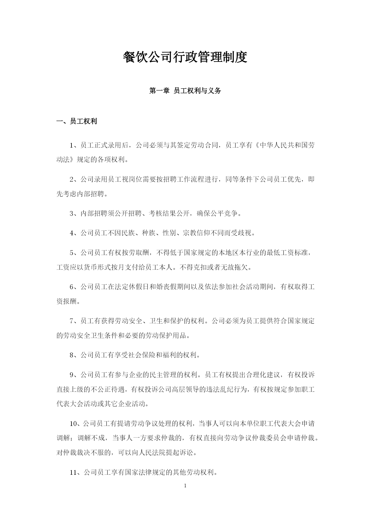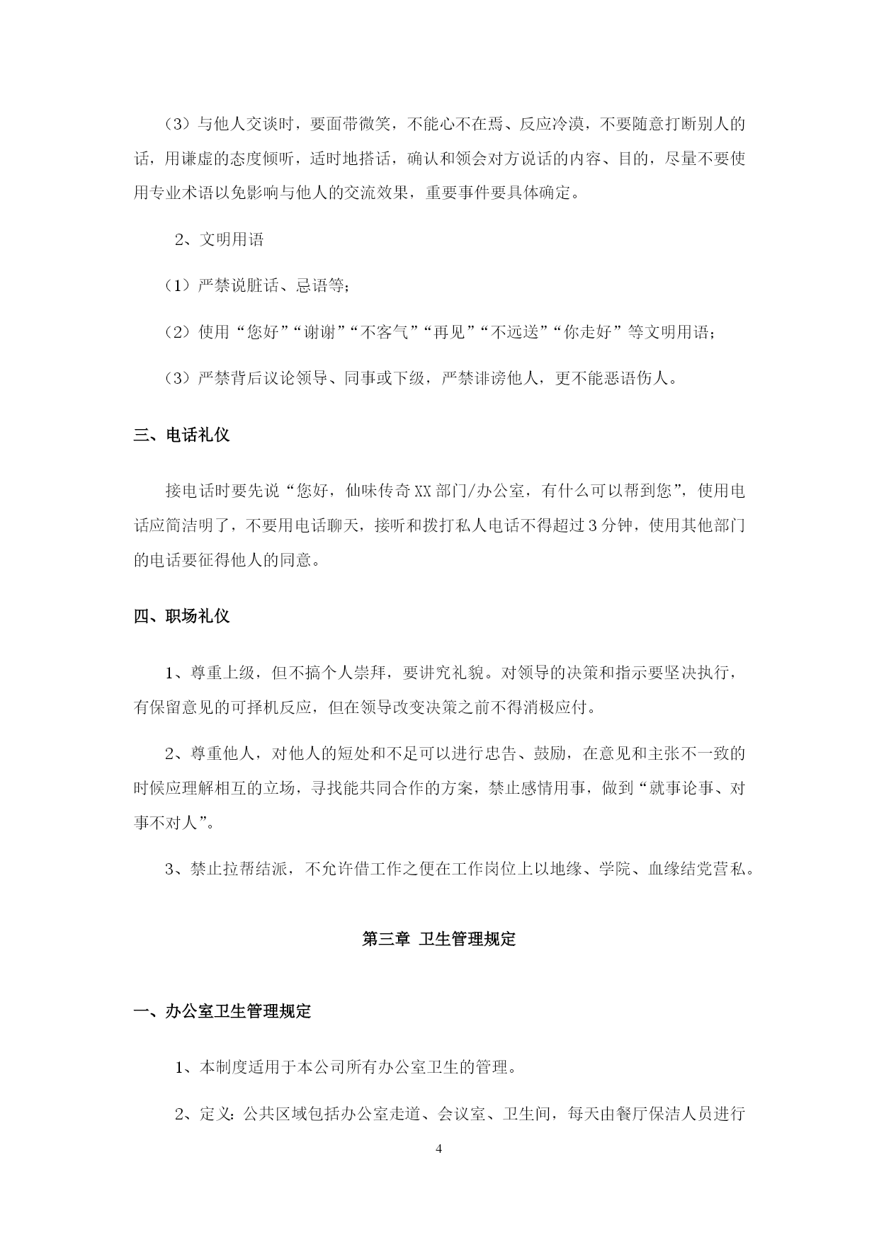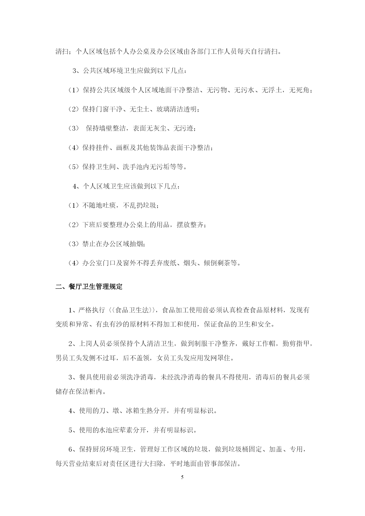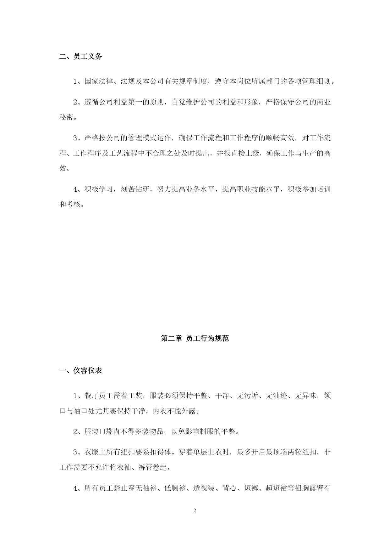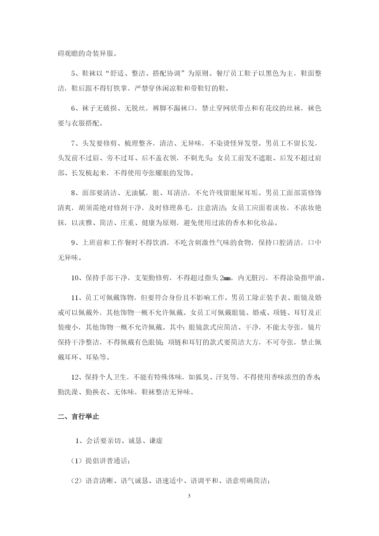PAGE\*MERGEFORMAT24餐饮公司行政管理制度第一章员工权利与义务一、员工权利1、员工正式录用后,公司必须与其签定劳动合同,员工享有《中华人民共和国劳动法》规定的各项权利。2、公司录用员工视岗位需要按招聘工作流程进行,同等条件下公司员工优先,即先考虑内部招聘。3、内部招聘须公开招聘、考核结果公开,确保公平竞争。4、公司员工不因民族、种族、性别、宗教信仰不同而受歧视。5、公司员工有权按劳取酬,不得低于国家规定的本地区本行业的最低工资标准,工资应以货币形式按月支付给员工本人。不得克扣或者无故拖欠。6、公司员工在法定休假日和婚丧假期间以及依法参加社会活动期间,有权取得工资报酬。7、员工有获得劳动安全、卫生和保护的权利。公司必须为员工提供符合国家规定的劳动安全卫生条件和必要的劳动保护用品。8、公司员工有享受社会保险和福利的权利。9、公司员工有参与企业的民主管理的权利。员工有权提出合理化建议,有权投诉直接上级的不公正待遇,有权投诉公司高层领导的违法乱纪行为,有权按规定参加职工代表大会活动或其它企业活动。10、公司员工有提请劳动争议处理的权利,当事人可以向本单位职工代表大会申请调解;调解不成,当事人一方要求仲裁的,有权直接向劳动争议仲裁委员会申请仲裁。对仲裁裁决不服的,可以向人民法院提起诉讼。11、公司员工享有国家法律规定的其他劳动权利。二、员工义务1、国家法律、法规及本公司有关规章制度,遵守本岗位所属部门的各项管理细则。2、遵循公司利益第一的原则,自觉维护公司的利益和形象,严格保守公司的商业秘密。3、严格按公司的管理模式运作,确保工作流程和工作程序的顺畅高效,对工作流程、工作程序及工艺流程中不合理之处及时提出,并报直接上级,确保工作与生产的高效。4、积极学习,刻苦钻研,努力提高业务水平,提高职业技能水平,积极参加培训和考核。第二章员工行为规范一、仪容仪表1、餐厅员工需着工装,服装必须保持平整、干净、无污垢、无油迹、无异味,领口与袖口处尤其要保持干净,内衣不能外露。2、服装口袋内不得多装物品,以免影响制服的平整。3、衣服上所有纽扣要系扣得体。穿着单层上衣时,最多开启最顶端两粒纽扣,非工作需要不允许将衣袖、裤管卷起。4、所有员工禁止穿无袖衫、低胸衫、透视装、背心、短裤、超短裙等袒胸露臂有碍观瞻的奇装异服。5、鞋袜以“舒适、整洁、搭配协调”为原则。餐厅员工鞋子以黑色为主,鞋面整洁,鞋后跟不得钉铁掌,严禁穿休闲凉鞋和带鞋钉的鞋。6、袜子无破损、无脱丝,裤脚不漏袜口,禁止穿网状带点和有花纹的丝袜,袜色要与衣服搭配。7、头发要修剪、梳理整齐,清洁、无异味,不染烫怪异发型。男员工不留长发,头发前不过眉、旁不过耳、后不盖衣领,不剃光头;女员工前发不遮眼、后发不超过肩部、长发梳起来,不得使用夸张耀眼的发饰。8、面部要清洁、无油腻,眼、耳清洁,不允许残留眼屎耳垢。男员工面部需修饰清爽,胡须需绝对修刮干净,及时修理鼻毛,注意清洁;女员工应面着淡妆,不浓妆艳抹,以淡雅、简洁、庄重、健康为原则,避免使用过浓的香水和化妆品。9、上班前和工作餐时不得饮酒,不吃含刺激性气味的食物,保持口腔清洁,口中无异味。10、保持手部干净,支架勤修剪,不得超过指头2mm,内无脏污,不得涂染指甲油。11、员工可佩戴饰物,但要符合身份且不影响工作。男员工除正装手表、眼镜及婚戒可以佩戴外,其他饰物一概不允许佩戴。女员工可佩戴眼镜、婚戒、项链、耳钉及正装瘦小,其他饰物一概不允许佩戴。其中:眼镜款式应简洁、干净,不能太夸张,镜片保持干净整洁,不得佩戴有色眼镜;项链和耳钉的款式要简洁大方,不可夸张,禁止佩戴耳环、耳坠等。12、保持个人卫生,不能有特殊体味,如狐臭、汗臭等,不得使用香味浓烈的香水;勤洗澡、勤换衣、无体味,鞋袜整洁无异味。二、言行举止1、会话要亲切、诚恳、谦虚(1)提倡讲普通话;(2)语音清晰、语气诚恳、语速适中、语调平和、语意明确简洁;(3)与他人交谈时,要面带微笑,不能心不在焉、反应冷漠,不要随意打断别人的话,用谦虚的态度倾听,适时地搭话,确认和领会对方说话的内容、目的,尽量不要使用专业术语以免影响与他人的交流效果,重要事件要具体确定。2、文明用语(1)严禁说脏话、忌语等;(2)使用“您好”“谢谢”“不客气”“再见”“不远送”“你走好”等文明用语;(3)严禁背后议论领导、同事或下级,严禁诽谤他人,更不能恶语伤人。三、电话礼仪接电话时要先说“您好,仙味传奇XX部门/办公室,有什么可以帮到您”,使用电话应简洁明了,不要用电话聊天,接听和拨打私人电话不得超过3分钟,使用其他部门的电话要征得他人的同意。四、职场礼仪1、尊重上级,但不搞个人崇拜,要讲究礼貌。对领导的决策和指示要坚决执行,有保留意见的可择机反应,但在领导改变决策之前不得消极应付。2、尊重他人,对他人的短处