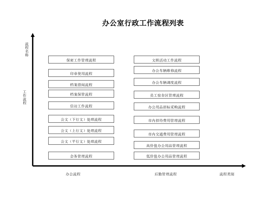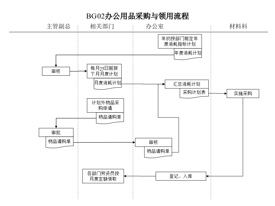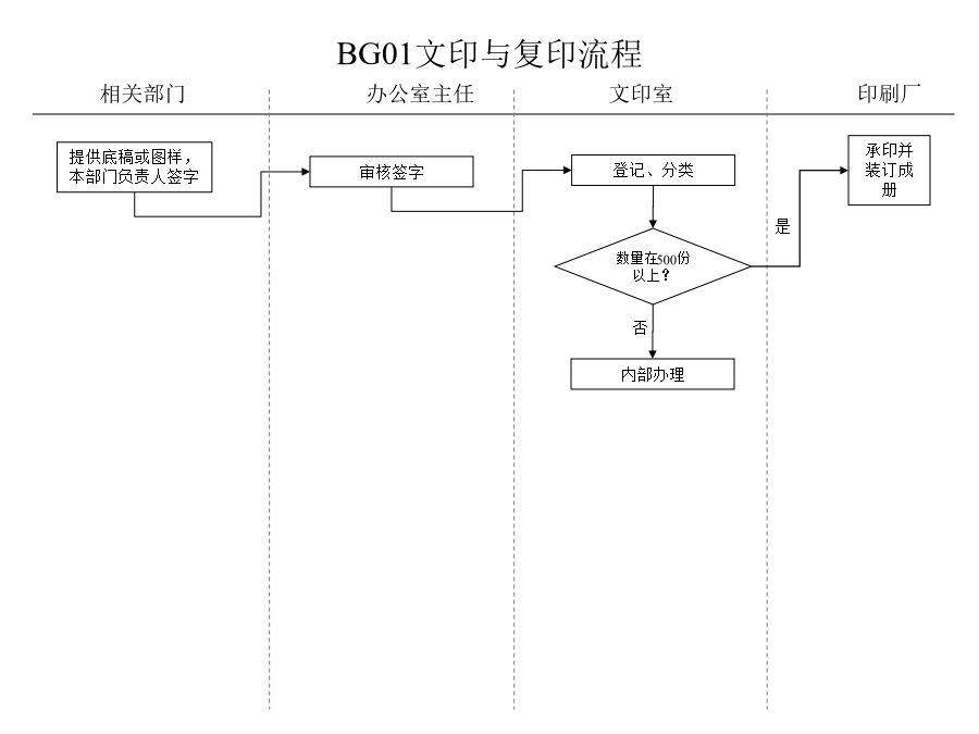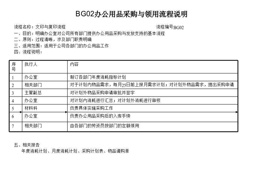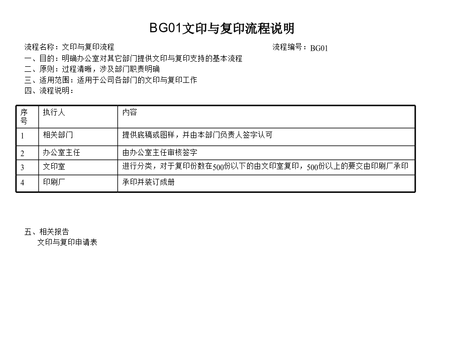 办公室行政工作流程列表流程名称:文印与复印流程流程编号:BG01一、目的:明确办公室对其它部门提供文印与复印支持的基本流程二、原则:过程清晰,涉及部门职责明确三、适用范围:适用于公司各部门的文印与复印工作四、流程说明:五、相关报告文印与复印申请表相关部门流程名称:文印与复印流程流程编号BG02一、目的:明确办公室对公司所有部门提供办公用品采购与发放支持的基本流程二、原则:过程清晰,涉及部门职责明确三、适用范围:适用于公司各部门的办公用品工作四、流程说明:五、相关报告年度消耗计划、月度消耗计划、采购计划表、物品请购单相关部门流程名称:档案保管流程流程编号:BG03一、目的:明确公司档案建立、保管、销毁的基本程序,规范档案管理工作二、原则:过程清晰,涉及部门职责明确三、适用范围:适用于公司的档案管理工作四、流程说明:五、相关报告各类档案、销毁文件清册、档案借阅登记表BG03档案保管流程流程名称:档案借阅流程流程编号:BG04一、目的:明确公司档案借阅的基本程序,规范档案借阅工作二、原则:过程清晰,涉及部门职责明确三、适用范围:适用于公司的档案管理工作四、流程说明:五、相关报告各类档案、销毁文件清册、档案借阅登记表BG04档案借阅流程流程名称:印章使用、管理流程流程编号:BG05一、目的:明确公司印章使用、管理的基本程序,规范印章管理工作二、原则:过程清晰,涉及部门职责明确三、适用范围:适用于公司的印章使用工作四、流程说明:五、相关报告使用印鉴申请,使用印鉴登记表BG05印章使用流程流程名称:公司内部执行工作管理流程流程编号:BG06一、目的:明确办公室对公司内部招待工作的管理的基本流程二、原则:过程清晰,涉及部门职责明确三、适用范围:适用于公司各部门的内部招待工作四、流程说明:五、相关报告财务部流程名称:公司小车使用管理流程流程编号:BG07一、目的:明确办公室对公司小车使用管理工作的流程二、原则:过程清晰,涉及部门职责明确三、适用范围:适用于公司各部门的小车使用工作四、流程说明:五、相关报告用车申请单、用车台账用车部门流程名称:会务管理流程流程编号:BG08一、目的:明确公司会务管理的基本程序,规范会务组织工作二、原则:过程清晰,涉及部门职责明确三、适用范围:适用于公司本部各项会议的管理工作四、流程说明:五、相关报告业务会议报批表、会议记录BG08会务管理流程流程名称:公文处理流程流程编号:BG09一、目的:明确公司公文处理的基本程序,规范公文处理工作二、原则:过程清晰,涉及部门职责明确三、适用范围:适用于公司公文处理工作四、流程说明:五、相关报告各种平级或不相隶属的机关之间的行文BG09公文处理流程–平行文流程名称:公文处理流程流程编号:BG10一、目的:明确公司公文处理的基本程序,规范公文处理工作二、原则:过程清晰,涉及部门职责明确三、适用范围:适用于公司公文处理工作四、流程说明:五、相关报告各种下级向所属上级发送的文书BG10公文处理流程–上行文流程名称:公文处理流程流程编号:BG11一、目的:明确公司公文处理的基本程序,规范公文处理工作二、原则:过程清晰,涉及部门职责明确三、适用范围:适用于公司公文处理工作四、流程说明:五、相关报告各种上级对所属下级的行文BG11公文处理流程–下行文流程名称:保密工作管理流程流程编号:BG12一、目的:明确公司保密工作管理的基本程序,规范公司保密管理工作二、原则:过程清晰,涉及部门职责明确三、适用范围:适用于公司的保密工作管理四、流程说明:五、相关报告保密制度BG12保密工作管理流程流程名称:员工宿舍区管理流程流程编号:BG13一、目的:明确公司员工宿舍区管理的基本程序,规范员工宿舍区管理工作二、原则:过程清晰,涉及部门职责明确三、适用范围:适用于公司的员工宿舍区管理工作四、流程说明:五、相关报告宿舍区管理制度BG13员工宿舍区管理流程流程名称:办公车辆维修流程流程编号:BG14一、目的:明确公司办公车辆维修的基本程序,规范办公车辆维修工作二、原则:过程清晰,涉及部门职责明确三、适用范围:适用于公司的办公车辆维修工作四、流程说明:五、相关报告车辆维修申请,车辆维修记录,车辆费用表BG14办公车辆保养维修流程流程名称:文娱活动工作流程流程编号:BG15一、目的:明确开展文娱活动工作的有关程序二、原则:根据领导的要求开展文娱活动三、适用范围:公司员工四、流程说明:五、相关报告实施计划总结报告BG15文娱活动工作流程