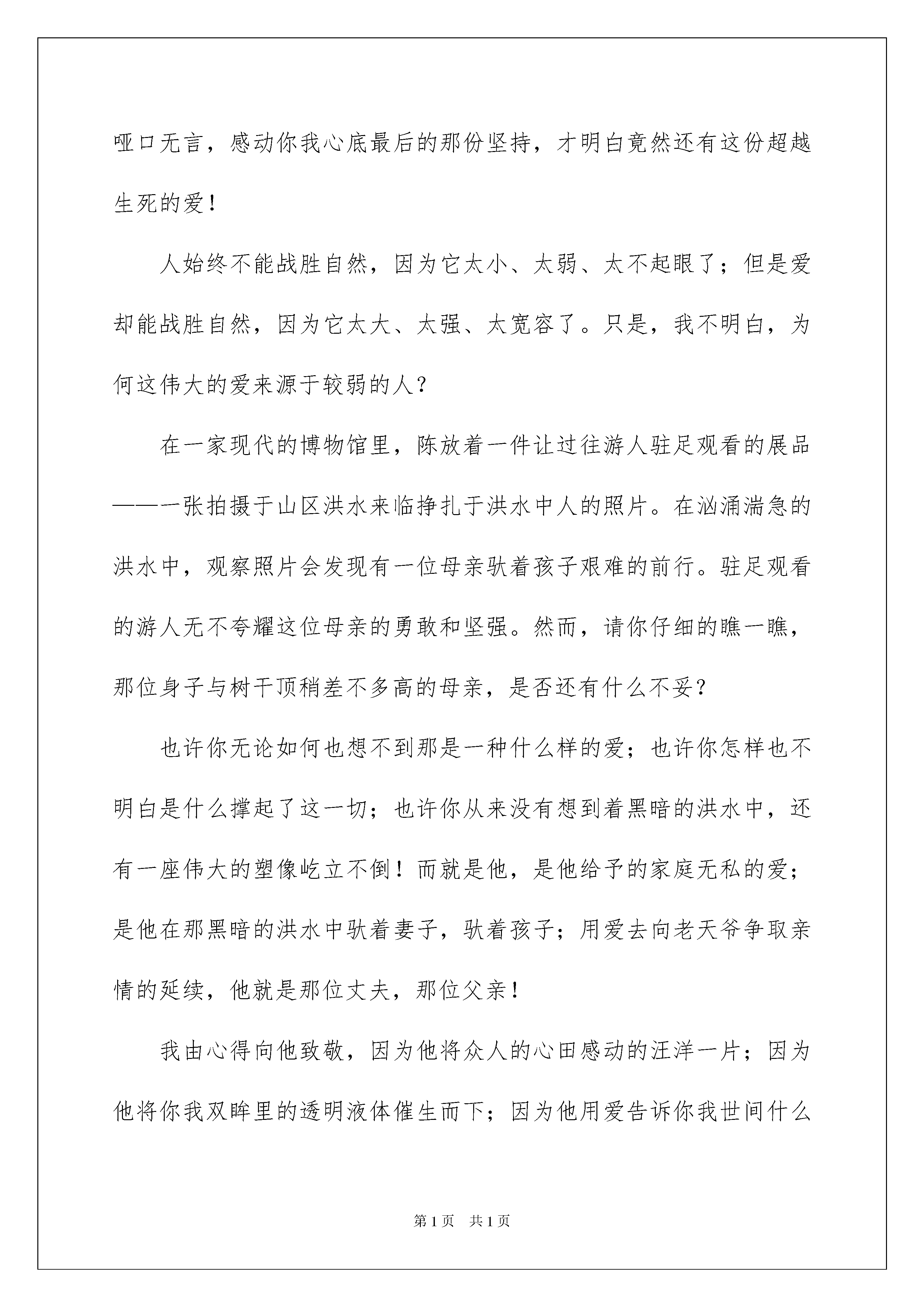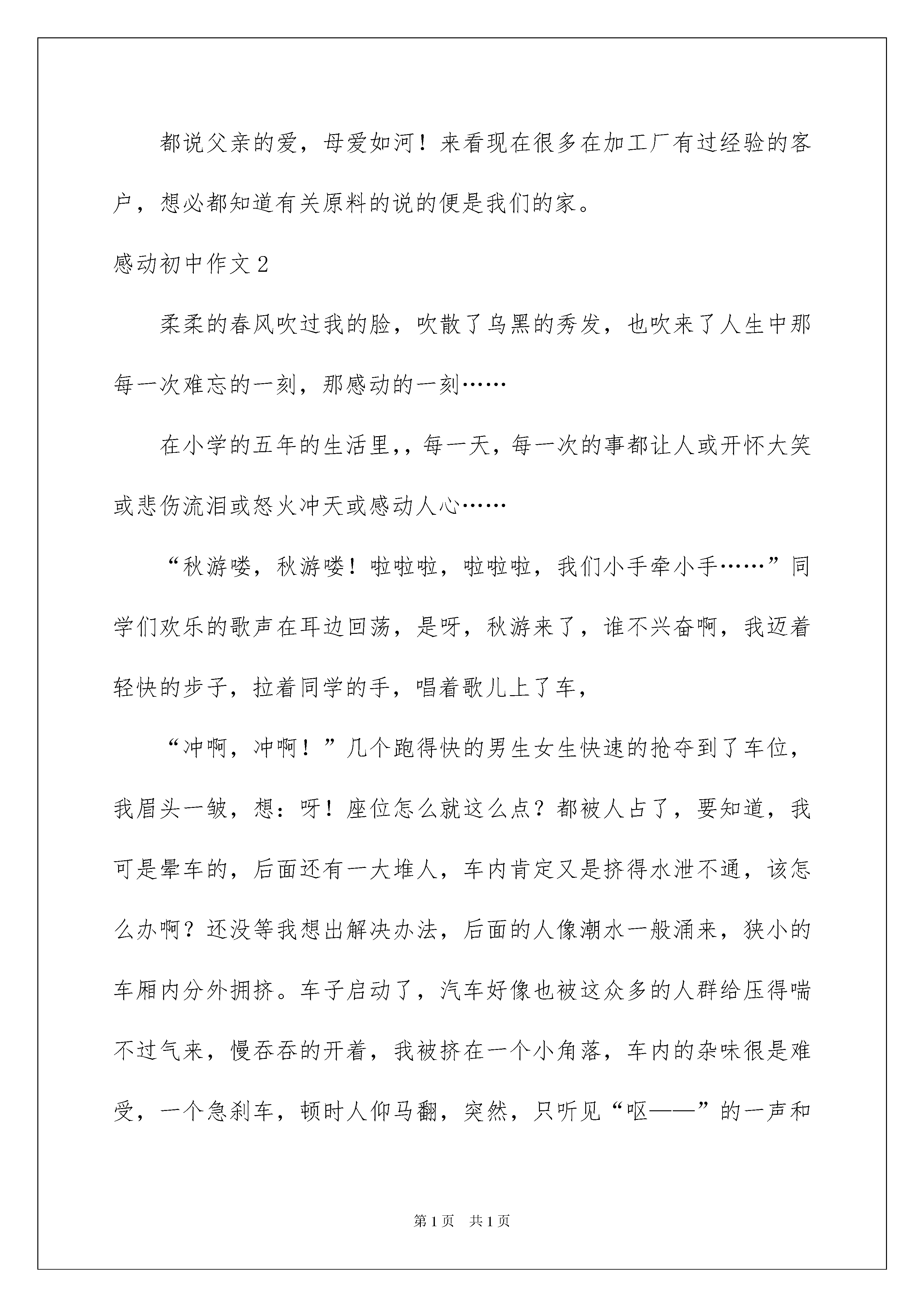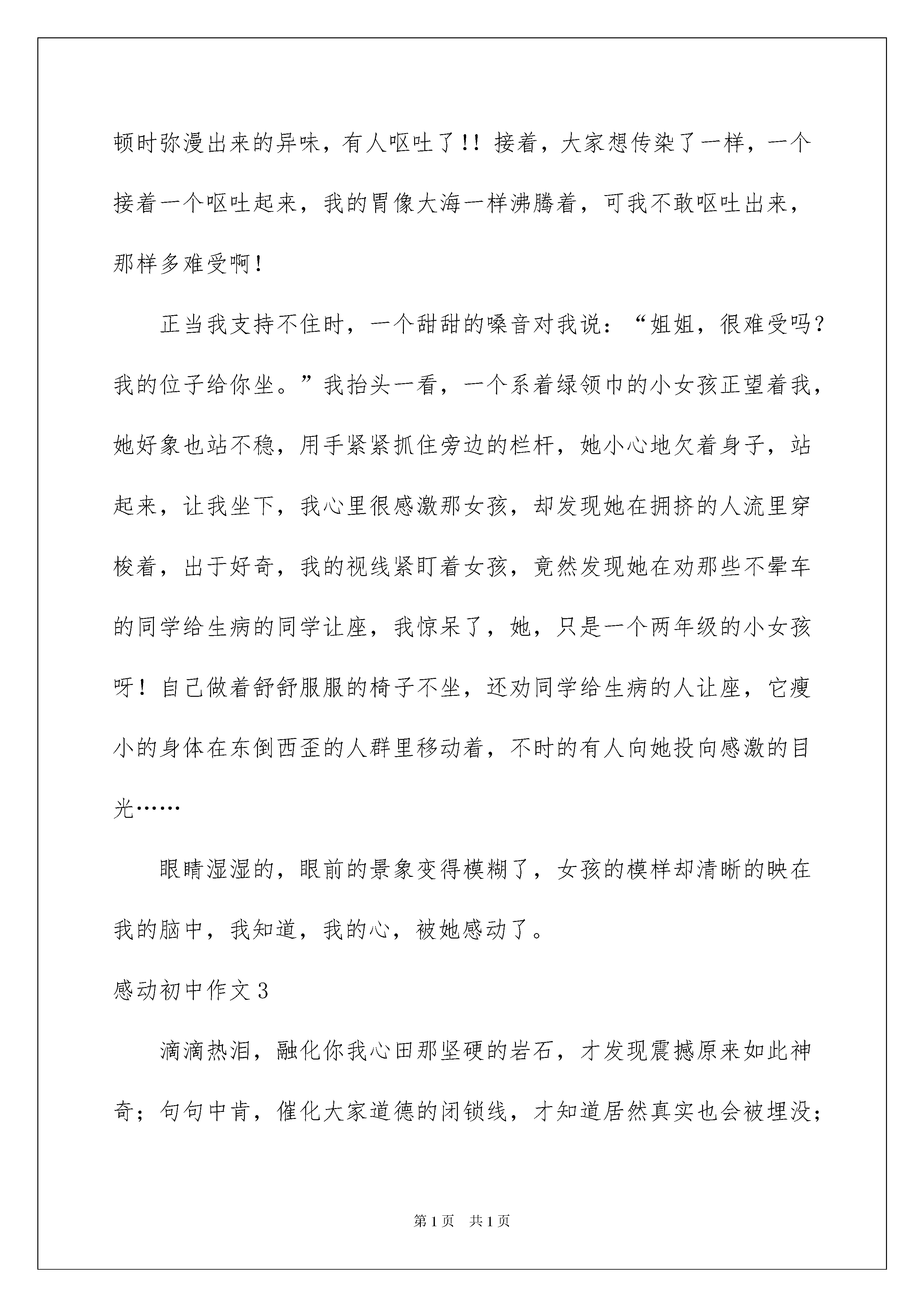 2022感动初中作文汇编15篇感动初中作文在学习、工作、生活中,大家总少不了接触作文吧,借助作文可以宣泄心中的情感,调节自己的心情。那么你知道一篇好的作文该怎么写吗?以下是我帮大家整理的感动初中作文,仅供参考,大家一起来看看吧。感动初中作文1日常生活有很多事儿让我感动。有些是那麼一瞬间的感动,有些是刻在心中永久性的感动。各式各样的感动像星星一样引导着我、溫暖着我、倍伴我。繁忙的念书早上,母亲经常絮叨“再心急还要吃早饭”,望着我念书的身影喊“还记得要多饮水”;出门的道路上,父亲一直要我走在他的里侧;儿时放学后时,祖父一直第一个立在学校门口等着我,风雨兼程;出门用餐,姥姥给我要了最爱的牛扒,而她却由于贵说自身不饿。这种一点一滴都让我感动。在人生之路中还有一件事让我感动的永生难忘。九岁那一年,我看到他人吹喇叭,十分有意思,也要想,父亲说:“有一些物品是务必的,有一些并并不是务必的,而这一喇叭玩具就并不是务必的,假如要想就得根据自身的勤奋投入获得。”爸爸和我有一个棒小孩子,我勤奋改正坏习惯,用餐离不了桌、在家里不仅脚,总算攒可以了买喇叭的主力资金,可是父亲却公出了,我很迷失,感觉爸爸说话不算数。一周后,父亲公出回家,与此同时一个礼品天降,我的到一个喇叭,但是这一喇叭名称叫单簧管,比我要的玩具珍贵多了,我开心坏掉,摇头晃脑,四处显摆,没事儿就吹起。一个炎热的夏季,我早上去山上吹单簧管,由于爱玩,把单簧管弄丢了,我痛不欲生。爸爸妈妈去我玩乐的地区找,着急了解过路人,贴寻找失物启发,但一周以往都没什么音信。我一天到晚郁郁寡欢,爸爸妈妈宽慰我能寻找的,她们有时还会继续低声细语。几日后的夜里,单簧管又发生在我眼下,我愤怒,它找回家,我又逐渐嘚瑟了。过去了一段时间,我还在收拾房间时,发觉一张选购单簧管的税票,税票日期是遗失后的時间,我明白这一定是爸爸妈妈再次帮我买的,看见2300块的价钱,我内心感动的直流泪。都说父亲的爱,母爱如河!来看现在很多在加工厂有过经验的客户,想必都知道有关原料的说的便是我们的家。感动初中作文2柔柔的春风吹过我的脸,吹散了乌黑的秀发,也吹来了人生中那每一次难忘的一刻,那感动的一刻……在小学的五年的生活里,,每一天,每一次的事都让人或开怀大笑或悲伤流泪或怒火冲天或感动人心……“秋游喽,秋游喽!啦啦啦,啦啦啦,我们小手牵小手……”同学们欢乐的歌声在耳边回荡,是呀,秋游来了,谁不兴奋啊,我迈着轻快的步子,拉着同学的手,唱着歌儿上了车,“冲啊,冲啊!”几个跑得快的男生女生快速的抢夺到了车位,我眉头一皱,想:呀!座位怎么就这么点?都被人占了,要知道,我可是晕车的,后面还有一大堆人,车内肯定又是挤得水泄不通,该怎么办啊?还没等我想出解决办法,后面的人像潮水一般涌来,狭小的车厢内分外拥挤。车子启动了,汽车好像也被这众多的人群给压得喘不过气来,慢吞吞的开着,我被挤在一个小角落,车内的杂味很是难受,一个急刹车,顿时人仰马翻,突然,只听见“呕——”的一声和顿时弥漫出来的异味,有人呕吐了!!接着,大家想传染了一样,一个接着一个呕吐起来,我的胃像大海一样沸腾着,可我不敢呕吐出来,那样多难受啊!正当我支持不住时,一个甜甜的嗓音对我说:“姐姐,很难受吗?我的位子给你坐。”我抬头一看,一个系着绿领巾的小女孩正望着我,她好象也站不稳,用手紧紧抓住旁边的栏杆,她小心地欠着身子,站起来,让我坐下,我心里很感激那女孩,却发现她在拥挤的人流里穿梭着,出于好奇,我的视线紧盯着女孩,竟然发现她在劝那些不晕车的同学给生病的同学让座,我惊呆了,她,只是一个两年级的小女孩呀!自己做着舒舒服服的椅子不坐,还劝同学给生病的人让座,它瘦小的身体在东倒西歪的人群里移动着,不时的有人向她投向感激的目光……眼睛湿湿的,眼前的景象变得模糊了,女孩的模样却清晰的映在我的脑中,我知道,我的心,被她感动了。感动初中作文3滴滴热泪,融化你我心田那坚硬的岩石,才发现震撼原来如此神奇;句句中肯,催化大家道德的闭锁线,才知道居然真实也会被埋没;哑口无言,感动你我心底最后的那份坚持,才明白竟然还有这份超越生死的爱!人始终不能战胜自然,因为它太小、太弱、太不起眼了;但是爱却能战胜自然,因为它太大、太强、太宽容了。只是,我不明白,为何这伟大的爱来源于较弱的人?在一家现代的博物馆里,陈放着一件让过往游人驻足观看的展品——一张拍摄于山区洪水来临挣扎于洪水中人的照片。在汹涌湍急的洪水中,观察照片会发现有一位母亲驮着孩子艰难的前行。驻足观看的游人无不夸耀这位母亲的勇敢和坚强。然而,请你仔细的瞧一瞧,那位身子与树干顶稍差不多高的母亲,是否还有什么不妥?也许你无