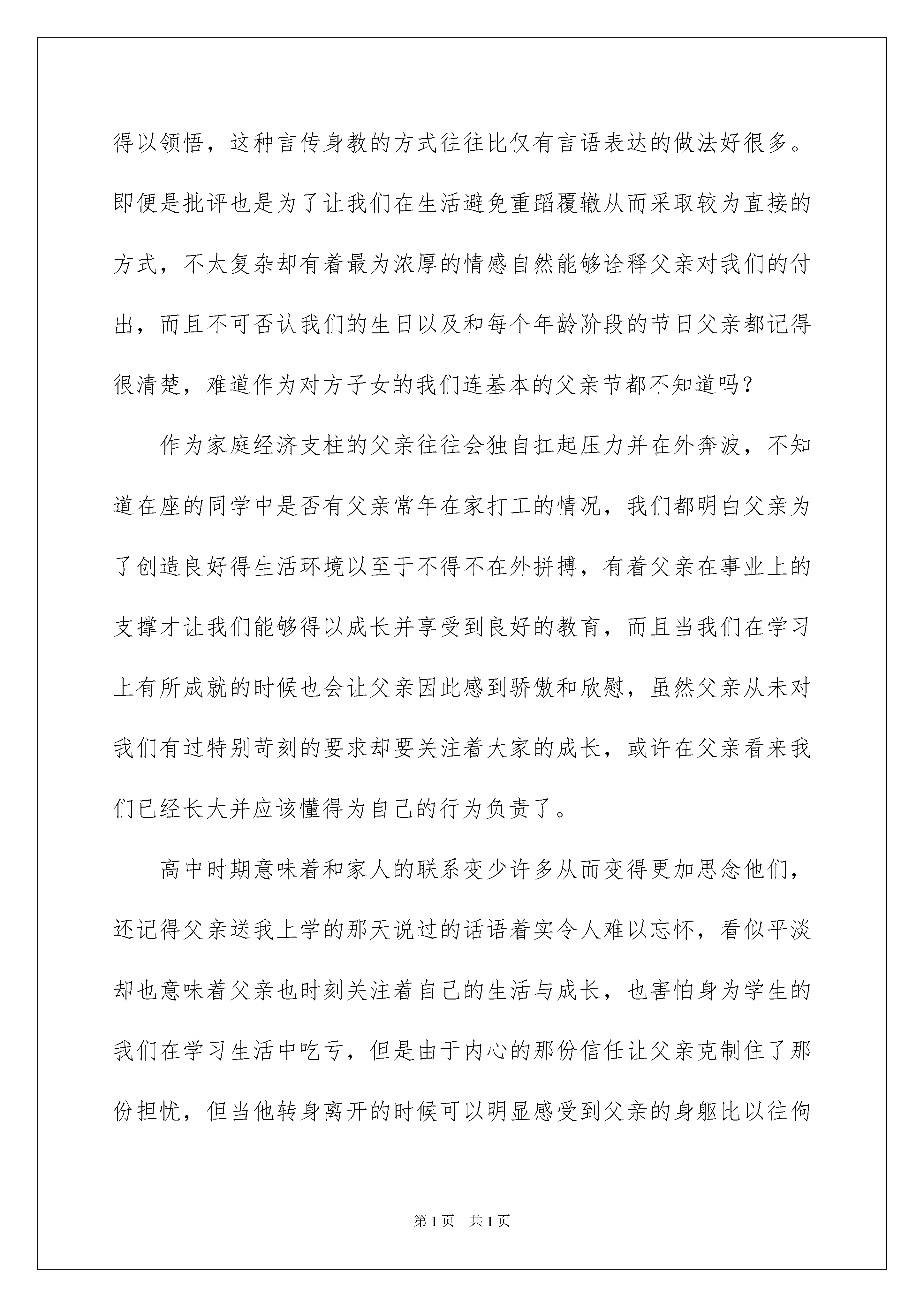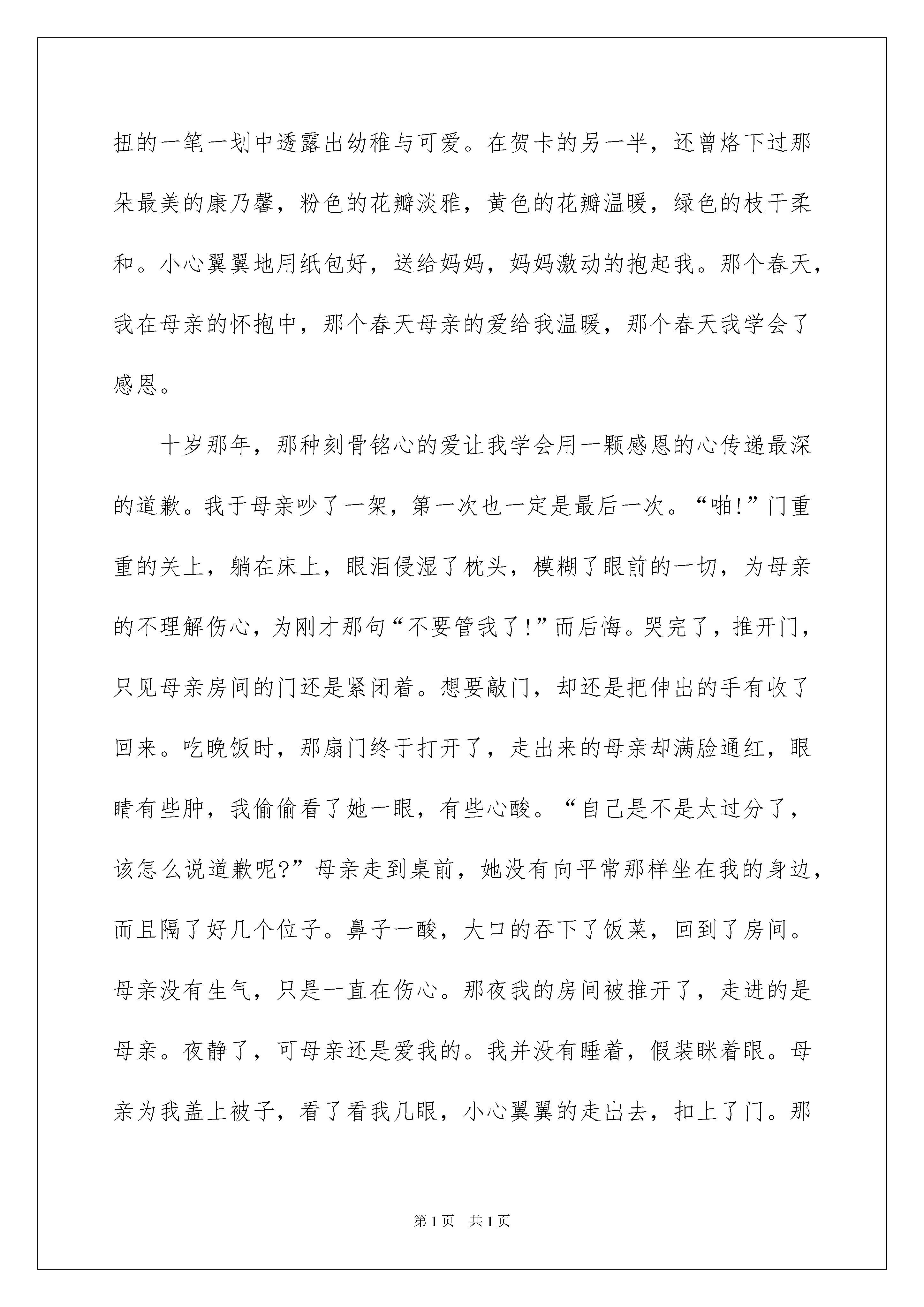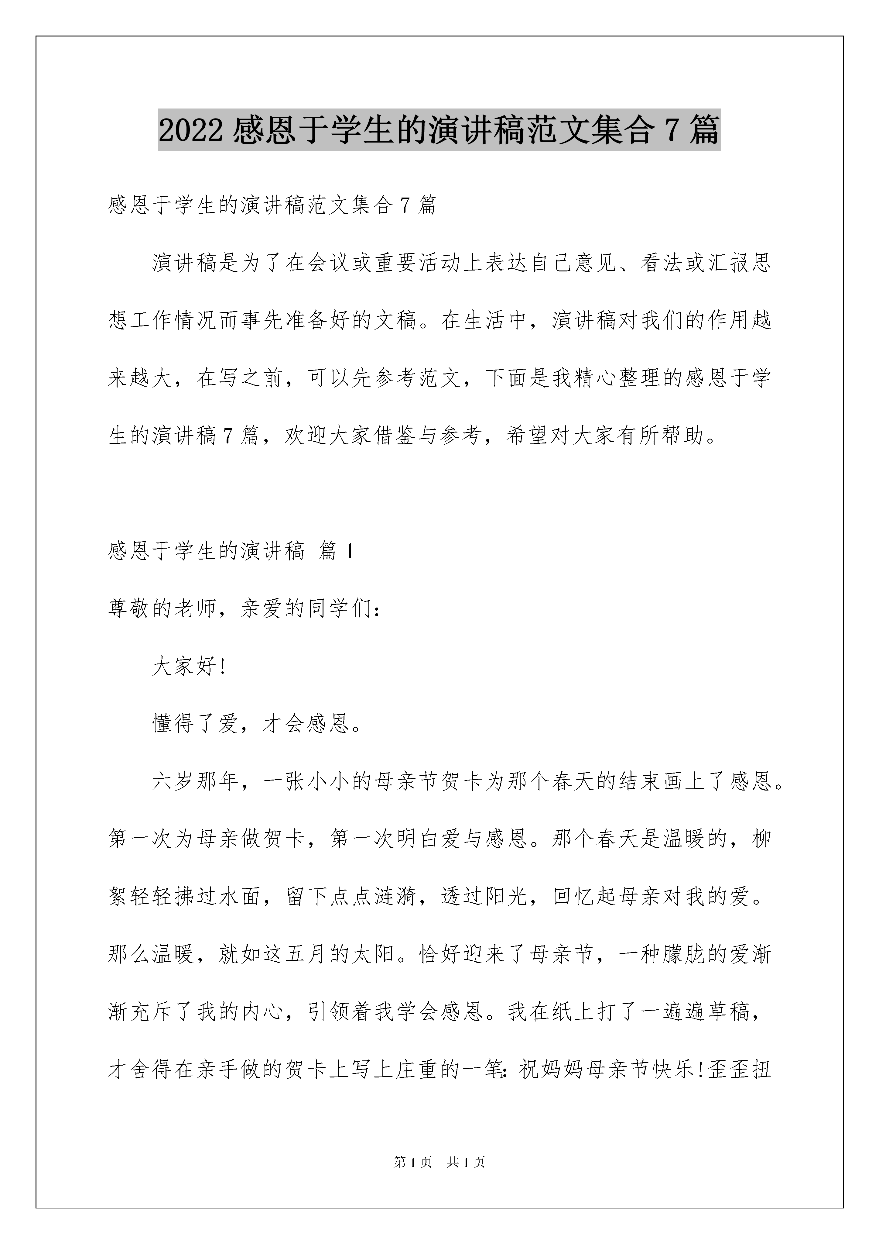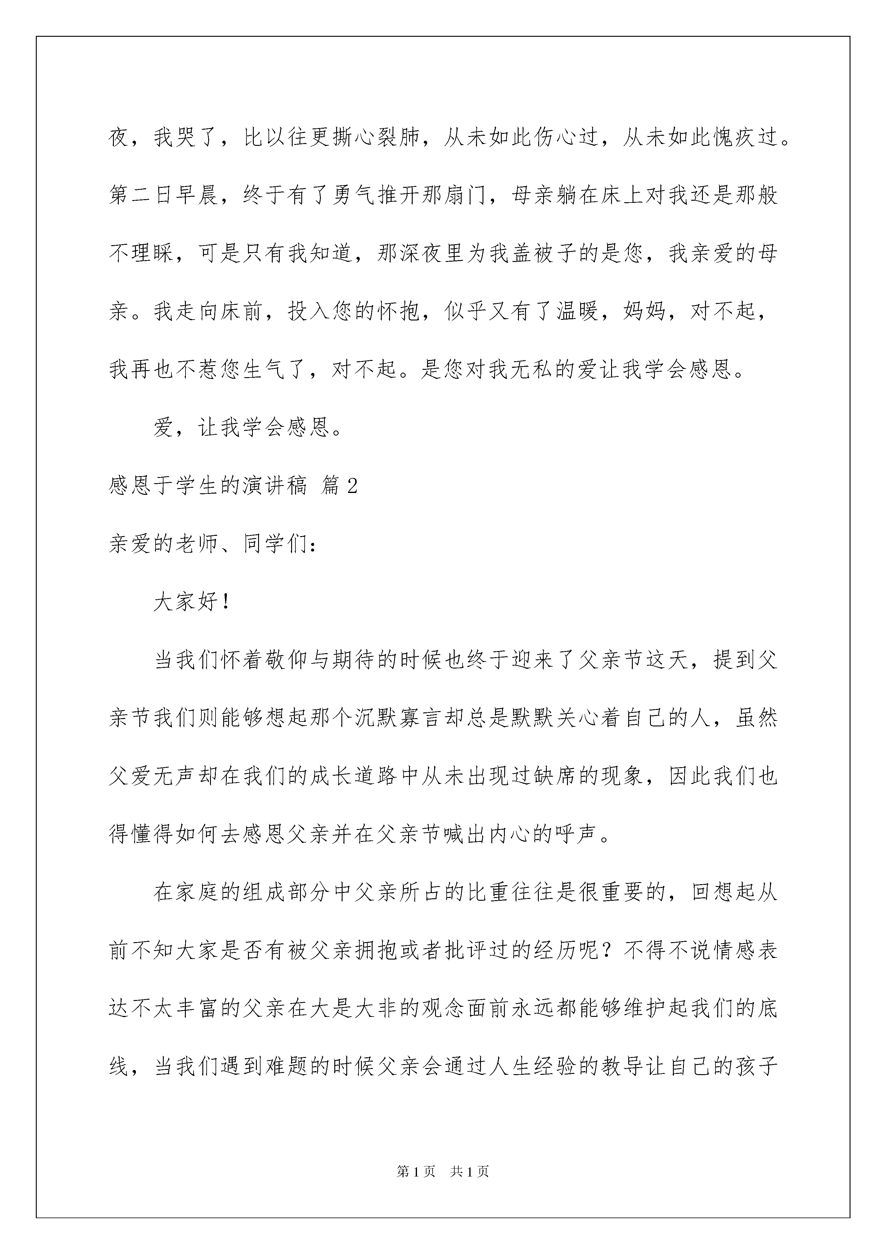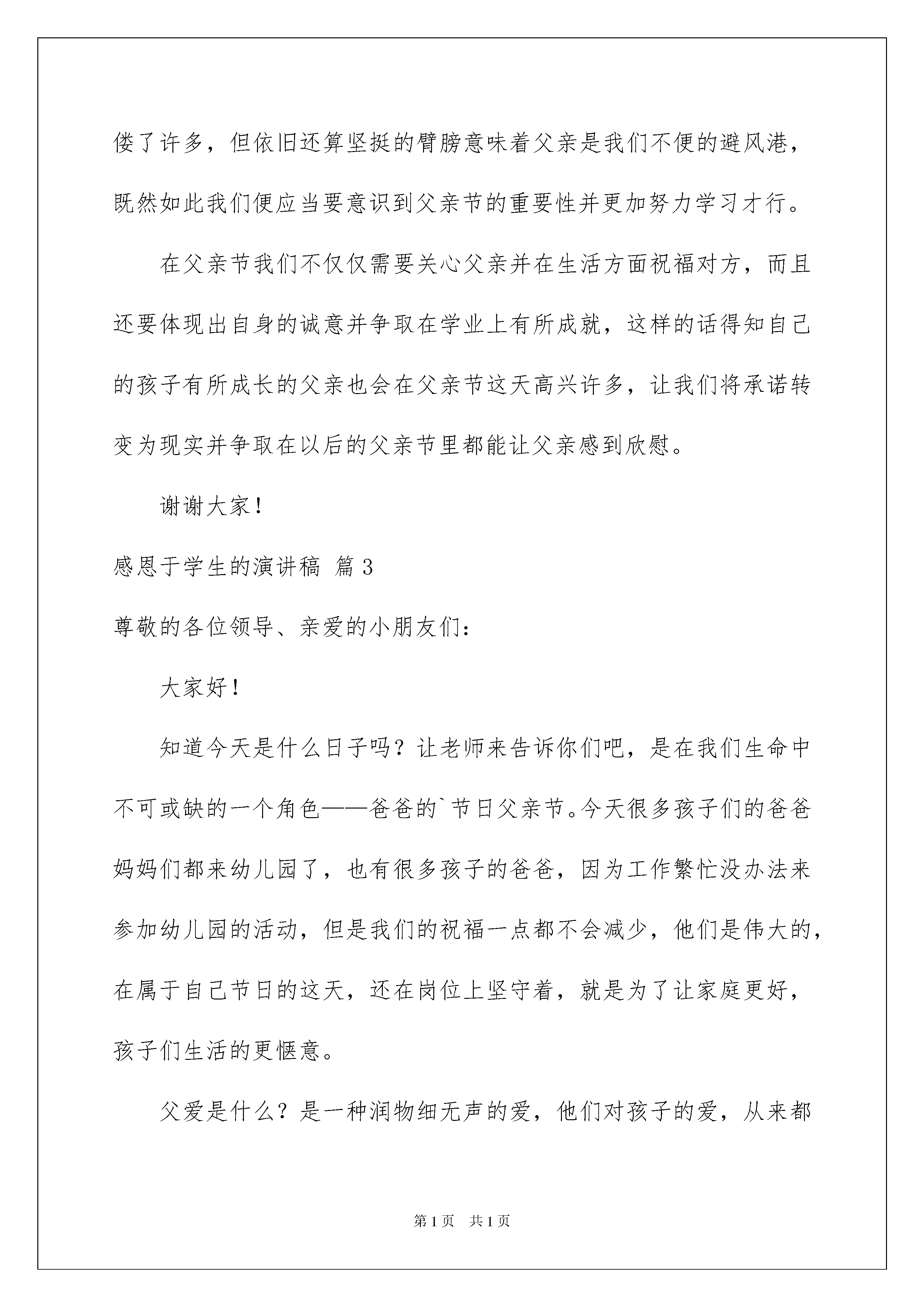 2022感恩于学生的演讲稿范文集合7篇感恩于学生的演讲稿范文集合7篇演讲稿是为了在会议或重要活动上表达自己意见、看法或汇报思想工作情况而事先准备好的文稿。在生活中,演讲稿对我们的作用越来越大,在写之前,可以先参考范文,下面是我精心整理的感恩于学生的演讲稿7篇,欢迎大家借鉴与参考,希望对大家有所帮助。感恩于学生的演讲稿篇1尊敬的老师,亲爱的同学们:大家好!懂得了爱,才会感恩。六岁那年,一张小小的母亲节贺卡为那个春天的结束画上了感恩。第一次为母亲做贺卡,第一次明白爱与感恩。那个春天是温暖的,柳絮轻轻拂过水面,留下点点涟漪,透过阳光,回忆起母亲对我的爱。那么温暖,就如这五月的太阳。恰好迎来了母亲节,一种朦胧的爱渐渐充斥了我的内心,引领着我学会感恩。我在纸上打了一遍遍草稿,才舍得在亲手做的贺卡上写上庄重的一笔:祝妈妈母亲节快乐!歪歪扭扭的一笔一划中透露出幼稚与可爱。在贺卡的另一半,还曾烙下过那朵最美的康乃馨,粉色的花瓣淡雅,黄色的花瓣温暖,绿色的枝干柔和。小心翼翼地用纸包好,送给妈妈,妈妈激动的抱起我。那个春天,我在母亲的怀抱中,那个春天母亲的爱给我温暖,那个春天我学会了感恩。十岁那年,那种刻骨铭心的爱让我学会用一颗感恩的心传递最深的道歉。我于母亲吵了一架,第一次也一定是最后一次。“啪!”门重重的关上,躺在床上,眼泪侵湿了枕头,模糊了眼前的一切,为母亲的不理解伤心,为刚才那句“不要管我了!”而后悔。哭完了,推开门,只见母亲房间的门还是紧闭着。想要敲门,却还是把伸出的手有收了回来。吃晚饭时,那扇门终于打开了,走出来的母亲却满脸通红,眼睛有些肿,我偷偷看了她一眼,有些心酸。“自己是不是太过分了,该怎么说道歉呢?”母亲走到桌前,她没有向平常那样坐在我的身边,而且隔了好几个位子。鼻子一酸,大口的吞下了饭菜,回到了房间。母亲没有生气,只是一直在伤心。那夜我的房间被推开了,走进的是母亲。夜静了,可母亲还是爱我的。我并没有睡着,假装眯着眼。母亲为我盖上被子,看了看我几眼,小心翼翼的走出去,扣上了门。那夜,我哭了,比以往更撕心裂肺,从未如此伤心过,从未如此愧疚过。第二日早晨,终于有了勇气推开那扇门,母亲躺在床上对我还是那般不理睬,可是只有我知道,那深夜里为我盖被子的是您,我亲爱的母亲。我走向床前,投入您的怀抱,似乎又有了温暖,妈妈,对不起,我再也不惹您生气了,对不起。是您对我无私的爱让我学会感恩。爱,让我学会感恩。感恩于学生的演讲稿篇2亲爱的老师、同学们:大家好!当我们怀着敬仰与期待的时候也终于迎来了父亲节这天,提到父亲节我们则能够想起那个沉默寡言却总是默默关心着自己的人,虽然父爱无声却在我们的成长道路中从未出现过缺席的现象,因此我们也得懂得如何去感恩父亲并在父亲节喊出内心的呼声。在家庭的组成部分中父亲所占的比重往往是很重要的,回想起从前不知大家是否有被父亲拥抱或者批评过的经历呢?不得不说情感表达不太丰富的父亲在大是大非的观念面前永远都能够维护起我们的底线,当我们遇到难题的时候父亲会通过人生经验的教导让自己的孩子得以领悟,这种言传身教的方式往往比仅有言语表达的做法好很多。即便是批评也是为了让我们在生活避免重蹈覆辙从而采取较为直接的方式,不太复杂却有着最为浓厚的情感自然能够诠释父亲对我们的付出,而且不可否认我们的生日以及和每个年龄阶段的节日父亲都记得很清楚,难道作为对方子女的我们连基本的父亲节都不知道吗?作为家庭经济支柱的父亲往往会独自扛起压力并在外奔波,不知道在座的同学中是否有父亲常年在家打工的情况,我们都明白父亲为了创造良好得生活环境以至于不得不在外拼搏,有着父亲在事业上的支撑才让我们能够得以成长并享受到良好的教育,而且当我们在学习上有所成就的时候也会让父亲因此感到骄傲和欣慰,虽然父亲从未对我们有过特别苛刻的要求却要关注着大家的成长,或许在父亲看来我们已经长大并应该懂得为自己的行为负责了。高中时期意味着和家人的联系变少许多从而变得更加思念他们,还记得父亲送我上学的那天说过的话语着实令人难以忘怀,看似平淡却也意味着父亲也时刻关注着自己的生活与成长,也害怕身为学生的我们在学习生活中吃亏,但是由于内心的那份信任让父亲克制住了那份担忧,但当他转身离开的时候可以明显感受到父亲的身躯比以往佝偻了许多,但依旧还算坚挺的臂膀意味着父亲是我们不便的避风港,既然如此我们便应当要意识到父亲节的重要性并更加努力学习才行。在父亲节我们不仅仅需要关心父亲并在生活方面祝福对方,而且还要体现出自身的诚意并争取在学业上有所成就,这样的话得知自己的孩子有所成长的父亲也会在父亲节这天高兴许多,让我们将承诺转变为现实并争取在以后的父