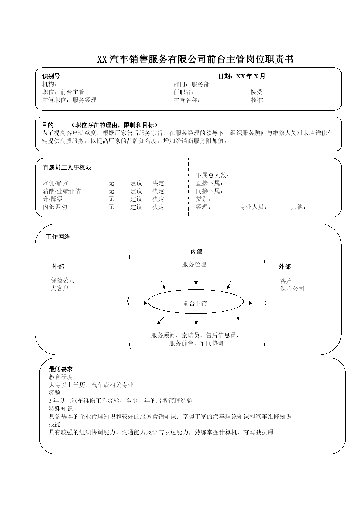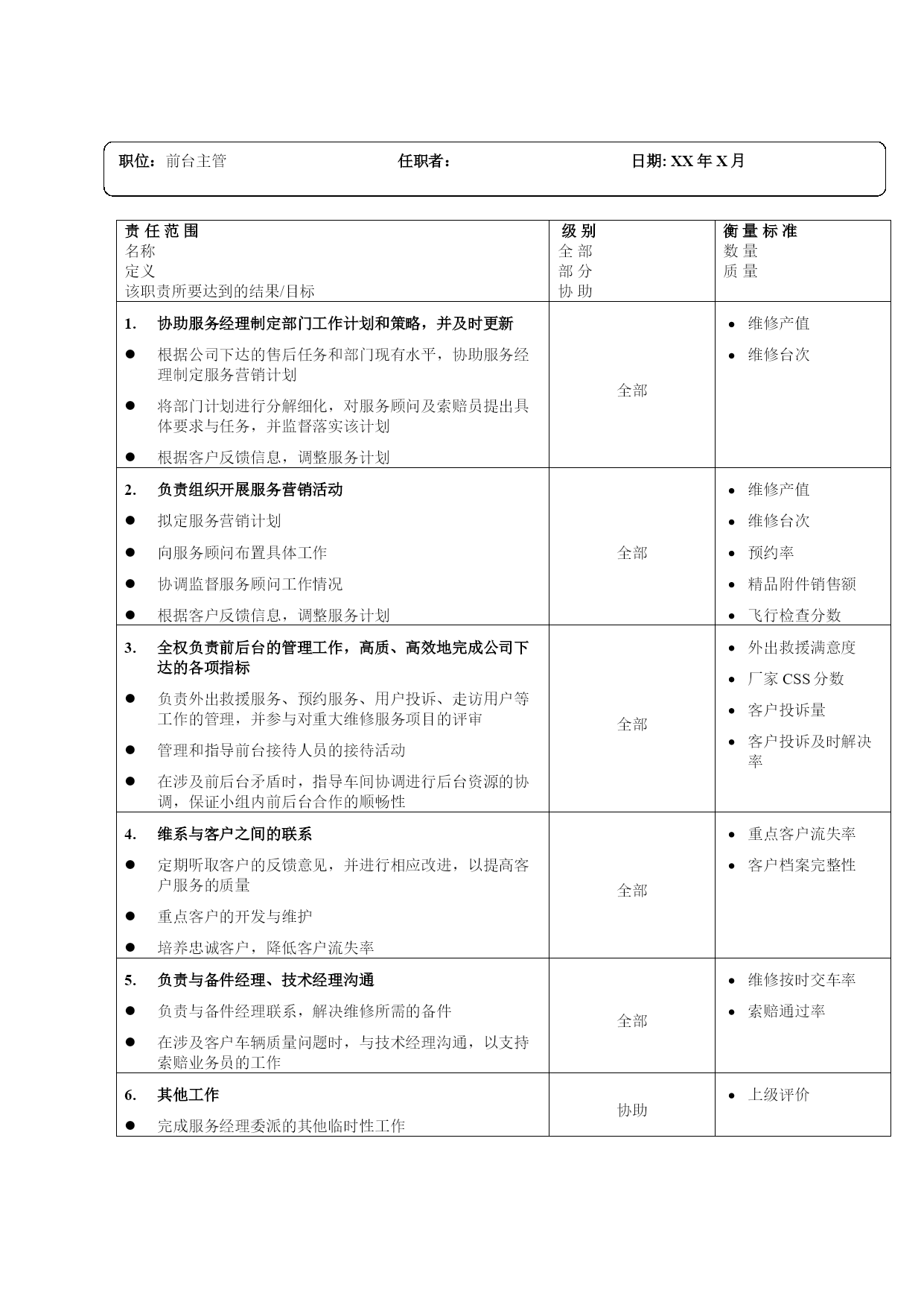 WilliamM.Mercer,Incorporated1166AvenueoftheAmericasNewYork,NY10036212/3457000XX汽车销售服务有限公司前台主管岗位职责书识别号日期:XX年X月机构:部门:服务部职位:前台主管任职者:接受主管职位:服务经理主管名称:核准目的(职位存在的理由,限制和目标)为了提高客户满意度,根据厂家售后服务宗旨,在服务经理的领导下,组织服务顾问与维修人员对来店维修车辆提供高质服务,以提高厂家的品牌知名度,增加经销商服务附加值。直属员工人事权限下属总人数:雇佣/解雇无建议决定直接下属:薪酬/业绩评估无建议决定间接下属:升/降级无建议决定类别:内部调动无建议决定经理:专业人员:其他:工作网络内部外部外部服务经理保险公司大客户客户保险公司前台主管服务顾问、索赔员、售后信息员、服务前台、车间协调最低要求教育程度大专以上学历,汽车或相关专业经验3年以上汽车维修工作经验,至少1年的服务管理经验特殊知识具备基本的企业管理知识和较好的服务营销知识;掌握丰富的汽车理论知识和汽车维修知识技能具有较强的组织协调能力、沟通能力及语言表达能力,熟练掌握计算机,有驾驶执照职位:前台主管任职者:日期:XX年X月责任范围名称定义该职责所要达到的结果/目标级别全部部分协助衡量标准数量质量协助服务经理制定部门工作计划和策略,并及时更新根据公司下达的售后任务和部门现有水平,协助服务经理制定服务营销计划将部门计划进行分解细化,对服务顾问及索赔员提出具体要求与任务,并监督落实该计划根据客户反馈信息,调整服务计划全部维修产值维修台次负责组织开展服务营销活动拟定服务营销计划向服务顾问布置具体工作协调监督服务顾问工作情况根据客户反馈信息,调整服务计划全部维修产值维修台次预约率精品附件销售额飞行检查分数全权负责前后台的管理工作,高质、高效地完成公司下达的各项指标负责外出救援服务、预约服务、用户投诉、走访用户等工作的管理,并参与对重大维修服务项目的评审管理和指导前台接待人员的接待活动在涉及前后台矛盾时,指导车间协调进行后台资源的协调,保证小组内前后台合作的顺畅性全部外出救援满意度厂家CSS分数客户投诉量客户投诉及时解决率维系与客户之间的联系定期听取客户的反馈意见,并进行相应改进,以提高客户服务的质量重点客户的开发与维护培养忠诚客户,降低客户流失率全部重点客户流失率客户档案完整性负责与备件经理、技术经理沟通负责与备件经理联系,解决维修所需的备件在涉及客户车辆质量问题时,与技术经理沟通,以支持索赔业务员的工作全部维修按时交车率索赔通过率其他工作完成服务经理委派的其他临时性工作协助上级评价