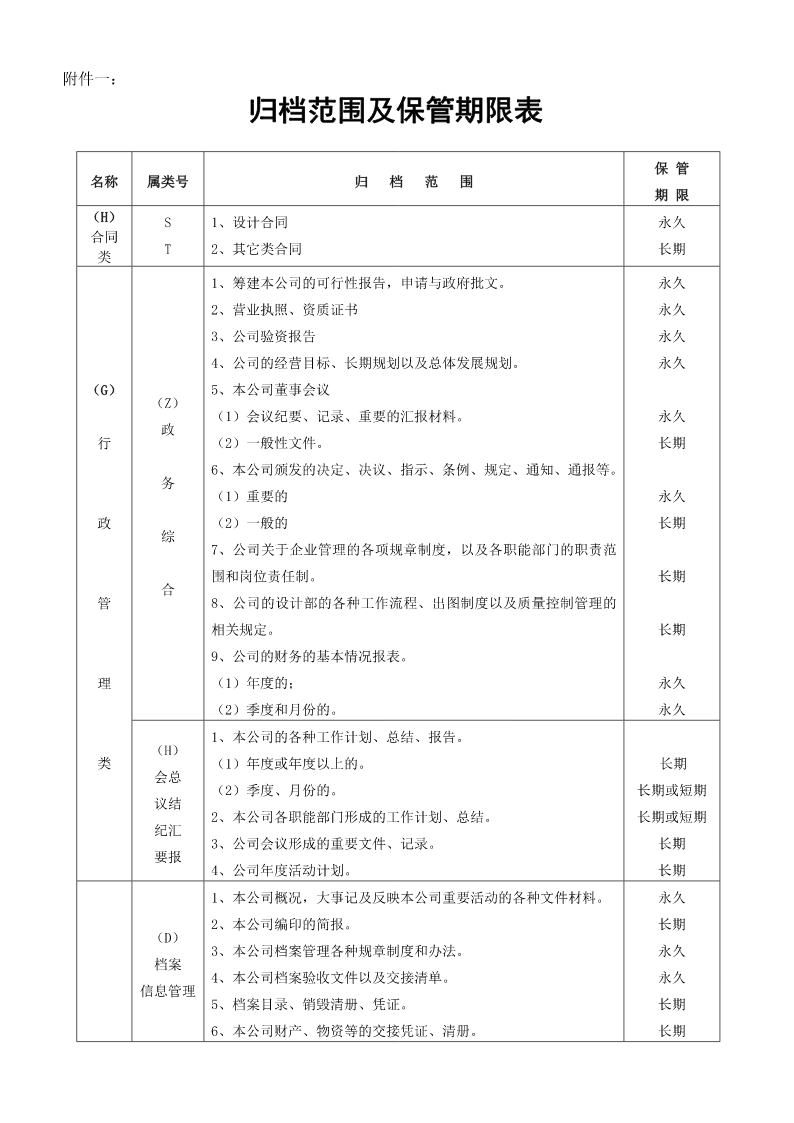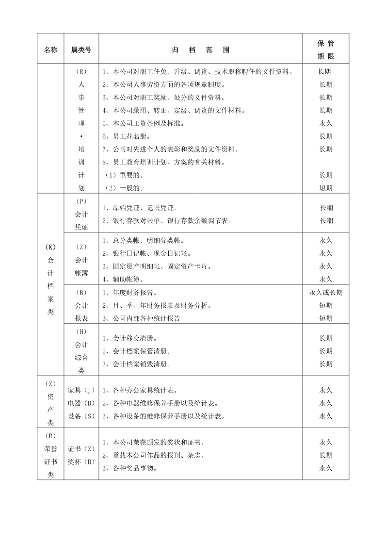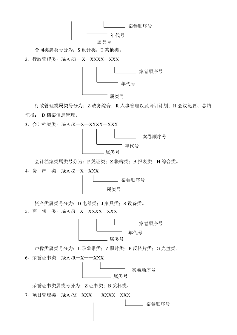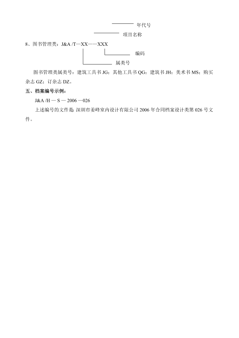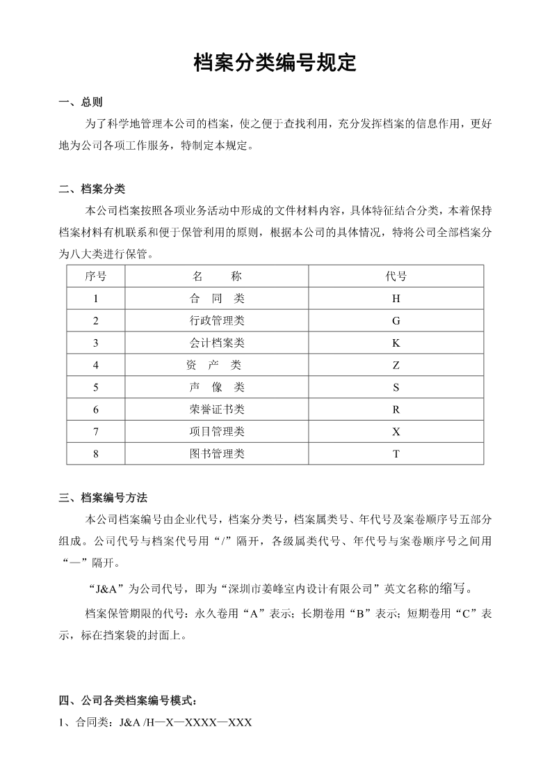 档案分类编号规定一、总则为了科学地管理本公司的档案,使之便于查找利用,充分发挥档案的信息作用,更好地为公司各项工作服务,特制定本规定。二、档案分类本公司档案按照各项业务活动中形成的文件材料内容,具体特征结合分类,本着保持档案材料有机联系和便于保管利用的原则,根据本公司的具体情况,特将公司全部档案分为八大类进行保管。序号名称代号1合同类H2行政管理类G3会计档案类K4资产类Z5声像类S6荣誉证书类R7项目管理类X8图书管理类T三、档案编号方法本公司档案编号由企业代号,档案分类号,档案属类号、年代号及案卷顺序号五部分组成。公司代号与档案代号用“/”隔开,各级属类代号、年代号与案卷顺序号之间用“—”隔开。“J&A”为公司代号,即为“深圳市姜峰室内设计有限公司”英文名称的缩写。档案保管期限的代号:永久卷用“A”表示;长期卷用“B”表示;短期卷用“C”表示,标在挡案袋的封面上。四、公司各类档案编号模式:1、合同类:J&A/H—X—XXXX—XXX案卷顺序号年代号属类号合同类属类号分为:S设计类;T其他类。2、行政管理类:J&A/G—X—XXXX—XXX案卷顺序号年代号属类号行政管理类属类号分为:Z政务综合;R人事管理以及培训计划;H会议纪要、总结汇报;D档案信息管理。3、会计档案类:J&A/K—X—XXXX—XXX案卷顺序号年代号属类号会计档案类属类号分为:P凭证类;Z帐簿类;B报表类;H综合类。4、资产类:J&A/Z—X—XXX案卷顺序号属类号资产类属类号分为:D电器类;J家具类;S设备类。5、声像类:J&A/S—X—XXXX—XXX案卷顺序号年代号属类号声像类属类号分为:L录象带类;Z照片类;P反转片类;G光盘类。6、荣誉证书类:J&A/R—X——XXX案卷顺序号属类号荣誉证书类属类号分为:Z证书类;B奖杯类。7、项目管理类:J&A/M—XXX——XXXX—XXX案卷顺序号年代号项目名称8、图书管理类:J&A/T—XX——XXX编码属类号图书管理类属类号:建筑工具书JG;其他工具书QG;建筑书JH;美术书MS;购买杂志GZ;订杂志DZ。五、档案编号示例:J&A/H—S—2006—026上述编号的文件是:深圳市姜峰室内设计有限公司2006年合同档案设计类第026号文件。附件一:归档范围及保管期限表保管名称属类号归档范围期限(H)S1、设计合同永久合同T2、其它类合同长期类1、筹建本公司的可行性报告,申请与政府批文。永久2、营业执照、资质证书永久3、公司验资报告永久4、公司的经营目标、长期规划以及总体发展规划。永久(G)5、本公司董事会议(Z)(1)会议纪要、记录、重要的汇报材料。永久政行(2)一般性文件。长期6、本公司颁发的决定、决议、指示、条例、规定、通知、通报等。务(1)重要的永久政(2)一般的长期综7、公司关于企业管理的各项规章制度,以及各职能部门的职责范围和岗位责任制。长期合管8、公司的设计部的各种工作流程、出图制度以及质量控制管理的相关规定。长期9、公司的财务的基本情况报表。理(1)年度的;永久(2)季度和月份的。永久1、本公司的各种工作计划、总结、报告。(H)类(1)年度或年度以上的。长期会总(2)季度、月份的。长期或短期议结2、本公司各职能部门形成的工作计划、总结。长期或短期纪汇3、公司会议形成的重要文件、记录。长期要报4、公司年度活动计划。长期1、本公司概况,大事记及反映本公司重要活动的各种文件材料。永久2、本公司编印的简报。长期(D)3、本公司档案管理各种规章制度和办法。永久档案4、本公司档案验收文件以及交接清单。永久信息管理5、档案目录、销毁清册、凭证。长期6、本公司财产、物资等的交接凭证、清册。长期保管名称属类号归档范围期限(R)1、本公司对职工任免、升级、调资、技术职称聘任的文件资料。长期人2、本公司人事劳资方面的各项规章制度。长期事3、本公司对职工奖励、处分的文件资料。长期管4、本公司录用、转正、定级、调资的文件材料。长期理5、本公司工资条例及标准。永久·6、员工花名册。长期培7、公司对先进个人的表彰和奖励的文件资料。长期训8、员工教育培训计划、方案的有关材料。计(1)重要的。长期划(2)一般的。短期(P)1、原始凭证、记帐凭证。长期会计2、银行存款对帐单、银行存款余额调节表。长期凭证1、总分类帐、明细分类帐。永久(K)(Z)2、银行日记帐、现金日记帐。永久会会计3、固定资产明细帐、固定资产卡片。永久计帐簿4、辅助帐簿。永久档(B)1、年度财务报告。永久或长期案会计2、月、季、年财务报表及财务分析。短期类报表3、公司内部各种统计报告短期(H)1、会计移交清册。长期会计2、会计档案保管清册。长期综合3、会计档案销毁清册。长期类(Z)家具(J)1、各种办公家具统计表。永久资电器(D)2、各种电器维修保养手册以及统