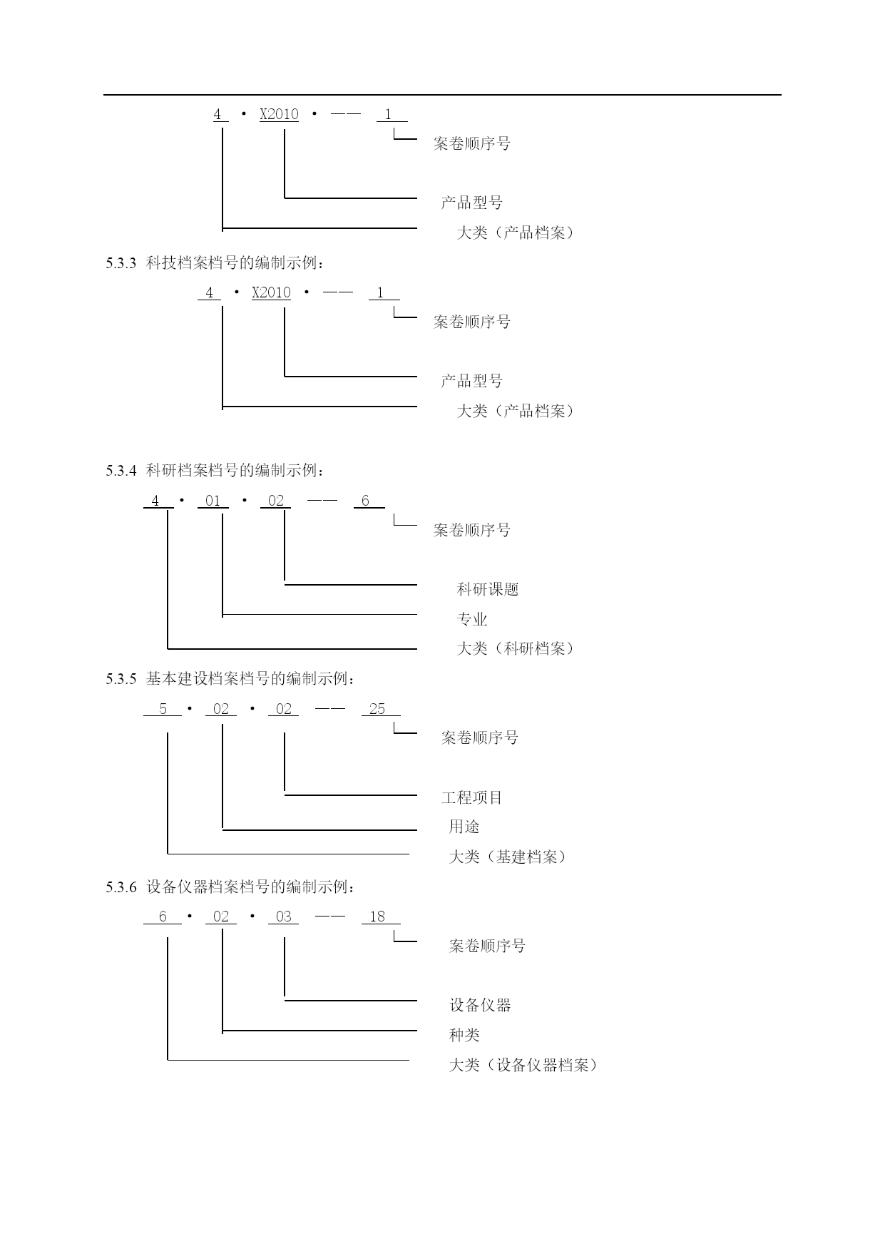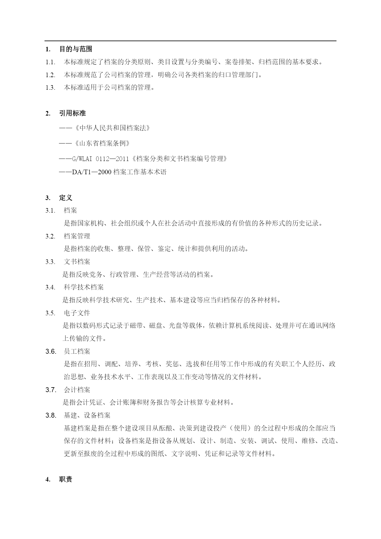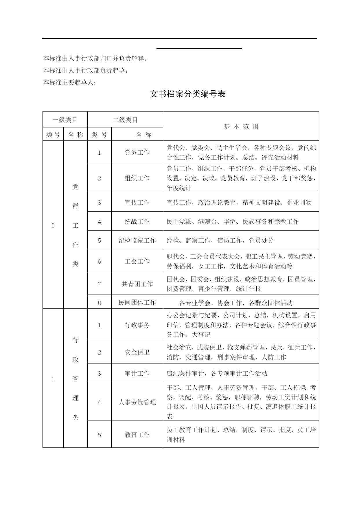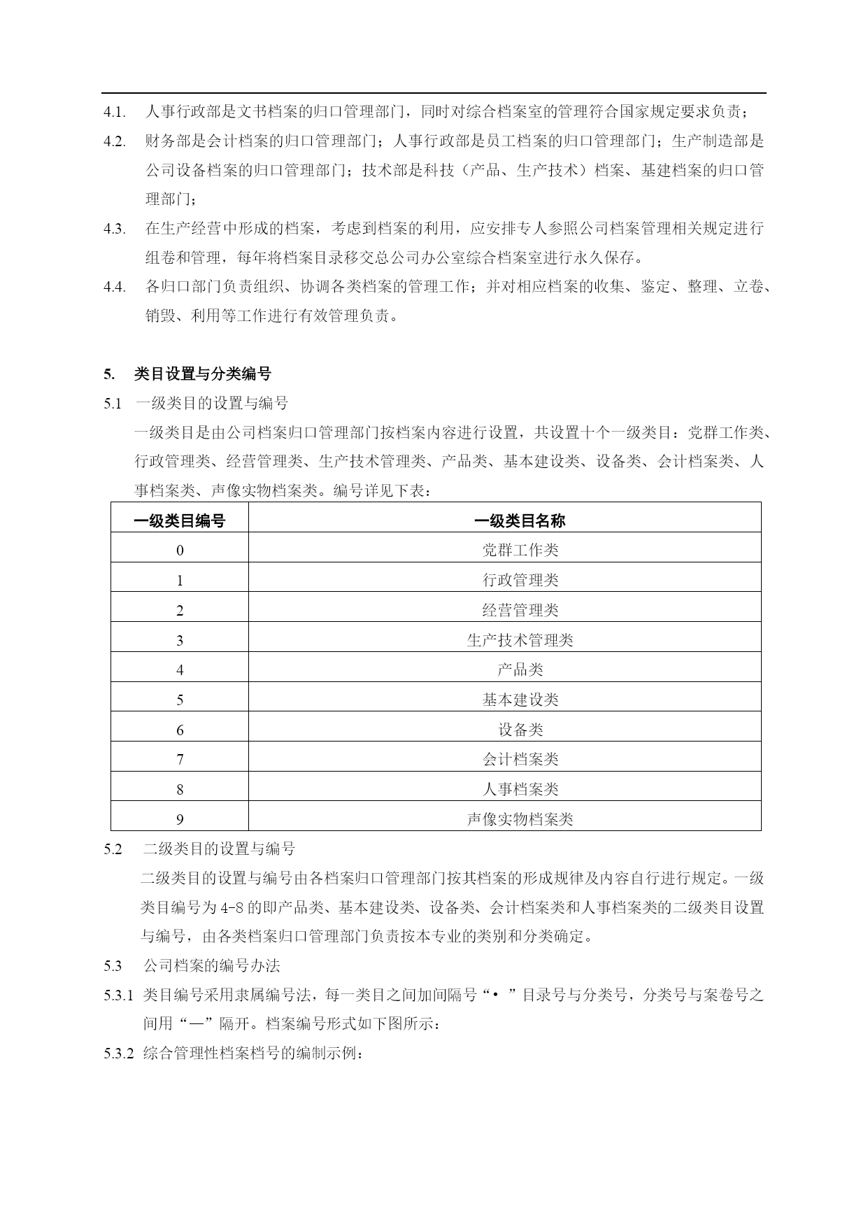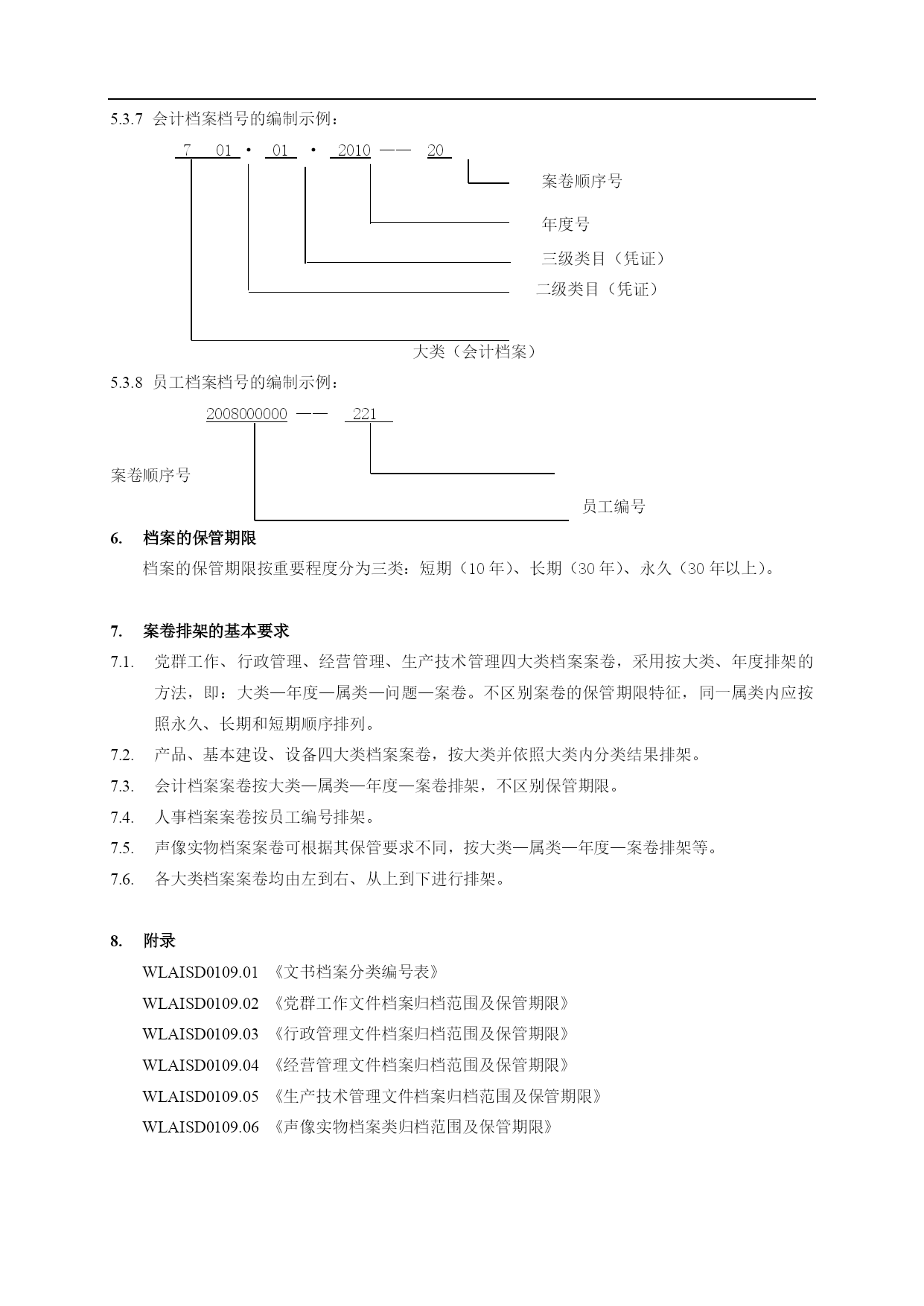档案分类和文书档案编号管理规则(A版)WLAISD0109—2011目的与范围本标准规定了档案的分类原则、类目设置与分类编号、案卷排架、归档范围的基本要求。本标准规范了公司档案的管理,明确公司各类档案的归口管理部门。本标准适用于公司档案的管理。引用标准——《中华人民共和国档案法》——《山东省档案条例》——G/WLAI0112—2011《档案分类和文书档案编号管理》——DA/T1—2000档案工作基本术语定义档案是指国家机构、社会组织或个人在社会活动中直接形成的有价值的各种形式的历史记录。档案管理是指档案的收集、整理、保管、鉴定、统计和提供利用的活动。文书档案是指反映党务、行政管理、生产经营等活动的档案。科学技术档案是指反映科学技术研究、生产技术、基本建设等应当归档保存的各种材料。电子文件是指以数码形式记录于磁带、磁盘、光盘等载体,依赖计算机系统阅读、处理并可在通讯网络上传输的文件。员工档案是指在招用、调配、培养、考核、奖惩、选拔和任用等工作中形成的有关职工个人经历、政治思想、业务技术水平、工作表现以及工作变动等情况的文件材料。会计档案是指会计凭证、会计账簿和财务报告等会计核算专业材料。基建、设备档案基建档案是指在整个建设项目从酝酿、决策到建设投产(使用)的全过程中形成的全部应当保存的文件材料;设备档案是指设备从规划、设计、制造、安装、调试、使用、维修、改造、更新至报废的全过程中形成的图纸、文字说明、凭证和记录等文件材料。职责人事行政部是文书档案的归口管理部门,同时对综合档案室的管理符合国家规定要求负责;财务部是会计档案的归口管理部门;人事行政部是员工档案的归口管理部门;生产制造部是公司设备档案的归口管理部门;技术部是科技(产品、生产技术)档案、基建档案的归口管理部门;在生产经营中形成的档案,考虑到档案的利用,应安排专人参照公司档案管理相关规定进行组卷和管理,每年将档案目录移交总公司办公室综合档案室进行永久保存。各归口部门负责组织、协调各类档案的管理工作;并对相应档案的收集、鉴定、整理、立卷、销毁、利用等工作进行有效管理负责。类目设置与分类编号一级类目的设置与编号一级类目是由公司档案归口管理部门按档案内容进行设置,共设置十个一级类目:党群工作类、行政管理类、经营管理类、生产技术管理类、产品类、基本建设类、设备类、会计档案类、人事档案类、声像实物档案类。编号详见下表:一级类目编号一级类目名称0党群工作类1行政管理类2经营管理类3生产技术管理类4产品类5基本建设类6设备类7会计档案类8人事档案类9声像实物档案类二级类目的设置与编号二级类目的设置与编号由各档案归口管理部门按其档案的形成规律及内容自行进行规定。一级类目编号为4-8的即产品类、基本建设类、设备类、会计档案类和人事档案类的二级类目设置与编号,由各类档案归口管理部门负责按本专业的类别和分类确定。公司档案的编号办法类目编号采用隶属编号法,每一类目之间加间隔号“•”目录号与分类号,分类号与案卷号之间用“—”隔开。档案编号形式如下图所示:综合管理性档案档号的编制示例:4·X2010·——1案卷顺序号产品型号大类(产品档案)科技档案档号的编制示例:4·X2010·——1案卷顺序号产品型号大类(产品档案)科研档案档号的编制示例:4·01·02——6案卷顺序号科研课题专业大类(科研档案)基本建设档案档号的编制示例:5·02·02——25案卷顺序号工程项目用途大类(基建档案)设备仪器档案档号的编制示例:6·02·03——18案卷顺序号设备仪器种类大类(设备仪器档案)会计档案档号的编制示例:701·01·2010——20案卷顺序号年度号三级类目(凭证)二级类目(凭证)大类(会计档案)员工档案档号的编制示例:2008000000——221案卷顺序号员工编号档案的保管期限档案的保管期限按重要程度分为三类:短期(10年)、长期(30年)、永久(30年以上)。案卷排架的基本要求党群工作、行政管理、经营管理、生产技术管理四大类档案案卷,采用按大类、年度排架的方法,即:大类—年度—属类—问题—案卷。不区别案卷的保管期限特征,同一属类内应按照永久、长期和短期顺序排列。产品、基本建设、设备四大类档案案卷,按大类并依照大类内分类结果排架。会计档案案卷按大类—属类—年度—案卷排架,不区别保管期限。人事档案案卷按员工编号排架。声像实物档案案卷可根据其保管要求不同,按大类—属类—年度—案卷排架等。各大类档案案卷均由左到右、从上到下进行排架。附录WLAISD0109.01《文书档案分类编号表》WLAISD0109.02《党群工作文件档案归档范围及保管期限》WLAISD0109.03《行政管理文件档案归档范围及保管期限》WLAISD0109.04《经营管理文件档案归档范围及保管期限》WLAISD0109