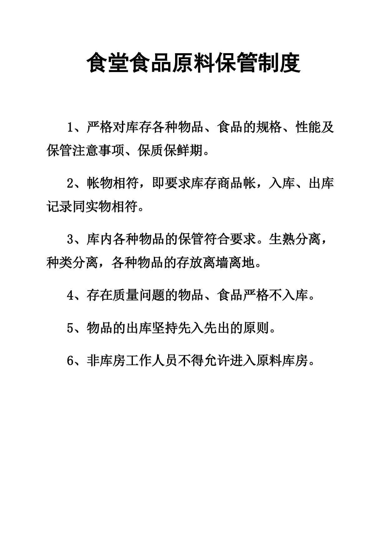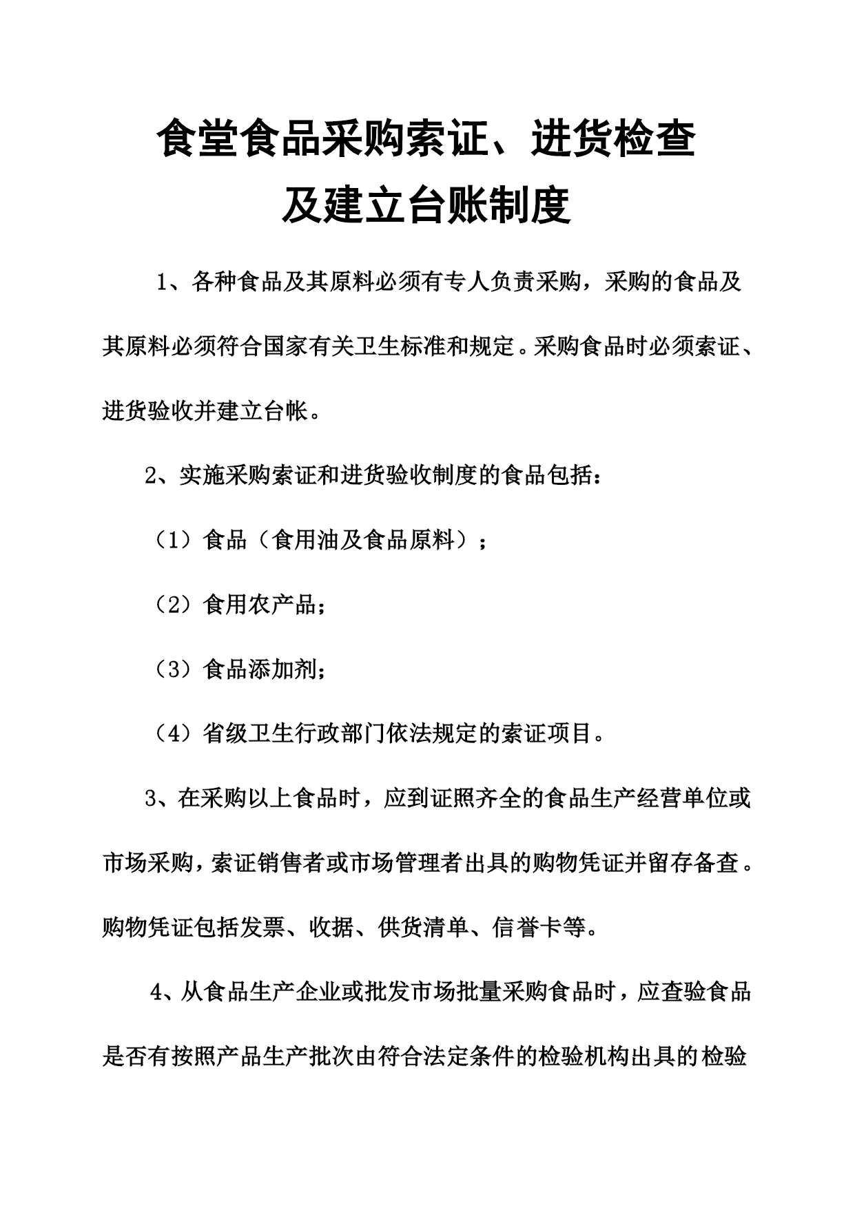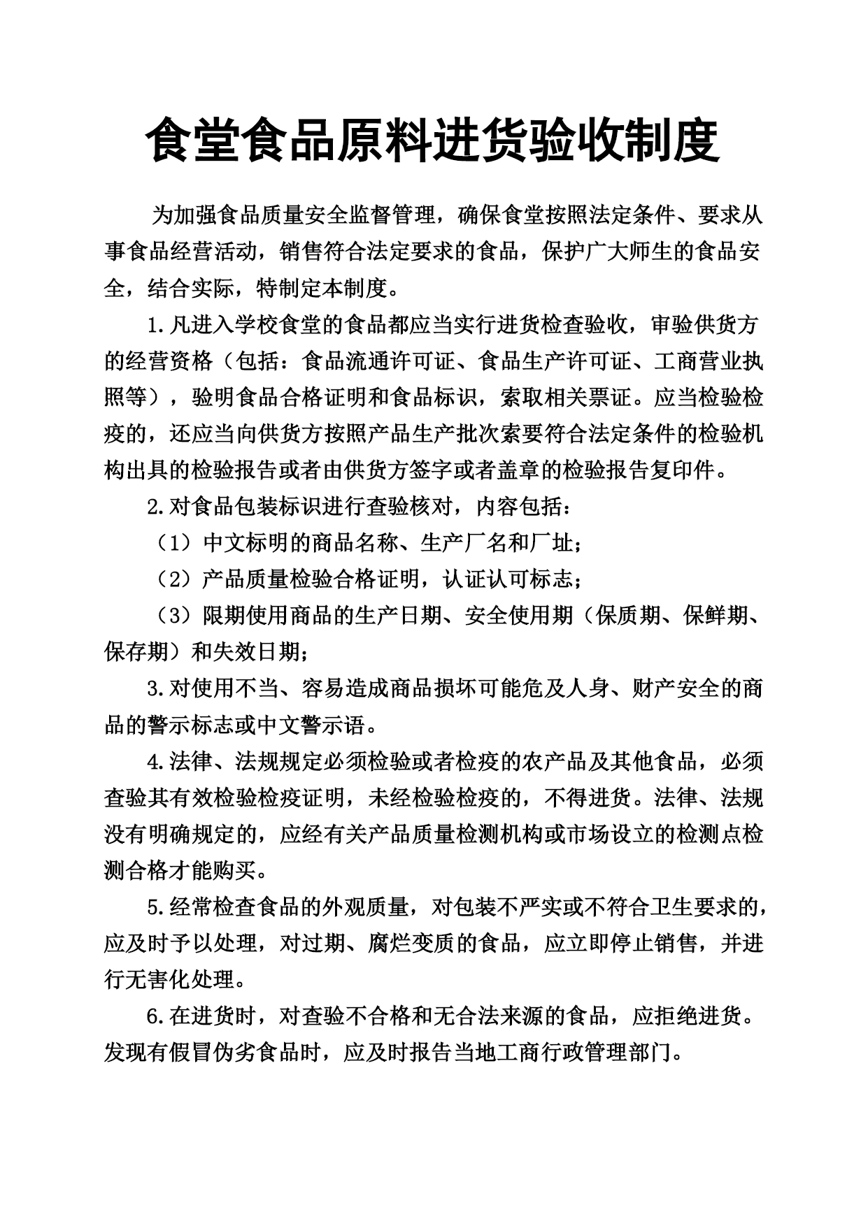 食堂食品安全管理制度一、学校法定代表人(负责人)是食品安全第一责任人,对学校食品安全负全面责任;食品卫生管理员负责食品安全日常管理工作。二、严格做好食品从业人员健康管理和卫生知识培训工作。三、建立健全食品采购索证和台帐制度。四、明确内部卫生管理责职,组织开展食品安全自查自纠。五、注重环境卫生管理,保持加工经营场所内外环境清洁。六、做好食品卫生粗加工、烹饪、贮存和供应等食品加工过程的卫生管理,严格按照操作规程和卫生要求进行操作,确保食品不受污染。七、落实餐饮具、工用具和容器等清洗消毒工作,防止交叉污染。八、按规定做好食品留样工作。食堂食品原料进货验收制度为加强食品质量安全监督管理,确保食堂按照法定条件、要求从事食品经营活动,销售符合法定要求的食品,保护广大师生的食品安全,结合实际,特制定本制度。1.凡进入学校食堂的食品都应当实行进货检查验收,审验供货方的经营资格(包括:食品流通许可证、食品生产许可证、工商营业执照等),验明食品合格证明和食品标识,索取相关票证。应当检验检疫的,还应当向供货方按照产品生产批次索要符合法定条件的检验机构出具的检验报告或者由供货方签字或者盖章的检验报告复印件。2.对食品包装标识进行查验核对,内容包括:(1)中文标明的商品名称、生产厂名和厂址;(2)产品质量检验合格证明,认证认可标志;(3)限期使用商品的生产日期、安全使用期(保质期、保鲜期、保存期)和失效日期;3.对使用不当、容易造成商品损坏可能危及人身、财产安全的商品的警示标志或中文警示语。4.法律、法规规定必须检验或者检疫的农产品及其他食品,必须查验其有效检验检疫证明,未经检验检疫的,不得进货。法律、法规没有明确规定的,应经有关产品质量检测机构或市场设立的检测点检测合格才能购买。5.经常检查食品的外观质量,对包装不严实或不符合卫生要求的,应及时予以处理,对过期、腐烂变质的食品,应立即停止销售,并进行无害化处理。6.在进货时,对查验不合格和无合法来源的食品,应拒绝进货。发现有假冒伪劣食品时,应及时报告当地工商行政管理部门。食堂食品原料保管制度1、严格对库存各种物品、食品的规格、性能及保管注意事项、保质保鲜期。2、帐物相符,即要求库存商品帐,入库、出库记录同实物相符。3、库内各种物品的保管符合要求。生熟分离,种类分离,各种物品的存放离墙离地。4、存在质量问题的物品、食品严格不入库。5、物品的出库坚持先入先出的原则。6、非库房工作人员不得允许进入原料库房。食堂食品原料领用制度1.每天根据生产任务需求,确定食品原材料的领用数量并指定专人负责领货;2.对工作人员(取货员)所取出食品要进行检验,核对数量,杜绝质次、变质、过期食品的出库与食用。3.保管员(验收员)与采购人员(取货人员)均需在入库单(出库单)上签字。食堂食品采购索证、进货检查及建立台账制度1、各种食品及其原料必须有专人负责采购,采购的食品及其原料必须符合国家有关卫生标准和规定。采购食品时必须索证、进货验收并建立台帐。2、实施采购索证和进货验收制度的食品包括:(1)食品(食用油及食品原料);(2)食用农产品;(3)食品添加剂;(4)省级卫生行政部门依法规定的索证项目。3、在采购以上食品时,应到证照齐全的食品生产经营单位或市场采购,索证销售者或市场管理者出具的购物凭证并留存备查。购物凭证包括发票、收据、供货清单、信誉卡等。4、从食品生产企业或批发市场批量采购食品时,应查验食品是否有按照产品生产批次由符合法定条件的检验机构出具的检验合格报告或者由供货商签字(盖章)的检验报告复印件。不能提供检验报告或者检验报告复印件的产品,不得采购。5、采购生猪肉应查验是否为定点屠宰企业屠宰的产品并查验检疫合格证明;采购其他肉类也应查验检疫合格证明。不得采购没有检疫合格证明的肉类。6、从固定供货商或供货基地采购食品的,应索取并留存供货基地或供货商的资质证明,供货商或供货基地应签订采购供货合同并保证食品卫生质量。7、严格进货验收和台账记录制度,在食品入库或使用前核验所购食品与购物凭证是否相符,并进行台账记录。台账应如实记录进货时间、食品名称、规格、数量、供货商及其联系方式等内容。8、妥善保管索证的相关资料和验收记录,不得涂改、伪造,其保存期限不得少于食品使用完毕后6个月。食堂卫生制度1、不选用、不切配、不烹调、不出售腐败、变质、有毒有害的食品;2、块状食品必须充分加热,烧熟煮透,防止外熟内生;3、隔夜、隔餐及外购熟食回锅彻底加热后供应;4、炒菜、烧煮食品勤翻动;5、刀、砧板、盆、布、盆用后清洗消毒,不用品味,食品容器不落地存放;6、制作点心用原料要以销定量,制作时使用色素、香精等食品加,严格执行国家《食品添加剂使用卫生标准》;7、工作结束后,调料加盖,做好工具、容器、灶上灶下、地面墙面的清洁卫生工作;8、操作人员应注意个人卫