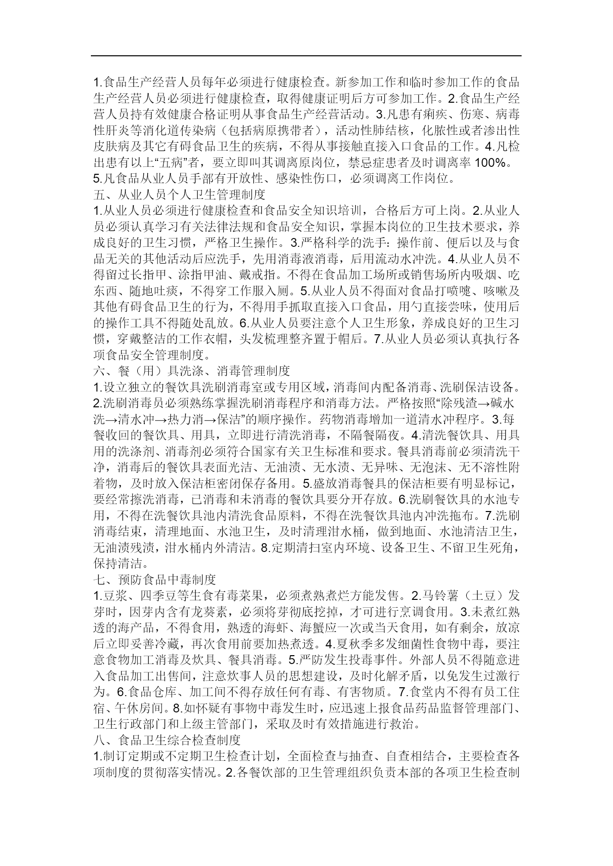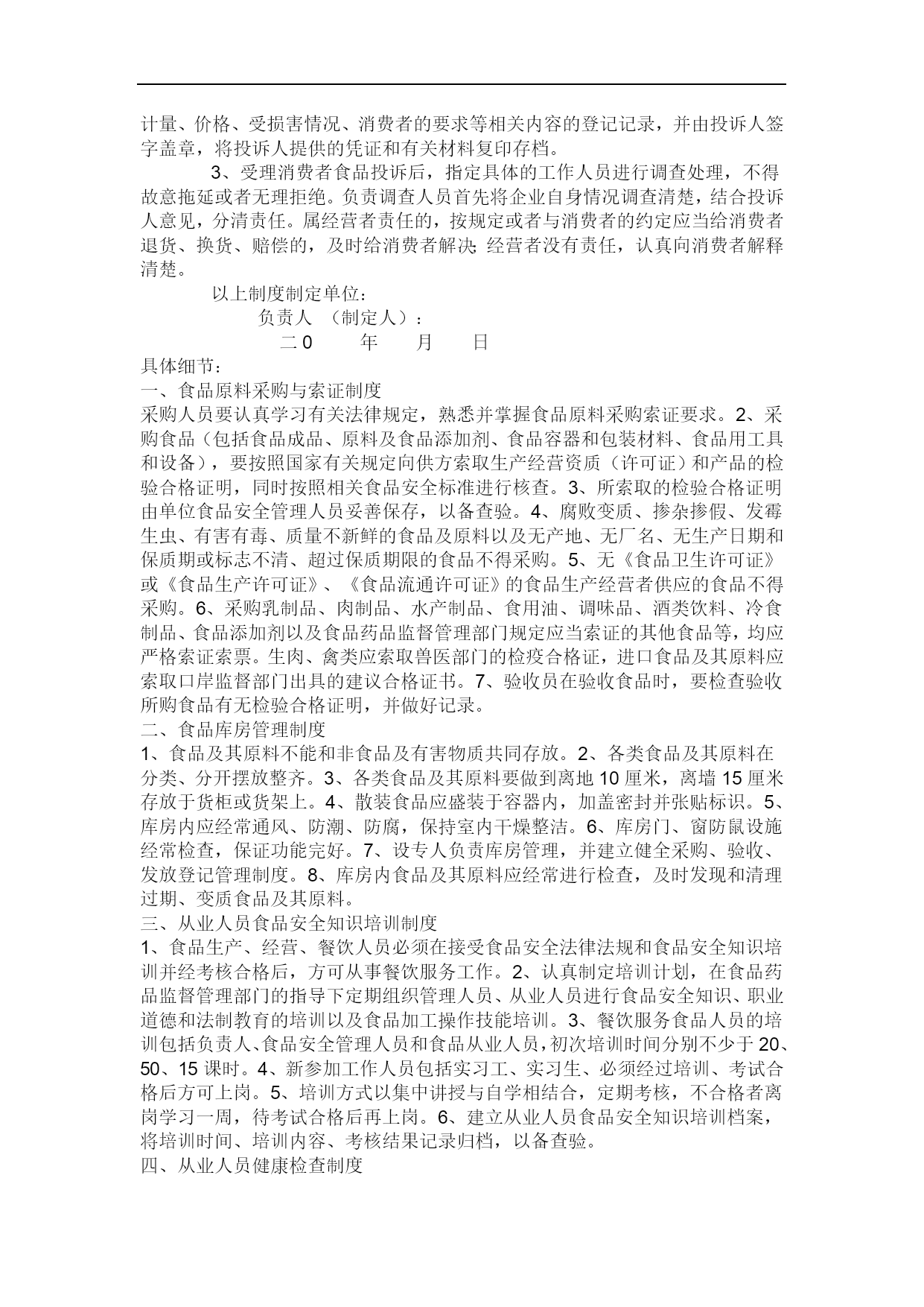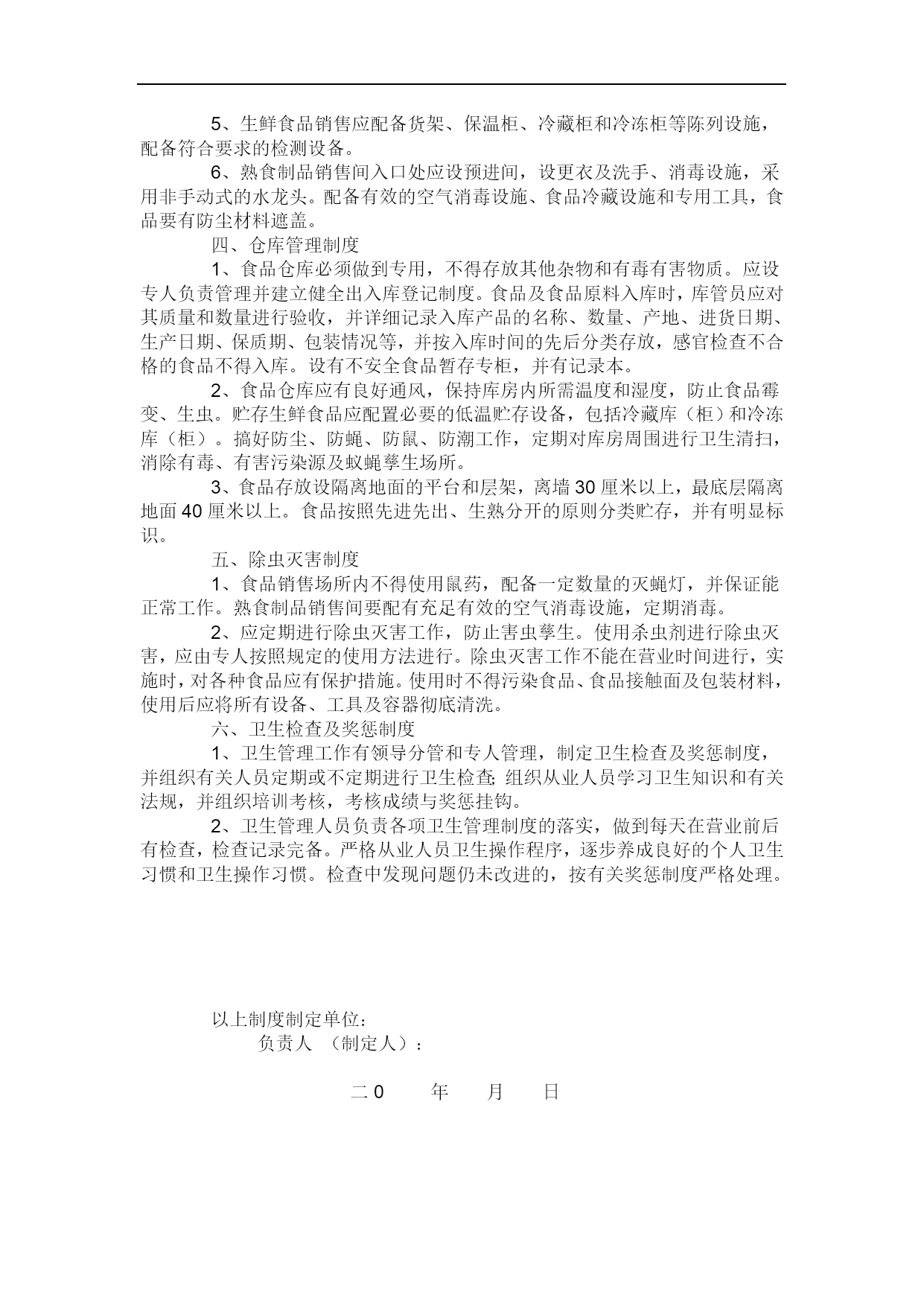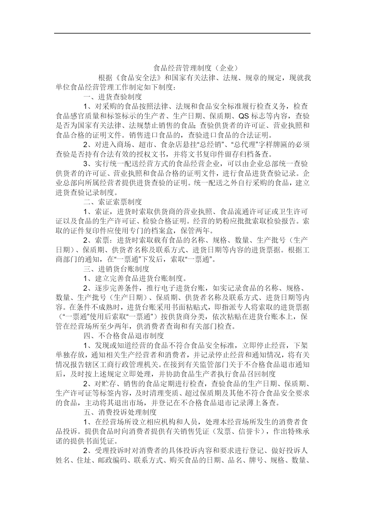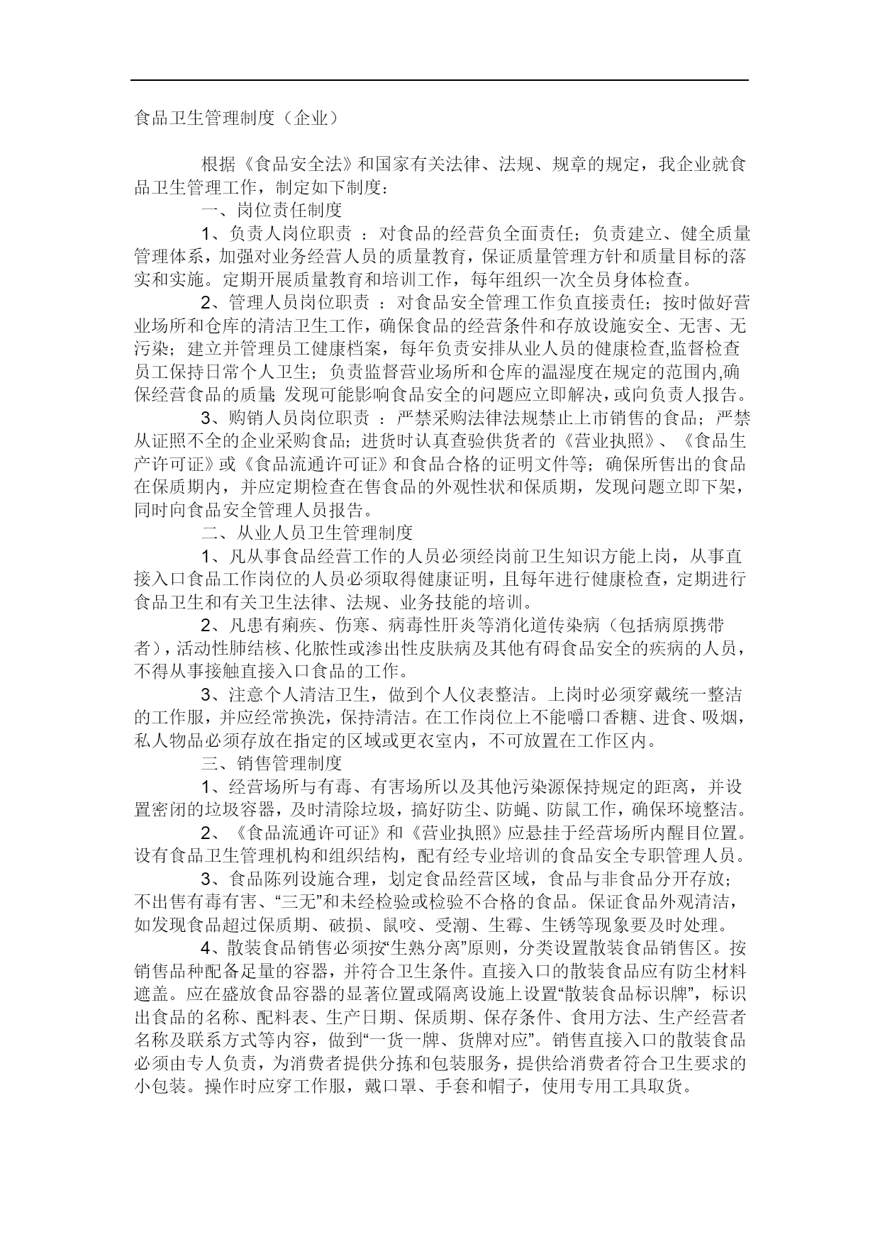食品卫生管理制度(企业)根据《食品安全法》和国家有关法律、法规、规章的规定,我企业就食品卫生管理工作,制定如下制度:一、岗位责任制度1、负责人岗位职责:对食品的经营负全面责任;负责建立、健全质量管理体系,加强对业务经营人员的质量教育,保证质量管理方针和质量目标的落实和实施。定期开展质量教育和培训工作,每年组织一次全员身体检查。2、管理人员岗位职责:对食品安全管理工作负直接责任;按时做好营业场所和仓库的清洁卫生工作,确保食品的经营条件和存放设施安全、无害、无污染;建立并管理员工健康档案,每年负责安排从业人员的健康检查,监督检查员工保持日常个人卫生;负责监督营业场所和仓库的温湿度在规定的范围内,确保经营食品的质量;发现可能影响食品安全的问题应立即解决,或向负责人报告。3、购销人员岗位职责:严禁采购法律法规禁止上市销售的食品;严禁从证照不全的企业采购食品;进货时认真查验供货者的《营业执照》、《食品生产许可证》或《食品流通许可证》和食品合格的证明文件等;确保所售出的食品在保质期内,并应定期检查在售食品的外观性状和保质期,发现问题立即下架,同时向食品安全管理人员报告。二、从业人员卫生管理制度1、凡从事食品经营工作的人员必须经岗前卫生知识方能上岗,从事直接入口食品工作岗位的人员必须取得健康证明,且每年进行健康检查,定期进行食品卫生和有关卫生法律、法规、业务技能的培训。2、凡患有痢疾、伤寒、病毒性肝炎等消化道传染病(包括病原携带者),活动性肺结核、化脓性或渗出性皮肤病及其他有碍食品安全的疾病的人员,不得从事接触直接入口食品的工作。3、注意个人清洁卫生,做到个人仪表整洁。上岗时必须穿戴统一整洁的工作服,并应经常换洗,保持清洁。在工作岗位上不能嚼口香糖、进食、吸烟,私人物品必须存放在指定的区域或更衣室内,不可放置在工作区内。三、销售管理制度1、经营场所与有毒、有害场所以及其他污染源保持规定的距离,并设置密闭的垃圾容器,及时清除垃圾,搞好防尘、防蝇、防鼠工作,确保环境整洁。2、《食品流通许可证》和《营业执照》应悬挂于经营场所内醒目位置。设有食品卫生管理机构和组织结构,配有经专业培训的食品安全专职管理人员。3、食品陈列设施合理,划定食品经营区域,食品与非食品分开存放;不出售有毒有害、“三无”和未经检验或检验不合格的食品。保证食品外观清洁,如发现食品超过保质期、破损、鼠咬、受潮、生霉、生锈等现象要及时处理。4、散装食品销售必须按“生熟分离”原则,分类设置散装食品销售区。按销售品种配备足量的容器,并符合卫生条件。直接入口的散装食品应有防尘材料遮盖。应在盛放食品容器的显著位置或隔离设施上设置“散装食品标识牌”,标识出食品的名称、配料表、生产日期、保质期、保存条件、食用方法、生产经营者名称及联系方式等内容,做到“一货一牌、货牌对应”。销售直接入口的散装食品必须由专人负责,为消费者提供分拣和包装服务,提供给消费者符合卫生要求的小包装。操作时应穿工作服,戴口罩、手套和帽子,使用专用工具取货。5、生鲜食品销售应配备货架、保温柜、冷藏柜和冷冻柜等陈列设施,配备符合要求的检测设备。6、熟食制品销售间入口处应设预进间,设更衣及洗手、消毒设施,采用非手动式的水龙头。配备有效的空气消毒设施、食品冷藏设施和专用工具,食品要有防尘材料遮盖。四、仓库管理制度1、食品仓库必须做到专用,不得存放其他杂物和有毒有害物质。应设专人负责管理并建立健全出入库登记制度。食品及食品原料入库时,库管员应对其质量和数量进行验收,并详细记录入库产品的名称、数量、产地、进货日期、生产日期、保质期、包装情况等,并按入库时间的先后分类存放,感官检查不合格的食品不得入库。设有不安全食品暂存专柜,并有记录本。2、食品仓库应有良好通风,保持库房内所需温度和湿度,防止食品霉变、生虫。贮存生鲜食品应配置必要的低温贮存设备,包括冷藏库(柜)和冷冻库(柜)。搞好防尘、防蝇、防鼠、防潮工作,定期对库房周围进行卫生清扫,消除有毒、有害污染源及蚁蝇孳生场所。3、食品存放设隔离地面的平台和层架,离墙30厘米以上,最底层隔离地面40厘米以上。食品按照先进先出、生熟分开的原则分类贮存,并有明显标识。五、除虫灭害制度1、食品销售场所内不得使用鼠药,配备一定数量的灭蝇灯,并保证能正常工作。熟食制品销售间要配有充足有效的空气消毒设施,定期消毒。2、应定期进行除虫灭害工作,防止害虫孳生。使用杀虫剂进行除虫灭害,应由专人按照规定的使用方法进行。除虫灭害工作不能在营业时间进行,实施时,对各种食品应有保护措施。使用时不得污染食品、食品接触面及包装材料,使用后应将所有设备、工具及容器彻底清洗。六、卫生检查及奖惩制度1、卫生管理工作有领导分管和专人管理,制定卫生检查及奖惩制度,并组织有关人员定期或不定期进行卫生检查;组织从业人员学习卫生知识和有关法