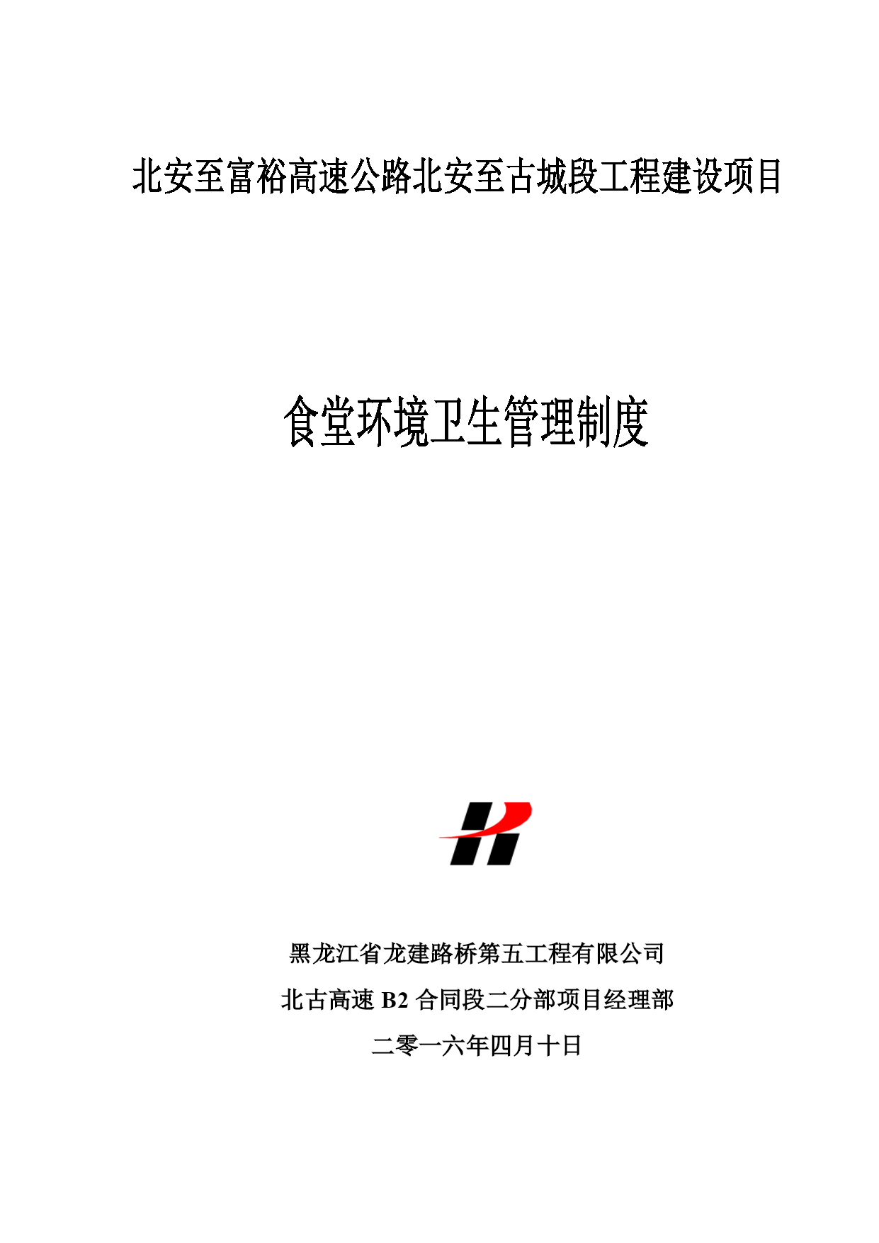 黑龙江省龙建路桥第五工程有限公司北古高速B2合同段二分部项目经理部二零一六年四月十日食堂环境卫生管理制度一、基本要求1、食堂整体环境整洁,物品摆放有序;2、所有规章制度、标识上墙;3、地面清洁干燥,墙面无油腻污垢、不积灰;4、水池、地沟清洁、畅通;5、房顶、玻璃窗清洁、无油腻、斑点;6、防虫蝇、防虫设施齐全并完好。二、粗切配间1、区域划分明确;2、公用具清洁无锈斑、霉斑,归类、定位摆放,标示清晰齐全;3、地面清洁干燥、无残渣,地沟、地沟盖清洁、畅通、无污垢、无异味;4、清洁池必须标示明显,清洁不堵塞、无油腻污垢;5、墙面、房顶、吊扇等设施清洁、无斑点、无积灰。三、仓库1、物品归类、分架摆放,整齐有序,挂牌齐全;2、仓库保持干燥通分。地面、货架、墙面、房顶、换气扇等应保持清洁无积灰、无蛛网、无虫害、无鼠屎、无霉斑。四、厨房1、保持地面,清洁干燥。地面、墙面、吊扇、房顶等设施必须清洁、无油腻油垢;2、灶台清洁,脱排不油腻积垢,灶台底部无残渣,不积垢;3、操作台保持内外清洁、无油腻、调味品规范存放;4、工用具、货架清洁、无油腻、无附着物,标识明显、定位规范摆放;5、厨房地沟必须保持清洁通畅,无残渣、无异味,并做好地沟杀虫去味工作。五、备餐间1、操作台、货架、地架必须清洁、无污垢,每天清洗消毒;2、地面清洁干燥、无积水、无油腻。墙面、房顶、窗台、窗棱、空调、排气扇等均要求清洁卫生;3、紫外线灯必须符合使用要求;4、消毒液配制必须符合消毒要求,误差控制在;5、备餐间内使用的工用具必须全部消毒、保证无菌状态;6、专间工作服必须干净,每天更换清洗。