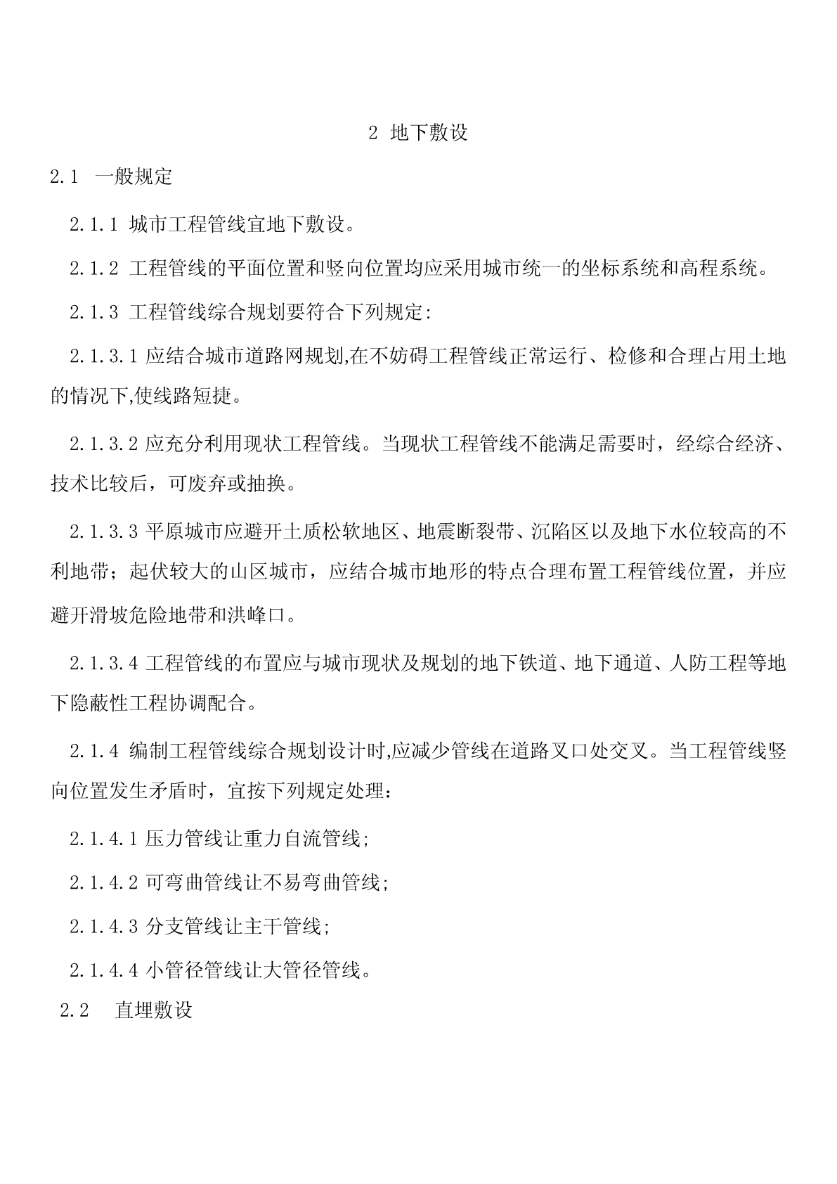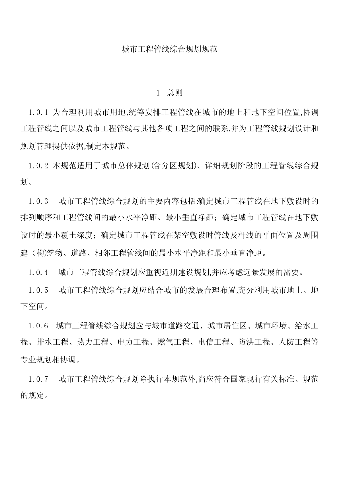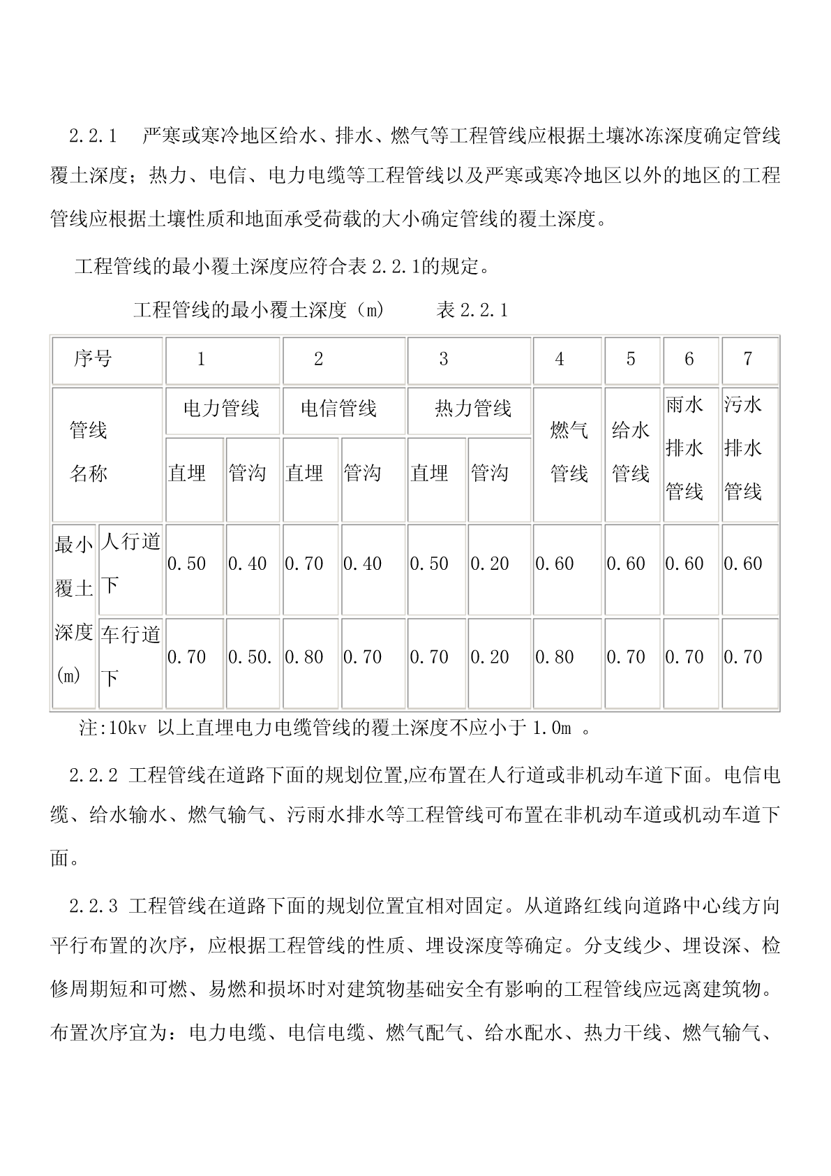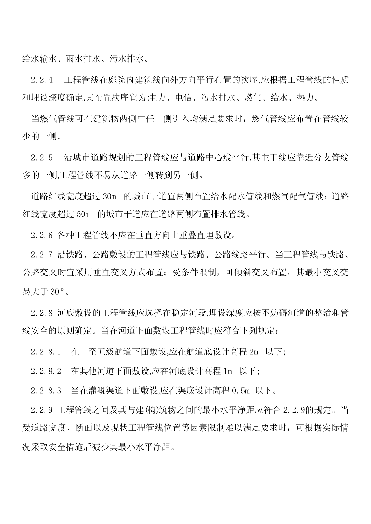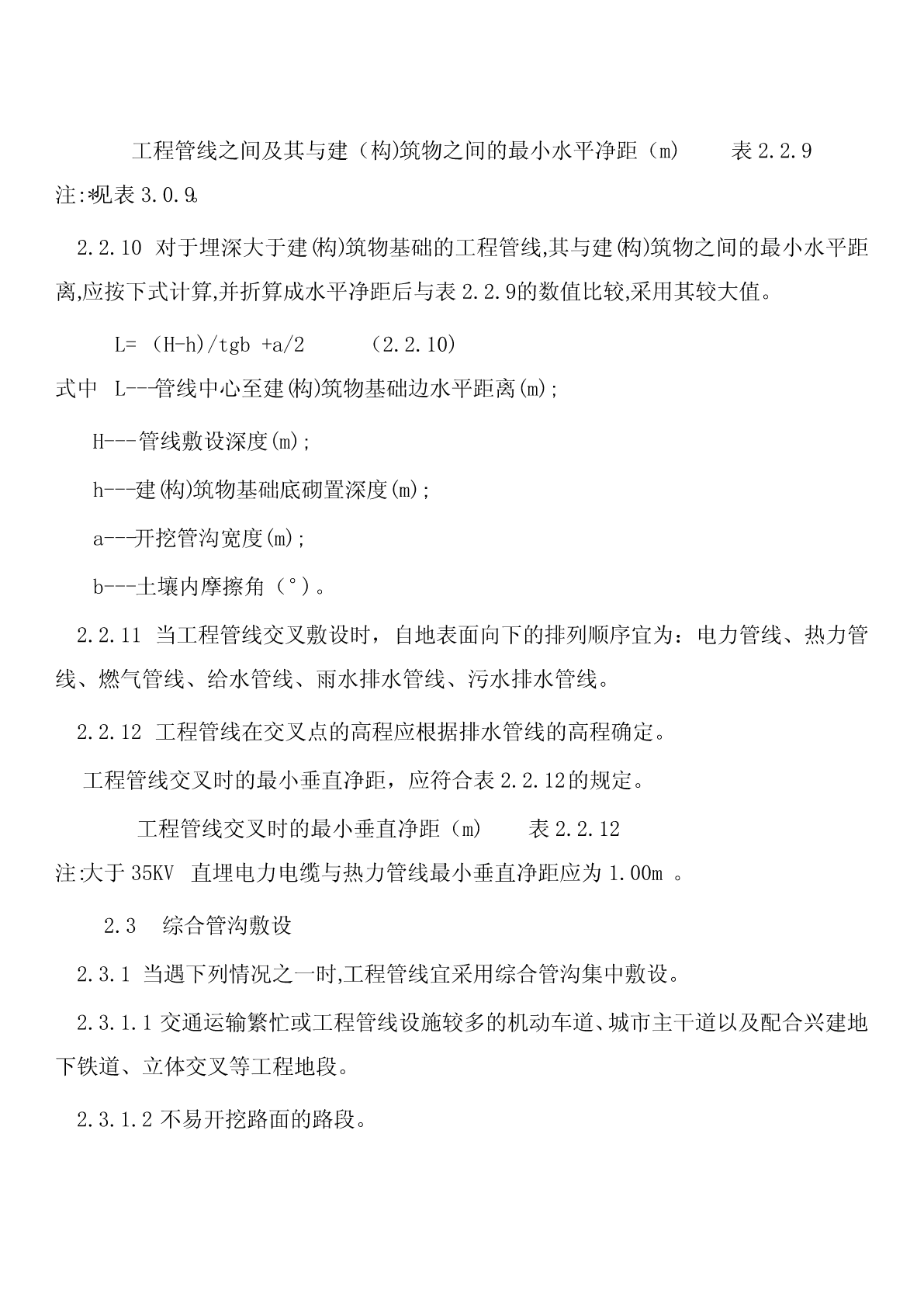 城市工程管线综合规划规范1总则1.0.1为合理利用城市用地,统筹安排工程管线在城市的地上和地下空间位置,协调工程管线之间以及城市工程管线与其他各项工程之间的联系,并为工程管线规划设计和规划管理提供依据,制定本规范。1.0.2本规范适用于城市总体规划(含分区规划)、详细规划阶段的工程管线综合规划。1.0.3城市工程管线综合规划的主要内容包括:确定城市工程管线在地下敷设时的排列顺序和工程管线间的最小水平净距、最小垂直净距;确定城市工程管线在地下敷设时的最小覆土深度;确定城市工程管线在架空敷设时管线及杆线的平面位置及周围建(构)筑物、道路、相邻工程管线间的最小水平净距和最小垂直净距。1.0.4城市工程管线综合规划应重视近期建设规划,并应考虑远景发展的需要。1.0.5城市工程管线综合规划应结合城市的发展合理布置,充分利用城市地上、地下空间。1.0.6城市工程管线综合规划应与城市道路交通、城市居住区、城市环境、给水工程、排水工程、热力工程、电力工程、燃气工程、电信工程、防洪工程、人防工程等专业规划相协调。1.0.7城市工程管线综合规划除执行本规范外,尚应符合国家现行有关标准、规范的规定。2地下敷设2.1一般规定2.1.1城市工程管线宜地下敷设。2.1.2工程管线的平面位置和竖向位置均应采用城市统一的坐标系统和高程系统。2.1.3工程管线综合规划要符合下列规定:2.1.3.1应结合城市道路网规划,在不妨碍工程管线正常运行、检修和合理占用土地的情况下,使线路短捷。2.1.3.2应充分利用现状工程管线。当现状工程管线不能满足需要时,经综合经济、技术比较后,可废弃或抽换。2.1.3.3平原城市应避开土质松软地区、地震断裂带、沉陷区以及地下水位较高的不利地带;起伏较大的山区城市,应结合城市地形的特点合理布置工程管线位置,并应避开滑坡危险地带和洪峰口。2.1.3.4工程管线的布置应与城市现状及规划的地下铁道、地下通道、人防工程等地下隐蔽性工程协调配合。2.1.4编制工程管线综合规划设计时,应减少管线在道路叉口处交叉。当工程管线竖向位置发生矛盾时,宜按下列规定处理:2.1.4.1压力管线让重力自流管线;2.1.4.2可弯曲管线让不易弯曲管线;2.1.4.3分支管线让主干管线;2.1.4.4小管径管线让大管径管线。2.2直埋敷设2.2.1严寒或寒冷地区给水、排水、燃气等工程管线应根据土壤冰冻深度确定管线覆土深度;热力、电信、电力电缆等工程管线以及严寒或寒冷地区以外的地区的工程管线应根据土壤性质和地面承受荷载的大小确定管线的覆土深度。工程管线的最小覆土深度应符合表2.2.1的规定。工程管线的最小覆土深度(m)表2.2.1序号1234567电力管线电信管线热力管线雨水污水管线燃气给水排水排水名称直埋管沟直埋管沟直埋管沟管线管线管线管线最小人行道0.500.400.700.400.500.200.600.600.600.60覆土下深度车行道0.700.50.0.800.700.700.200.800.700.700.70(m)下注:10kv以上直埋电力电缆管线的覆土深度不应小于1.0m。2.2.2工程管线在道路下面的规划位置,应布置在人行道或非机动车道下面。电信电缆、给水输水、燃气输气、污雨水排水等工程管线可布置在非机动车道或机动车道下面。2.2.3工程管线在道路下面的规划位置宜相对固定。从道路红线向道路中心线方向平行布置的次序,应根据工程管线的性质、埋设深度等确定。分支线少、埋设深、检修周期短和可燃、易燃和损坏时对建筑物基础安全有影响的工程管线应远离建筑物。布置次序宜为:电力电缆、电信电缆、燃气配气、给水配水、热力干线、燃气输气、给水输水、雨水排水、污水排水。2.2.4工程管线在庭院内建筑线向外方向平行布置的次序,应根据工程管线的性质和埋设深度确定,其布置次序宜为:电力、电信、污水排水、燃气、给水、热力。当燃气管线可在建筑物两侧中任一侧引入均满足要求时,燃气管线应布置在管线较少的一侧。2.2.5沿城市道路规划的工程管线应与道路中心线平行,其主干线应靠近分支管线多的一侧,工程管线不易从道路一侧转到另一侧。道路红线宽度超过30m的城市干道宜两侧布置给水配水管线和燃气配气管线;道路红线宽度超过50m的城市干道应在道路两侧布置排水管线。2.2.6各种工程管线不应在垂直方向上重叠直埋敷设。2.2.7沿铁路、公路敷设的工程管线应与铁路、公路线路平行。当工程管线与铁路、公路交叉时宜采用垂直交叉方式布置;受条件限制,可倾斜交叉布置,其最小交叉交易大于30º。2.2.8河底敷设的工程管线应选择在稳定河段,埋设深度应按不妨碍河道的整治和管线安全的原则确定。当在河道下面敷设工程管线时应符合下列规定:2.2.8.1在一至五级航道下面敷设,应在航道底设计高程2m以下;2.2.8.2