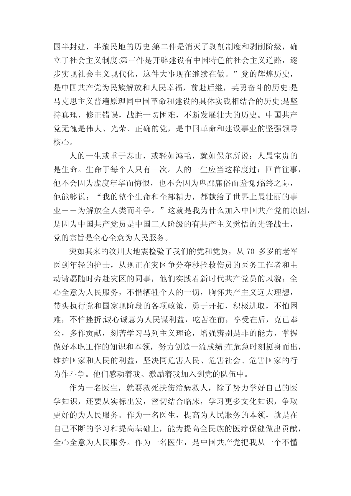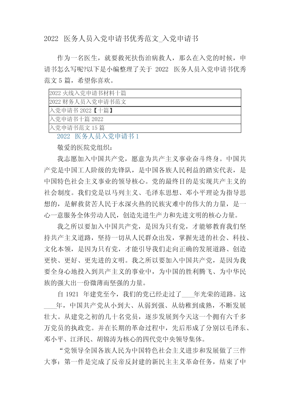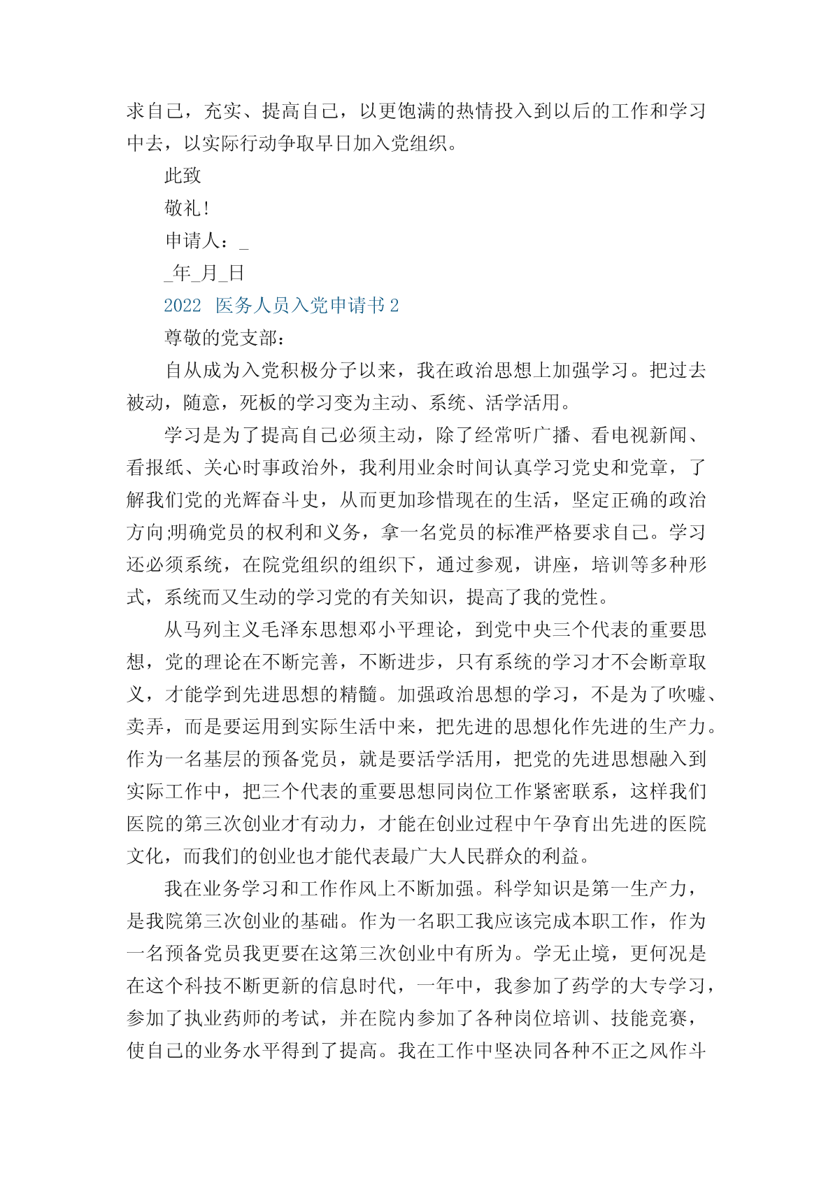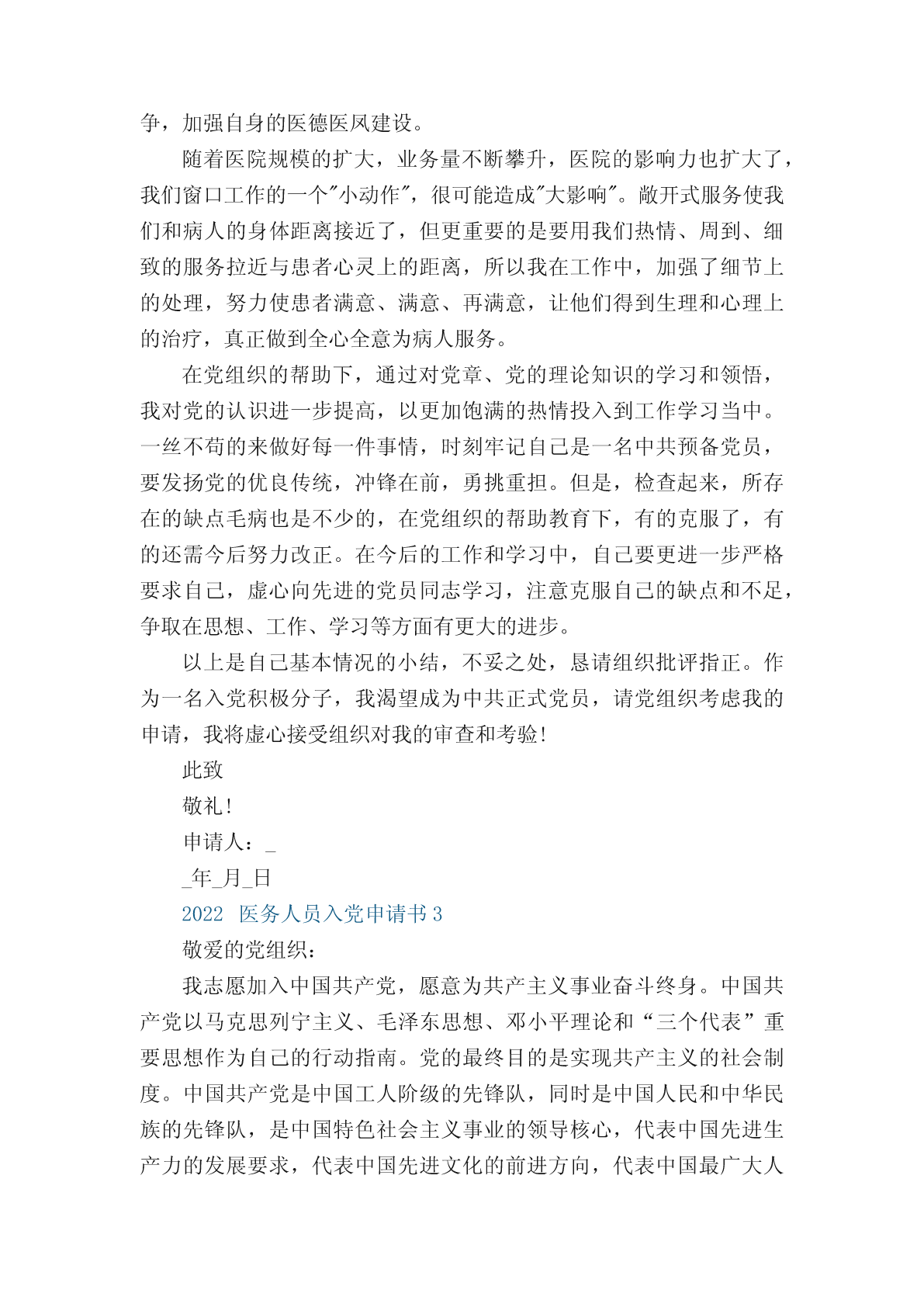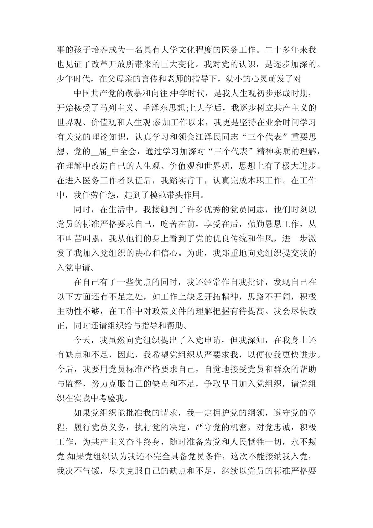2022医务人员入党申请书优秀范文_入党申请书作为一名医生,就要救死扶伤治病救人,那么在入党的时候,申请书怎么写呢?以下是小编整理了关于2022医务人员入党申请书优秀范文5篇,希望你喜欢。2022火线入党申请书材料十篇2022财务人员入党申请书范文入党申请书2022【十篇】入党申请书十篇2022入党申请书范文15篇2022医务人员入党申请书1敬爱的医院党组织:我志愿加入中国共产党,愿意为共产主义事业奋斗终身。中国共产党是中国工人阶级的先锋队,是中国各族人民利益的踏实代表,是中国特色社会主义事业的领导核心。党的最终目的是实现共产主义的社会制度。我们党是以马列主义、毛泽东思想、邓小平理论为指导思想的,是解救贫苦人民于水深火热的民族灾难中的伟大的力量,是一心一意服务全体劳动人民,创造先进生产力和先进文明的核心力量。我之所以要加入中国共产党,是因为只有党,才能够教育我们坚持共产主义道路,坚持一切从人民群众出发,掌握先进的社会、科技、文化本领,是因为只有党,才能引导我们走向正确的发展道路、创造更快、更好、更先进的文明。我之所以要加入中国共产党,是因为我要全身心地投入到共产主义的事业中,为中国的胜利腾飞、为中华民族的强大出一份微薄而坚强的力量。自1921年建党至今,我们的党已经走过了____年光荣的道路。这____年,中国共产党从小到大、从弱到强、从幼稚到成熟,不断发展壮大。从建党之初的几十名党员,逐步发展到今天这一个拥有六千多万党员的执政党。并在长期的革命过程中,先后形成了分别以毛泽东、邓小平、江泽民、胡锦涛为核心的四代党中央领导集体。“党领导全国各族人民为中国特色社会主义进步和发展做了三件大事:第一件是完成了反帝反封建的新民主主义革命任务,结束了中国半封建、半殖民地的历史;第二件是消灭了剥削制度和剥削阶级,确立了社会主义制度;第三件是开辟建设有中国特色的社会主义道路,逐步实现社会主义现代化,这件大事现在继续在做。”党的辉煌历史,是中国共产党为民族解放和人民幸福,前赴后继,英勇奋斗的历史;是马克思主义普遍原理同中国革命和建设的具体实践相结合的历史;是坚持真理,修正错误,战胜一切困难,不断发展壮大的历史。中国共产党无愧是伟大、光荣、正确的党,是中国革命和建设事业的坚强领导核心。人的一生或重于泰山,或轻如鸿毛,就如保尔所说:人最宝贵的是生命。生命于每个人只有一次。人的一生应当这样度过:回首往事,他不会因为虚度年华而悔恨,也不会因为卑鄙庸俗而羞愧;临终之际,他能够说:“我的整个生命和全部精力,都献给了世界上最壮丽的事业――为解放全人类而斗争。”这就是我为什么加入中国共产党的原因,是因为中国共产党员是中国工人阶级的有共产主义觉悟的先锋战士,党的宗旨是全心全意为人民服务。突如其来的汶川大地震检验了我们的党和党员,从70多岁的老军医到年轻的护士,从现正在灾区争分夺秒抢救伤员的医务工作者和主动请愿随时奔赴灾区的同事,他们实践着新时代共产党员的风貌:全心全意为人民服务,不惜牺牲个人的一切,胸怀共产主义远大理想,带头执行党和国家现阶段的各项政策,勇于开拓,积极进取,不怕困难,不怕挫折;诚心诚意为人民谋利益,吃苦在前,享受在后,克已奉公,多作贡献,刻苦学习马列主义理论,增强辨别是非的能力,掌握做好本职工作的知识和本领,努力创造一流成绩;在危急时刻挺身而出,维护国家和人民的利益,坚决同危害人民、危害社会、危害国家的行为作斗争。他们感动着我、激励着我加入到党的队伍中。作为一名医生,就要救死扶伤治病救人,除了努力学好自己的医学知识,还要从实标出发,密切结合临床,学习更多文化知识,争取更好的为人民服务。作为一名医生,提高为人民服务的本领,就是在自己不断的学习和提高基础上,能为提高全民族的医疗保健做出贡献,全心全意为人民服务。作为一名医生,是中国共产党把我从一个不懂事的孩子培养成为一名具有大学文化程度的医务工作。二十多年来我也见证了改革开放所带来的巨大变化。我对党的认识,是逐步加深的。少年时代,在父母亲的言传和老师的指导下,幼小的心灵萌发了对中国共产党的敬慕和向往;中学时代,是我人生观初步形成时期,开始接受了马列主义、毛泽东思想;上大学后,我逐步树立共产主义的世界观、价值观和人生观;参加工作以来,我更是坚持在业余时间学习有关党的理论知识,认真学习和领会江泽民同志“三个代表”重要思想、党的__届_中全会,通过学习加深对“三个代表”精神实质的理解,在理解中改造自己的人生观、价值观和世界观,思想上有了极大进步。在进入医务工作者队伍后,我踏实肯干,认真完成本职工作。在工作中,我任劳任怨,起到了模范带头作用。同时,在生活中,我接触到了许多优秀的党员同志,他们时刻以党员的标准严格要求自己,吃苦在前,享受在后,勤勤恳恳工作,从不叫苦叫累,我从他们的身上看到了党的优良传统和作风,进