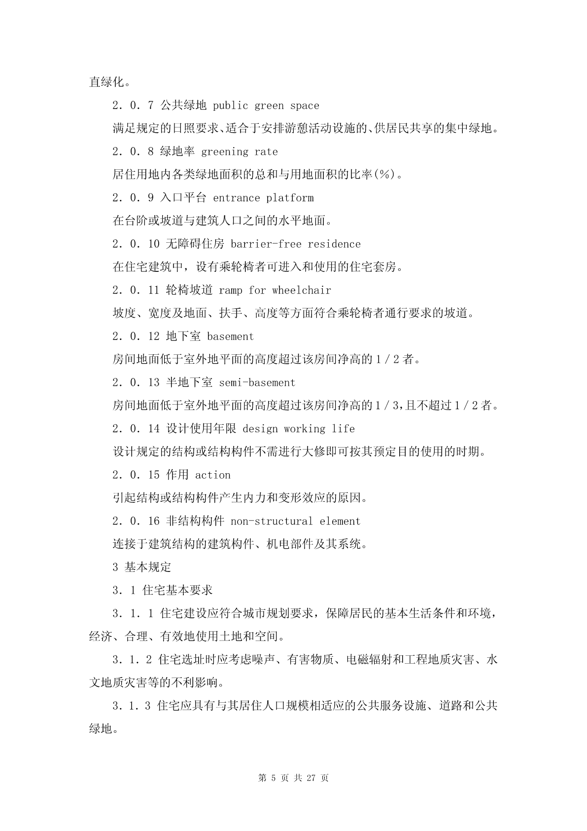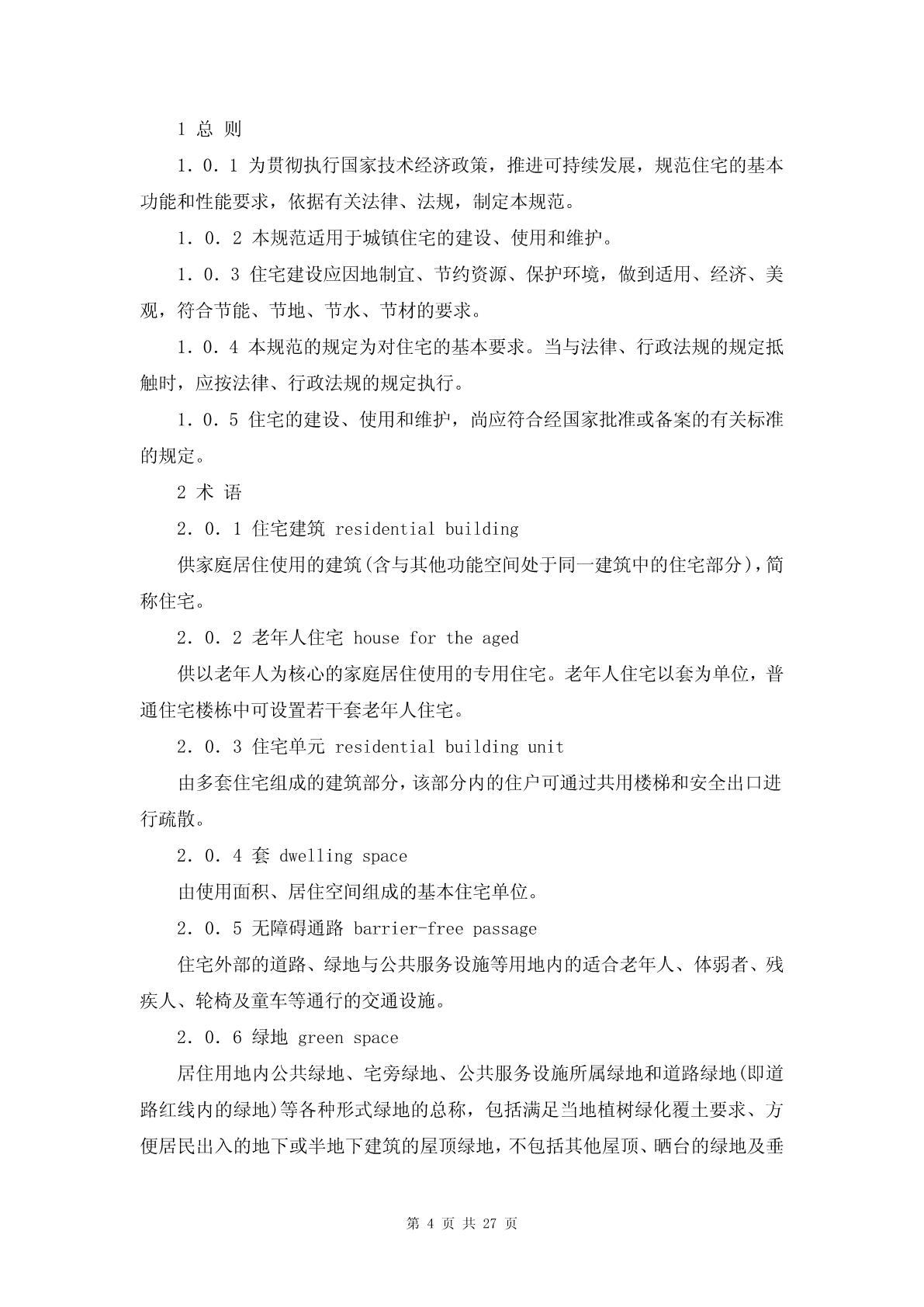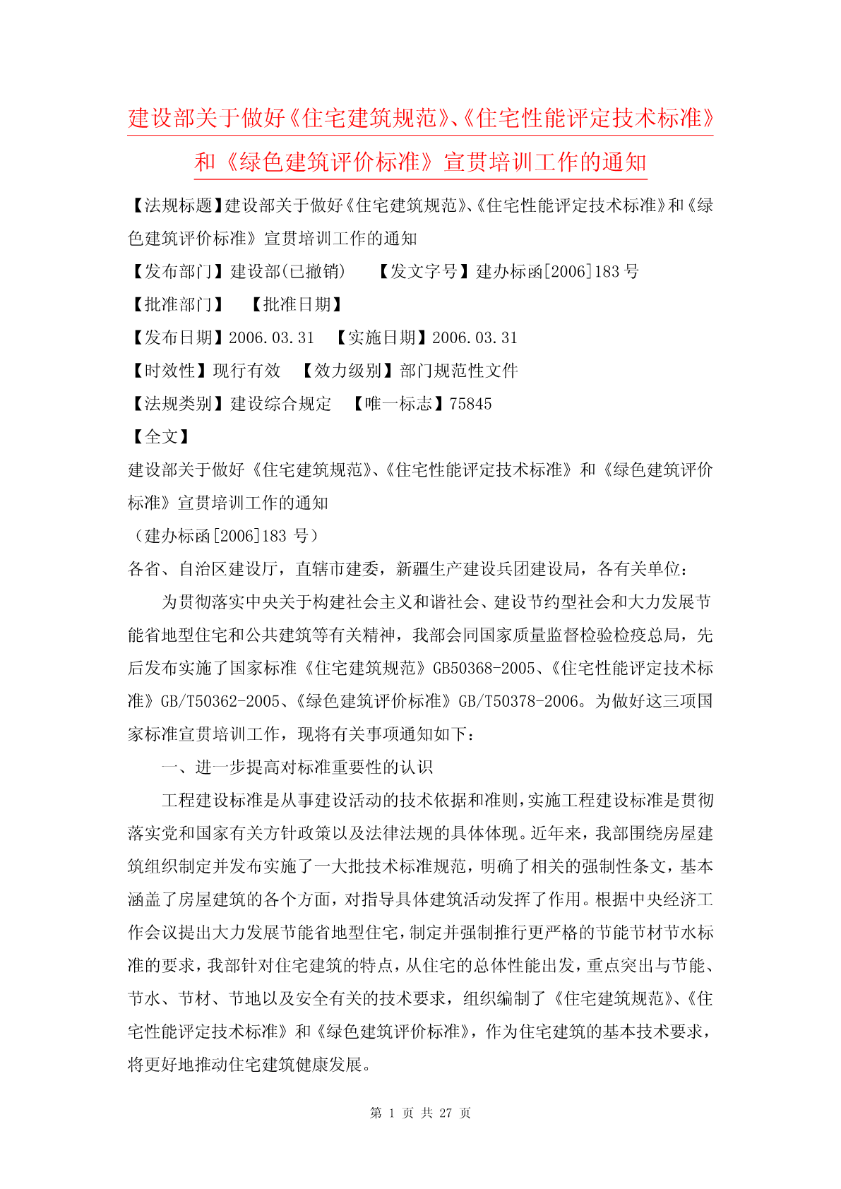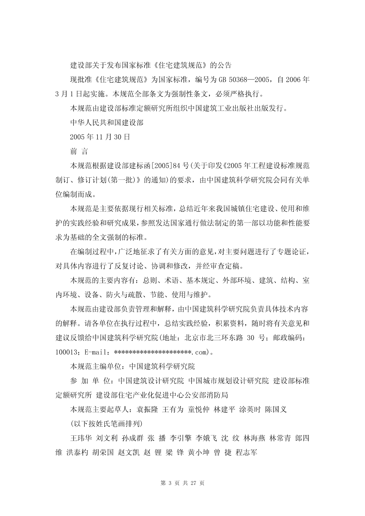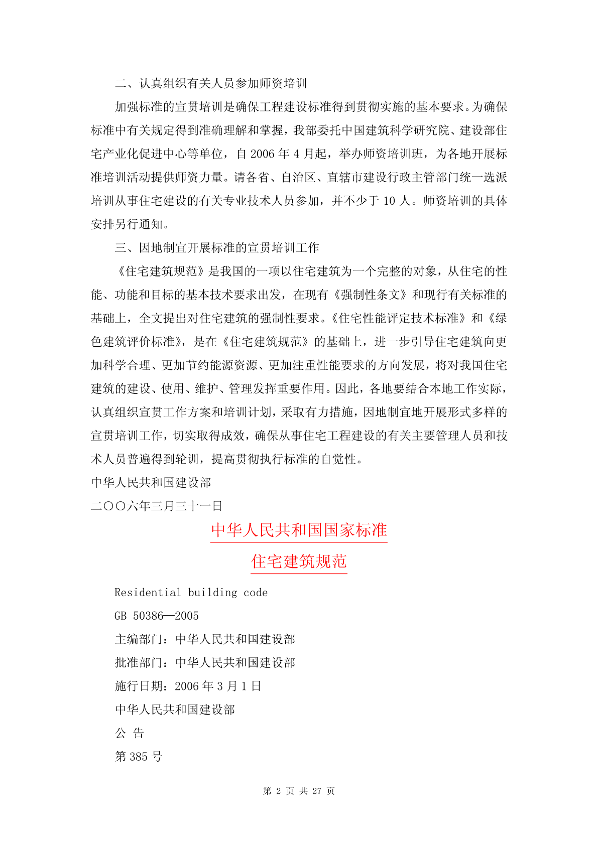 建设部关于做好《住宅建筑规范》、《住宅性能评定技术标准》和《绿色建筑评价标准》宣贯培训工作的通知【法规标题】建设部关于做好《住宅建筑规范》、《住宅性能评定技术标准》和《绿色建筑评价标准》宣贯培训工作的通知【发布部门】建设部(已撤销)【发文字号】建办标函[2006]183号【批准部门】【批准日期】【发布日期】2006.03.31【实施日期】2006.03.31【时效性】现行有效【效力级别】部门规范性文件【法规类别】建设综合规定【唯一标志】75845【全文】建设部关于做好《住宅建筑规范》、《住宅性能评定技术标准》和《绿色建筑评价标准》宣贯培训工作的通知(建办标函[2006]183号)各省、自治区建设厅,直辖市建委,新疆生产建设兵团建设局,各有关单位:为贯彻落实中央关于构建社会主义和谐社会、建设节约型社会和大力发展节能省地型住宅和公共建筑等有关精神,我部会同国家质量监督检验检疫总局,先后发布实施了国家标准《住宅建筑规范》GB50368-2005、《住宅性能评定技术标准》GB/T50362-2005、《绿色建筑评价标准》GB/T50378-2006。为做好这三项国家标准宣贯培训工作,现将有关事项通知如下:一、进一步提高对标准重要性的认识工程建设标准是从事建设活动的技术依据和准则,实施工程建设标准是贯彻落实党和国家有关方针政策以及法律法规的具体体现。近年来,我部围绕房屋建筑组织制定并发布实施了一大批技术标准规范,明确了相关的强制性条文,基本涵盖了房屋建筑的各个方面,对指导具体建筑活动发挥了作用。根据中央经济工作会议提出大力发展节能省地型住宅,制定并强制推行更严格的节能节材节水标准的要求,我部针对住宅建筑的特点,从住宅的总体性能出发,重点突出与节能、节水、节材、节地以及安全有关的技术要求,组织编制了《住宅建筑规范》、《住宅性能评定技术标准》和《绿色建筑评价标准》,作为住宅建筑的基本技术要求,将更好地推动住宅建筑健康发展。二、认真组织有关人员参加师资培训加强标准的宣贯培训是确保工程建设标准得到贯彻实施的基本要求。为确保标准中有关规定得到准确理解和掌握,我部委托中国建筑科学研究院、建设部住宅产业化促进中心等单位,自2006年4月起,举办师资培训班,为各地开展标准培训活动提供师资力量。请各省、自治区、直辖市建设行政主管部门统一选派培训从事住宅建设的有关专业技术人员参加,并不少于10人。师资培训的具体安排另行通知。三、因地制宜开展标准的宣贯培训工作《住宅建筑规范》是我国的一项以住宅建筑为一个完整的对象,从住宅的性能、功能和目标的基本技术要求出发,在现有《强制性条文》和现行有关标准的基础上,全文提出对住宅建筑的强制性要求。《住宅性能评定技术标准》和《绿色建筑评价标准》,是在《住宅建筑规范》的基础上,进一步引导住宅建筑向更加科学合理、更加节约能源资源、更加注重性能要求的方向发展,将对我国住宅建筑的建设、使用、维护、管理发挥重要作用。因此,各地要结合本地工作实际,认真组织宣贯工作方案和培训计划,采取有力措施,因地制宜地开展形式多样的宣贯培训工作,切实取得成效,确保从事住宅工程建设的有关主要管理人员和技术人员普遍得到轮训,提高贯彻执行标准的自觉性。中华人民共和国建设部二○○六年三月三十一日中华人民共和国国家标准住宅建筑规范ResidentialbuildingcodeGB50386—2005主编部门:中华人民共和国建设部批准部门:中华人民共和国建设部施行日期:2006年3月1日中华人民共和国建设部公告第385号建设部关于发布国家标准《住宅建筑规范》的公告现批准《住宅建筑规范》为国家标准,编号为GB50368—2005,自2006年3月1日起实施。本规范全部条文为强制性条文,必须严格执行。本规范由建设部标准定额研究所组织中国建筑工业出版社出版发行。中华人民共和国建设部2005年11月30日前言本规范根据建设部建标函[2005]84号(关于印发《2005年工程建设标准规范制订、修订计划(第一批)》的通知)的要求,由中国建筑科学研究院会同有关单位编制而成。本规范是主要依据现行相关标准,总结近年来我国城镇住宅建设、使用和维护的实践经验和研究成果,参照发达国家通行做法制定的第一部以功能和性能要求为基础的全文强制的标准。在编制过程中,广泛地征求了有关方面的意见,对主要问题进行了专题论证,对具体内容进行了反复讨论、协调和修改,并经审查定稿。本规范的主要内容有:总则、术语、基本规定、外部环境、建筑、结构、室内环境、设备、防火与疏散、节能、使用与维护。本规范由建设部负责管理和解释,由中国建筑科学研究院负责具体技术内容的解释。请各单位在执行过程中,总结实践经验,积累资料,随时将有关意见和建议反馈给中国建筑科学研究院(地址:北京市北三环东路30号;