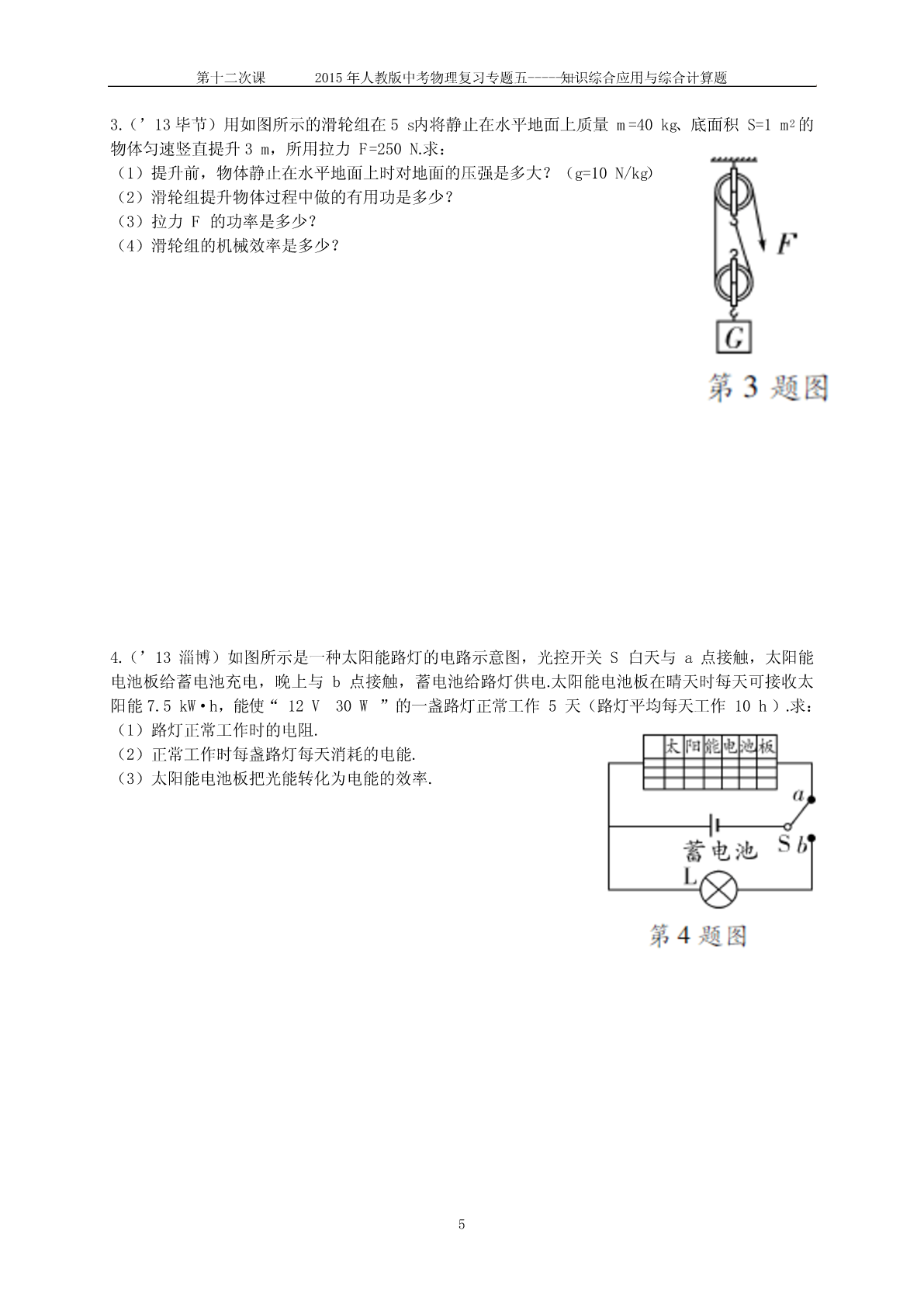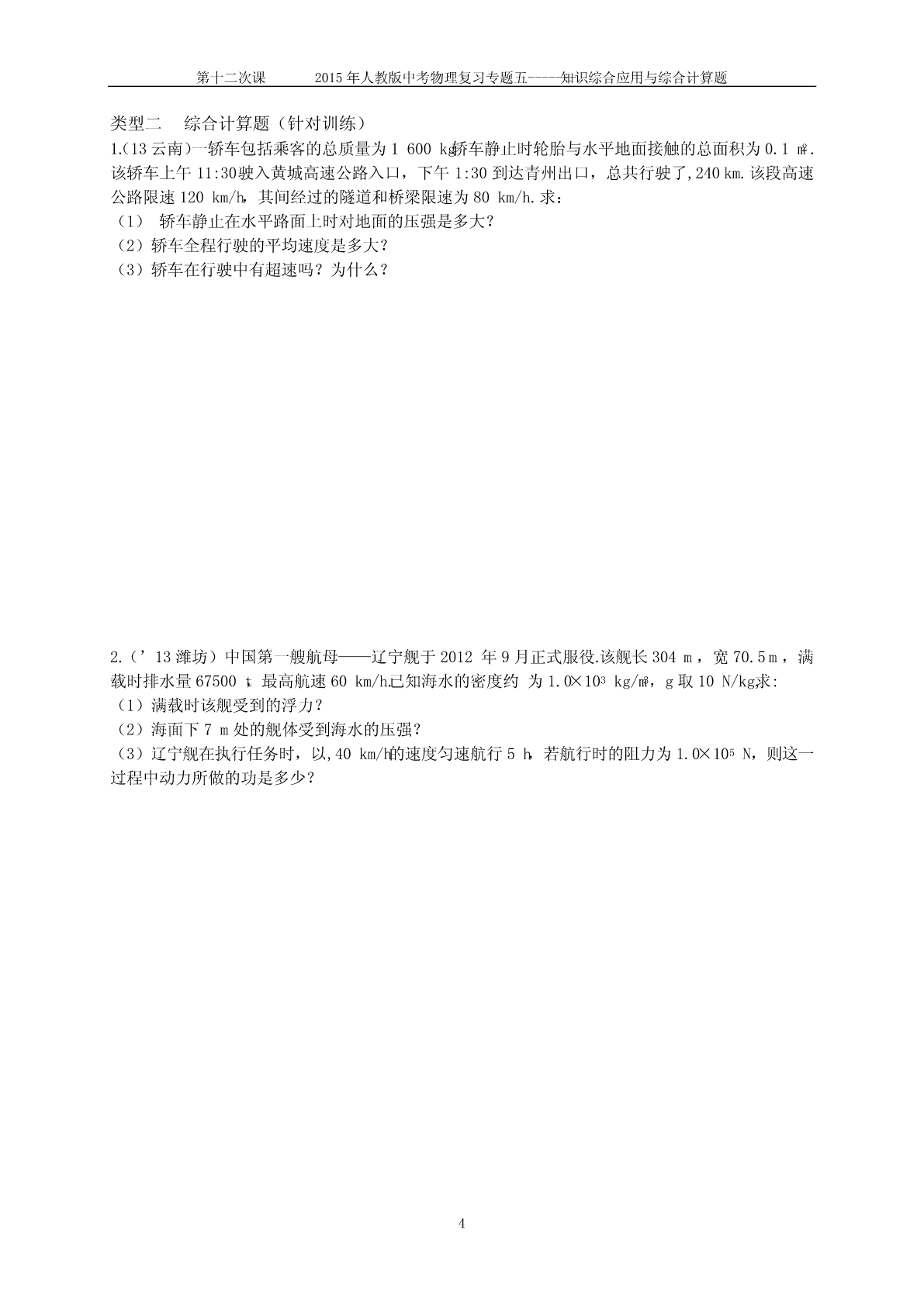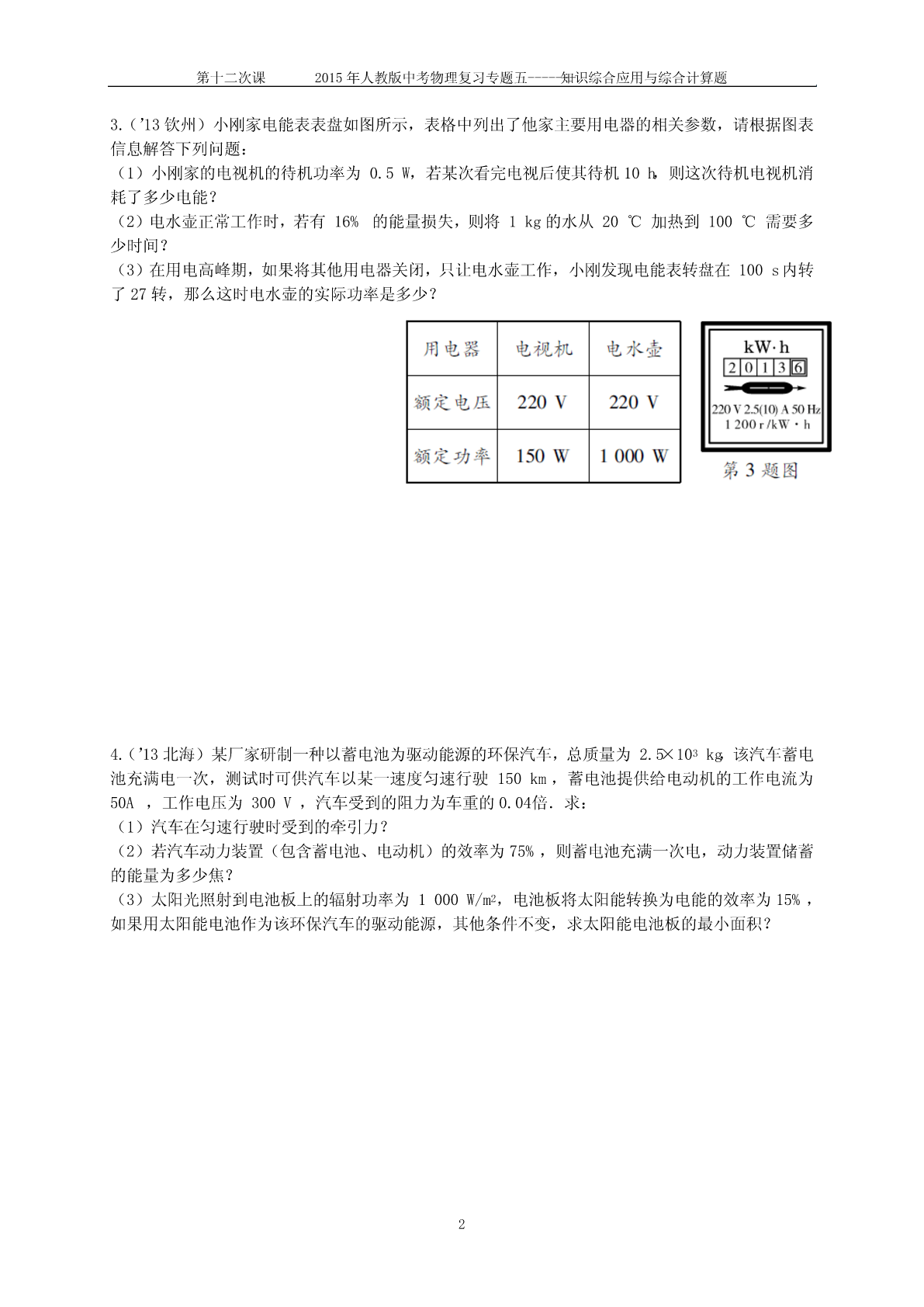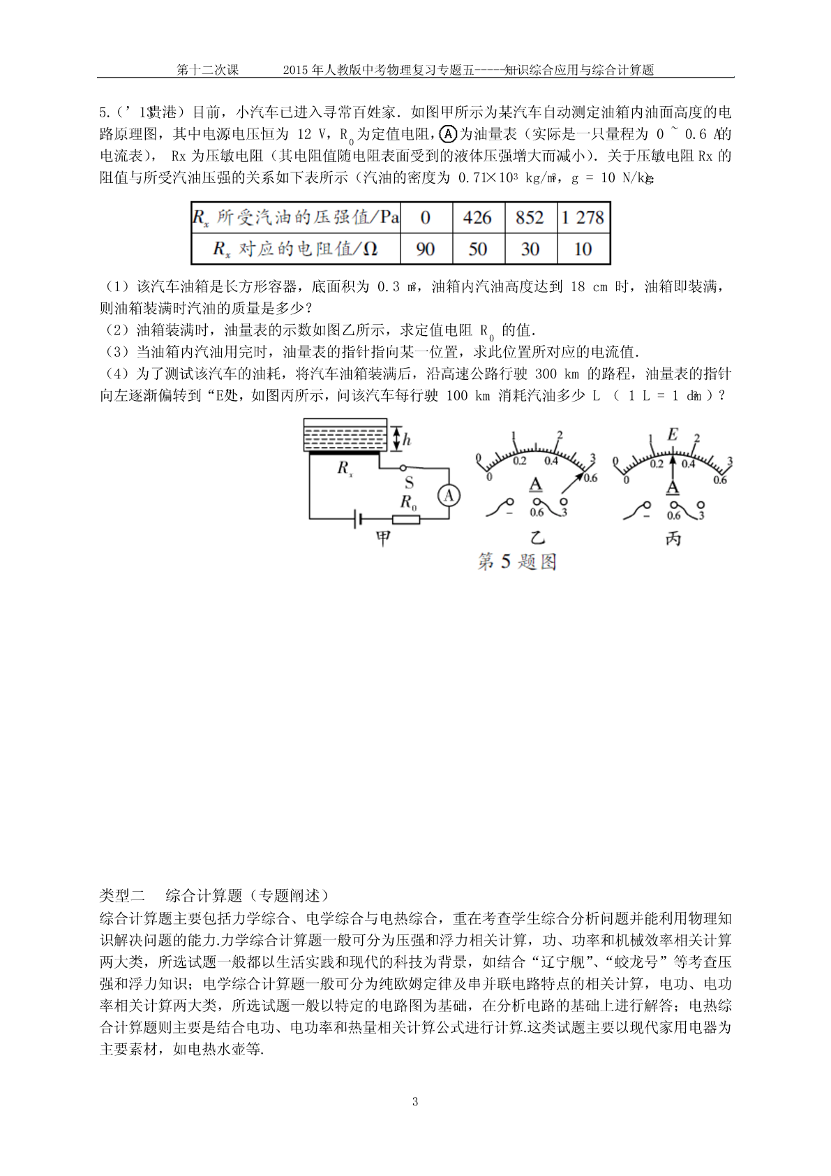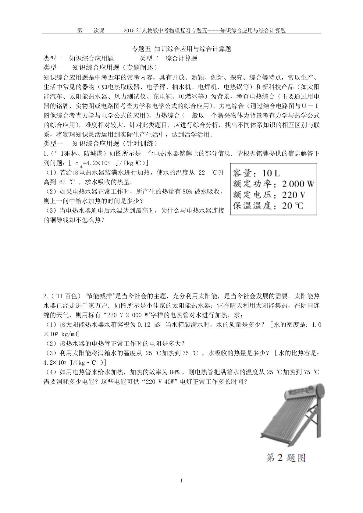 第十二次课2015年人教版中考物理复习专题五-------知识综合应用与综合计算题专题五知识综合应用与综合计算题类型一知识综合应用题类型二综合计算题类型一知识综合应用题(专题阐述)知识综合应用题是中考近年的常考内容,具有开放、新颖、创新、探究、综合等特点,常以生产、生活中常见的器物(如电热取暖器、电子秤、抽水机、电焊机、电热锅等)和新科技产品(如太阳能汽车、太阳能热水器、风力测试仪、充电鞋、可燃冰等)为背景,考查电热综合(主要通过用电器的铭牌、实物图或电路图考查力学和电学公式的综合应用)、力电综合(通过结合电路图与U-I图像综合考查力学与电学公式的应用)、力热综合(一般以一个新兴物体为背景考查力学与热学公式的综合应用),难度相对较大.针对此类题目,应进行综合分析,找出不同体系知识的相互区别与联系,将物理知识灵活运用到实际生产生活中,达到活学活用.类型一知识综合应用题(针对训练)1.(’13玉林、防城港)如图所示是一台电热水器铭牌上的部分信息.请根据铭牌提供的信息解答下列问题:[c=4.2×103J/(kg·℃)]水(1)若给该电热水器装满水进行加热,使水的温度从22℃升高到62℃,求水吸收的热量.(2)如果电热水器正常工作时,所产生的热量有80%被水吸收,则上一问中给水加热的时间是多少?(3)当电热水器通电后水温达到最高时,为什么与电热水器连接的铜导线却不怎么热?2.(’11百色)“节能减排”是当今社会的主题,充分利用太阳能,是当今社会发展的需要.太阳能热水器已经走进千家万户.如图所示是小佳家的太阳能热水器;它在晴天利用太阳能集热,在阴雨连绵的天气,则用标有“220V2000W”字样的电热管对水进行加热.求:(1)该太阳能热水器水箱容积为0.12m3,当水箱装满水时,水的质量是多少?[水的密度是:1.0×103kg/m3](2)该热水器的电热管正常工作时的电阻是多大?(3)利用太阳能将满箱水的温度从25℃加热到75℃,水吸收的热量是多少?[水的比热容是:4.2×103J/(kg·℃)](4)如用电热管来给水加热,加热的效率为84%,则电热管把满箱水的温度从25℃加热到75℃需要消耗多少电能?这些电能可供“220V40W”电灯正常工作多长时间?1第十二次课2015年人教版中考物理复习专题五-------知识综合应用与综合计算题3.(’13钦州)小刚家电能表表盘如图所示,表格中列出了他家主要用电器的相关参数,请根据图表信息解答下列问题:(1)小刚家的电视机的待机功率为0.5W,若某次看完电视后使其待机10h,则这次待机电视机消耗了多少电能?(2)电水壶正常工作时,若有16%的能量损失,则将1kg的水从20℃加热到100℃需要多少时间?(3)在用电高峰期,如果将其他用电器关闭,只让电水壶工作,小刚发现电能表转盘在100s内转了27转,那么这时电水壶的实际功率是多少?4.(’13北海)某厂家研制一种以蓄电池为驱动能源的环保汽车,总质量为2.5×103kg,该汽车蓄电池充满电一次,测试时可供汽车以某一速度匀速行驶150km,蓄电池提供给电动机的工作电流为50A,工作电压为300V,汽车受到的阻力为车重的0.04倍.求:(1)汽车在匀速行驶时受到的牵引力?(2)若汽车动力装置(包含蓄电池、电动机)的效率为75%,则蓄电池充满一次电,动力装置储蓄的能量为多少焦?(3)太阳光照射到电池板上的辐射功率为1000W/m2,电池板将太阳能转换为电能的效率为15%,如果用太阳能电池作为该环保汽车的驱动能源,其他条件不变,求太阳能电池板的最小面积?2第十二次课2015年人教版中考物理复习专题五-------知识综合应用与综合计算题5.(’13贵港)目前,小汽车已进入寻常百姓家.如图甲所示为某汽车自动测定油箱内油面高度的电路原理图,其中电源电压恒为12V,R为定值电阻,为油量表(实际是一只量程为0~0.6A的0电流表),Rx为压敏电阻(其电阻值随电阻表面受到的液体压强增大而减小).关于压敏电阻Rx的阻值与所受汽油压强的关系如下表所示(汽油的密度为0.71×103kg/m3,g=10N/kg):(1)该汽车油箱是长方形容器,底面积为0.3m2,油箱内汽油高度达到18cm时,油箱即装满,则油箱装满时汽油的质量是多少?(2)油箱装满时,油量表的示数如图乙所示,求定值电阻R的值.0(3)当油箱内汽油用完时,油量表的指针指向某一位置,求此位置所对应的电流值.(4)为了测试该汽车的油耗,将汽车油箱装满后,沿高速公路行驶300km的路程,油量表的指针向左逐渐偏转到“E处”,如图丙所示,问该汽车每行驶100km消耗汽油多少L(1L=1dm3)?类型二综合计算题(专题阐述)综合计算题主要包括力学综合、电学综合与电热综合,重在考查学生综合分析问题并能利用物理知识解决问题的能
