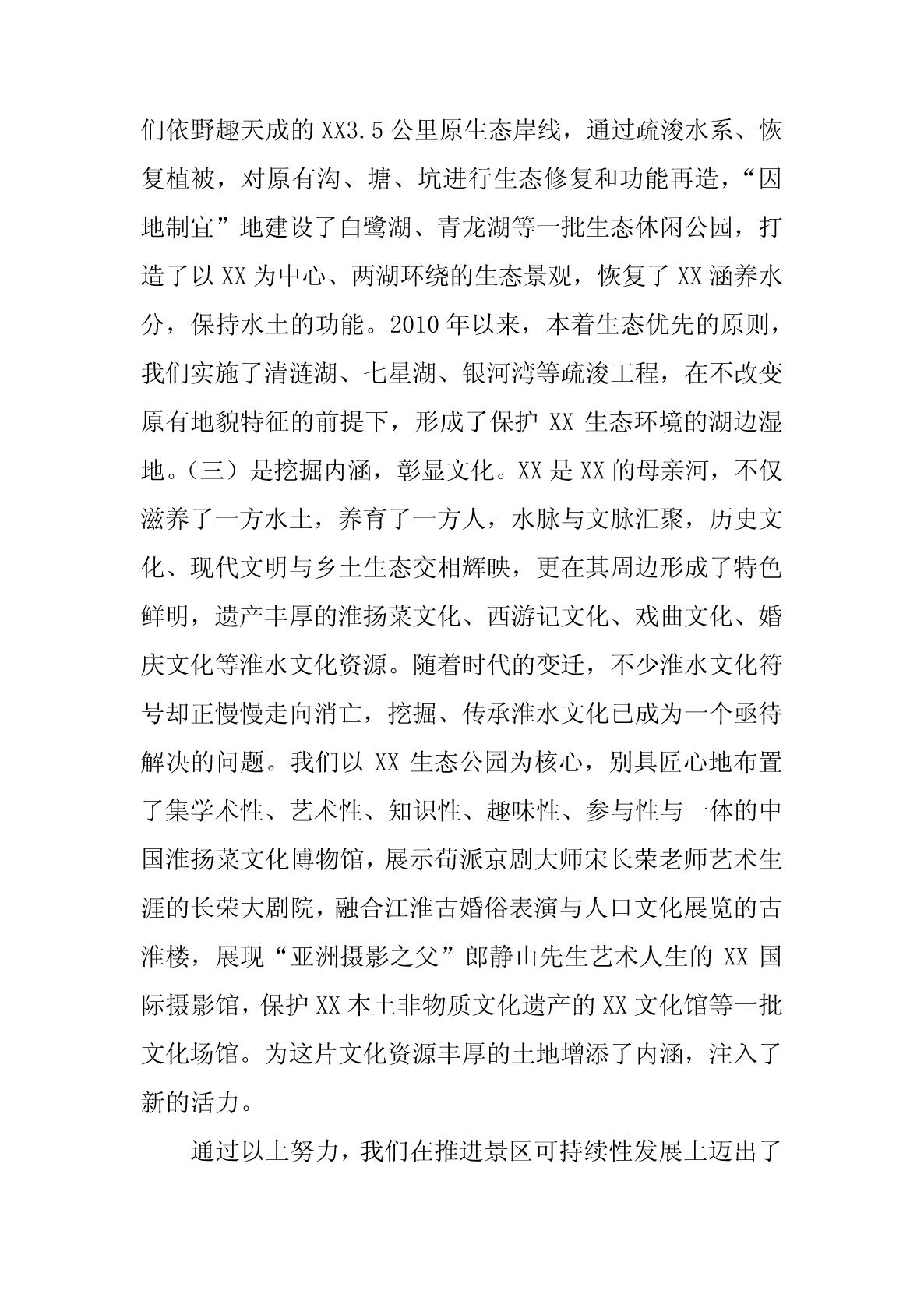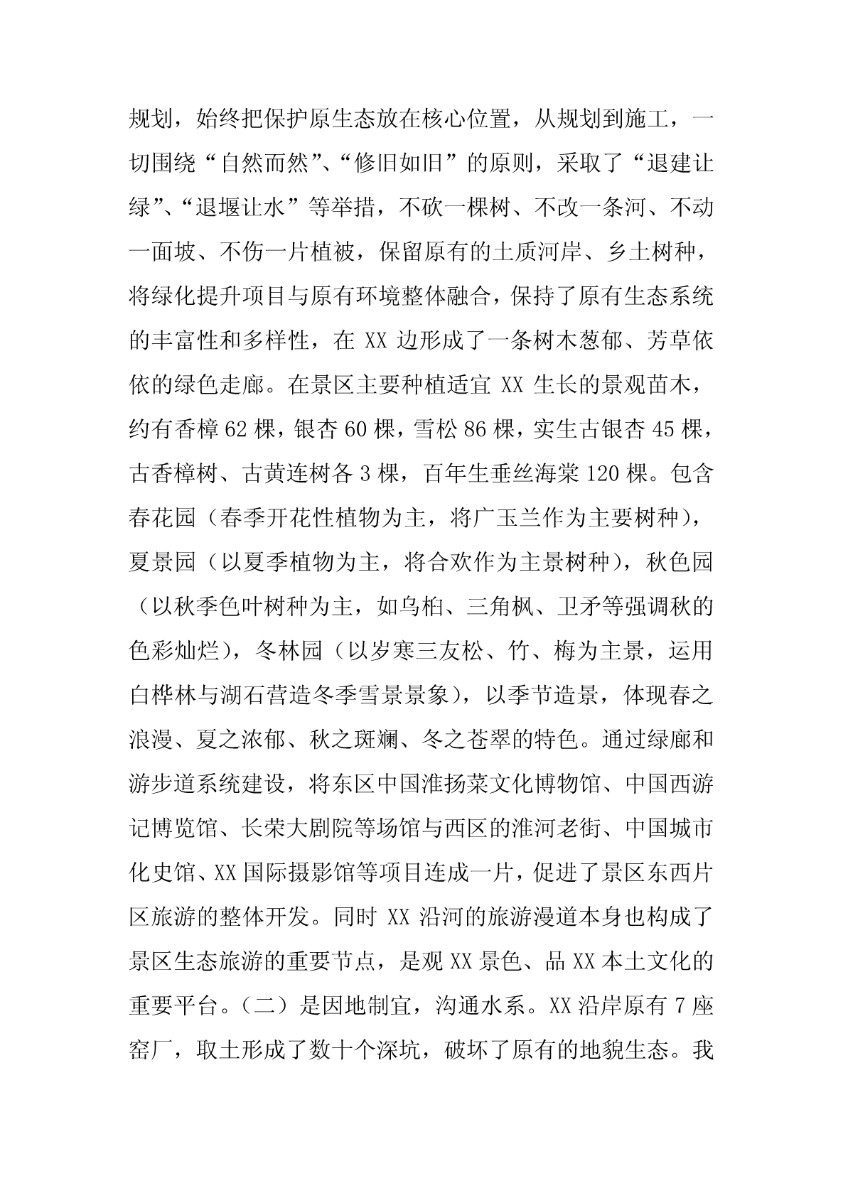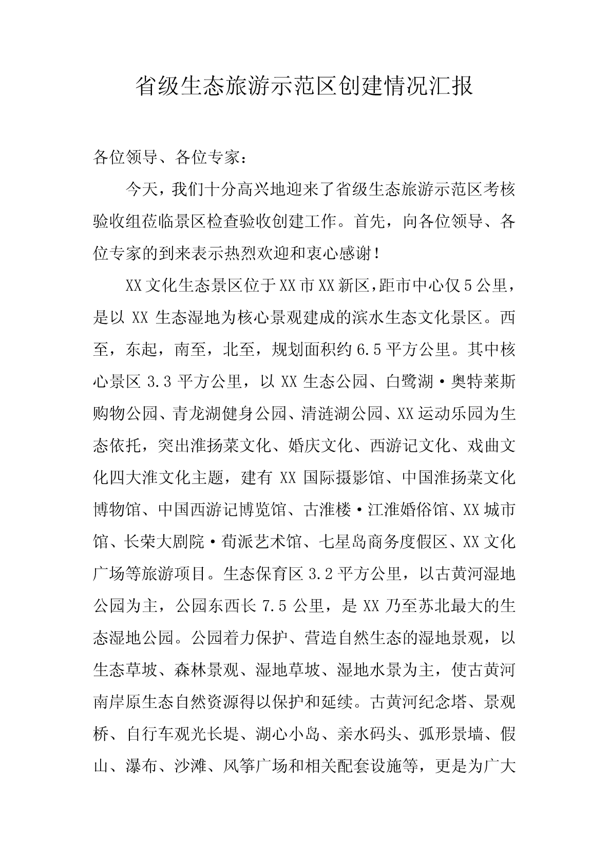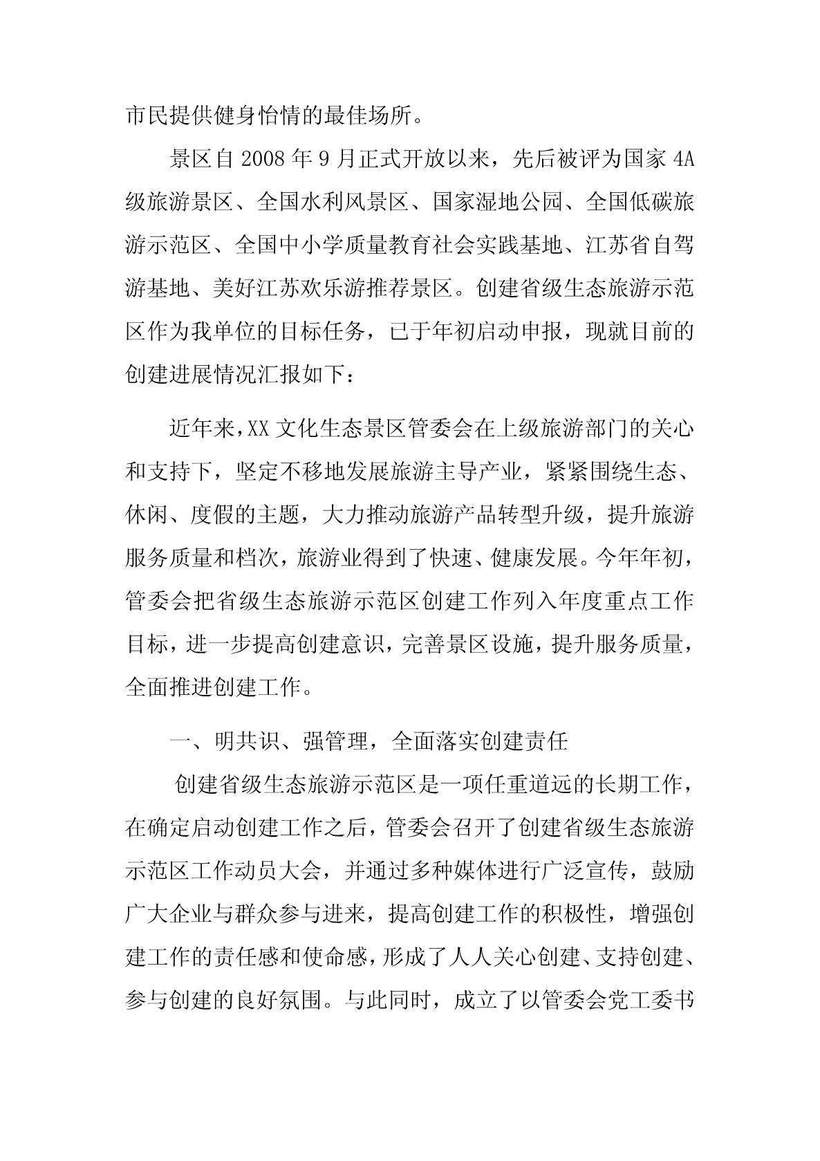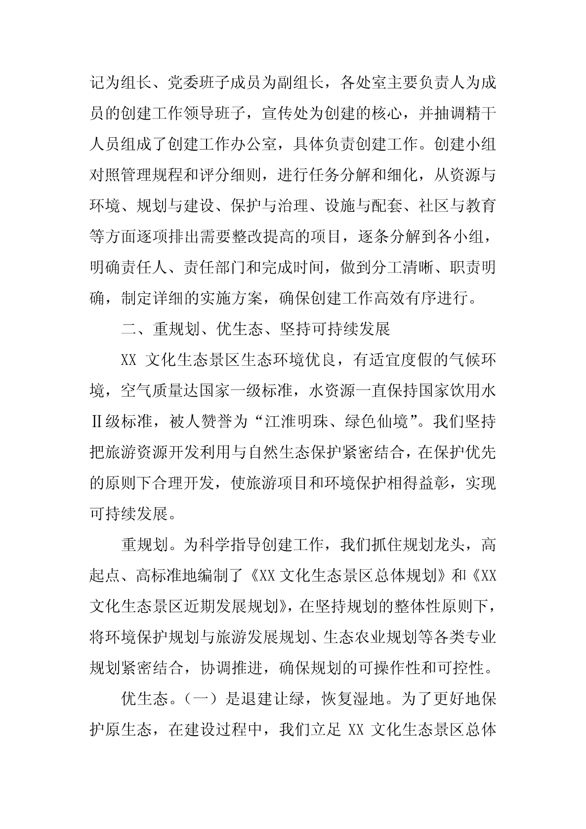 省级生态旅游示范区创建情况汇报各位领导、各位专家:今天,我们十分高兴地迎来了省级生态旅游示范区考核验收组莅临景区检查验收创建工作。首先,向各位领导、各位专家的到来表示热烈欢迎和衷心感谢!XX文化生态景区位于XX市XX新区,距市中心仅5公里,是以XX生态湿地为核心景观建成的滨水生态文化景区。西至,东起,南至,北至,规划面积约6.5平方公里。其中核心景区3.3平方公里,以XX生态公园、白鹭湖·奥特莱斯购物公园、青龙湖健身公园、清涟湖公园、XX运动乐园为生态依托,突出淮扬菜文化、婚庆文化、西游记文化、戏曲文化四大淮文化主题,建有XX国际摄影馆、中国淮扬菜文化博物馆、中国西游记博览馆、古淮楼·江淮婚俗馆、XX城市馆、长荣大剧院·荀派艺术馆、七星岛商务度假区、XX文化广场等旅游项目。生态保育区3.2平方公里,以古黄河湿地公园为主,公园东西长7.5公里,是XX乃至苏北最大的生态湿地公园。公园着力保护、营造自然生态的湿地景观,以生态草坡、森林景观、湿地草坡、湿地水景为主,使古黄河南岸原生态自然资源得以保护和延续。古黄河纪念塔、景观桥、自行车观光长堤、湖心小岛、亲水码头、弧形景墙、假山、瀑布、沙滩、风筝广场和相关配套设施等,更是为广大市民提供健身怡情的最佳场所。景区自2008年9月正式开放以来,先后被评为国家4A级旅游景区、全国水利风景区、国家湿地公园、全国低碳旅游示范区、全国中小学质量教育社会实践基地、江苏省自驾游基地、美好江苏欢乐游推荐景区。创建省级生态旅游示范区作为我单位的目标任务,已于年初启动申报,现就目前的创建进展情况汇报如下:近年来,XX文化生态景区管委会在上级旅游部门的关心和支持下,坚定不移地发展旅游主导产业,紧紧围绕生态、休闲、度假的主题,大力推动旅游产品转型升级,提升旅游服务质量和档次,旅游业得到了快速、健康发展。今年年初,管委会把省级生态旅游示范区创建工作列入年度重点工作目标,进一步提高创建意识,完善景区设施,提升服务质量,全面推进创建工作。一、明共识、强管理,全面落实创建责任创建省级生态旅游示范区是一项任重道远的长期工作,在确定启动创建工作之后,管委会召开了创建省级生态旅游示范区工作动员大会,并通过多种媒体进行广泛宣传,鼓励广大企业与群众参与进来,提高创建工作的积极性,增强创建工作的责任感和使命感,形成了人人关心创建、支持创建、参与创建的良好氛围。与此同时,成立了以管委会党工委书记为组长、党委班子成员为副组长,各处室主要负责人为成员的创建工作领导班子,宣传处为创建的核心,并抽调精干人员组成了创建工作办公室,具体负责创建工作。创建小组对照管理规程和评分细则,进行任务分解和细化,从资源与环境、规划与建设、保护与治理、设施与配套、社区与教育等方面逐项排出需要整改提高的项目,逐条分解到各小组,明确责任人、责任部门和完成时间,做到分工清晰、职责明确,制定详细的实施方案,确保创建工作高效有序进行。二、重规划、优生态、坚持可持续发展XX文化生态景区生态环境优良,有适宜度假的气候环境,空气质量达国家一级标准,水资源一直保持国家饮用水Ⅱ级标准,被人赞誉为“江淮明珠、绿色仙境”。我们坚持把旅游资源开发利用与自然生态保护紧密结合,在保护优先的原则下合理开发,使旅游项目和环境保护相得益彰,实现可持续发展。重规划。为科学指导创建工作,我们抓住规划龙头,高起点、高标准地编制了《XX文化生态景区总体规划》和《XX文化生态景区近期发展规划》,在坚持规划的整体性原则下,将环境保护规划与旅游发展规划、生态农业规划等各类专业规划紧密结合,协调推进,确保规划的可操作性和可控性。优生态。(一)是退建让绿,恢复湿地。为了更好地保护原生态,在建设过程中,我们立足XX文化生态景区总体规划,始终把保护原生态放在核心位置,从规划到施工,一切围绕“自然而然”、“修旧如旧”的原则,采取了“退建让绿”、“退堰让水”等举措,不砍一棵树、不改一条河、不动一面坡、不伤一片植被,保留原有的土质河岸、乡土树种,将绿化提升项目与原有环境整体融合,保持了原有生态系统的丰富性和多样性,在XX边形成了一条树木葱郁、芳草依依的绿色走廊。在景区主要种植适宜XX生长的景观苗木,约有香樟62棵,银杏60棵,雪松86棵,实生古银杏45棵,古香樟树、古黄连树各3棵,百年生垂丝海棠120棵。包含春花园(春季开花性植物为主,将广玉兰作为主要树种),夏景园(以夏季植物为主,将合欢作为主景树种),秋色园(以秋季色叶树种为主,如乌桕、三角枫、卫矛等强调秋的色彩灿烂),冬林园(以岁寒三友松、竹、梅为主景,运用白桦林与湖石营造冬季雪景景象),以季节造景,体现春之浪漫、夏之浓郁、秋之斑斓、冬之苍翠的特色。通过绿廊和游步道系统建设,将东区中国淮扬菜文化博物馆、中国西游记博览馆、长荣大剧院等场馆与西区的淮河老街、中国城市化史馆