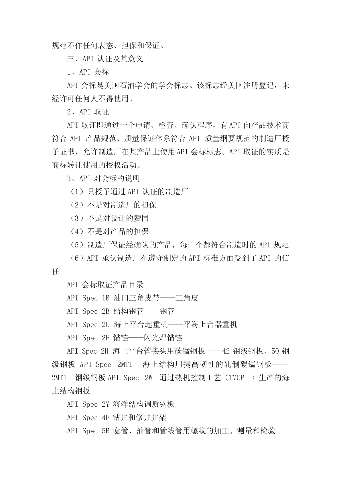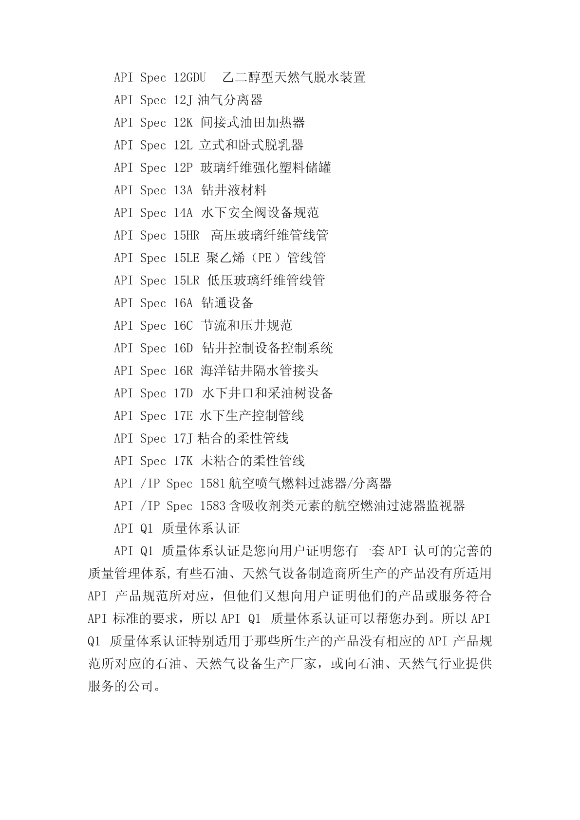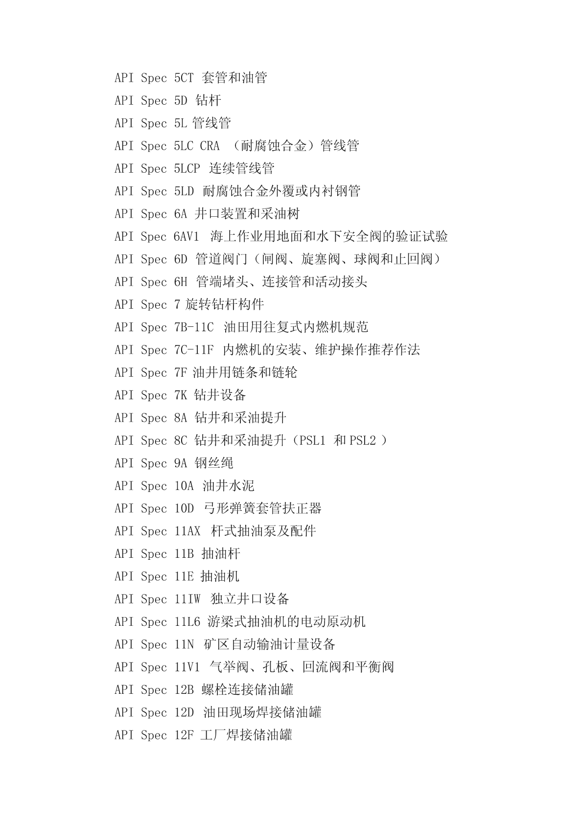 API标准汇总APIQ1API认证简介一、API和API标准API是美国石油学会(AmericanPetroleumInstitute)的英文缩写。API建于1919年,是美国第一家国家级的商业协会。API的一项重要任务,就是负责石油和天然气工业用设备的标准化工作,以确保该工业界所用设备的安全、可靠和互换性。一般情况下,API标准每5年至少进行一次复审、修改、重新确认或撤消。有时复审周期可延长一次,但延长不超过2年。所以,除已授权再版延期,API标准自出版之日起,5年后不再有效。标准共分三大类:1、石油设备设计及制造规范;2、石油设备使用及维护推荐做法;3、钻井及采油作业推荐做法。目前,API公布了已用于API产品认证的54项产品规范。二、API标准化政策美国石油学会规范的出版,有利于采购标准化的材料和设备,同时也是为了制造商生产符合本会相应规范的材料或设备提供指导。这些规范不是旨在排队优良技术的需求,也不以任何方式阻碍任何人购买生产符合其它规范的产品。制定、发布API规范和API质量纲要规范,绝非旨在限制买主向未授权使用API会标的制造商购买产品。API规范可供愿意执行规范的所有人使用。本会已做出不懈的努力,以保证其规范数据的准确性和可靠性。但是,本会对出版任何一个API规范都不表态担保和保证,并声明:凡因使用API规范而造成的损失或损坏所引起的责任和义务,API均不予以承担。凡在自己生产的设备或材料上标有某一API规范的制造商,均有责任遵守该规范的全部条款。但API对其产品是否确实符合相应的API规范不作任何表态、担保和保证。三、API认证及其意义1、API会标API会标是美国石油学会的学会标志。该标志经美国注册登记,未经许可任何人不得使用。2、API取证API取证即通过一个申请、检查、确认程序,有API向产品技术商符合API产品规范、质量保证体系符合API质量纲要规范的制造厂授予证书,允许制造厂在其产品上使用API会标标志。API取证的实质是商标转让使用的授权活动。3、API对会标的说明(1)只授予通过API认证的制造厂(2)不是对制造厂的担保(3)不是对设计的赞同(4)不是对产品的担保(5)制造厂保证经确认的产品,每一个都符合制造时的API规范(6)API承认制造厂在遵守制定的API标准方面受到了API的信任API会标取证产品目录APISpec1B油田三角皮带——三角皮APISpec2B结构钢管——钢管APISpec2C海上平台起重机——平海上台器重机APISpec2F锚链——闪光焊锚链APISpec2H海上平台管接头用碳锰钢板——42钢级钢板、50钢级钢板APISpec2MT1海上结构用提高韧性的轧制碳锰钢板——2MT1钢级钢板APISpec2W通过热机控制工艺(TMCP)生产的海上结构钢板APISpec2Y海洋结构调质钢板APISpec4F钻井和修井井架APISpec5B套管、油管和管线管用螺纹的加工、测量和检验APISpec5CT套管和油管APISpec5D钻杆APISpec5L管线管APISpec5LCCRA(耐腐蚀合金)管线管APISpec5LCP连续管线管APISpec5LD耐腐蚀合金外覆或内衬钢管APISpec6A井口装置和采油树APISpec6AV1海上作业用地面和水下安全阀的验证试验APISpec6D管道阀门(闸阀、旋塞阀、球阀和止回阀)APISpec6H管端堵头、连接管和活动接头APISpec7旋转钻杆构件APISpec7B-11C油田用往复式内燃机规范APISpec7C-11F内燃机的安装、维护操作推荐作法APISpec7F油井用链条和链轮APISpec7K钻井设备APISpec8A钻井和采油提升APISpec8C钻井和采油提升(PSL1和PSL2)APISpec9A钢丝绳APISpec10A油井水泥APISpec10D弓形弹簧套管扶正器APISpec11AX杆式抽油泵及配件APISpec11B抽油杆APISpec11E抽油机APISpec11IW独立井口设备APISpec11L6游梁式抽油机的电动原动机APISpec11N矿区自动输油计量设备APISpec11V1气举阀、孔板、回流阀和平衡阀APISpec12B螺栓连接储油罐APISpec12D油田现场焊接储油罐APISpec12F工厂焊接储油罐APISpec12GDU乙二醇型天然气脱水装置APISpec12J油气分离器APISpec12K间接式油田加热器APISpec12L立式和卧式脱乳器APISpec12P玻璃纤维强化塑料储罐APISpec13A钻井液材料APISpec14A水下安全阀设备规范APISpec15HR高压玻璃纤维管线管APISpec15LE聚乙烯(PE)管线管APISpec15LR低压玻璃纤维管线管APISpec16A钻通设备A