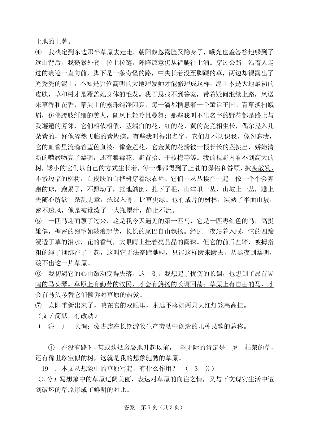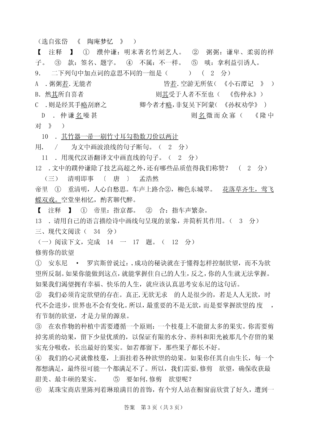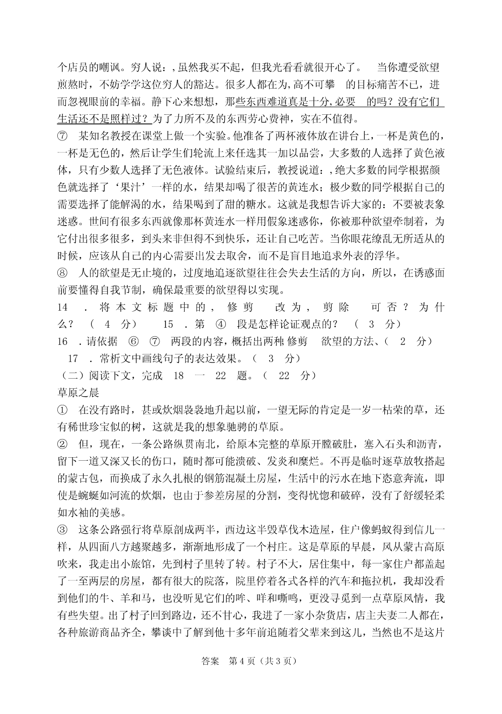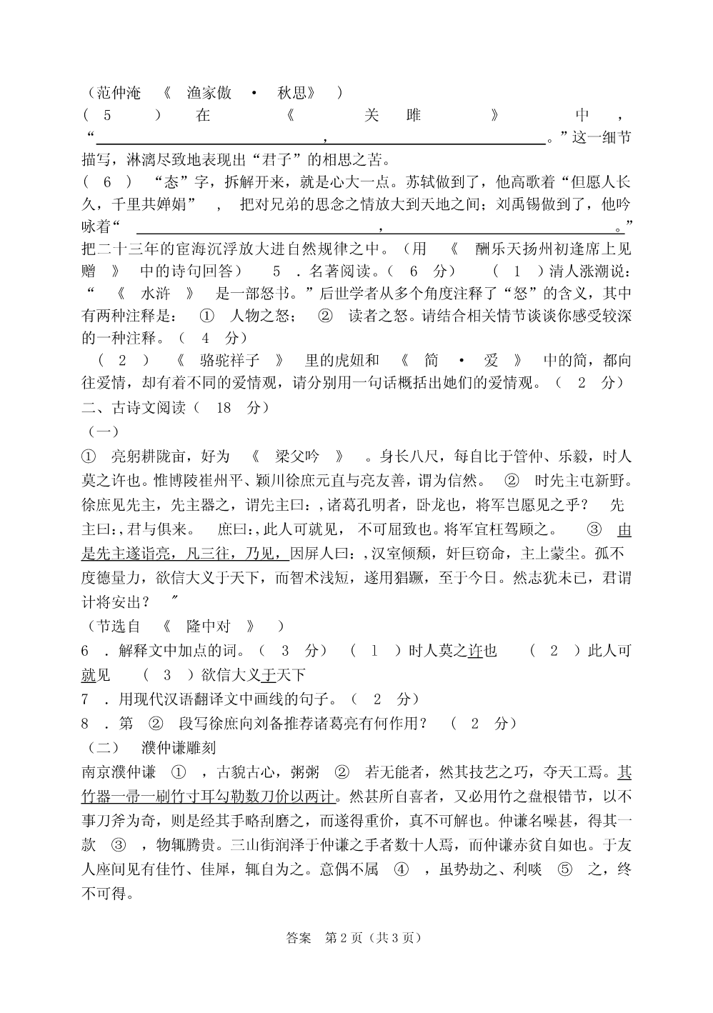 大连市2015年初中毕业升学考试试测(一)语文注意事项:1.请在答题卡上作答,在试卷上作答无效。2.本试卷共四大题,23小题,满分150分。考试时间150分钟。一、积累与运用(28分)1.请用正楷字将下面的汉字抄写在田字格里,要求书写规范、端正、整洁。(2分)文明是最美的风景2.给加点的字注音,根据拼音写汉字。(4分)(1)训诫.(2)克.扣(3)顾名思(yi)(4)格物(zhi)知3.按要求完成文后各题。(4分)①人识了字,最大的快乐就是读书。②很多年前,我一个人在偏僻的乡村“插队落户”,是书驱散了我的孤独,使我在灰暗的岁月中保持着对未来的希望,保持着对理想的憧憬。③在一盏飘摇不定的油灯下,书引我远离封闭和黑暗,向我展现光明和辽阔。④前不久,有一家报纸的读书副刊约我写一段读书的话,我写了如下的文字:“在黑夜里,书是烛火;在孤独中,书是朋友;在喧嚣中,;在困慵时,书给人激情。⑤有好书作伴,即便在狭小的空间,也能上天入地,振翅远翔。”(1)第②句中运用了两个“保持”,可用一词替换其中的一个,使表达更丰富。(1分)(2)第③句前后语句不呼应,请写出你的修改建议。(1分)(3)请依据上下文的句式、句意,把第④句补写完整。(2分)4.默写填空。(12分)(1)你看,那浅浅的天河,定然是不甚宽广。,。(郭沫若《天上的街市》)(2)苍苍竹林寺,杳杳钟声晚。,。(刘长卿《送灵澈上人》)(3)雾凇沆砀,,。(张岱《湖心亭看雪》)(4),。四面边声连角起,千嶂里,长烟落日孤城闭。答案()(范仲淹《渔家傲·秋思》)(5)在《关雎》中,“,。”这一细节描写,淋漓尽致地表现出“君子”的相思之苦。(6)“态”字,拆解开来,就是心大一点。苏轼做到了,他高歌着“但愿人长久,千里共婵娟”,把对兄弟的思念之情放大到天地之间;刘禹锡做到了,他吟咏着“,。”把二十三年的宦海沉浮放大进自然规律之中。(用《酬乐天扬州初逢席上见赠》中的诗句回答)5.名著阅读。(6分)(1)清人涨潮说:“《水浒》是一部怒书。”后世学者从多个角度注释了“怒”的含义,其中有两种注释是:①人物之怒;②读者之怒。请结合相关情节谈谈你感受较深的一种注释。(4分)(2)《骆驼祥子》里的虎妞和《简·爱》中的简,都向往爱情,却有着不同的爱情观,请分别用一句话概括出她们的爱情观。(2分)二、古诗文阅读(18分)(一)①亮躬耕陇亩,好为《梁父吟》。身长八尺,每自比于管仲、乐毅,时人莫之许也。惟博陵崔州平、颖川徐庶元直与亮友善,谓为信然。②时先主屯新野。徐庶见先主,先主器之,谓先主曰:‚诸葛孔明者,卧龙也,将军岂愿见之乎?‛先主曰:‚君与俱来。‛庶曰:‚此人可就见,不可屈致也。将军宜枉驾顾之。‛③由是先主遂诣亮,凡三往,乃见,因屏人曰:‚汉室倾颓,奸巨窃命,主上蒙尘。孤不度德量力,欲信大义于天下,而智术浅短,遂用猖蹶,至于今日。然志犹未已,君谓计将安出?"(节选自《隆中对》)6.解释文中加点的词。(3分)(l)时人莫之许也(2)此人可就见(3)欲信大义于天下7.用现代汉语翻译文中画线的句子。(2分)8.第②段写徐庶向刘备推荐诸葛亮有何作用?(2分)(二)濮仲谦雕刻南京濮仲谦①,古貌古心,粥粥②若无能者,然其技艺之巧,夺天工焉。其竹器一帚一刷竹寸耳勾勒数刀价以两计。然甚所自喜者,又必用竹之盘根错节,以不事刀斧为奇,则是经其手略刮磨之,而遂得重价,真不可解也。仲谦名噪甚,得其一款③,物辄腾贵。三山街润泽于仲谦之手者数十人焉,而仲谦赤贫自如也。于友人座间见有佳竹、佳犀,辄自为之。意偶不属④,虽势劫之、利啖⑤之,终不可得。答案()(选自张岱《陶庵梦忆》)【注释】①濮仲谦:明末著名竹刻艺人。②粥粥:谦卑、柔弱的样子。③款:签名、题字。④不属:不一样。⑤啖:拿利益引诱人。9.二下列句中加点词的意思不同的一组是()(2分)A.粥粥若.无能者皆若.空游无所依(《小石潭记》)B.然其所自喜者则其受于人者不至也(《伤仲永》)C.则是经其手略刮磨之卿今者才略,非复吴下阿蒙(《孙权劝学》)D.仲谦名噪甚则名微而众寡(《隆中对》)10.其竹器一帚一刷竹寸耳勾勒数刀价以两计用‚/‛为文中画波浪线的句子断句。(2分)11.用现代汉语翻译文中画直线的句子。(2分)12.文中的蹼仲谦除了技艺高超之外,还有哪些品质值得我们称赞?(2分)(三)清明即事〔唐〕孟浩然帝里①重清明,人心自愁思。车声上路合②,柳色东城翠。花落草齐生,莺飞蝶双戏。空堂坐相忆,酌茗聊代醉。【注释】①帝里:指京都。②合:指车声繁杂。13.请用自己的语言描绘诗中画线句呈现的景象,并简析其作用。(3分)三、现代文阅读(34分)(一)阅读下文,完成14一17题。(12分)修剪你的欲望①安东尼·罗宾斯曾说过:‚成功的秘诀就在于懂得怎样控制欲望,而不为欲望所反制