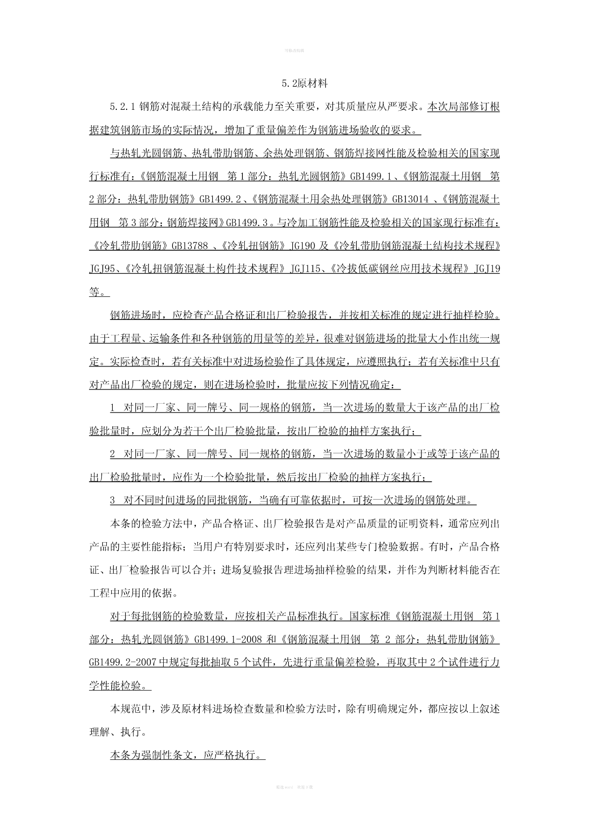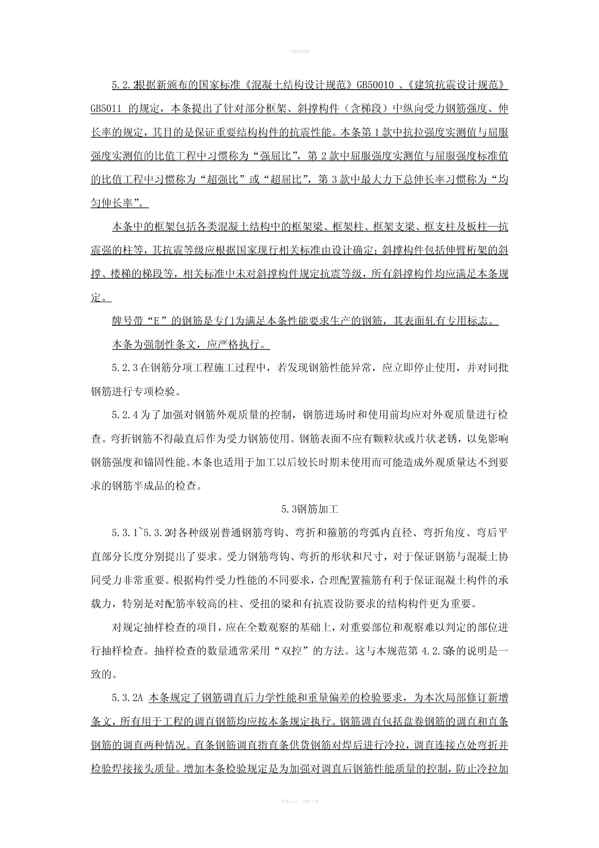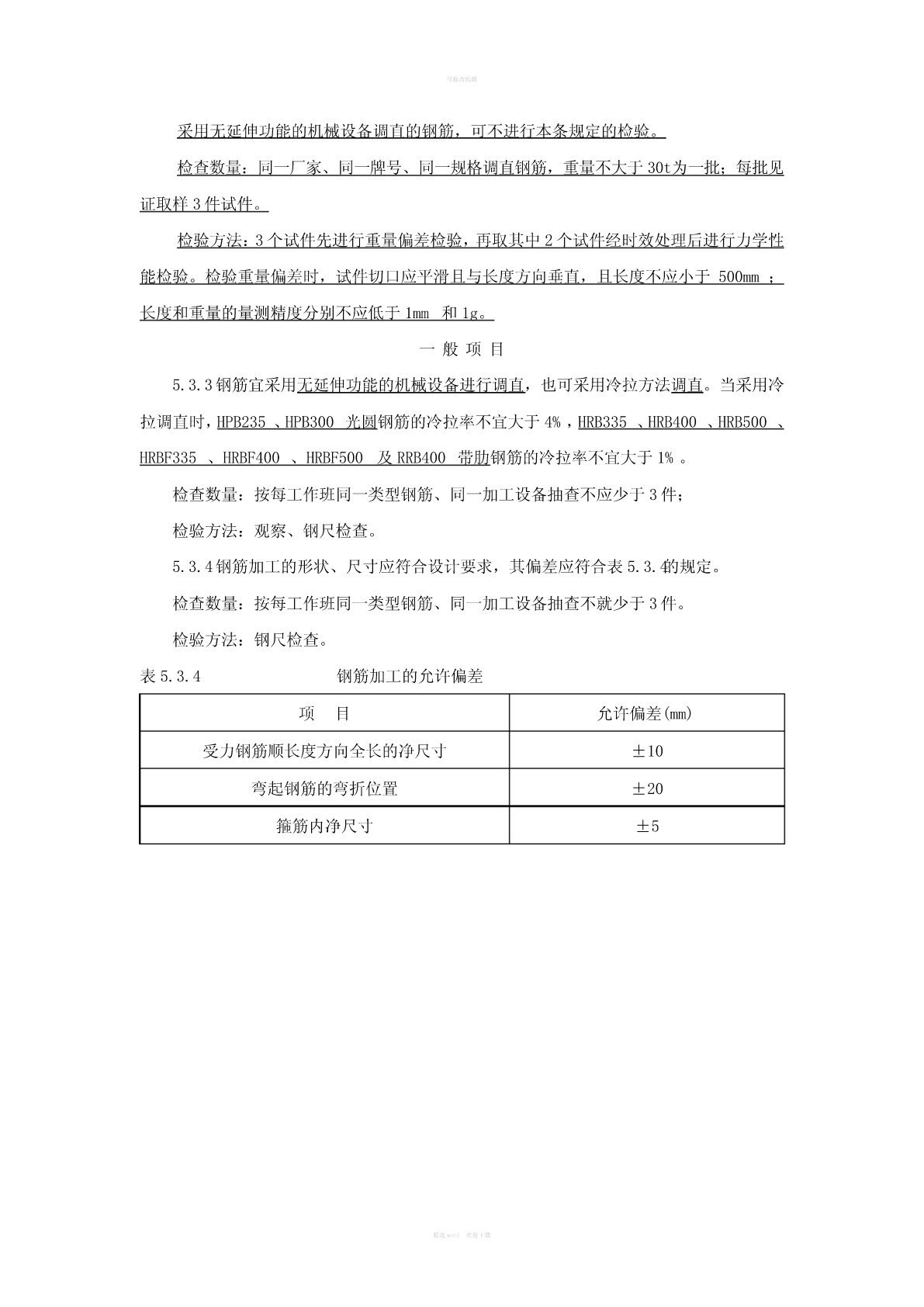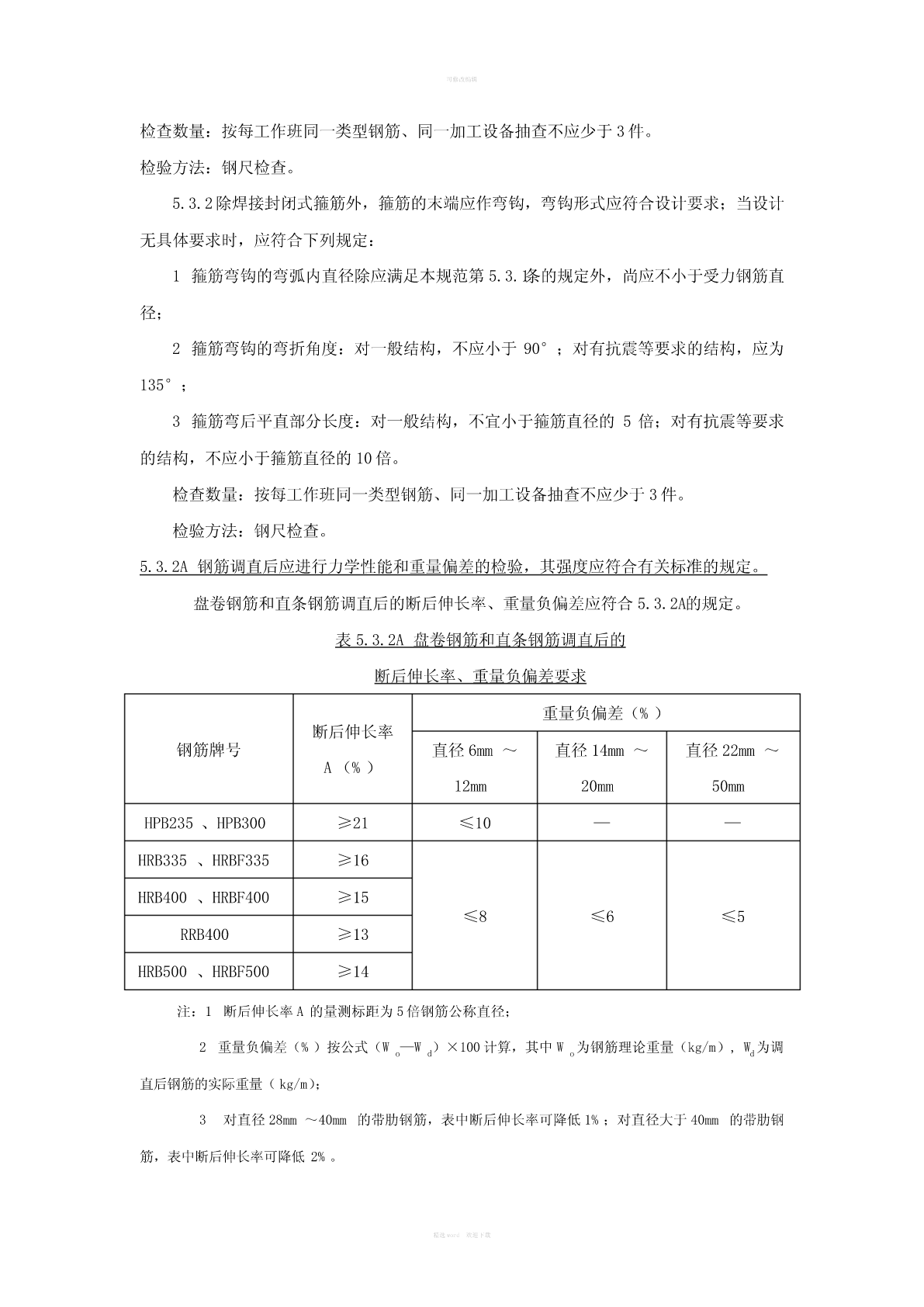 可修改编辑5.2原材料主控项目5.2.1钢筋进场时,应按国家现行相关标准的规定抽取试件作力学性能和重量偏差检验,检验结果必须符合有关标准的规定。检查数量:按进场的批次和产品的抽样检验方案确定。检验方法:检查产品合格证、出厂检验报告和进场复验报告。5.2.2对有抗震设防要求的结构,其纵向受力钢筋的性能应满足设计要求;当设计无具体要求时,对按一、二、三级抗震等级设计的框架和斜撑构件(含梯段)中的纵向受力钢筋应采用HRB335E、HRB400E、HRB500E、HRBF335E、HRBF400E或HRBF500E钢筋,其强度和最大力下总伸长率的实测值应符合下列规定:1钢筋的抗拉强度实测值与屈服强度实测值的比值不应小于1.25;2钢筋的屈服强度实测值与屈服强度标准值的比值不应大于1.30;3钢筋的最大力下总伸长率不应小于9%。检查数量:按进场的批次和产品抽样检验方案确定。检验方法:检查进场复验报告。5.2.3当发现钢筋脆断、焊接性能不良或力学性能显著不正常等现象时,应对该批钢筋进行化学成分检验或其他专项检验。检验方法:检查化学成分等专项检验报告。一般项目5.2.4钢筋应平直、无损伤、表面不得有裂纹、油污、颗粒状或片状老锈。检查数量:进场时和使用前全数检查。检验方法:观察。5.3钢筋加工主控项目5.3.1受力钢筋的弯钩和弯折应符合下列规定:1HPB235级钢筋未端应作180°弯钩,其弯弧内直径不应小于钢筋直径的2.5倍,弯钩的弯后平直部分长度不应小于钢筋直径的3倍;2当设计要求钢筋末端需作135°弯钩时,HRB335级、HRB400级钢筋的弯弧内直径不应小于钢筋直径的4倍,弯钩的弯后平直部分长度应符合设计要求;3钢筋作不大于90°的弯折时,弯折处的弯弧内直径不应小于钢筋直径的5倍。精选word欢迎下载可修改编辑检查数量:按每工作班同一类型钢筋、同一加工设备抽查不应少于3件。检验方法:钢尺检查。5.3.2除焊接封闭式箍筋外,箍筋的末端应作弯钩,弯钩形式应符合设计要求;当设计无具体要求时,应符合下列规定:1箍筋弯钩的弯弧内直径除应满足本规范第5.3.1条的规定外,尚应不小于受力钢筋直径;2箍筋弯钩的弯折角度:对一般结构,不应小于90°;对有抗震等要求的结构,应为135°;3箍筋弯后平直部分长度:对一般结构,不宜小于箍筋直径的5倍;对有抗震等要求的结构,不应小于箍筋直径的10倍。检查数量:按每工作班同一类型钢筋、同一加工设备抽查不应少于3件。检验方法:钢尺检查。5.3.2A钢筋调直后应进行力学性能和重量偏差的检验,其强度应符合有关标准的规定。盘卷钢筋和直条钢筋调直后的断后伸长率、重量负偏差应符合5.3.2A的规定。表5.3.2A盘卷钢筋和直条钢筋调直后的断后伸长率、重量负偏差要求重量负偏差(%)断后伸长率钢筋牌号直径6mm~直径14mm~直径22mm~A(%)12mm20mm50mmHPB235、HPB300≥21≤10——HRB335、HRBF335≥16HRB400、HRBF400≥15≤8≤6≤5RRB400≥13HRB500、HRBF500≥14注:1断后伸长率A的量测标距为5倍钢筋公称直径;2重量负偏差(%)按公式(Wo—Wd)×100计算,其中Wo为钢筋理论重量(kg/m),Wd为调直后钢筋的实际重量(kg/m);3对直径28mm~40mm的带肋钢筋,表中断后伸长率可降低1%;对直径大于40mm的带肋钢筋,表中断后伸长率可降低2%。精选word欢迎下载可修改编辑采用无延伸功能的机械设备调直的钢筋,可不进行本条规定的检验。检查数量:同一厂家、同一牌号、同一规格调直钢筋,重量不大于30t为一批;每批见证取样3件试件。检验方法:3个试件先进行重量偏差检验,再取其中2个试件经时效处理后进行力学性能检验。检验重量偏差时,试件切口应平滑且与长度方向垂直,且长度不应小于500mm;长度和重量的量测精度分别不应低于1mm和1g。一般项目5.3.3钢筋宜采用无延伸功能的机械设备进行调直,也可采用冷拉方法调直。当采用冷拉调直时,HPB235、HPB300光圆钢筋的冷拉率不宜大于4%,HRB335、HRB400、HRB500、HRBF335、HRBF400、HRBF500及RRB400带肋钢筋的冷拉率不宜大于1%。检查数量:按每工作班同一类型钢筋、同一加工设备抽查不应少于3件;检验方法:观察、钢尺检查。5.3.4钢筋加工的形状、尺寸应符合设计要求,其偏差应符合表5.3.4的规定。检查数量:按每工作班同一类型钢筋、同一加工设备抽查不就少于3件。检验方法:钢尺检查。表5.3.4钢筋加工的允许偏差项目允许偏差(mm)受力钢筋顺长度方向全长的净尺寸±10弯起钢筋的弯折位置±20箍筋内净尺寸±5精选word欢迎下载可修改编辑5.2原材料5.2.1钢筋对混凝土结构