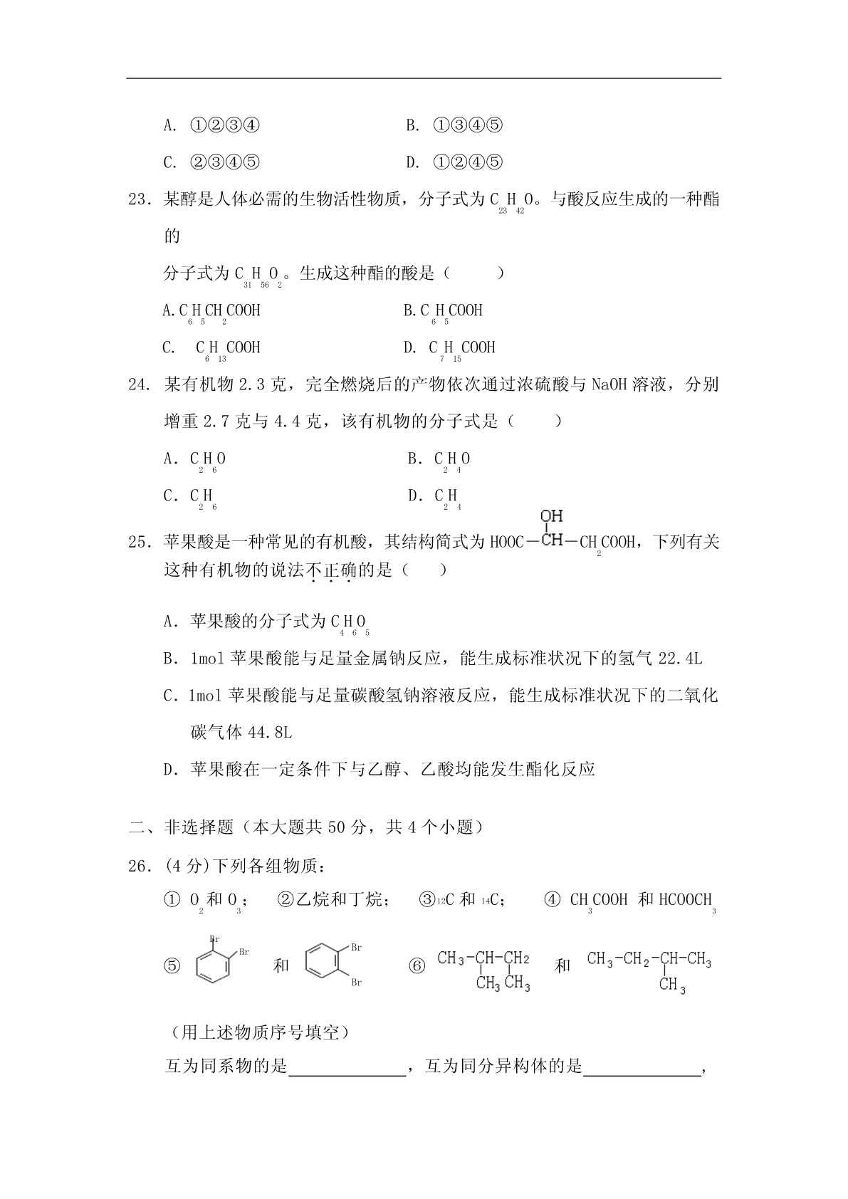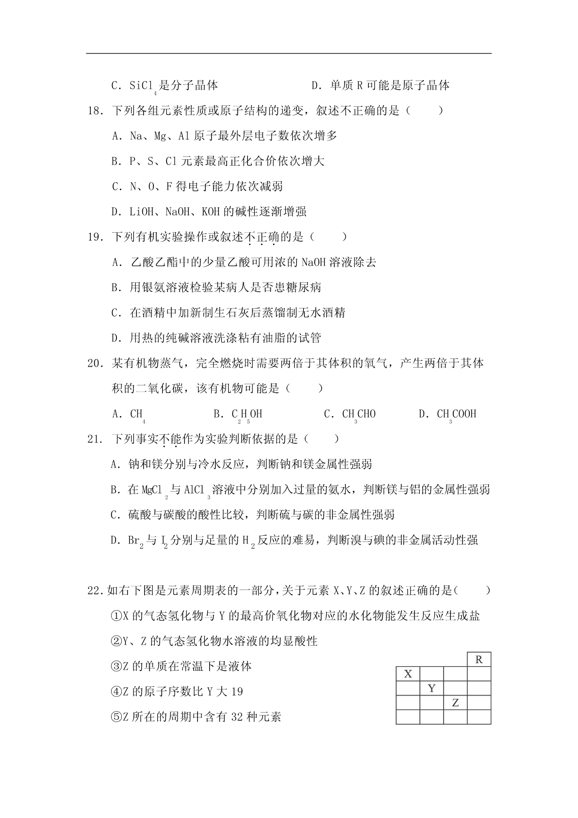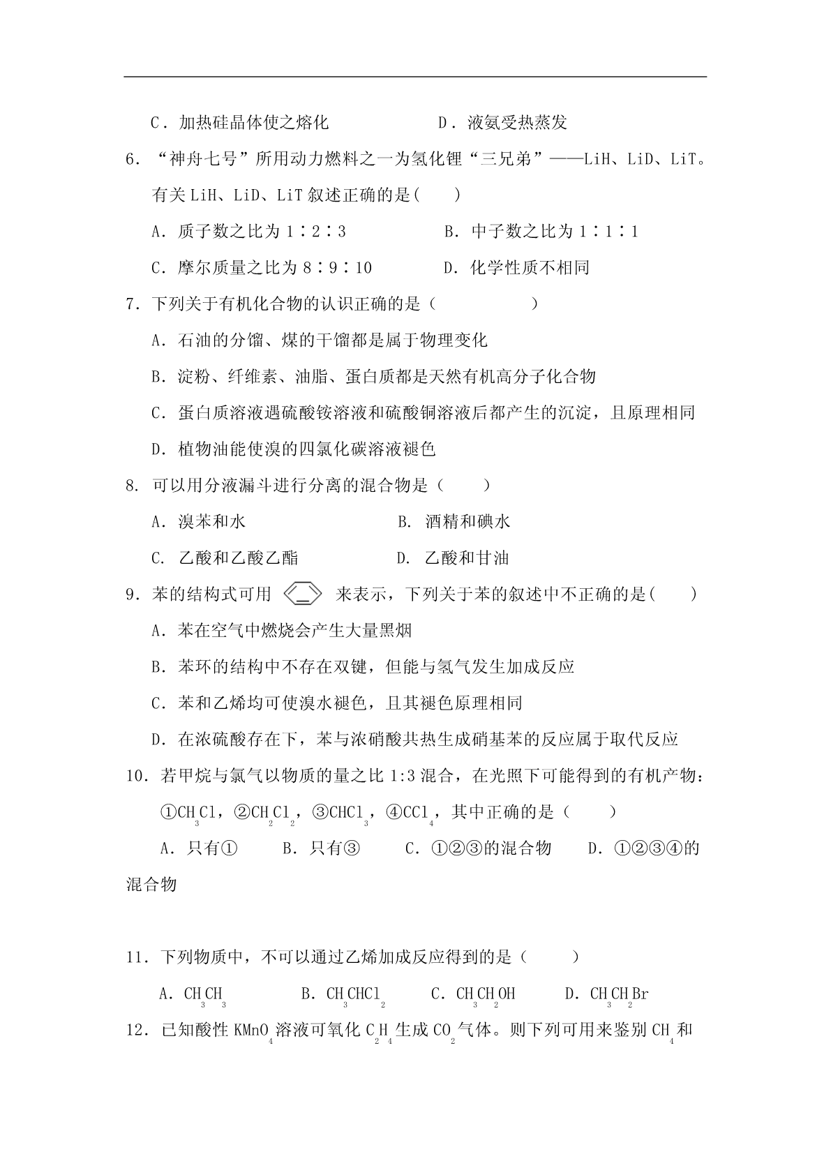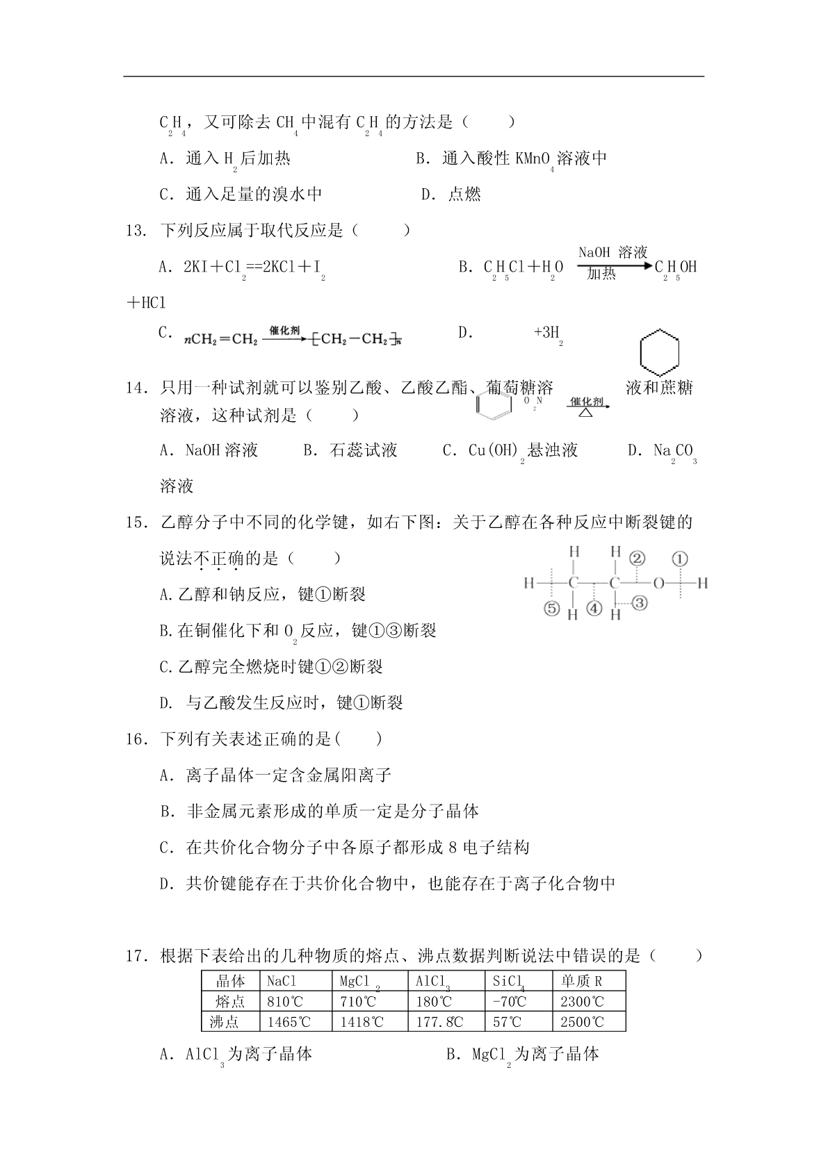 2015-2016学年度第二学期八县(市)一中期末联考高中一年化学试卷完卷时间:90分钟满分:100分可能用到的相对原子质量:H-1,Li-7,N-14,O-16,S-32,Cl-35.5,C-12,Na-23,Cu-64一、选择题(共25小题,每小题2分,共50分。每小题只有一个选项符合题意)1.下列有关生活中的化学叙述不正确...的是()A.无法用米汤(含淀粉)检验加碘盐中的碘酸钾(KIO)3B.用聚乙烯制造的塑料薄膜可用于包装食品C.蚕丝、羊毛、棉花的主要成分都是蛋白质D.75℅的酒精可用于医用消毒2.下列物质中不属于油脂的是()①花生油②润滑油③甘油④棉籽油⑤牛油⑥汽油A.①②B.②③⑥C.③④D.②⑤⑥3.下列化学用语书写正确的是()A.乙烯的结构简式:CHCHB.次氯酸的结构式:H—O—Cl22ON2C.NHCl的电子式:D.硝基苯的结构简式:44.下列有机化合物分子中所有的原子不可能都处于同一平面的是()A.B.HC≡CHC.CH—CHD.CH=CHCl3325.下列变化中,吸收的热量用于克服分子间作用力的是()A.加热氯化钠晶体使之熔化B.加热碘化氢气体使之分解C.加热硅晶体使之熔化D.液氨受热蒸发6.“神舟七号”所用动力燃料之一为氢化锂“三兄弟”——LiH、LiD、LiT。有关LiH、LiD、LiT叙述正确的是()A.质子数之比为1∶2∶3B.中子数之比为1∶1∶1C.摩尔质量之比为8∶9∶10D.化学性质不相同7.下列关于有机化合物的认识正确的是()A.石油的分馏、煤的干馏都是属于物理变化B.淀粉、纤维素、油脂、蛋白质都是天然有机高分子化合物C.蛋白质溶液遇硫酸铵溶液和硫酸铜溶液后都产生的沉淀,且原理相同D.植物油能使溴的四氯化碳溶液褪色8.可以用分液漏斗进行分离的混合物是()A.溴苯和水B.酒精和碘水C.乙酸和乙酸乙酯D.乙酸和甘油9.苯的结构式可用来表示,下列关于苯的叙述中不正确的是()A.苯在空气中燃烧会产生大量黑烟B.苯环的结构中不存在双键,但能与氢气发生加成反应C.苯和乙烯均可使溴水褪色,且其褪色原理相同D.在浓硫酸存在下,苯与浓硝酸共热生成硝基苯的反应属于取代反应10.若甲烷与氯气以物质的量之比1:3混合,在光照下可能得到的有机产物:①CHCl,②CHCl,③CHCl,④CCl,其中正确的是()32234A.只有①B.只有③C.①②③的混合物D.①②③④的混合物11.下列物质中,不可以通过乙烯加成反应得到的是()A.CHCHB.CHCHClC.CHCHOHD.CHCHBr3332323212.已知酸性KMnO溶液可氧化CH生成CO气体。则下列可用来鉴别CH和42424CH,又可除去CH中混有CH的方法是()24424A.通入H后加热B.通入酸性KMnO溶液中24C.通入足量的溴水中D.点燃13.下列反应属于取代反应是()NaOH溶液A.2KI+Cl==2KCl+IB.CHCl+HOCHOH22252加热25+HClC.D.+3H214.只用一种试剂就可以鉴别乙酸、乙酸乙酯、葡萄糖溶液和蔗糖ON溶液,这种试剂是()2A.NaOH溶液B.石蕊试液C.Cu(OH)悬浊液D.NaCO223溶液15.乙醇分子中不同的化学键,如右下图:关于乙醇在各种反应中断裂键的说法不正确...的是()A.乙醇和钠反应,键①断裂B.在铜催化下和O反应,键①③断裂2C.乙醇完全燃烧时键①②断裂D.与乙酸发生反应时,键①断裂16.下列有关表述正确的是()A.离子晶体一定含金属阳离子B.非金属元素形成的单质一定是分子晶体C.在共价化合物分子中各原子都形成8电子结构D.共价键能存在于共价化合物中,也能存在于离子化合物中17.根据下表给出的几种物质的熔点、沸点数据判断说法中错误的是()晶体NaClMgClAlClSiCl单质R234熔点810℃710℃180℃-70℃2300℃沸点1465℃1418℃177.8℃57℃2500℃A.AlCl为离子晶体B.MgCl为离子晶体32C.SiCl是分子晶体D.单质R可能是原子晶体418.下列各组元素性质或原子结构的递变,叙述不正确的是()A.Na、Mg、Al原子最外层电子数依次增多B.P、S、Cl元素最高正化合价依次增大C.N、O、F得电子能力依次减弱D.LiOH、NaOH、KOH的碱性逐渐增强19.下列有机实验操作或叙述不正确...的是()A.乙酸乙酯中的少量乙酸可用浓的NaOH溶液除去B.用银氨溶液检验某病人是否患糖尿病C.在酒精中加新制生石灰后蒸馏制无水酒精D.用热的纯碱溶液洗涤粘有油脂的试管20.某有机物蒸气,完全燃烧时需要两倍于其体积的氧气,产生两倍于其体积的二氧化碳,该有机物可能是()A.CHB.CHOHC.CHCHOD.CHCOOH4253321.下列事实不能..作为实验判断依