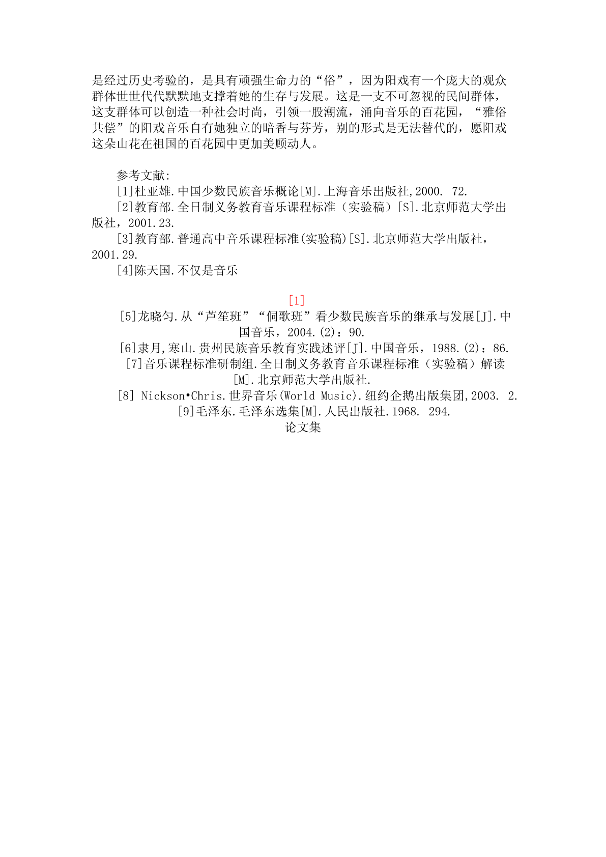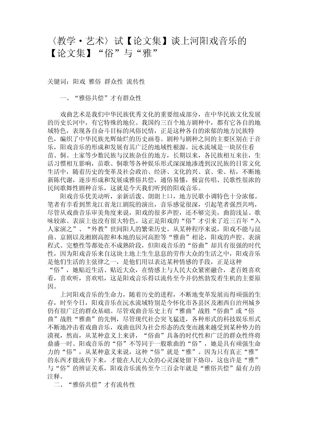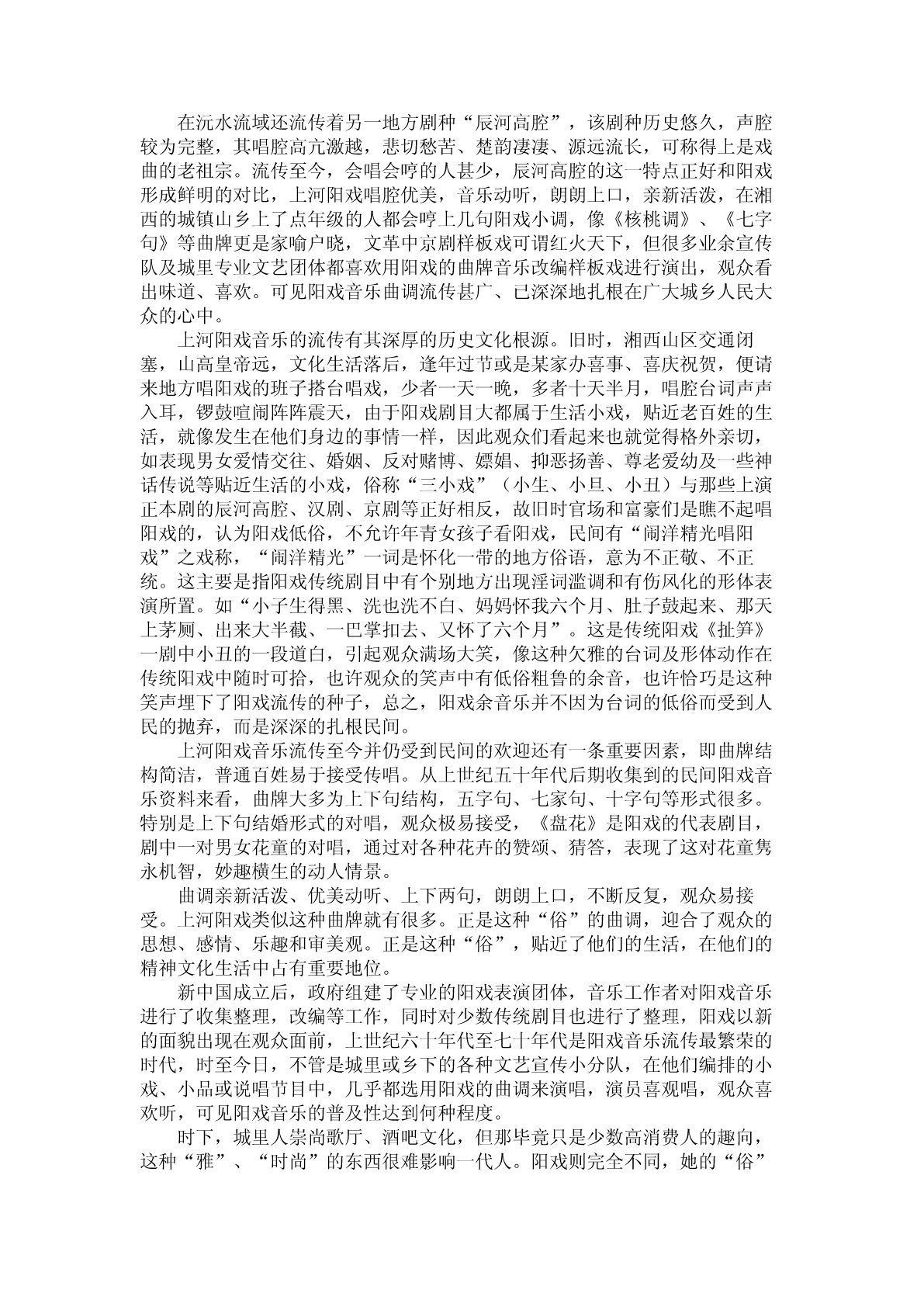 〈教学·艺术〉试【论文集】谈上河阳戏音乐的【论文集】“俗”与“雅”关键词:阳戏雅俗群众性流传性一、“雅俗共偿”才有群众性戏曲艺术是我们中华民族优秀文化的重要组成部分,在中华民族文化发展的历史长河中,有它特殊的地位。我国约三百个地方剧种中,都有它各自的地域特色,表现各自奋斗目标的风俗民情,正是这种各自的浓郁的地方民族特色,编织了中华民族光辉灿烂的历史画卷。剧种与剧种之间的主要区别在于音乐,阳戏音乐的形成和发展有其广泛的地域性根源。沅水流域是一块居住看苗、侗、土家等少数民族与汉族杂住的地方,长期以来,各民族相互来往,生活习惯相互影响,苗歌、侗歌等各种娱乐形式深深地渗透到汉民族的日常文化生活中,随着历史的变革及社会政治、经济、文化的兴、衰、荣、枯,不断地新陈代谢,逐步形成和发展成雅俗共偿,通俗易懂,极富传唱、民歌性很浓的民间歌舞性剧种音乐,这就是今天我们听到的阳戏音乐。阳戏音乐优美动听,亲新活泼、朗朗上口,地方民歌小调特色十分浓郁。笔者有幸看到黑龙江省龙江剧院的演出,音乐感觉很深,引起笔者强烈共鸣,尽管从戏曲音乐审美角度来说,阳戏的很多声腔,还不够完美,曲韵浅显、歌味较浓、表演上也没有很大特色。这正是阳戏的“俗”才引来了近三百年“入人家演之”、“外教”世间阳人的繁荣历史。从某种程序来说,阳戏不能与昆曲、京剧以及湘剧高腔和本地的辰河高腔等“雅曲”相论,阳戏的声腔、表演程式、完整性等都处在不成熟阶段,但阳戏音乐的“俗曲”却具有很强的时代性,因为阳戏音乐来自这块土地上生生息息的劳作大众的生活之中,阳戏音乐是他们生活的主弦律之一,是他们用以表达某种情感的手段,正是这种“俗”,她贴近生活、贴近大众,在情感上与人民大众紧密融合,老百姓喜欢看,喜欢听,喜欢唱,这是阳戏音乐得以流传至今并仍然勃发着生机的主要原因。上河阳戏音乐的生命力,随着历史的进程,不断地变革发展而得顽强的生存,时至今日,阳戏音乐在沅水流域特别是今怀化市各县区及湘西自治州城乡仍有很广泛的群众基础。尽管戏曲音乐史上有“雅曲”战胜“俗曲”或“俗曲”战胜“雅曲”的先例,尽管现代社会突飞猛进,各种形式的科技娱乐形式不断地冲击着戏曲音乐,戏曲也因为社会形态的改变而越来越受到某种势力的漠视,然而,从某种意义上来讲,“俗曲”具备的时代性和广泛的群众性终将鼎盛一时。阳戏音乐的“俗”不等同于一般歌曲的“俗”,她是具有顽强生命力的“俗”,从某种意义来说,这种“俗”就是“雅”。因为只有真正“雅”的东西才能流传下来,才能在人民大众的心灵深处留下烙印,这也许是“雅”与“俗”的辨证关系,阳戏音乐流传至今三百余年就是“雅俗共偿”最有力的注释。二、“雅俗共偿”才有流传性在沅水流域还流传着另一地方剧种“辰河高腔”,该剧种历史悠久,声腔较为完整,其唱腔高亢激越,悲切愁苦、楚韵凄凄、源远流长,可称得上是戏曲的老祖宗。流传至今,会唱会哼的人甚少,辰河高腔的这一特点正好和阳戏形成鲜明的对比,上河阳戏唱腔优美,音乐动听,朗朗上口,亲新活泼,在湘西的城镇山乡上了点年级的人都会哼上几句阳戏小调,像《核桃调》、《七字句》等曲牌更是家喻户晓,文革中京剧样板戏可谓红火天下,但很多业余宣传队及城里专业文艺团体都喜欢用阳戏的曲牌音乐改编样板戏进行演出,观众看出味道、喜欢。可见阳戏音乐曲调流传甚广、已深深地扎根在广大城乡人民大众的心中。上河阳戏音乐的流传有其深厚的历史文化根源。旧时,湘西山区交通闭塞,山高皇帝远,文化生活落后,逢年过节或是某家办喜事、喜庆祝贺,便请来地方唱阳戏的班子搭台唱戏,少者一天一晚,多者十天半月,唱腔台词声声入耳,锣鼓喧闹阵阵震天,由于阳戏剧目大都属于生活小戏,贴近老百姓的生活,就像发生在他们身边的事情一样,因此观众们看起来也就觉得格外亲切,如表现男女爱情交往、婚姻、反对赌博、嫖娼、抑恶扬善、尊老爱幼及一些神话传说等贴近生活的小戏,俗称“三小戏”(小生、小旦、小丑)与那些上演正本剧的辰河高腔、汉剧、京剧等正好相反,故旧时官场和富豪们是瞧不起唱阳戏的,认为阳戏低俗,不允许年青女孩子看阳戏,民间有“闹洋精光唱阳戏”之戏称,“闹洋精光”一词是怀化一带的地方俗语,意为不正敬、不正统。这主要是指阳戏传统剧目中有个别地方出现淫词滥调和有伤风化的形体表演所置。如“小子生得黑、洗也洗不白、妈妈怀我六个月、肚子鼓起来、那天上茅厕、出来大半截、一巴掌扣去、又怀了六个月”。这是传统阳戏《扯笋》一剧中小丑的一段道白,引起观众满场大笑,像这种欠雅的台词及形体动作在传统阳戏中随时可拾,也许观众的笑声中有低俗粗鲁的余音,也许恰巧是这种笑声埋下了阳戏流传的种子,总之,阳戏余音乐并不因为台词的低俗而受到人民的抛弃,而是深深的扎根民间。上河阳戏音乐流传至今并仍受到民间的欢迎还有一条重要因素,即曲牌结构简洁,普通百姓易于接受传唱。从上世纪五十年代后期收集到