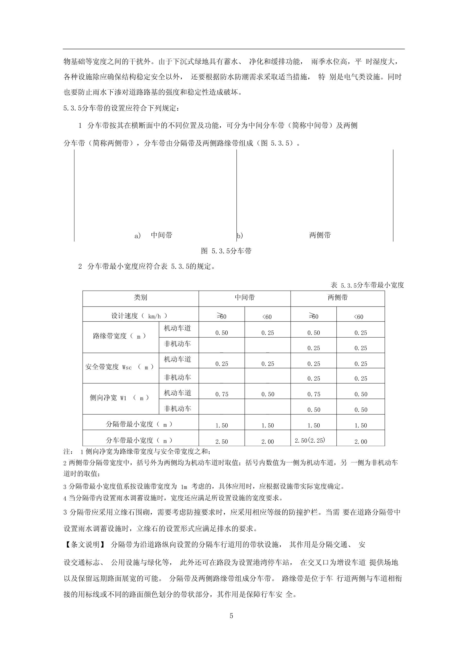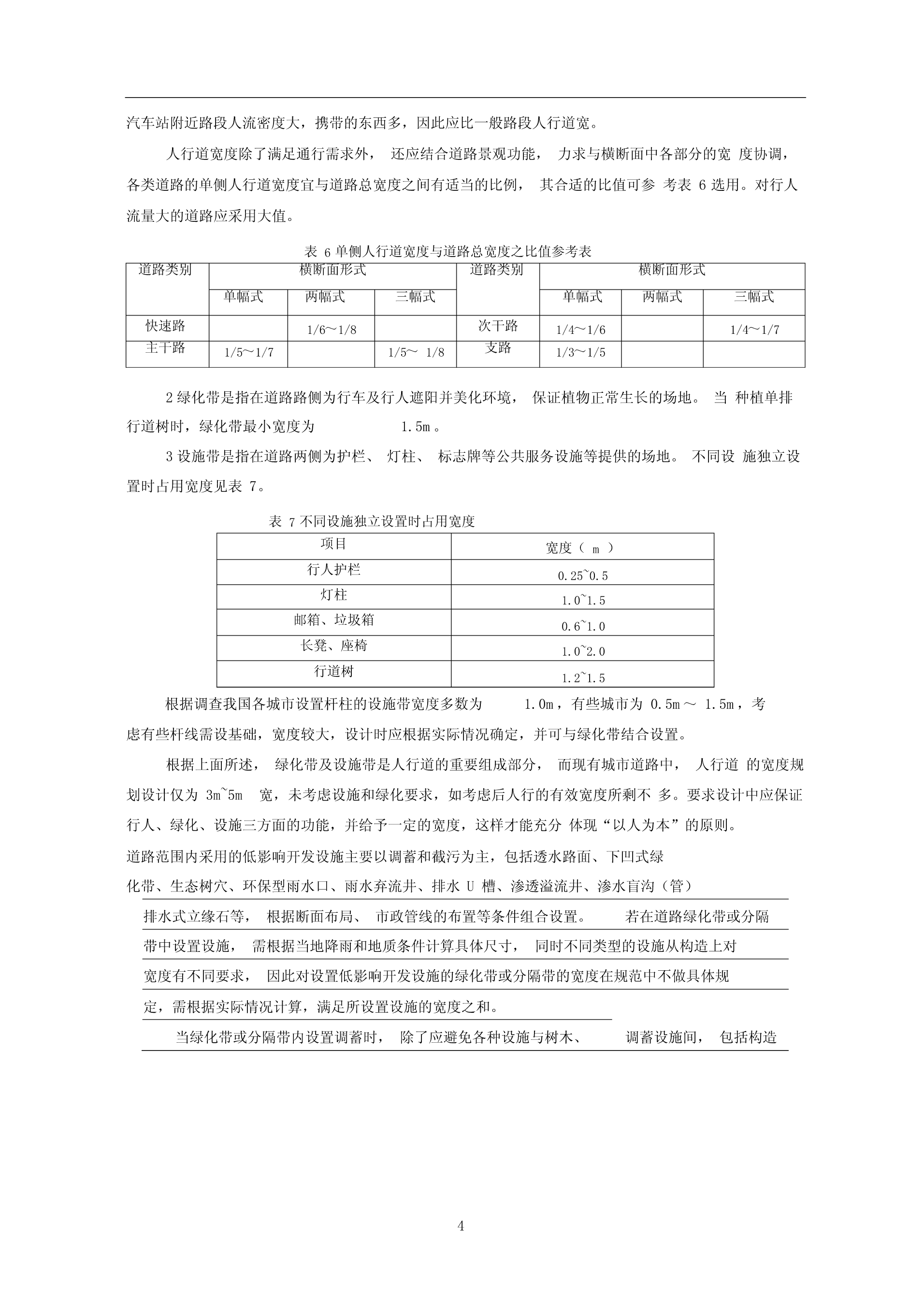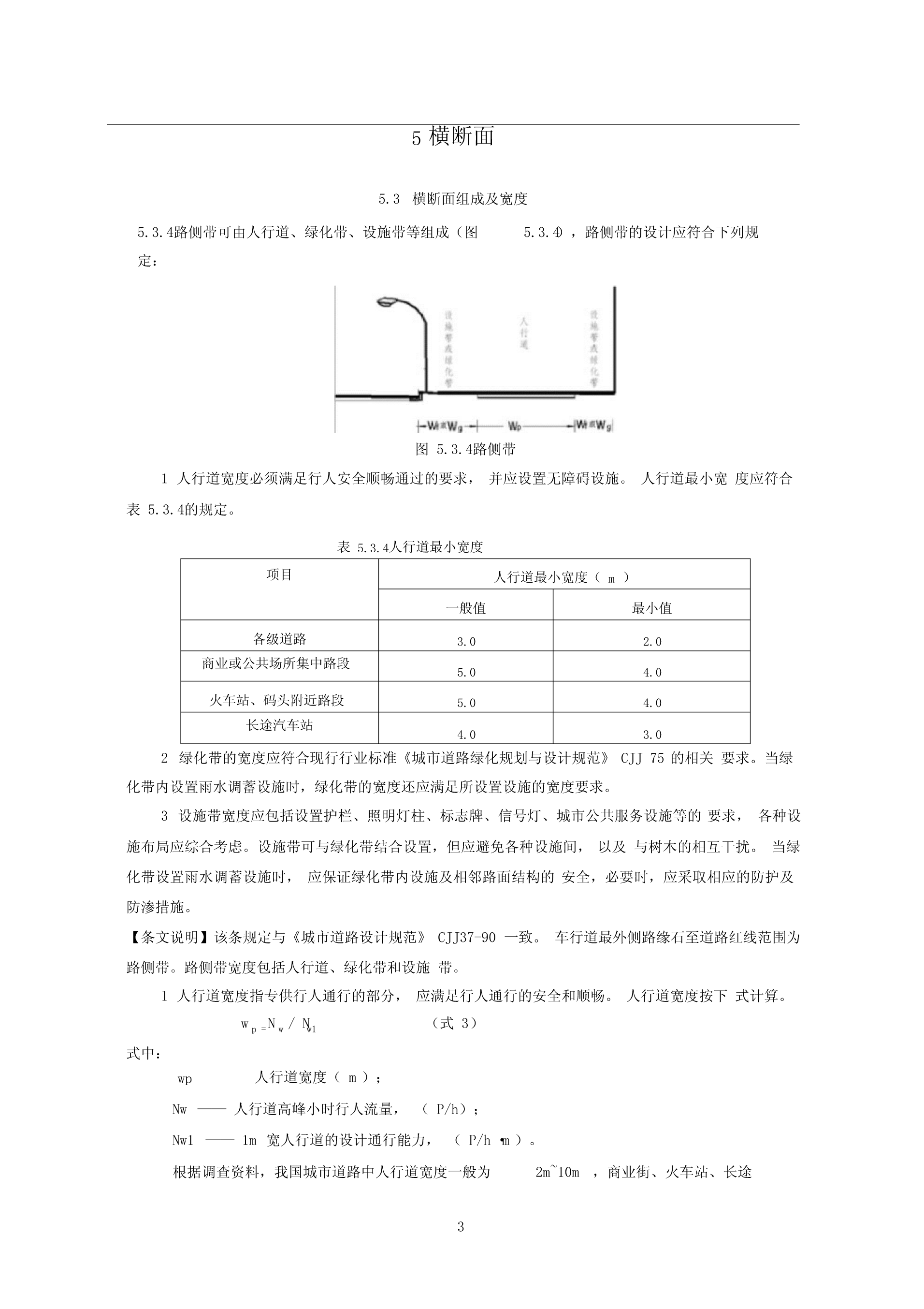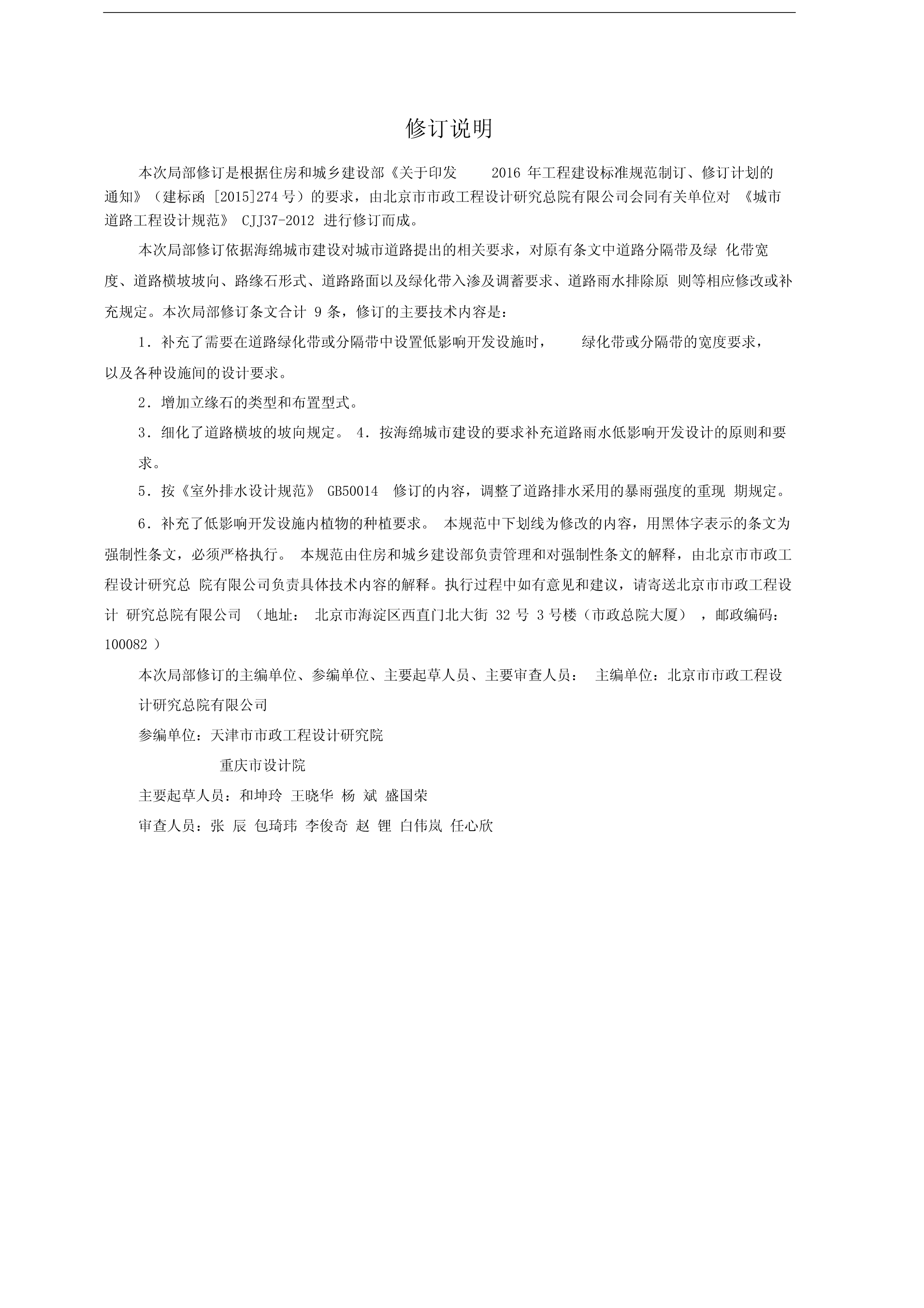 UDCCJJ中华人民共和国行业标准PCJJ37-2012城市道路工程设计规范Codefordesignofurbanroadengineering(2016年版)2012-01-11发布2012-05-01实施中华人民共和国住房和城乡建设部发布1修订说明本次局部修订是根据住房和城乡建设部《关于印发2016年工程建设标准规范制订、修订计划的通知》(建标函[2015]274号)的要求,由北京市市政工程设计研究总院有限公司会同有关单位对《城市道路工程设计规范》CJJ37-2012进行修订而成。本次局部修订依据海绵城市建设对城市道路提出的相关要求,对原有条文中道路分隔带及绿化带宽度、道路横坡坡向、路缘石形式、道路路面以及绿化带入渗及调蓄要求、道路雨水排除原则等相应修改或补充规定。本次局部修订条文合计9条,修订的主要技术内容是:1.补充了需要在道路绿化带或分隔带中设置低影响开发设施时,绿化带或分隔带的宽度要求,以及各种设施间的设计要求。2.增加立缘石的类型和布置型式。3.细化了道路横坡的坡向规定。4.按海绵城市建设的要求补充道路雨水低影响开发设计的原则和要求。5.按《室外排水设计规范》GB50014修订的内容,调整了道路排水采用的暴雨强度的重现期规定。6.补充了低影响开发设施内植物的种植要求。本规范中下划线为修改的内容,用黑体字表示的条文为强制性条文,必须严格执行。本规范由住房和城乡建设部负责管理和对强制性条文的解释,由北京市市政工程设计研究总院有限公司负责具体技术内容的解释。执行过程中如有意见和建议,请寄送北京市市政工程设计研究总院有限公司(地址:北京市海淀区西直门北大街32号3号楼(市政总院大厦),邮政编码:100082)本次局部修订的主编单位、参编单位、主要起草人员、主要审查人员:主编单位:北京市市政工程设计研究总院有限公司参编单位:天津市市政工程设计研究院重庆市设计院主要起草人员:和坤玲王晓华杨斌盛国荣审查人员:张辰包琦玮李俊奇赵锂白伟岚任心欣5横断面5.3横断面组成及宽度5.3.4路侧带可由人行道、绿化带、设施带等组成(图5.3.4),路侧带的设计应符合下列规定:图5.3.4路侧带1人行道宽度必须满足行人安全顺畅通过的要求,并应设置无障碍设施。人行道最小宽度应符合表5.3.4的规定。表5.3.4人行道最小宽度项目人行道最小宽度(m)一般值最小值各级道路3.02.0商业或公共场所集中路段5.04.0火车站、码头附近路段5.04.0长途汽车站4.03.02绿化带的宽度应符合现行行业标准《城市道路绿化规划与设计规范》CJJ75的相关要求。当绿化带内设置雨水调蓄设施时,绿化带的宽度还应满足所设置设施的宽度要求。3设施带宽度应包括设置护栏、照明灯柱、标志牌、信号灯、城市公共服务设施等的要求,各种设施布局应综合考虑。设施带可与绿化带结合设置,但应避免各种设施间,以及与树木的相互干扰。当绿化带设置雨水调蓄设施时,应保证绿化带内设施及相邻路面结构的安全,必要时,应采取相应的防护及防渗措施。【条文说明】该条规定与《城市道路设计规范》CJJ37-90一致。车行道最外侧路缘石至道路红线范围为路侧带。路侧带宽度包括人行道、绿化带和设施带。1人行道宽度指专供行人通行的部分,应满足行人通行的安全和顺畅。人行道宽度按下式计算。wp=Nw/Nw1(式3)式中:wp人行道宽度(m);Nw——人行道高峰小时行人流量,(P/h);Nw1——1m宽人行道的设计通行能力,(P/h·m)。根据调查资料,我国城市道路中人行道宽度一般为2m~10m,商业街、火车站、长途3汽车站附近路段人流密度大,携带的东西多,因此应比一般路段人行道宽。人行道宽度除了满足通行需求外,还应结合道路景观功能,力求与横断面中各部分的宽度协调,各类道路的单侧人行道宽度宜与道路总宽度之间有适当的比例,其合适的比值可参考表6选用。对行人流量大的道路应采用大值。表6单侧人行道宽度与道路总宽度之比值参考表道路类别横断面形式道路类别横断面形式单幅式两幅式三幅式单幅式两幅式三幅式快速路1/6~1/8次干路1/4~1/61/4~1/7主干路1/5~1/71/5~1/8支路1/3~1/52绿化带是指在道路路侧为行车及行人遮阳并美化环境,保证植物正常生长的场地。当种植单排行道树时,绿化带最小宽度为1.5m。3设施带是指在道路两侧为护栏、灯柱、标志牌等公共服务设施等提供的场地。不同设施独立设置时占用宽度见表7。表7不同设施独立设置时占用宽度项目宽度(m)行人护栏0.25~0.5灯柱1.0~1.5邮箱、垃圾箱0.6~1.0长凳、座椅1.0~2.0行道树1.2~1.5根据调查我国各城市设置杆柱的设施带宽度多数为1.0m,有些城市为0.5m~1.5m,考虑有些杆线需设基础,宽度较大,设计时应根据实际情况确定,并可与绿化带结合