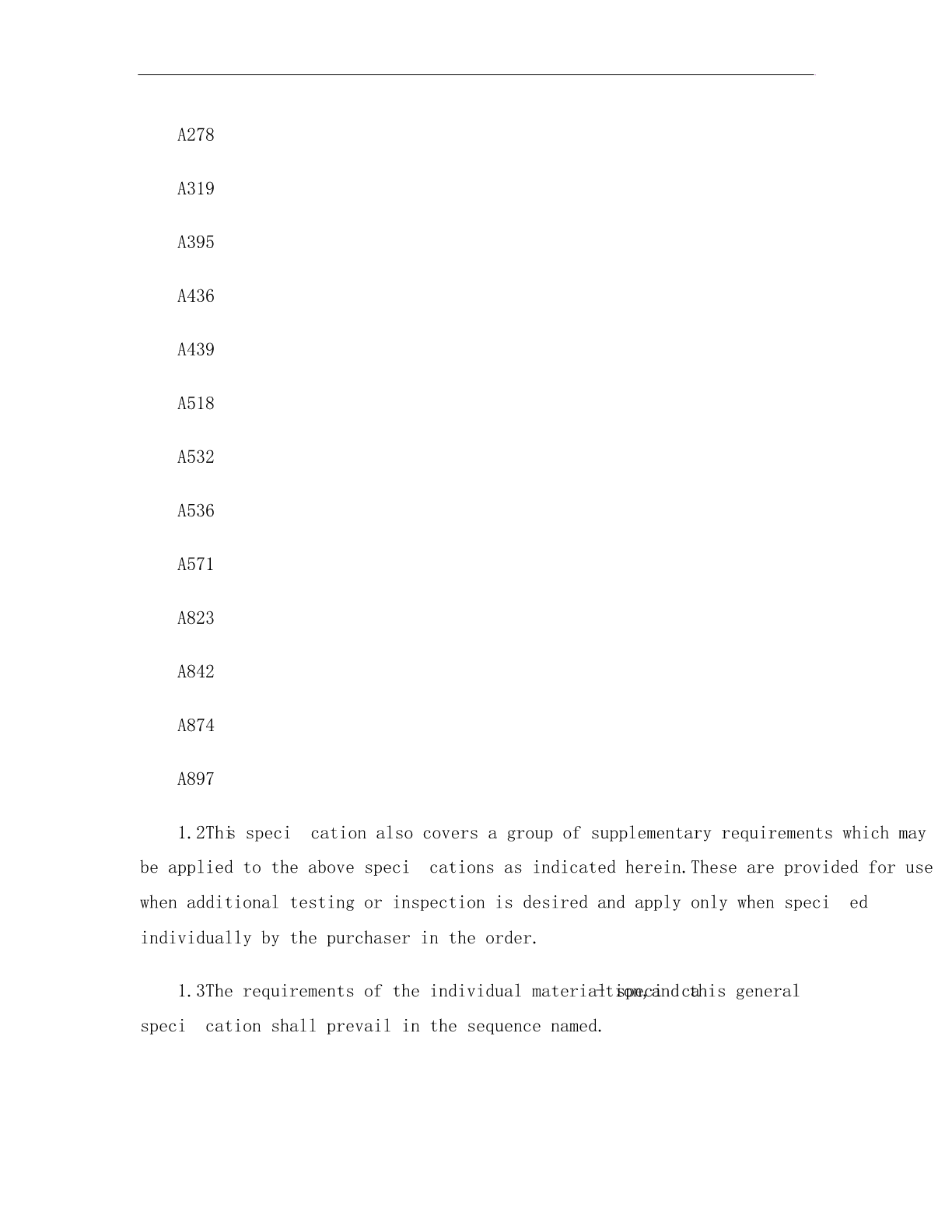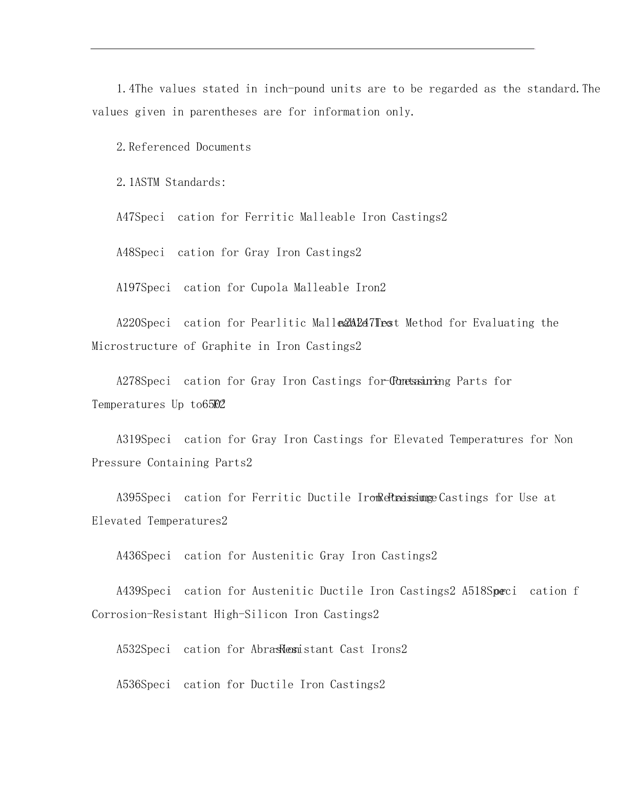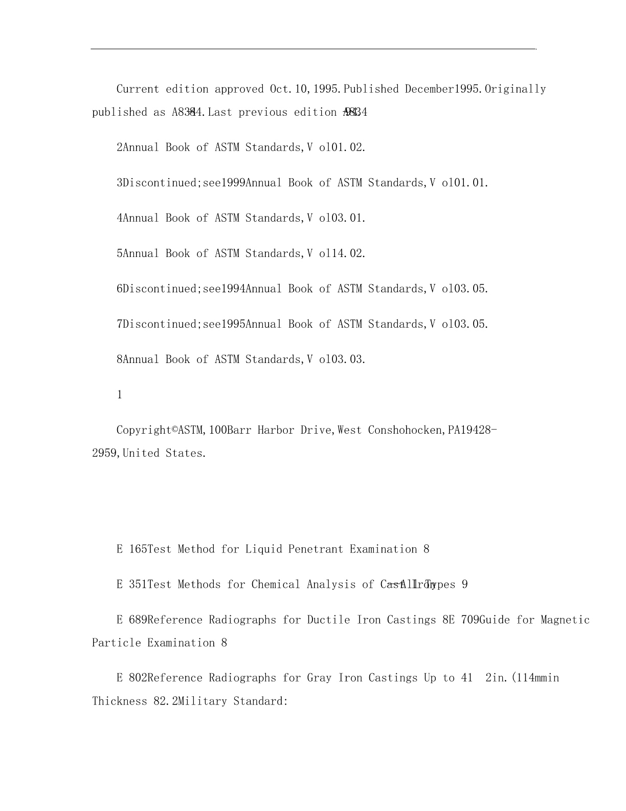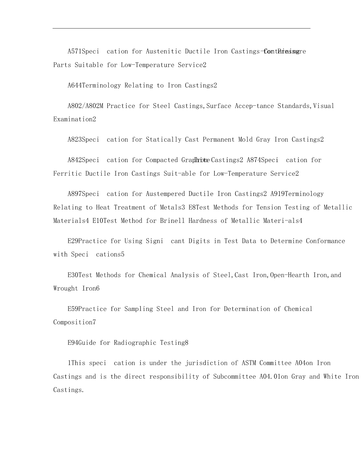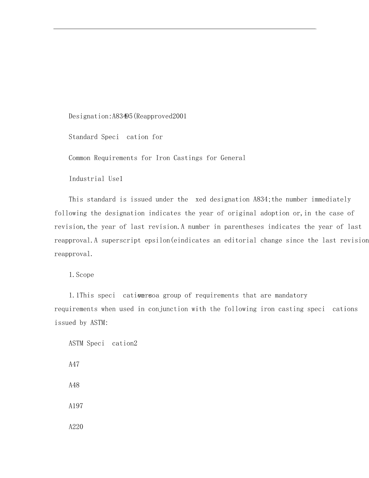 Designation:A834–95(Reapproved2001StandardSpecificationforCommonRequirementsforIronCastingsforGeneralIndustrialUse1ThisstandardisissuedunderthefixeddesignationA834;thenumberimmediatelyfollowingthedesignationindicatestheyearoforiginaladoptionor,inthecaseofrevision,theyearoflastrevision.Anumberinparenthesesindicatestheyearoflastreapproval.Asuperscriptepsilon(eindicatesaneditorialchangesincethelastrevisionorreapproval.1.Scope1.1ThisspecificationverscoagroupofrequirementsthataremandatoryrequirementswhenusedinconjunctionwiththefollowingironcastingspecificationsissuedbyASTM:ASTMSpecification2A47A48A197A220A278A319A395A436A439A518A532A536A571A823A842A874A8971.2Thisspecificationalsocoversagroupofsupplementaryrequirementswhichmaybeappliedtotheabovespecificationsasindicatedherein.Theseareprovidedforusewhenadditionaltestingorinspectionisdesiredandapplyonlywhenspecifiedindividuallybythepurchaserintheorder.1.3Therequirementsoftheindividualmaterial-tion,andspecificathisgeneralspecificationshallprevailinthesequencenamed.1.4Thevaluesstatedininch-poundunitsaretoberegardedasthestandard.Thevaluesgiveninparenthesesareforinformationonly.2.ReferencedDocuments2.1ASTMStandards:A47SpecificationforFerriticMalleableIronCastings2A48SpecificationforGrayIronCastings2A197SpecificationforCupolaMalleableIron2A220SpecificationforPearliticMalleablen2A247TestIroMethodforEvaluatingtheMicrostructureofGraphiteinIronCastings2A278SpecificationforGrayIronCastingsfor-ContainingPressurePartsforTemperaturesUpto650°F2A319SpecificationforGrayIronCastingsforElevatedTemperatures-forNonPressureContainingParts2A395SpecificationforFerriticDuctileIron-RetainingPressureCastingsforUseatElevatedTemperatures2A436SpecificationforAusteniticGrayIronCastings2A439SpecificationforAusteniticDuctileIronCastings2A518SpecificationorfCorrosion-ResistantHigh-SiliconIronCastings2A532SpecificationforAbrasion-ResistantCastIrons2A536SpecificationforDuctileIronCastings2A571SpecificationforAusteniticDuctileIronCastings-ContainingforPressurePartsSuitableforLow-Te