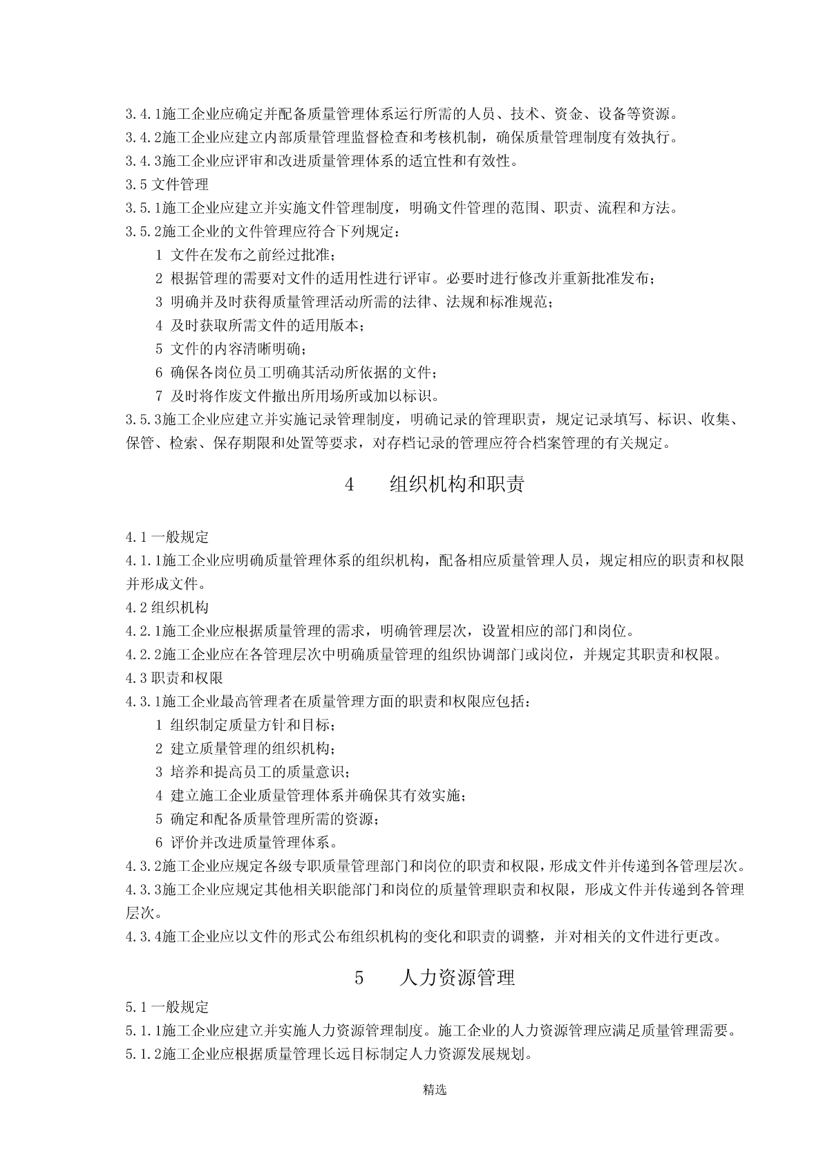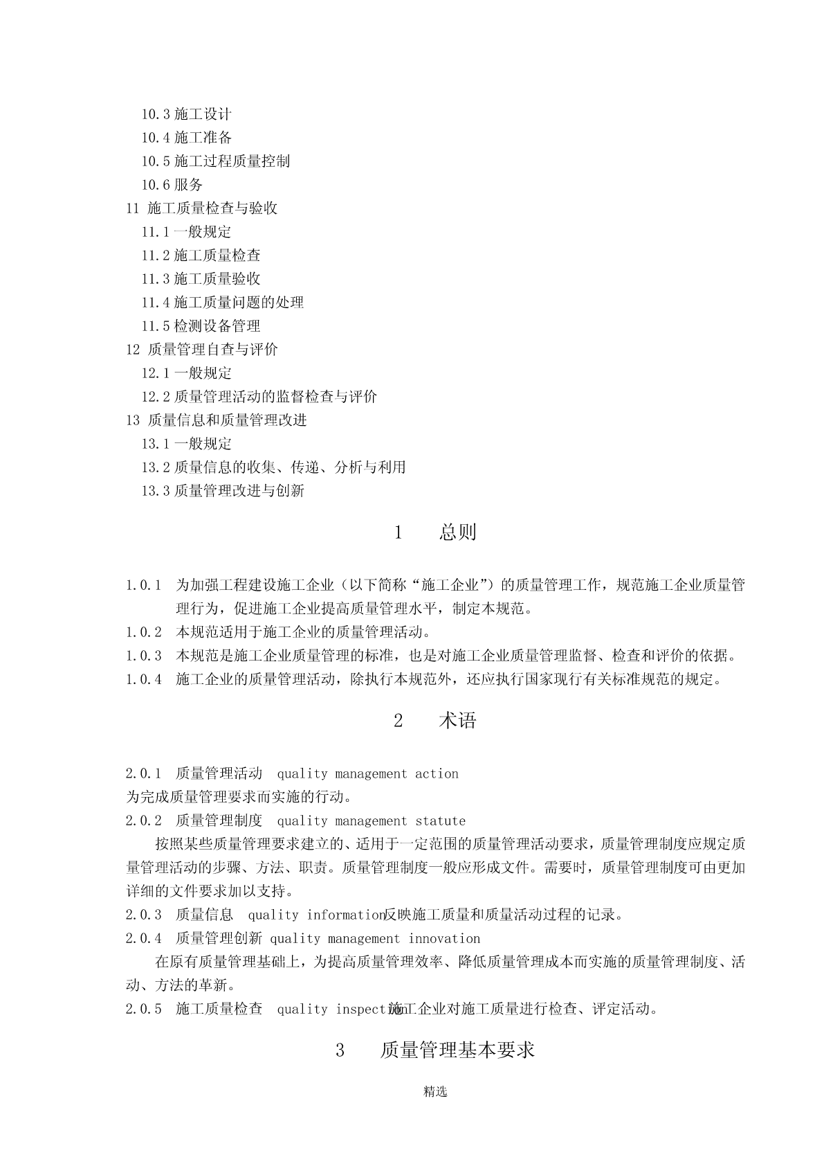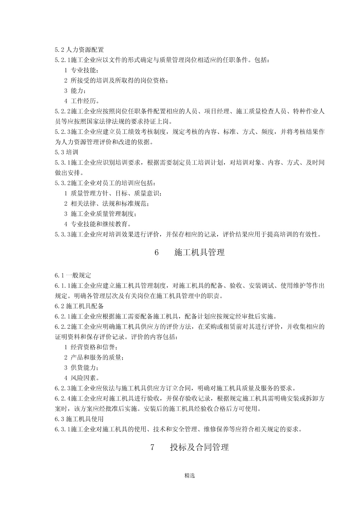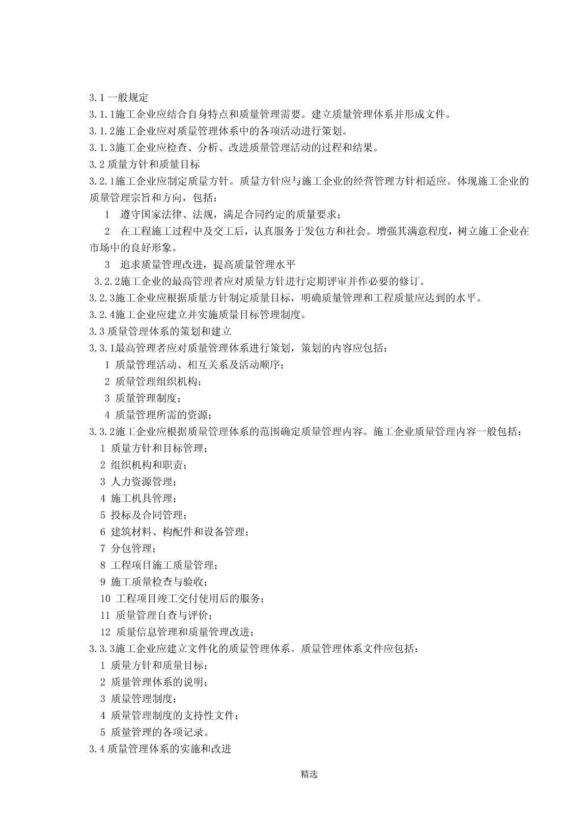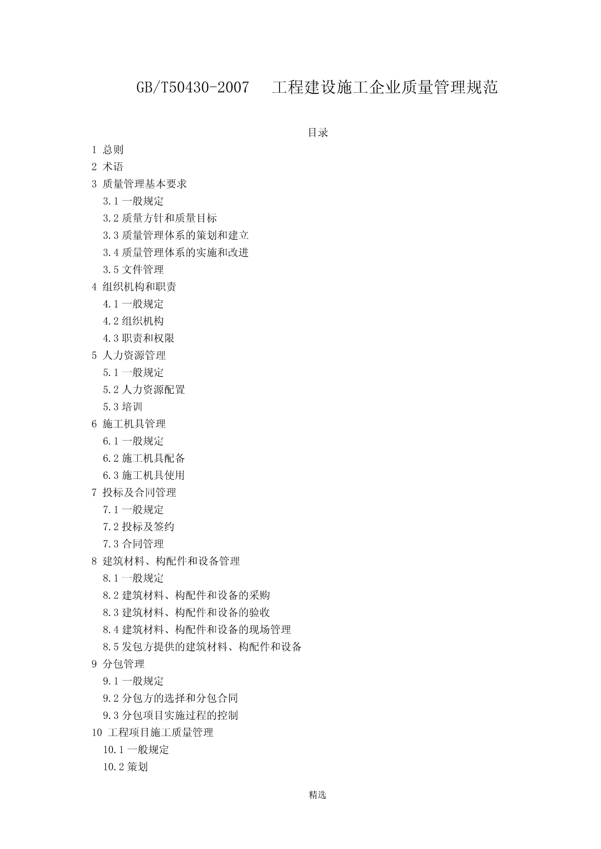 GB/T50430-2007工程建设施工企业质量管理规范目录1总则2术语3质量管理基本要求3.1一般规定3.2质量方针和质量目标3.3质量管理体系的策划和建立3.4质量管理体系的实施和改进3.5文件管理4组织机构和职责4.1一般规定4.2组织机构4.3职责和权限5人力资源管理5.1一般规定5.2人力资源配置5.3培训6施工机具管理6.1一般规定6.2施工机具配备6.3施工机具使用7投标及合同管理7.1一般规定7.2投标及签约7.3合同管理8建筑材料、构配件和设备管理8.1一般规定8.2建筑材料、构配件和设备的采购8.3建筑材料、构配件和设备的验收8.4建筑材料、构配件和设备的现场管理8.5发包方提供的建筑材料、构配件和设备9分包管理9.1一般规定9.2分包方的选择和分包合同9.3分包项目实施过程的控制10工程项目施工质量管理10.1一般规定10.2策划精选10.3施工设计10.4施工准备10.5施工过程质量控制10.6服务11施工质量检查与验收11.1一般规定11.2施工质量检查11.3施工质量验收11.4施工质量问题的处理11.5检测设备管理12质量管理自查与评价12.1一般规定12.2质量管理活动的监督检查与评价13质量信息和质量管理改进13.1一般规定13.2质量信息的收集、传递、分析与利用13.3质量管理改进与创新1总则1.0.1为加强工程建设施工企业(以下简称“施工企业”)的质量管理工作,规范施工企业质量管理行为,促进施工企业提高质量管理水平,制定本规范。1.0.2本规范适用于施工企业的质量管理活动。1.0.3本规范是施工企业质量管理的标准,也是对施工企业质量管理监督、检查和评价的依据。1.0.4施工企业的质量管理活动,除执行本规范外,还应执行国家现行有关标准规范的规定。2术语2.0.1质量管理活动qualitymanagementaction为完成质量管理要求而实施的行动。2.0.2质量管理制度qualitymanagementstatute按照某些质量管理要求建立的、适用于一定范围的质量管理活动要求,质量管理制度应规定质量管理活动的步骤、方法、职责。质量管理制度一般应形成文件。需要时,质量管理制度可由更加详细的文件要求加以支持。2.0.3质量信息qualityinformation反映施工质量和质量活动过程的记录。2.0.4质量管理创新qualitymanagementinnovation在原有质量管理基础上,为提高质量管理效率、降低质量管理成本而实施的质量管理制度、活动、方法的革新。2.0.5施工质量检查qualityinspection施工企业对施工质量进行检查、评定活动。3质量管理基本要求精选3.1一般规定3.1.1施工企业应结合自身特点和质量管理需要。建立质量管理体系并形成文件。3.1.2施工企业应对质量管理体系中的各项活动进行策划。3.1.3施工企业应检查、分析、改进质量管理活动的过程和结果。3.2质量方针和质量目标3.2.1施工企业应制定质量方针。质量方针应与施工企业的经营管理方针相适应。体现施工企业的质量管理宗旨和方向,包括:1遵守国家法律、法规,满足合同约定的质量要求;2在工程施工过程中及交工后,认真服务于发包方和社会。增强其满意程度,树立施工企业在市场中的良好形象。3追求质量管理改进,提高质量管理水平3.2.2施工企业的最高管理者应对质量方针进行定期评审并作必要的修订。3.2.3施工企业应根据质量方针制定质量目标,明确质量管理和工程质量应达到的水平。3.2.4施工企业应建立并实施质量目标管理制度。3.3质量管理体系的策划和建立3.3.1最高管理者应对质量管理体系进行策划,策划的内容应包括:1质量管理活动、相互关系及活动顺序;2质量管理组织机构;3质量管理制度;4质量管理所需的资源;3.3.2施工企业应根据质量管理体系的范围确定质量管理内容。施工企业质量管理内容一般包括:1质量方针和目标管理;2组织机构和职责;3人力资源管理;4施工机具管理;5投标及合同管理;6建筑材料、构配件和设备管理;7分包管理;8工程项目施工质量管理;9施工质量检查与验收;10工程项目竣工交付使用后的服务;11质量管理自查与评价;12质量信息管理和质量管理改进;3.3.3施工企业应建立文件化的质量管理体系。质量管理体系文件应包括:1质量方针和质量目标;2质量管理体系的说明;3质量管理制度;4质量管理制度的支持性文件;5质量管理的各项记录。3.4质量管理体系的实施和改进精选3.4.1施工企业应确定并配备质量管理体系运行所需的人员、技术、资金、设备等资源。3.4.2施工企业应建立内部质量管理监督检查和考核机制,确保质量管理制度有效执行。3.4.3施工企业应评审和改进质量管理体系的适宜性和有效性。3.5文件管理3.5.1施工企业应