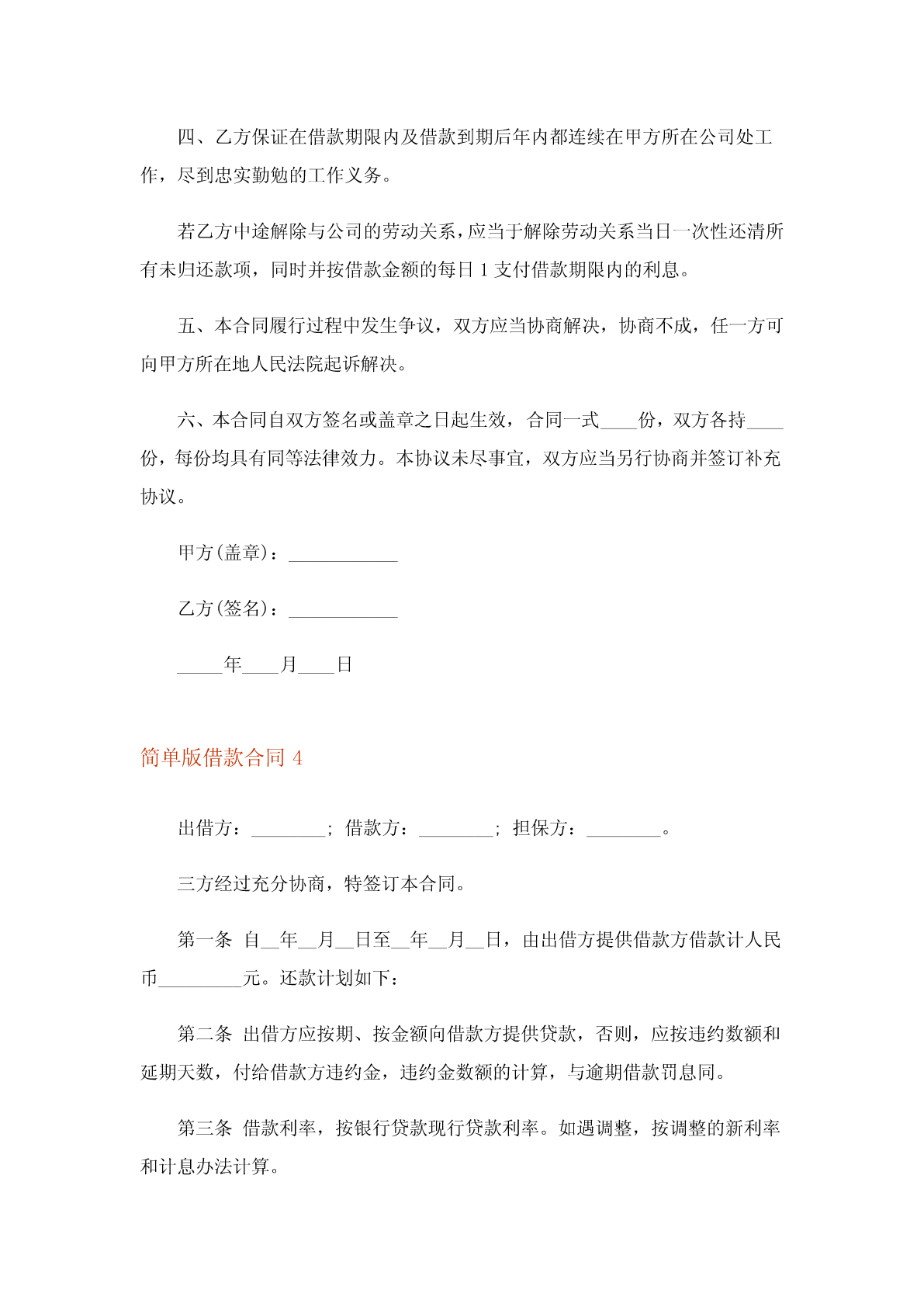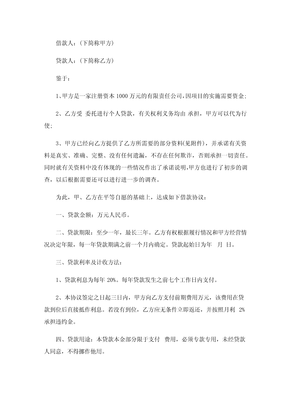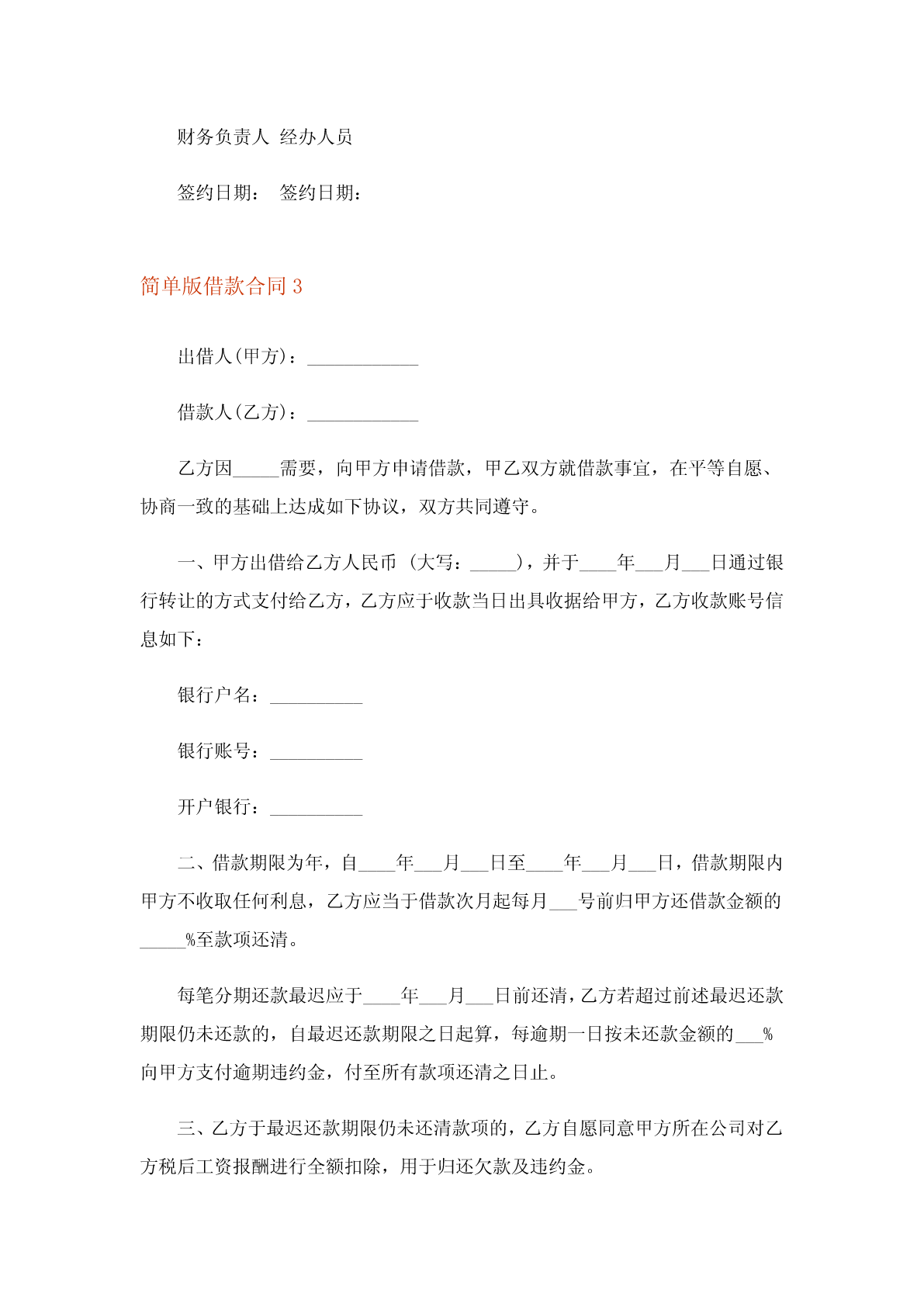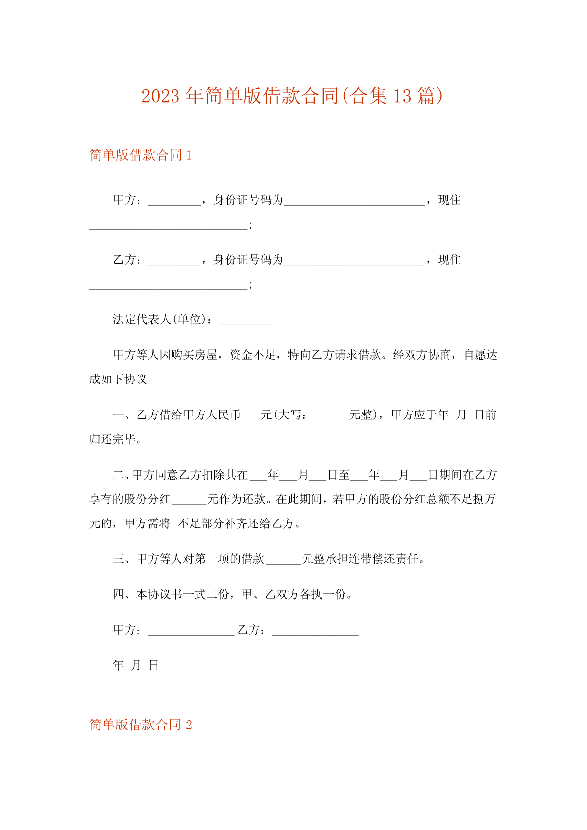 2023年简单版借款合同(合集13篇)简单版借款合同1甲方:_________,身份证号码为________________________,现住___________________________;乙方:_________,身份证号码为________________________,现住___________________________;法定代表人(单位):_________甲方等人因购买房屋,资金不足,特向乙方请求借款。经双方协商,自愿达成如下协议一、乙方借给甲方人民币___元(大写:______元整),甲方应于年月日前归还完毕。二、甲方同意乙方扣除其在___年___月___日至___年___月___日期间在乙方享有的股份分红______元作为还款。在此期间,若甲方的股份分红总额不足捌万元的,甲方需将不足部分补齐还给乙方。三、甲方等人对第一项的借款______元整承担连带偿还责任。四、本协议书一式二份,甲、乙双方各执一份。甲方:_______________乙方:_______________年月日简单版借款合同2借款人:(下简称甲方)贷款人:(下简称乙方)鉴于:1、甲方是一家注册资本1000万元的有限责任公司,因项目的实施需要资金;2、乙方受委托进行个人贷款,有关权利义务均由承担,甲方可以代为行使;3、甲方已经向乙方提供了乙方所需要的部分资料(见附件),并承诺有关资料是真实、准确、完整、没有任何遗漏,不存在任何欺诈,否则承担一切责任。同时就有关资料中没有体现的一些情况作出了承诺说明,甲方也进行了初步的调查,以后根据需要还可以进行进一步的调查。为此,甲、乙方在平等自愿的基础上,达成如下借款协议:一、贷款金额:万元人民币。二、贷款期限:至少一年,最长三年。乙方有权根据履行情况和甲方经营情况决定年限,每一年贷款期满之前一个月内确定。贷款起始日为年月日。三、贷款利率及计收方法:1、贷款利息为每年20%。每年贷款发生之前七个工作日内支付。2、本协议签定之日起三日内,甲方向乙方支付前期费用万元,该费用在贷款到位后直接抵作利息。若没有到位,乙方应无条件立即返还,并按照月利2%承担违约金。四、贷款用途:本贷款本金部分限于支付费用,必须专款专用,未经贷款人同意,不得挪作他用。五、贷款使用:本合同签订之日起三个月内,甲方应将其签订的有关甲方买卖等重要合同六、贷款偿还:如借款人不能按期还款,最迟在贷款到期前十五天应向贷款人提出书面展期申请,届时贷款人可按有关规定作出处理意见。逾期或贷款人不同意展期的贷款,自过期之日起,加收20%~50%的罚息。为有利于还款,借款人应在贷款人处开立还款准备金帐户,将用于还款的人民币资金先予存入,待外汇额度落实后再结汇偿还贷款。七、还款担保:本合同项下的贷款本息由作为借款人的担保人,并由担保人向贷款人出具担保函,作为本合同不可分割的组成部分。一旦借款人不能按期偿还贷款本息,经贷款人发出书面通知,由担保单位承担还本付息责任。本贷款项下有关进出口结算业务,应通过中国银行进出口业务部叙做。八、违约和违约处理:(一)下列情况均属借款人违约:1.借款人未能按合同计划用款和还本付息。2.未经贷款人同意改变贷款用途或挪作他用。3.未经贷款人同意借款人私自转卖用贷款购置的物品。4.借款人违反本合同其他条款事项。(二)根据违约情况,贷款人有权采取下列措施:1.注销借款人未使用的贷款。2.对违约部分贷款加收最高为50%的罚息。3.冻结借款人在贷款人处的存款,并追回贷款。4.向贷款担保人追索贷款。5.借款人和担保人未能履行合同还款责任时,贷款人有权从借款人和担保人在各金融单位存款帐户中主动扣收还贷款项。6.采取其他必要手段直至依法索偿应付未付贷款本息及费用。九、合同生效:本合同经双方签字盖章后生效。本合同共四份,双方各执两份。本合同若有其他未及事宜,双方进一步商定补充条款。借款人(盖章)贷款人(盖章)企业负责人银行负责人财务负责人经办人员签约日期:签约日期:简单版借款合同3出借人(甲方):____________借款人(乙方):____________乙方因_____需要,向甲方申请借款,甲乙双方就借款事宜,在平等自愿、协商一致的基础上达成如下协议,双方共同遵守。一、甲方出借给乙方人民币(大写:_____),并于____年___月___日通过银行转让的方式支付给乙方,乙方应于收款当日出具收据给甲方,乙方收款账号信息如下:银行户名:__________银行账号:__________开户银行:__________二、借款期限为年,自____年___月___日至____年___月___日,借款期限内甲方不收取任何利息,乙方应当于借款次月起每月___号前归甲方还借款金额的_____%至款项还清。每笔分期还款最迟应于____年___月_