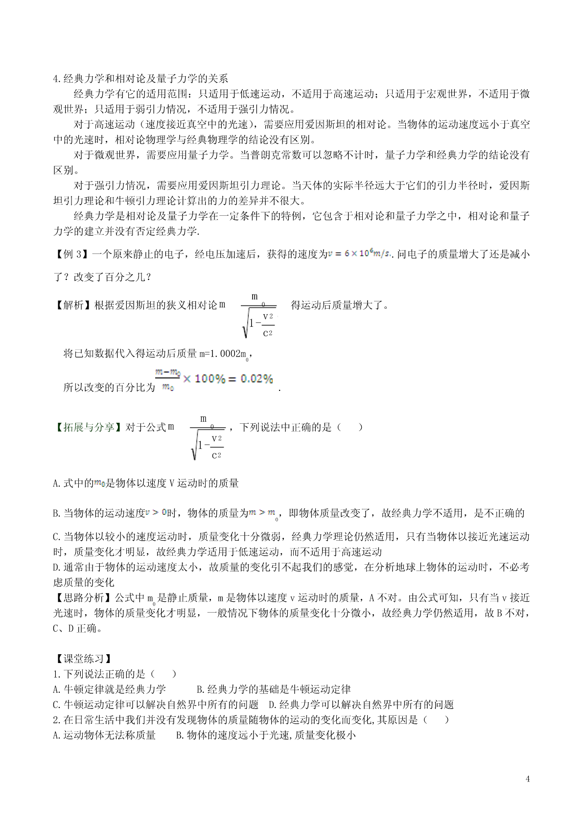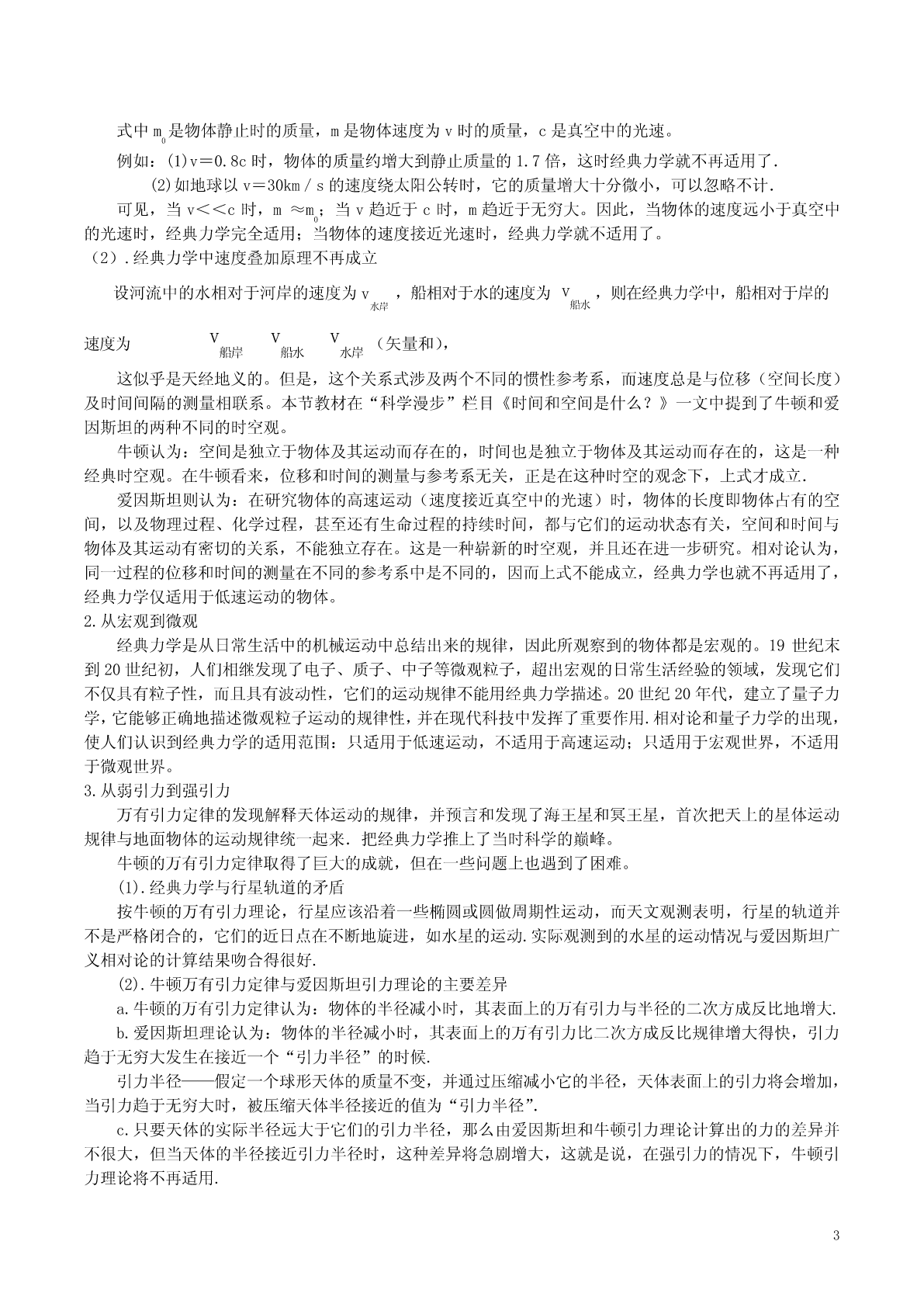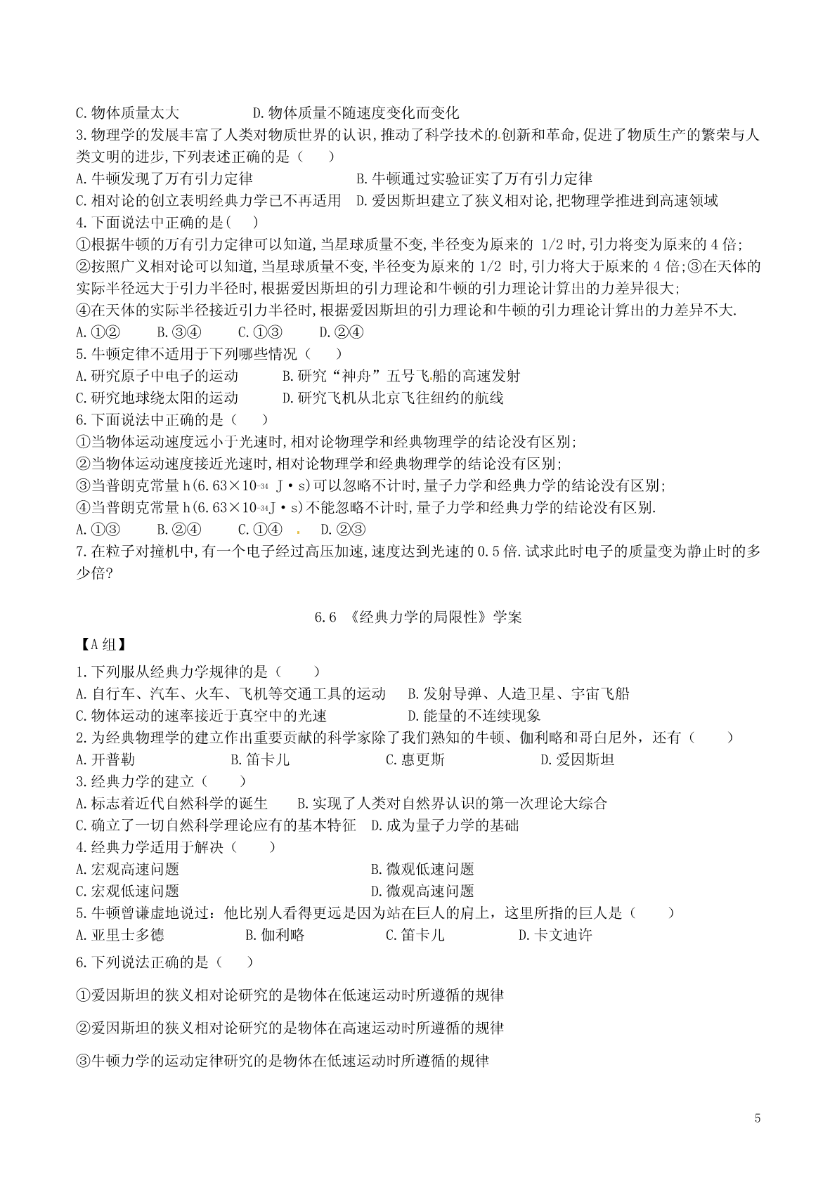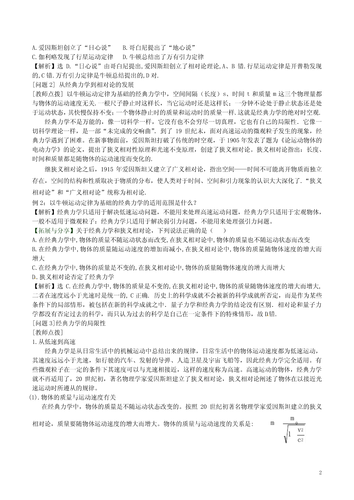 6.6《经典力学的局限性》学案【课标要求】(1)知道牛顿运动定律的适用范围;(2)了解经典力学在科学研究和生产技术中的广泛应用;(3)知道质量与速度的关系,知道高速运动中必须考虑速度随时。【重点难点】1.牛顿运动定律的适用范围。2.高速运动的物体,速度和质量之间的关系。【课前预习】1.经典力学认为,物体的质量与物体的运动状态;而狭义相对沦认为,物体的质量随着它的速度的增大而,若一个物体静止时的质量为,则当它以速度运动时,共质量m=。2.每一个天体都有一个引力半径,半径的大小由决定;只要天体实际半径它们的引力半径,那么由爱因斯坦和牛顿引力理论计算出的力的差异。但当天体的实际半径接近引力半径时,这种差异。3.19世纪末和20世纪以来,物理学的研究深入到,发现、、等微观粒子不仅有、,而且有,它们的运动规律不能用经典力学来说明。[探究与生成][问题1]经典力学发展和伟大成就[教师点拨]经典力学发展经历了三个阶段:第一阶段是在伽利略、牛顿时代之前,人们对力学现象的研究大多直接反映在技术之中或完全融合在哲学之内,物理学就整体而言还没有成为独立的科学;第二阶段是从伽利略到牛顿,是经典力学从基本要领、基本定律到建成理论体系的阶段,在这一阶段有一系列的科学家为经典力学打下重要基础。如伽利略、笛卡儿对惯性的研究发现了惯性定律和重力作用下的匀加速运动,奠定了牛顿第一定律和第二定律的基本思想,开普勒对天体运动的研究发现了行星运动三定律,为万有引力定律奠定基础,惠更斯对碰撞问题的研究等。第三阶段是牛顿之后经典力学的新发展,后人对经典力学的表述形式和应用对象进行了拓展与分享和完善。经过几百年的发展和完善,经典力学取得了伟大成就:1.1687年,牛顿在前人的基础上发表了《自然哲学的数学原理》,这是一部奠定了经典力学基础的划时代的著作。在这本书中,牛顿用数学方法证明了万有引力定律和三大运动定律,被认为是“人类智慧史上最伟大的一个成就”。从而建立了一个完整的力学体系。2.牛顿力学只用了几个概念和原理,就说明了行星和卫星的运行规律和运行轨道、海洋的潮汐、落体的运动、飞机和汽车的运动、足球的运动等等一切宏观物体的运动都服从经典力学的规律。经典力学能在如此广阔的领域内显示出牛顿定律的正确性和经典力学的魅力。例1.以牛顿运动定律为基础的经典力学,在科学研究和生产技术中有哪些应用?【解析】经典力学在科学研究和生产技术中有广泛的应用,经典力学与天文学相结合建立了天体力学;经典力学和工程实际相结合,建立了应用力学,如水利学,材料力学、结构力学等。从地面上各种物体的运动到天体的运动:从大气的流动到地壳的变动:从拦柯筑坝、修建桥梁到设计各种机械;从自行车到汽车、火车、飞机等现代交通工具的运动,从投出篮球到发射导弹、卫星、宇宙飞船等等,所有这些都服从经典力学规律。【拓展与分享】在物理学发展的过程中,许多物理学家的科学发现推动了人类历史的进步.在对以下几位物理学家所作科学贡献的叙述中,正确的说法是()1A.爱因斯坦创立了“日心说”B.哥白尼提出了“地心说”C.伽利略发现了行星运动定律D.牛顿总结出了万有引力定律【解析】选D.“日心说”由哥白尼提出,爱因斯坦创立了相对论理论,A、B错.行星运动定律是开普勒发现的,C错.万有引力定律是牛顿总结提出的,D对.[问题2]从经典力学到相对论的发展[教师点拨]以牛顿运动定律为基础的经典力学中,空间间隔(长度)s、时间t和质量m这三个物理量都与物体的运动速度无关.一根尺子静止时这样长,当它运动时还是这样长;一分钟不论处于静止状态还是处于运动状态,其快慢保持不变;一个物体静止时的质量和运动时的质量一样.这就是经典力学的绝对时空观.经典力学不是万能的,像一切科学一样,它没有也不会穷尽一切真理,它也有自己的局限性.它像一切科学理论一样,是一部“未完成的交响曲”.到了19世纪末,面对高速运动的微观粒子发生的现象,经典力学遇到了困难。在新事物面前,爱因斯坦打破了传统的时空观,于1905年发表了题为《论运动物体的电动力学》的论文,提出了狭义相对性原理和光速不变原理,创建了狭义相对论。狭义相对论指出:长度、时间和质量都是随物体的运动速度而变化的.继狭义相对论之后,1915年爱因斯坦又建立了广义相对论,指出空间——时间不可能离开物质而独立存在,空间的结构和性质取决于物质的分布,使人类对于时间、空间和引力现象的认识大大深化了.“狭义相对论”和“广义相对论”统称为相对论.例2:以牛顿运动定律为基础的经典力学的适用范围是什么?【解析】经典力学只适用于解决低速运动问题,不能用来处理高速运动问题,经典力学只适用于宏观物体,一般不适用于微观粒子:经典力学只适用于解决弱引力问题,不能用来处理强引力问题。【拓展与分享】关于经典力学和狭义相对论,下列说法正确的是()A.在经典力学