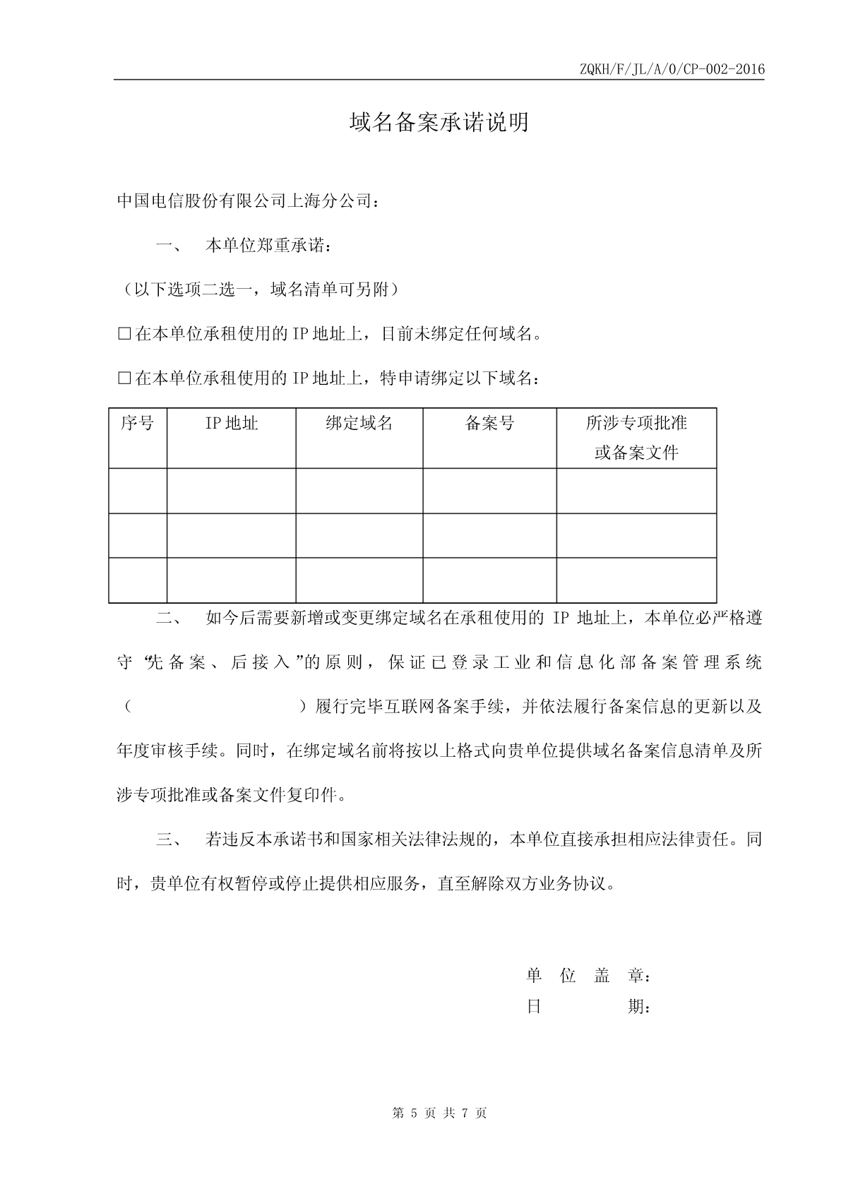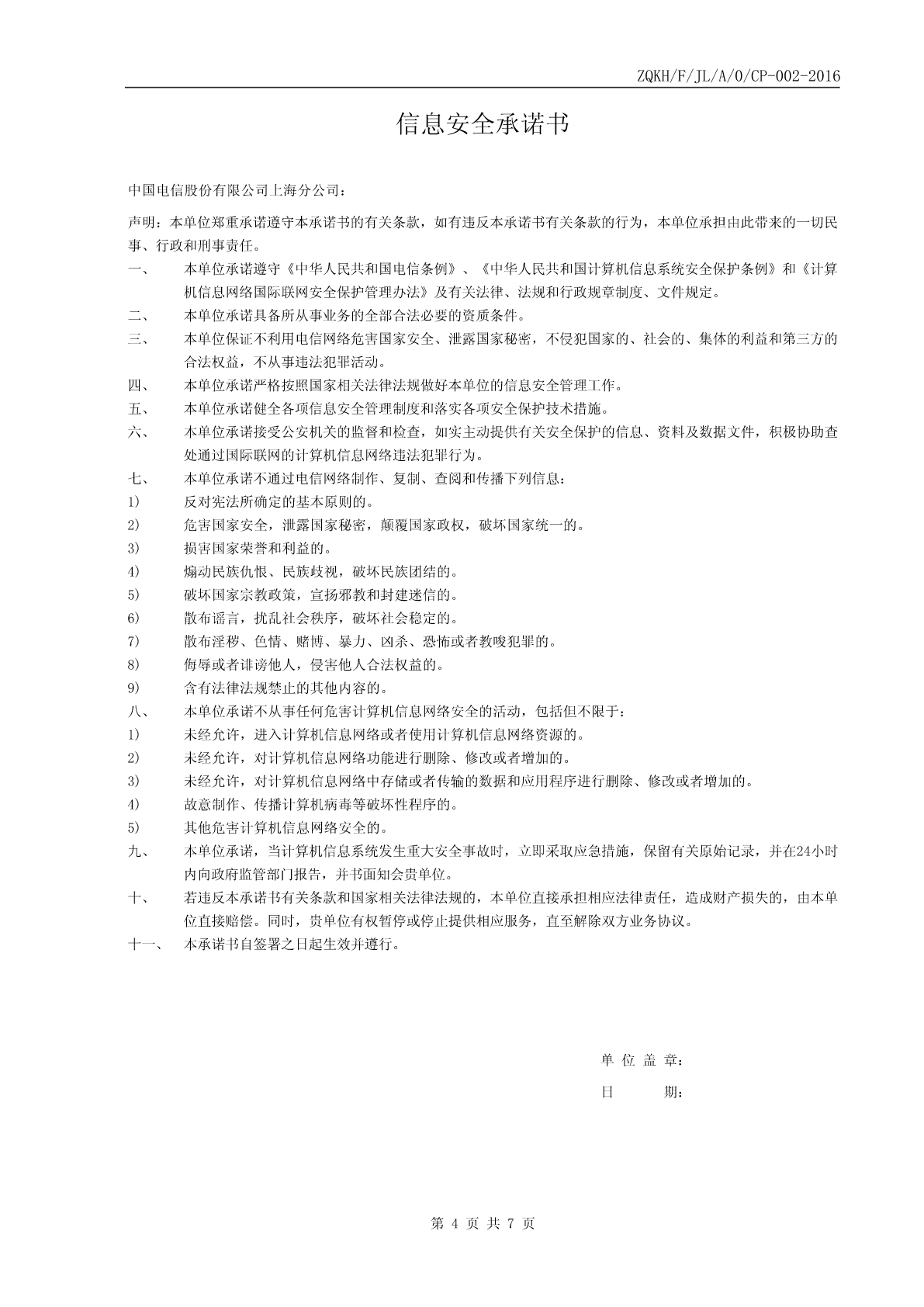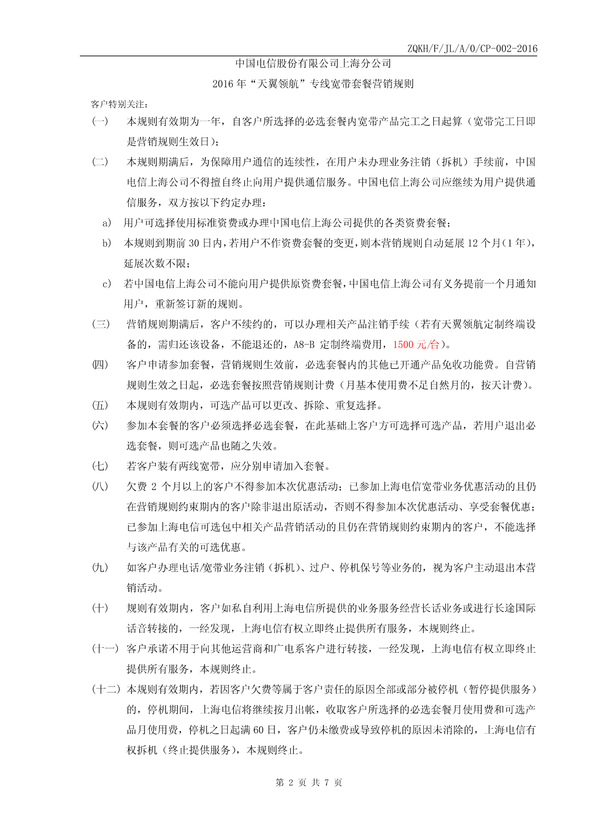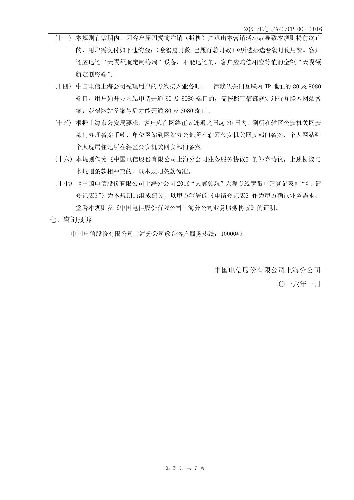 ZQKH/F/JL/A/0/CP-002-2016中国电信股份有限公司上海分公司2016年“天翼领航”专线宽带套餐申请登记表*企业全称企业代码*企业所属行业*企业规模□10人以下□10-30人□31-80人□81-200人□200人以上*计算机数量□5台及以下□6-15台□16-40台□41-100台□100台以上*安装地址*邮编*联系人身份证号码*联系电话联系人职务E-MAIL传真*资料邮寄地址□同公司地址□其它*邮编*付款方式□托收银行账号:□现金*代理商名称*代理商业务人员姓名*业务人员联系电话基本包申请信息(请在以下需要的项目内打“√”,基本包必择其一)以下请选择□30M/30M(2388元/月)□30M/30M(23880元/年)以下2选1□50M/50M(4388元/月)□50M/50M(43880元/年)□专网上网主套餐□80M/80M(7388元/月)□80M/80M(73880元/年)□FTTB+LAN(郊区)□100M/100M(10388元/月)1、国际精品网服务:本套餐提供的专线IP地址均为经过优化的固定IP地址(国际出口方向)2、IP地址升级套餐【□可升级到5个固定公网IP地址,费用增加200元/月,如主套餐是选用年付费的,费用增加2000通信服务内元/年】包含【□可升级到13个固定公网IP地址,费用增加500元/月,如主套餐是选用年付费的,费用增加5000内容元/年】1)专网上网:一次性接入费为1300元/线。新装优惠2)FTTB+LAN:一次性接入费为210元/线。□纯新装套餐类型□在用设备号码________________可选产品申请信息(请在以下需要的项目内打“√”)200元/月(定制终端1台,A8-B)【可提供配置快速开通服务、多PC有线无线上网服务、7*24小时定制终端服务远程监控值守服务】1、请认真、正确填写登记表中的每一项,其中带*项必须填写。2、“企业代码”一栏应填写工商注册号。3、经办人为经企业授权,办理申请参加本营销活动手续的企业内部员工。4、联系人为经企业授权,在业务优惠期间,有权办理相关业务申请/变更手续的企业内部员工,如联系人发生变更,请及时告知中国电信股份有限公司上海分公司的客户经理。填表说明5、如有问题请及时致电中国电信股份有限公司上海分公司政企客户热线:10000*9。6、请认真阅读《中国电信股份有限公司上海分公司业务服务协议》、《中国电信股份有限公司上海分公司2016年“天翼领航”专线宽带套餐营销规则》经办人签字:单位盖章:日期:年月日ZQKH/F/JL/A/0/CP-002-2016中国电信股份有限公司上海分公司2016年“天翼领航”专线宽带套餐营销规则客户特别关注:(一)本规则有效期为一年,自客户所选择的必选套餐内宽带产品完工之日起算(宽带完工日即是营销规则生效日);(二)本规则期满后,为保障用户通信的连续性,在用户未办理业务注销(拆机)手续前,中国电信上海公司不得擅自终止向用户提供通信服务。中国电信上海公司应继续为用户提供通信服务,双方按以下约定办理:a)用户可选择使用标准资费或办理中国电信上海公司提供的各类资费套餐;b)本规则到期前30日内,若用户不作资费套餐的变更,则本营销规则自动延展12个月(1年),延展次数不限;c)若中国电信上海公司不能向用户提供原资费套餐,中国电信上海公司有义务提前一个月通知用户,重新签订新的规则。(三)营销规则期满后,客户不续约的,可以办理相关产品注销手续(若有天翼领航定制终端设备的,需归还该设备,不能退还的,A8-B定制终端费用,1500元/台)。(四)客户申请参加套餐,营销规则生效前,必选套餐内的其他已开通产品免收功能费。自营销规则生效之日起,必选套餐按照营销规则计费(月基本使用费不足自然月的,按天计费)。(五)本规则有效期内,可选产品可以更改、拆除、重复选择。(六)参加本套餐的客户必须选择必选套餐,在此基础上客户方可选择可选产品,若用户退出必选套餐,则可选产品也随之失效。(七)若客户装有两线宽带,应分别申请加入套餐。(八)欠费2个月以上的客户不得参加本次优惠活动;已参加上海电信宽带业务优惠活动的且仍在营销规则约束期内的客户除非退出原活动,否则不得参加本次优惠活动、享受套餐优惠;已参加上海电信可选包中相关产品营销活动的且仍在营销规则约束期内的客户,不能选择与该产品有关的可选优惠。(九)如客户办理电话/宽带业务注销(拆机)、过户、停机保号等业务的,视为客户主动退出本营销活动。(十)规则有效期内,客户如私自利用上海电信所提供的业务服务经营长话业务或进行长途国际话音转接的,一经发现,上海电信有权立即终止提供所有服务,本规则终止。(十一)客户承诺不用于向其他运营商和广电系客户进行转接,一经发现,上海电信有权立即终止提供