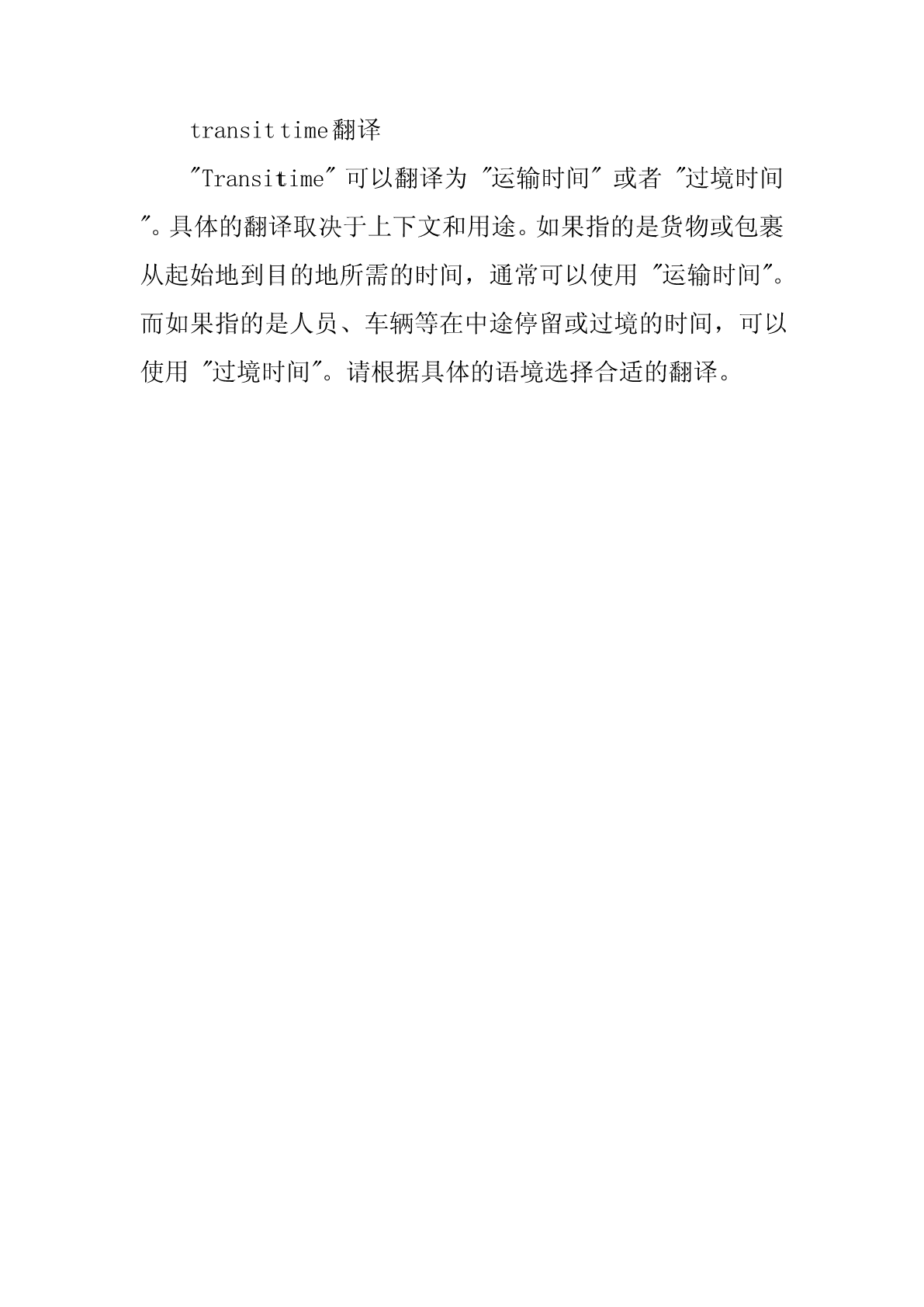 transittime翻译"Transittime"可以翻译为"运输时间"或者"过境时间"。具体的翻译取决于上下文和用途。如果指的是货物或包裹从起始地到目的地所需的时间,通常可以使用"运输时间"。而如果指的是人员、车辆等在中途停留或过境的时间,可以使用"过境时间"。请根据具体的语境选择合适的翻译。