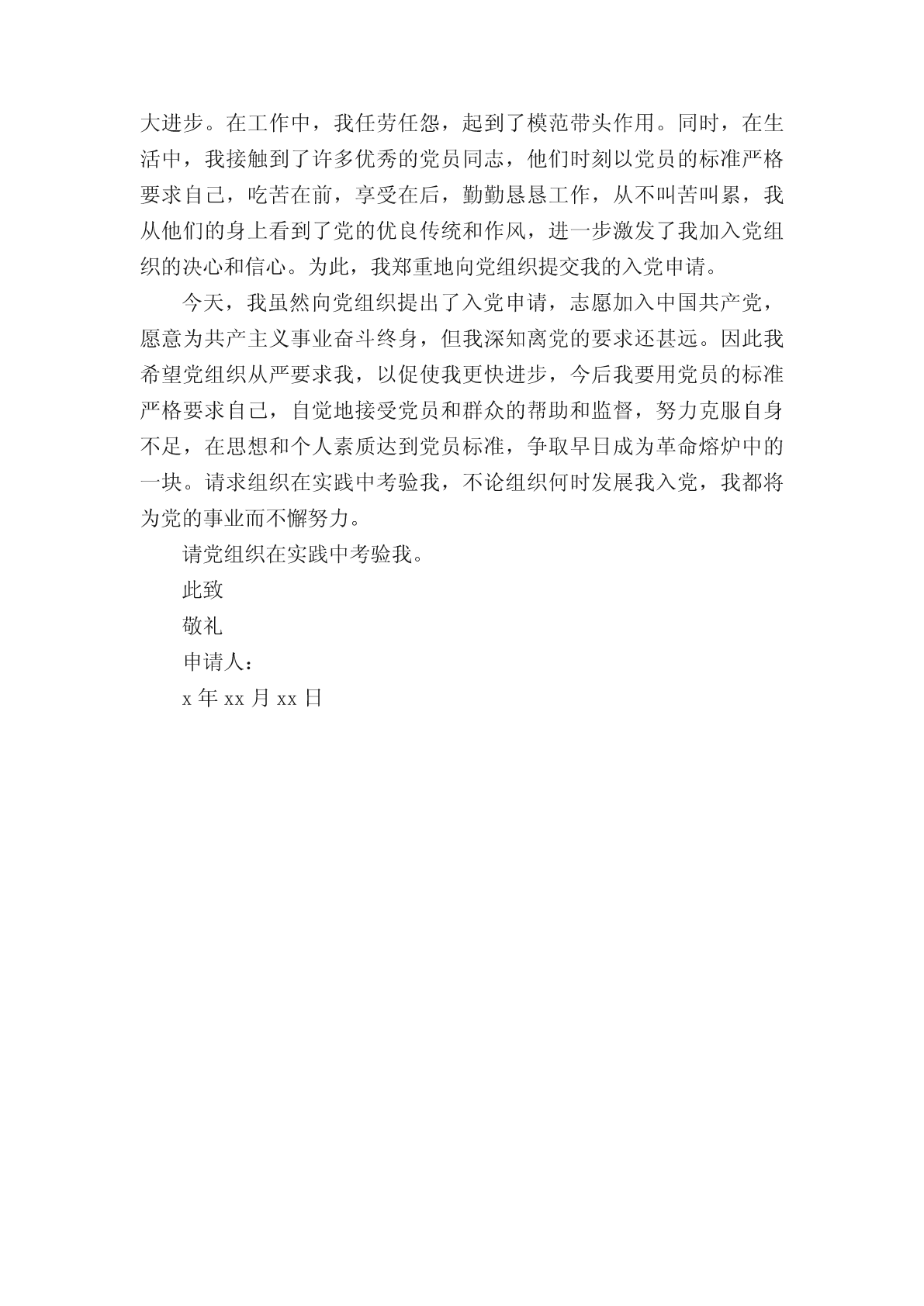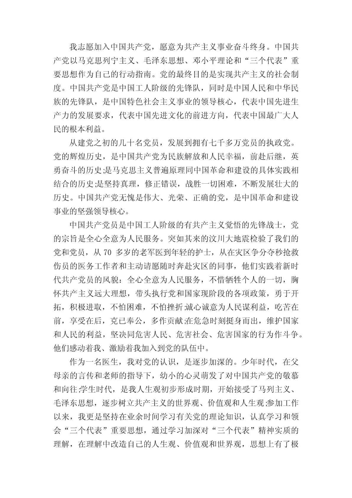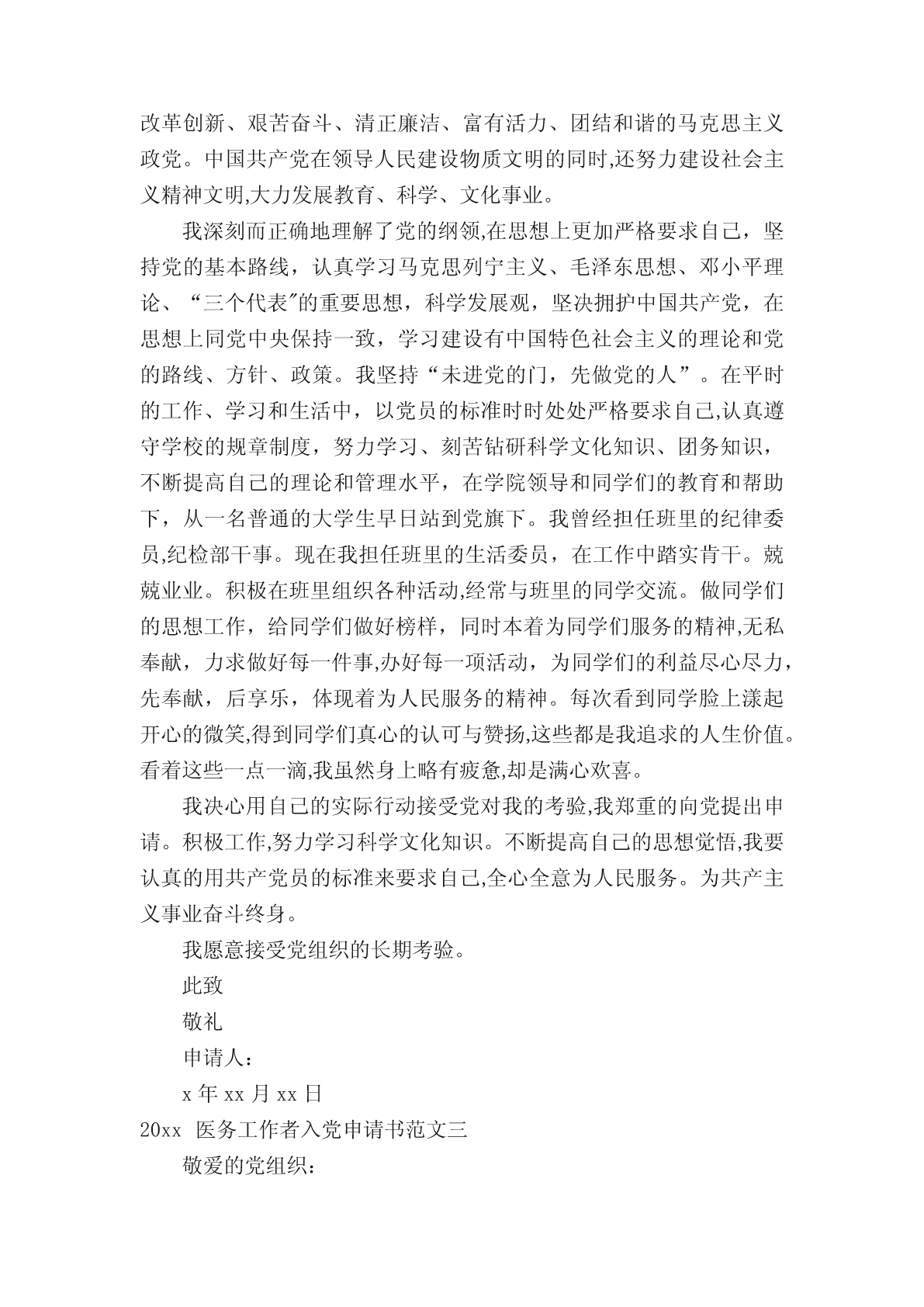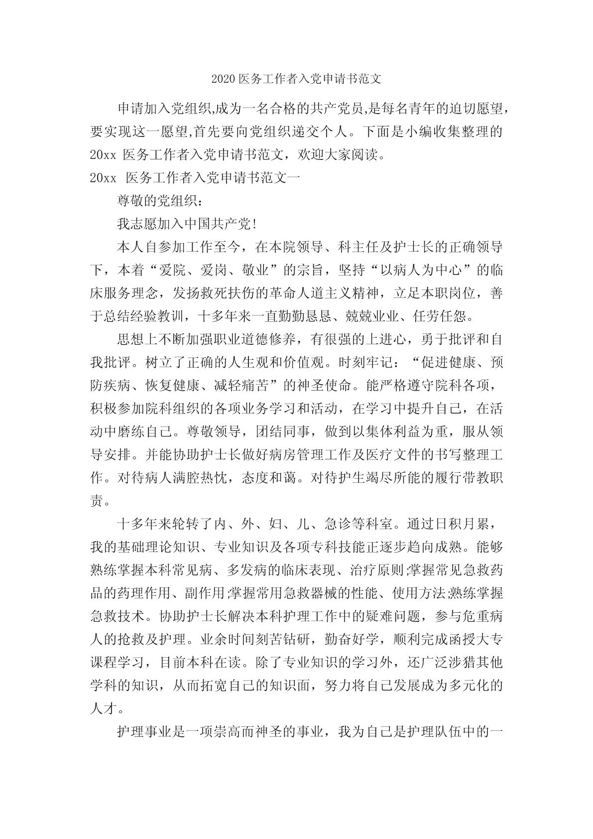 2020医务工作者入党申请书范文申请加入党组织,成为一名合格的共产党员,是每名青年的迫切愿望,要实现这一愿望,首先要向党组织递交个人。下面是小编收集整理的20xx医务工作者入党申请书范文,欢迎大家阅读。20xx医务工作者入党申请书范文一尊敬的党组织:我志愿加入中国共产党!本人自参加工作至今,在本院领导、科主任及护士长的正确领导下,本着“爱院、爱岗、敬业”的宗旨,坚持“以病人为中心”的临床服务理念,发扬救死扶伤的革命人道主义精神,立足本职岗位,善于总结经验教训,十多年来一直勤勤恳恳、兢兢业业、任劳任怨。思想上不断加强职业道德修养,有很强的上进心,勇于批评和自我批评。树立了正确的人生观和价值观。时刻牢记:“促进健康、预防疾病、恢复健康、减轻痛苦”的神圣使命。能严格遵守院科各项,积极参加院科组织的各项业务学习和活动,在学习中提升自己,在活动中磨练自己。尊敬领导,团结同事,做到以集体利益为重,服从领导安排。并能协助护士长做好病房管理工作及医疗文件的书写整理工作。对待病人满腔热忱,态度和蔼。对待护生竭尽所能的履行带教职责。十多年来轮转了内、外、妇、儿、急诊等科室。通过日积月累,我的基础理论知识、专业知识及各项专科技能正逐步趋向成熟。能够熟练掌握本科常见病、多发病的临床表现、治疗原则;掌握常见急救药品的药理作用、副作用;掌握常用急救器械的性能、使用方法;熟练掌握急救技术。协助护士长解决本科护理工作中的疑难问题,参与危重病人的抢救及护理。业余时间刻苦钻研,勤奋好学,顺利完成函授大专课程学习,目前本科在读。除了专业知识的学习外,还广泛涉猎其他学科的知识,从而拓宽自己的知识面,努力将自己发展成为多元化的人才。护理事业是一项崇高而神圣的事业,我为自己是护理队伍中的一员而自豪。在今后的工作生涯中,我将加倍努力,戒骄戒躁,勤奋扎实工作,不断更新知识面,苦练基本功,提高自己的知识水平和实际操作能力。并将终生以南丁格尔为榜样,用一颗仁慈、真诚的心灵,服务于广大患者。请党组织在实践中考验我!此致敬礼申请人:x年xx月xx日20xx医务工作者入党申请书范文二尊敬的党组织:我怀着无比诚挚的心情,向党组织提出入党申请书,我申请加入中国共产党,因为在我这二十多年的人生历程中,使我逐步认识到:中国共产党是伟大、光荣、正确的党,使中国工人阶级先锋队,使中国各族人民利益的忠实代表。是中国社会主义事业的领导核心。我将认真履行党章上所要求的一切,严格要求自己,接受党组织和同志们的监督,严于律己、勤奋进取,努力作一名合格而且先进的共产党员,为党的事业、为我国的社会主义向现代化事业贡献我毕生的精力和热血。中国共产党以马克思列宁主义、毛泽东思想作为自己的行动指南。马克思列宁主义揭示了人类社会发展的普遍规律,分析了资本主义制度本身无法克服的固有矛盾,指出社会主义必将代替资本主义,共产主义必将在全人类实现。毛泽东思想是马克思列宁主义普遍真理与中国革命具体实践相结合的产物,是中国共产党集体智慧的结晶,是被实践证明了的关于中国革命和建设的正确的理论原则和经验的总结。中国共产党是工人阶级的先锋队,同时是中华民族的先锋队,是中国特色社会主义事业的领导核心,代表中国先进生产力的发展要求,代表中国先进文化的前进方向,代表中国最广大人民的根本利益。党的最高理想和最终目标是实现共产主义,党的根本宗旨和唯一宗旨是全心全意为人民服务。中国共产党是立党为公、执政为民、求真务实、改革创新、艰苦奋斗、清正廉洁、富有活力、团结和谐的马克思主义政党。中国共产党在领导人民建设物质文明的同时,还努力建设社会主义精神文明,大力发展教育、科学、文化事业。我深刻而正确地理解了党的纲领,在思想上更加严格要求自己,坚持党的基本路线,认真学习马克思列宁主义、毛泽东思想、邓小平理论、“三个代表"的重要思想,科学发展观,坚决拥护中国共产党,在思想上同党中央保持一致,学习建设有中国特色社会主义的理论和党的路线、方针、政策。我坚持“未进党的门,先做党的人”。在平时的工作、学习和生活中,以党员的标准时时处处严格要求自己,认真遵守学校的规章制度,努力学习、刻苦钻研科学文化知识、团务知识,不断提高自己的理论和管理水平,在学院领导和同学们的教育和帮助下,从一名普通的大学生早日站到党旗下。我曾经担任班里的纪律委员,纪检部干事。现在我担任班里的生活委员,在工作中踏实肯干。兢兢业业。积极在班里组织各种活动,经常与班里的同学交流。做同学们的思想工作,给同学们做好榜样,同时本着为同学们服务的精神,无私奉献,力求做好每一件事,办好每一项活动,为同学们的利益尽心尽力,先奉献,后享乐,体现着为人民服务的精神。每次看到同学脸上漾起开心的微笑,得到同学们真心的认可与赞扬,这些都是我追求的人生价值。看着这些一点一滴,我虽然身上略有疲惫,却是满心欢喜。我决心用自己的实
