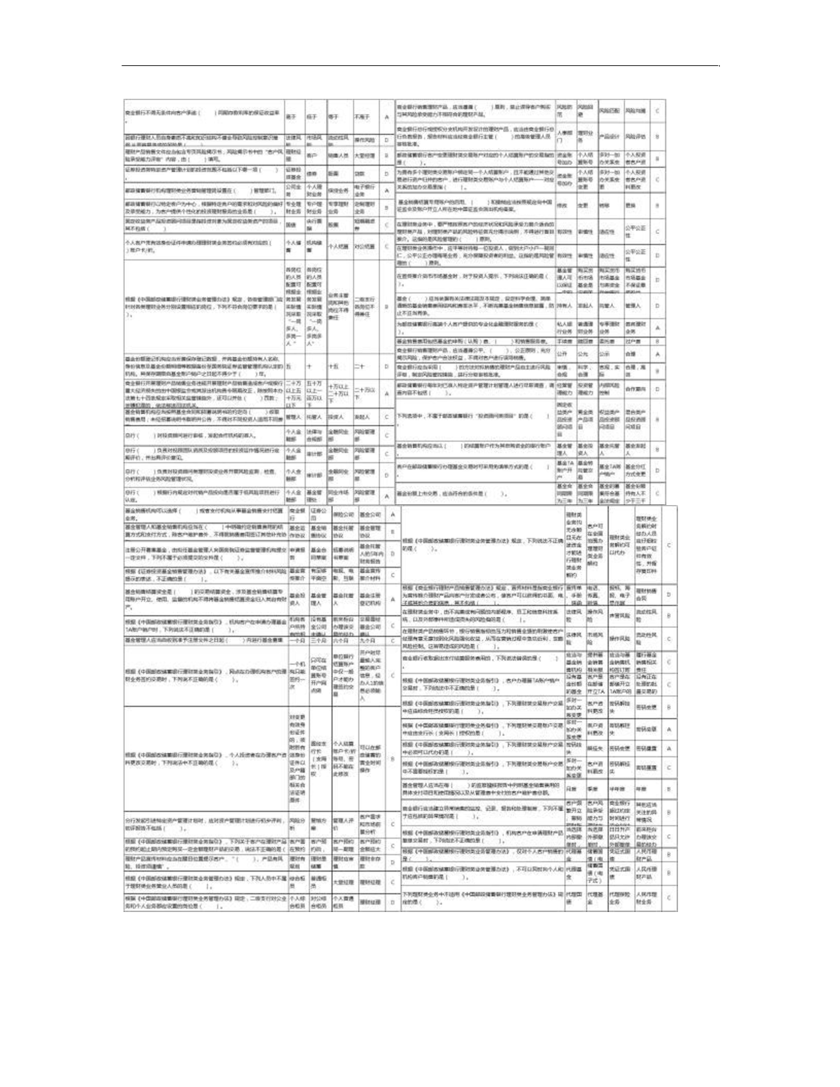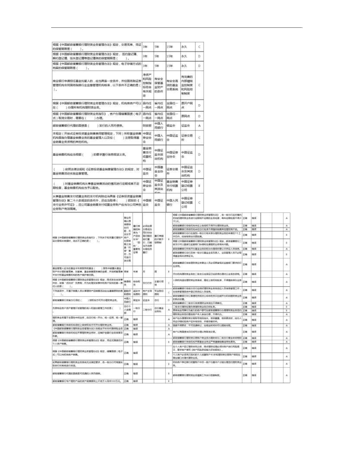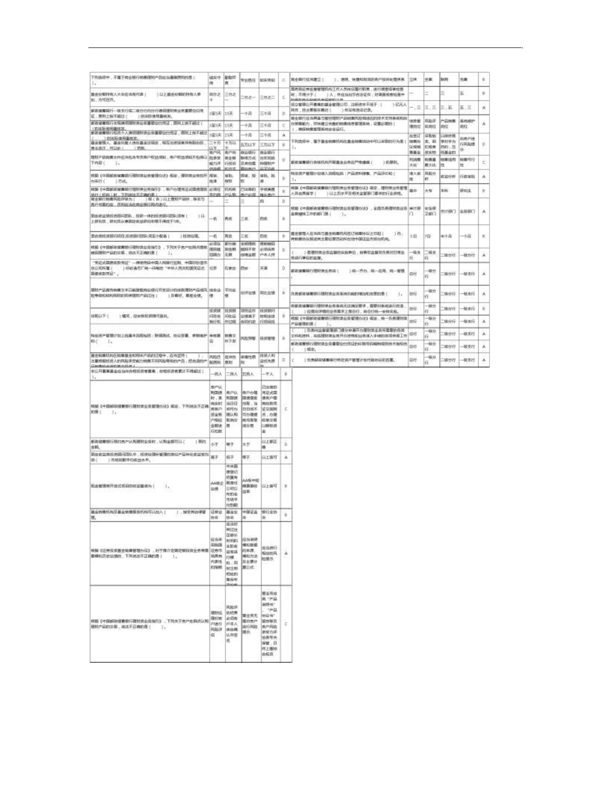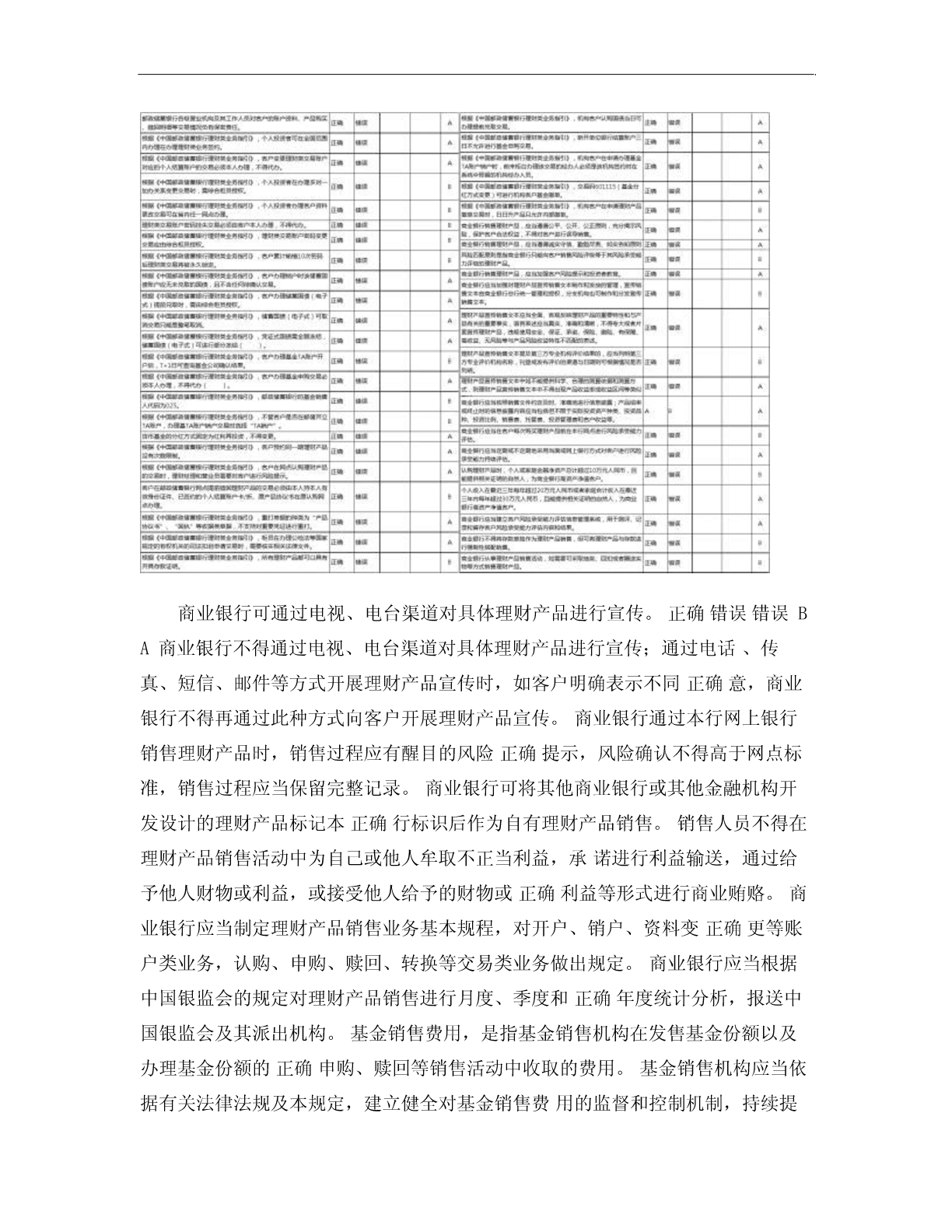商业银行可通过电视、电台渠道对具体理财产品进行宣传。正确错误错误BA商业银行不得通过电视、电台渠道对具体理财产品进行宣传;通过电话、传真、短信、邮件等方式开展理财产品宣传时,如客户明确表示不同正确意,商业银行不得再通过此种方式向客户开展理财产品宣传。商业银行通过本行网上银行销售理财产品时,销售过程应有醒目的风险正确提示,风险确认不得高于网点标准,销售过程应当保留完整记录。商业银行可将其他商业银行或其他金融机构开发设计的理财产品标记本正确行标识后作为自有理财产品销售。销售人员不得在理财产品销售活动中为自己或他人牟取不正当利益,承诺进行利益输送,通过给予他人财物或利益,或接受他人给予的财物或正确利益等形式进行商业贿赂。商业银行应当制定理财产品销售业务基本规程,对开户、销户、资料变正确更等账户类业务,认购、申购、赎回、转换等交易类业务做出规定。商业银行应当根据中国银监会的规定对理财产品销售进行月度、季度和正确年度统计分析,报送中国银监会及其派出机构。基金销售费用,是指基金销售机构在发售基金份额以及办理基金份额的正确申购、赎回等销售活动中收取的费用。基金销售机构应当依据有关法律法规及本规定,建立健全对基金销售费用的监督和控制机制,持续提高对基金投资人的服务质量,保证公平、正确有序、规范地开展基金销售业务。认购费和申购费采用在基金份额发售或者申购时收取的前端收费方式,正确不可以采用在赎回时从赎回金额中扣除的后端收费方式。基金管理人应当在基金合同、招募说明书中约定收取销售服务费的,对持续持有期少于60日的投资人收取不低于0.5%的赎回费,并将上述赎正确回费全额计入基金财产。基金管理人不收取销售服务费的,对持续持有期少于3个月的投资人收取不低于0.5%的赎回费,并将不低于赎回费总额的75%计入基金财产正确。基金管理人不收取销售服务费的,对持续持有期长于3个月但少于6个月的投资人收取不低于0.5%的赎回费,并将不低于赎回费总额的50%正确计入基金财产。基金管理人不收取销售服务费的,对持续持有期长于6个月的投资人,正确应当将不低于赎回费总额的25%计入基金财产。基金管理人不得从基金财产中计提一定的销售服务费,专门用于基金的正确销售与基金持有人的服务。基金管理人与基金销售机构应在基金销售协议及其补充协议中约定,双方在申购(认购)费、赎回费、销售服务费等销售费用的分成比例,并正确据此就各自实际取得的销售费用确认基金销售收入,如实核算、记账,依法纳税。基金管理人不得向销售机构支付非以销售基金的保有量为基础的客户维正确护费,不得在基金销售协议之外支付或变相支付销售佣金或报酬奖励。基金管理人应当在招募说明书及基金份额发售公告中载明中国证监会规正确定的其他有关基金销售费用的信息事项。“投资顾问类项目”,是指人民币理财业务中需要聘请专业机构担任投资顾问的项目,包括固定收益类产品投资顾问项目、权益类产品投资顾正确问项目及混合类产品投资顾问项目。固定收益类投资顾问团队中,投资顾问提供的预期收益水平可以低于本正确行制定的相应业绩基准。错误错误BB错误A错误错误错误AAB错误A错误B错误B错误A错误A错误错误AB错误A错误错误AA错误A错误B固定收益类投资顾问团队中,投资经理从事固定收益投资或研究的年限正确不得低于8年,担任投资经理的年限不得低于5年。混合类产品投资顾问项目投资对象包括固定收益类资产,但不包括权益正确类资产的项目。混合类投资顾问项目投资顾问团队,担任储备投资经理的人员从事固定收益类/权益类投资或研究的年限不得低于5年。混合类投资顾问项目投资顾问团队,同一名投资经理可以从事两种类型(固定收益类和权益类)的投资。混合类投资顾问项目投资顾问团队,投研一体的团队须同时具备固定收益类及权益类研究员。正确正确正确错误错误错误错误错误错误错误错误错误错误错误错误错误错误错误错误错误错误错误错误错误错误错误错误错误错误ABABAAABAABAABAABABAABBABA混合类投资顾问项目投资顾问团队须制定明确的投资组合警戒线及平仓正确线,警戒线不得低于净值的95%,平仓线不得低于净值的90%。可担任投资顾问的机构包括但不限于在国内依法成立的商业银行、证券正确公司、基金公司、资产管理公司及投资管理公司等。可以聘用无明确研究支持来源的投资顾问,担任权益类投资顾问项目。正确权益类产品投资顾问项目的投资对象为:股票、股票型基金等权益类资正确产的项目。权益类投资顾问项目投资顾问团队须制定明确的投资组合警戒线及平仓正确线。权益类投资顾问项目投资顾问团队中,任何人均可担任储备投资经理。正确权益类投资顾问项目中,投研一体的团队须有两名以上研究员,研究员正确从事权益类投资研究年限不得低于5年。收益型开放式项目以资金成本加成100个以上基点作为该类产品的业绩正确基准。项目运作期间,总行