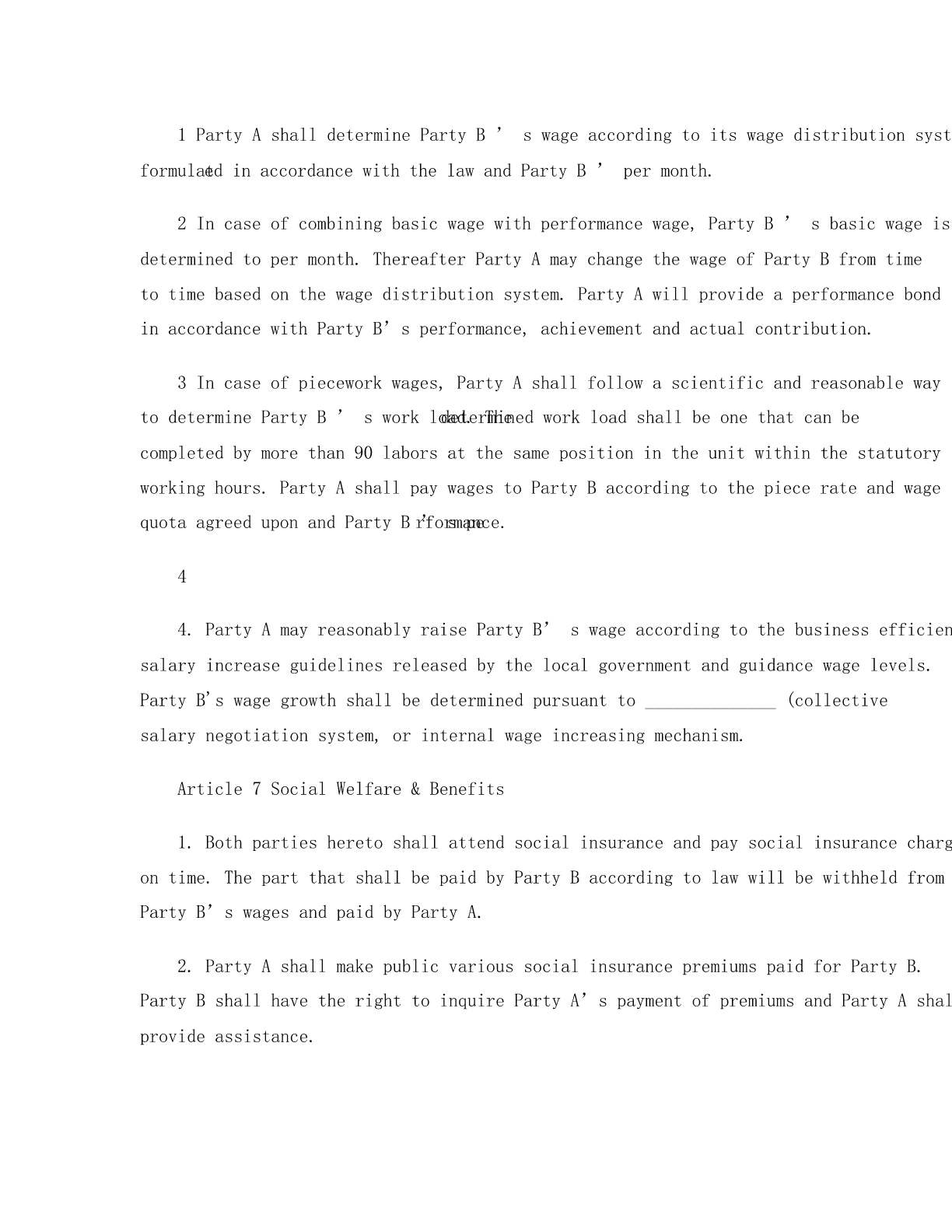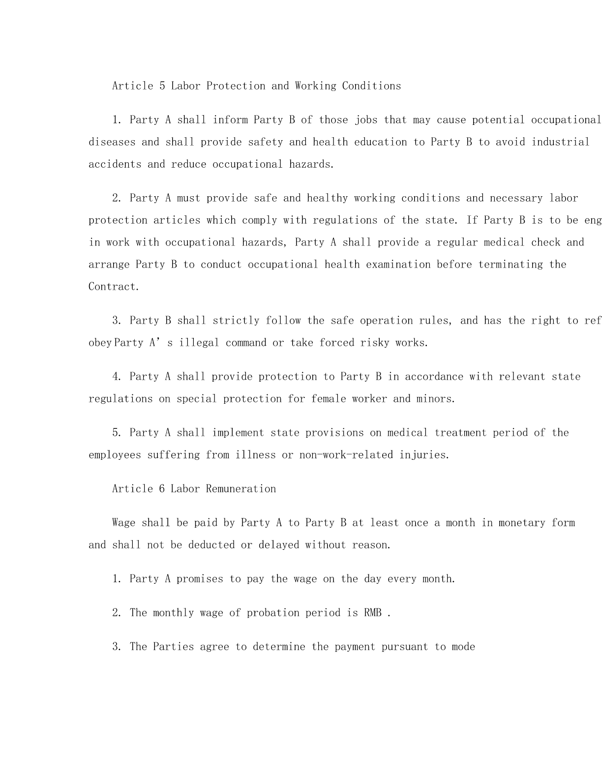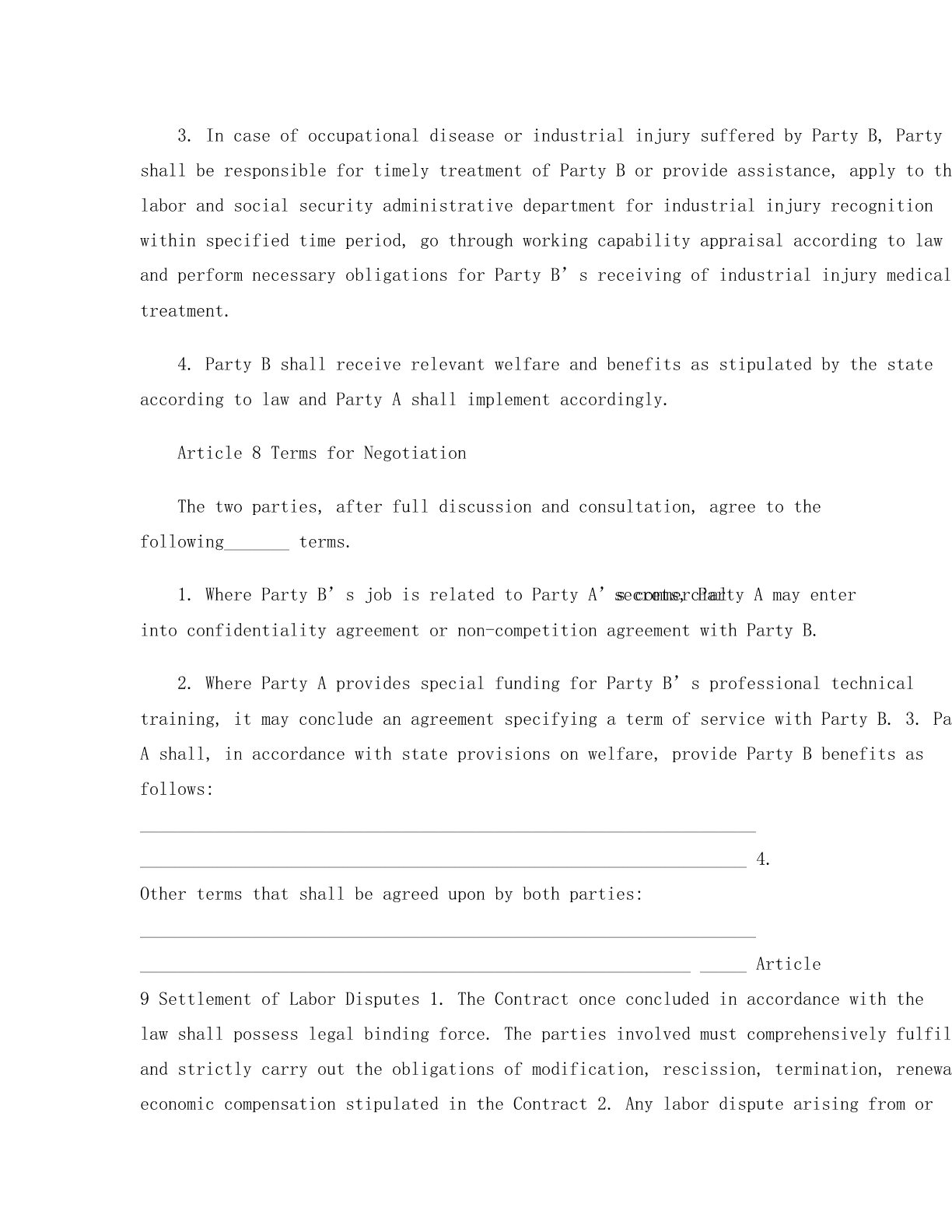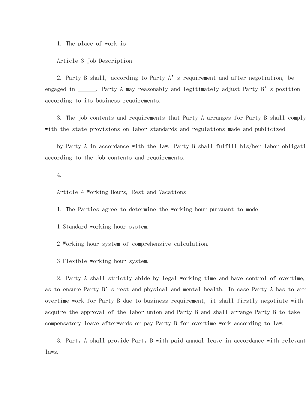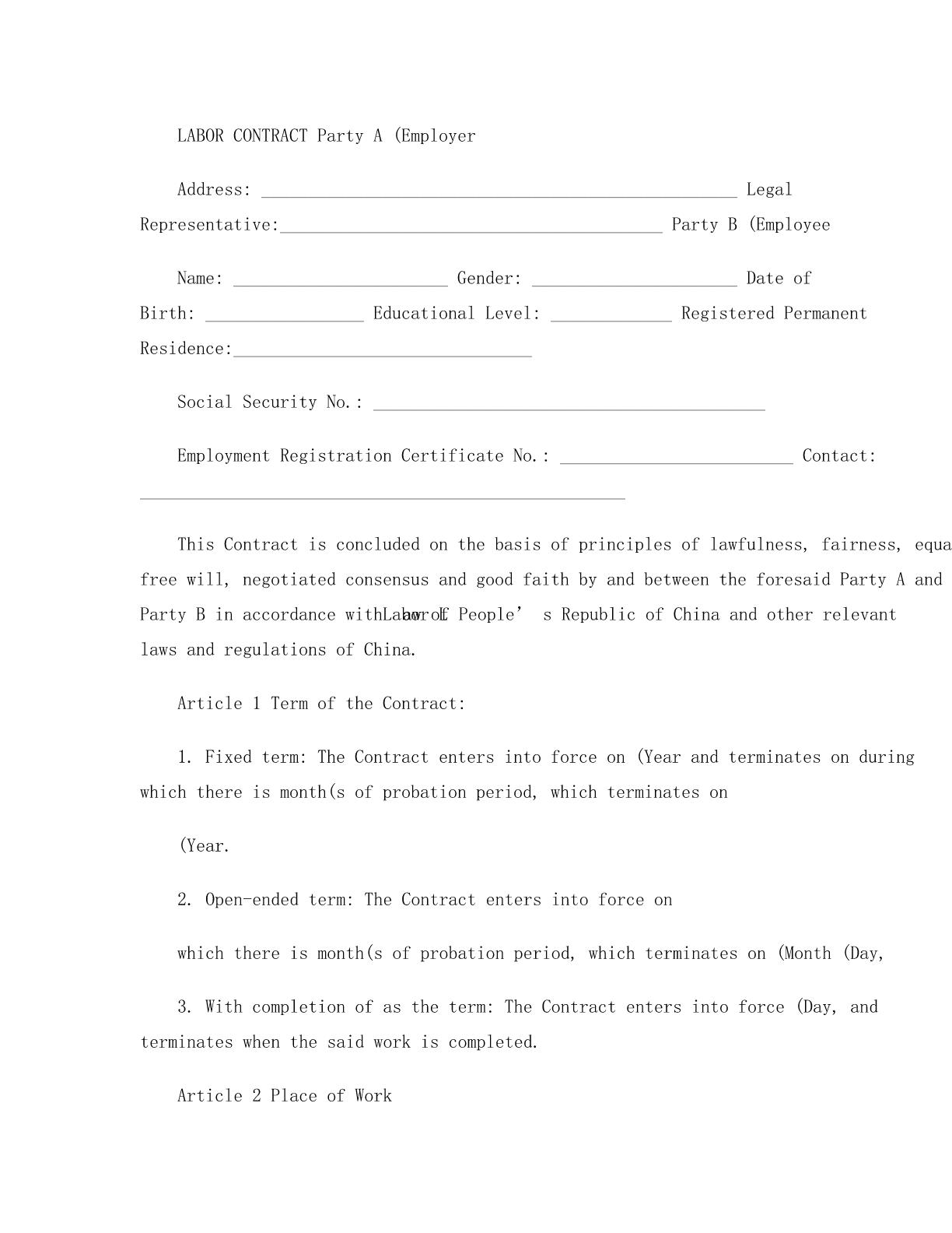 LABORCONTRACTPartyA(EmployerAddress:___________________________________________________LegalRepresentative:_________________________________________PartyB(EmployeeName:_______________________Gender:______________________DateofBirth:_________________EducationalLevel:_____________RegisteredPermanentResidence:________________________________SocialSecurityNo.:__________________________________________EmploymentRegistrationCertificateNo.:_________________________Contact:____________________________________________________ThisContractisconcludedonthebasisofprinciplesoflawfulness,fairness,equality,freewill,negotiatedconsensusandgoodfaithbyandbetweentheforesaidPartyAandPartyBinaccordancewithLaborawofLPeople’sRepublicofChinaandotherrelevantlawsandregulationsofChina.Article1TermoftheContract:1.Fixedterm:TheContractentersintoforceon(Yearandterminatesonduringwhichthereismonth(sofprobationperiod,whichterminateson(Year.2.Open-endedterm:TheContractentersintoforceonwhichthereismonth(sofprobationperiod,whichterminateson(Month(Day,3.Withcompletionofastheterm:TheContractentersintoforce(Day,andterminateswhenthesaidworkiscompleted.Article2PlaceofWork1.TheplaceofworkisArticle3JobDescription2.PartyBshall,accordingtoPartyA’srequirementandafternegotiation,beengagedin______.PartyAmayreasonablyandlegitimatelyadjustPartyB’spositionaccordingtoitsbusinessrequirements.3.ThejobcontentsandrequirementsthatPartyAarrangesforPartyBshallcomplywiththestateprovisionsonlaborstandardsandregulationsmadeandpublicizedbyPartyAinaccordancewiththelaw.PartyBshallfulfillhis/herlaborobligationsaccordingtothejobcontentsandrequirements.4.Article4WorkingHours,RestandVacations1.ThePartiesagreetodeterminetheworkinghourpursuanttomode1Standardworkinghoursystem.2Workinghoursystemofcomprehensivecalculation.3Flexibleworkinghoursystem.2.PartyAshallstrictlyabidebylegalworkingtimeandhavecontrolofovertime,soastoensurePartyB’srestandphysicalandmentalhealth.IncasePartyAhastoarrangeovertimeworkforPartyBduetobusinessrequirement,itsha
