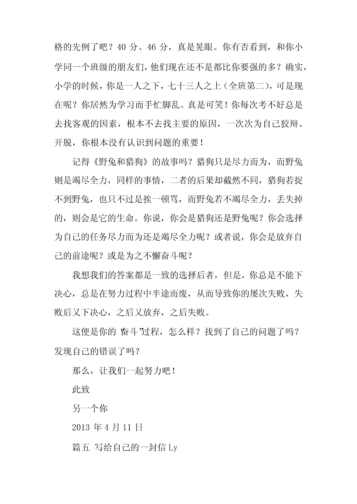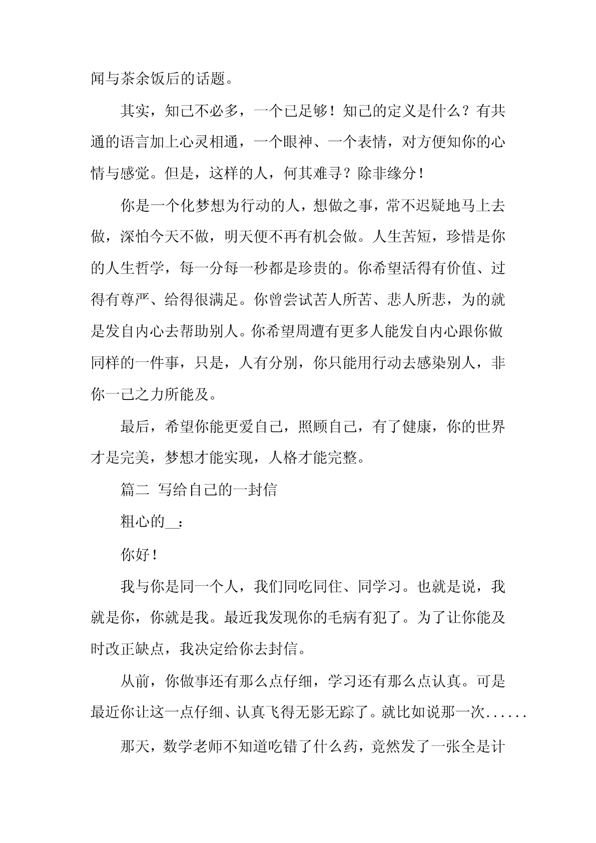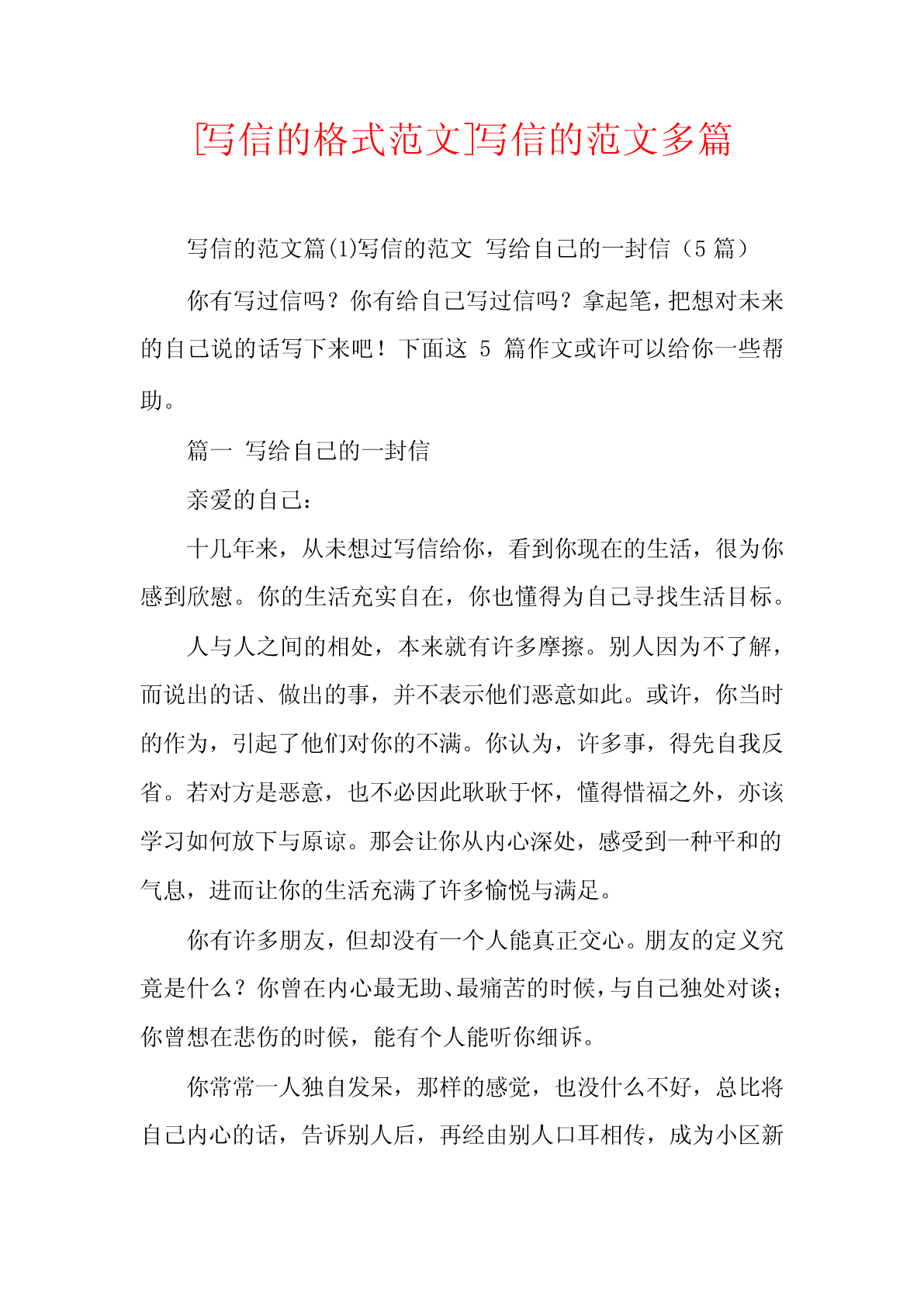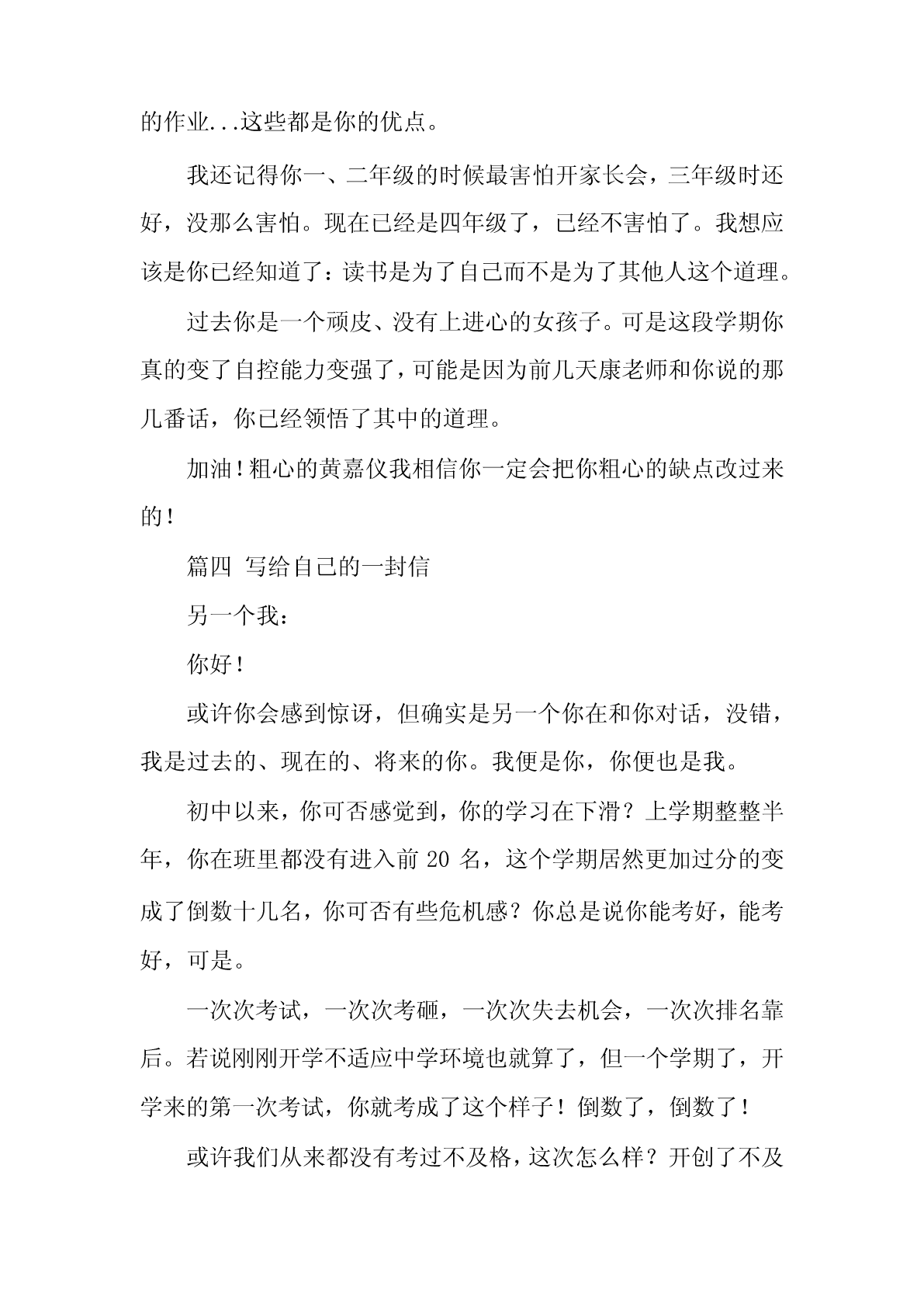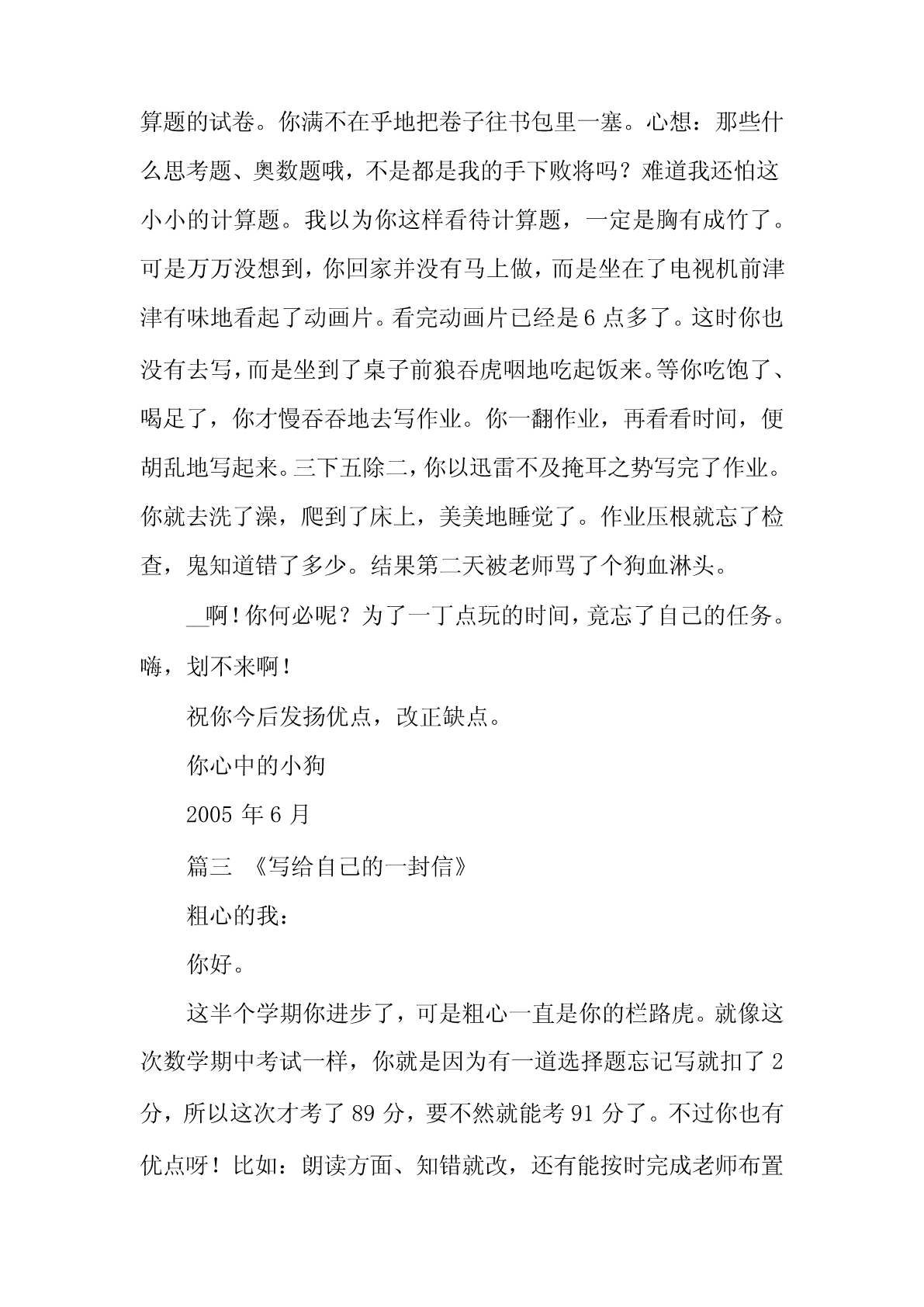 [写信的格式范文]写信的范文多篇写信的范文篇(1):写信的范文写给自己的一封信(5篇)你有写过信吗?你有给自己写过信吗?拿起笔,把想对未来的自己说的话写下来吧!下面这5篇作文或许可以给你一些帮助。篇一写给自己的一封信亲爱的自己:十几年来,从未想过写信给你,看到你现在的生活,很为你感到欣慰。你的生活充实自在,你也懂得为自己寻找生活目标。人与人之间的相处,本来就有许多摩擦。别人因为不了解,而说出的话、做出的事,并不表示他们恶意如此。或许,你当时的作为,引起了他们对你的不满。你认为,许多事,得先自我反省。若对方是恶意,也不必因此耿耿于怀,懂得惜福之外,亦该学习如何放下与原谅。那会让你从内心深处,感受到一种平和的气息,进而让你的生活充满了许多愉悦与满足。你有许多朋友,但却没有一个人能真正交心。朋友的定义究竟是什么?你曾在内心最无助、最痛苦的时候,与自己独处对谈;你曾想在悲伤的时候,能有个人能听你细诉。你常常一人独自发呆,那样的感觉,也没什么不好,总比将自己内心的话,告诉别人后,再经由别人口耳相传,成为小区新闻与茶余饭后的话题。其实,知己不必多,一个已足够!知己的定义是什么?有共通的语言加上心灵相通,一个眼神、一个表情,对方便知你的心情与感觉。但是,这样的人,何其难寻?除非缘分!你是一个化梦想为行动的人,想做之事,常不迟疑地马上去做,深怕今天不做,明天便不再有机会做。人生苦短,珍惜是你的人生哲学,每一分每一秒都是珍贵的。你希望活得有价值、过得有尊严、给得很满足。你曾尝试苦人所苦、悲人所悲,为的就是发自内心去帮助别人。你希望周遭有更多人能发自内心跟你做同样的一件事,只是,人有分别,你只能用行动去感染别人,非你一己之力所能及。最后,希望你能更爱自己,照顾自己,有了健康,你的世界才是完美,梦想才能实现,人格才能完整。篇二写给自己的一封信粗心的__:你好!我与你是同一个人,我们同吃同住、同学习。也就是说,我就是你,你就是我。最近我发现你的毛病有犯了。为了让你能及时改正缺点,我决定给你去封信。从前,你做事还有那么点仔细,学习还有那么点认真。可是最近你让这一点仔细、认真飞得无影无踪了。就比如说那一次......那天,数学老师不知道吃错了什么药,竟然发了一张全是计算题的试卷。你满不在乎地把卷子往书包里一塞。心想:那些什么思考题、奥数题哦,不是都是我的手下败将吗?难道我还怕这小小的计算题。我以为你这样看待计算题,一定是胸有成竹了。可是万万没想到,你回家并没有马上做,而是坐在了电视机前津津有味地看起了动画片。看完动画片已经是6点多了。这时你也没有去写,而是坐到了桌子前狼吞虎咽地吃起饭来。等你吃饱了、喝足了,你才慢吞吞地去写作业。你一翻作业,再看看时间,便胡乱地写起来。三下五除二,你以迅雷不及掩耳之势写完了作业。你就去洗了澡,爬到了床上,美美地睡觉了。作业压根就忘了检查,鬼知道错了多少。结果第二天被老师骂了个狗血淋头。__啊!你何必呢?为了一丁点玩的时间,竟忘了自己的任务。嗨,划不来啊!祝你今后发扬优点,改正缺点。你心中的小狗2005年6月篇三《写给自己的一封信》粗心的我:你好。这半个学期你进步了,可是粗心一直是你的栏路虎。就像这次数学期中考试一样,你就是因为有一道选择题忘记写就扣了2分,所以这次才考了89分,要不然就能考91分了。不过你也有优点呀!比如:朗读方面、知错就改,还有能按时完成老师布置的作业......这些都是你的优点。我还记得你一、二年级的时候最害怕开家长会,三年级时还好,没那么害怕。现在已经是四年级了,已经不害怕了。我想应该是你已经知道了:读书是为了自己而不是为了其他人这个道理。过去你是一个顽皮、没有上进心的女孩子。可是这段学期你真的变了自控能力变强了,可能是因为前几天康老师和你说的那几番话,你已经领悟了其中的道理。加油!粗心的黄嘉仪我相信你一定会把你粗心的缺点改过来的!篇四写给自己的一封信另一个我:你好!或许你会感到惊讶,但确实是另一个你在和你对话,没错,我是过去的、现在的、将来的你。我便是你,你便也是我。初中以来,你可否感觉到,你的学习在下滑?上学期整整半年,你在班里都没有进入前20名,这个学期居然更加过分的变成了倒数十几名,你可否有些危机感?你总是说你能考好,能考好,可是。一次次考试,一次次考砸,一次次失去机会,一次次排名靠后。若说刚刚开学不适应中学环境也就算了,但一个学期了,开学来的第一次考试,你就考成了这个样子!倒数了,倒数了!或许我们从来都没有考过不及格,这次怎么样?开创了不及格的先例了吧?40分、46分,真是晃眼。你有否看到,和你小学同一个班级的朋友们,他们现在还不是都比你要强的多?确实,小学的时候,你是一人之下,七十三人之上(全班第二),可是现在呢?你居然为学习而手忙脚乱。真是可笑!你每次考不好总是去找客观的因素,根本不去找