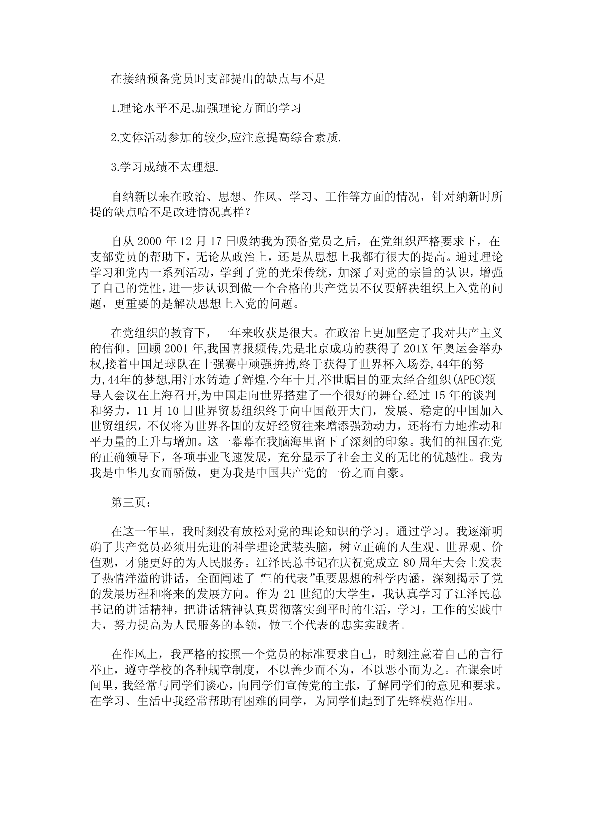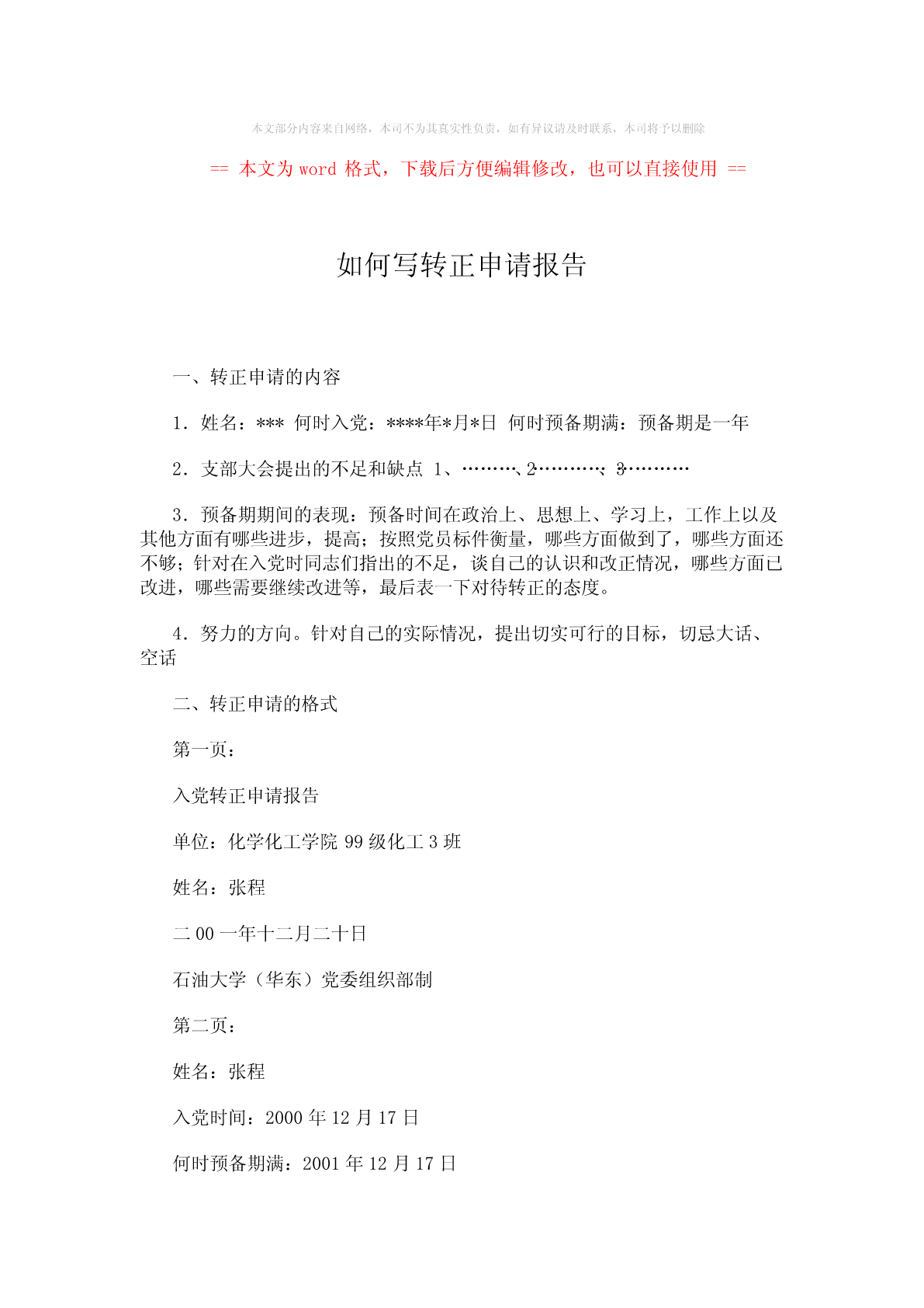 本文部分内容来自网络,本司不为其真实性负责,如有异议请及时联系,本司将予以删除==本文为word格式,下载后方便编辑修改,也可以直接使用==如何写转正申请报告一、转正申请的内容1.姓名:***何时入党:****年*月*日何时预备期满:预备期是一年2.支部大会提出的不足和缺点1、………、2…………、…………33.预备期期间的表现:预备时间在政治上、思想上、学习上,工作上以及其他方面有哪些进步,提高;按照党员标件衡量,哪些方面做到了,哪些方面还不够;针对在入党时同志们指出的不足,谈自己的认识和改正情况,哪些方面已改进,哪些需要继续改进等,最后表一下对待转正的态度。4.努力的方向。针对自己的实际情况,提出切实可行的目标,切忌大话、空话二、转正申请的格式第一页:入党转正申请报告单位:化学化工学院99级化工3班姓名:张程二00一年十二月二十日石油大学(华东)党委组织部制第二页:姓名:张程入党时间:2000年12月17日何时预备期满:2001年12月17日在接纳预备党员时支部提出的缺点与不足1.理论水平不足,加强理论方面的学习2.文体活动参加的较少,应注意提高综合素质.3.学习成绩不太理想.自纳新以来在政治、思想、作风、学习、工作等方面的情况,针对纳新时所提的缺点哈不足改进情况真样?自从2000年12月17日吸纳我为预备党员之后,在党组织严格要求下,在支部党员的帮助下,无论从政治上,还是从思想上我都有很大的提高。通过理论学习和党内一系列活动,学到了党的光荣传统,加深了对党的宗旨的认识,增强了自己的党性,进一步认识到做一个合格的共产党员不仅要解决组织上入党的问题,更重要的是解决思想上入党的问题。在党组织的教育下,一年来收获是很大。在政治上更加坚定了我对共产主义的信仰。回顾2001年,我国喜报频传,先是北京成功的获得了201X年奥运会举办权,接着中国足球队在十强赛中顽强拚搏,终于获得了世界杯入场券,44年的努力,44年的梦想,用汗水铸造了辉煌.今年十月,举世瞩目的亚太经合组织(APEC)领导人会议在上海召开,为中国走向世界搭建了一个很好的舞台.经过15年的谈判和努力,11月10日世界贸易组织终于向中国敞开大门,发展、稳定的中国加入世贸组织,不仅将为世界各国的友好经贸往来增添强劲动力,还将有力地推动和平力量的上升与增加。这一幕幕在我脑海里留下了深刻的印象。我们的祖国在党的正确领导下,各项事业飞速发展,充分显示了社会主义的无比的优越性。我为我是中华儿女而骄傲,更为我是中国共产党的一份之而自豪。第三页:在这一年里,我时刻没有放松对党的理论知识的学习。通过学习。我逐渐明确了共产党员必须用先进的科学理论武装头脑,树立正确的人生观、世界观、价值观,才能更好的为人民服务。江泽民总书记在庆祝党成立80周年大会上发表了热情洋溢的讲话,全面阐述了“三的代表”重要思想的科学内涵,深刻揭示了党的发展历程和将来的发展方向。作为21世纪的大学生,我认真学习了江泽民总书记的讲话精神,把讲话精神认真贯彻落实到平时的生活,学习,工作的实践中去,努力提高为人民服务的本领,做三个代表的忠实实践者。在作风上,我严格的按照一个党员的标准要求自己,时刻注意着自己的言行举止,遵守学校的各种规章制度,不以善少而不为,不以恶小而为之。在课余时间里,我经常与同学们谈心,向同学们宣传党的主张,了解同学们的意见和要求。在学习、生活中我经常帮助有困难的同学,为同学们起到了先锋模范作用。在过出的一年里,我刻苦学习,改变学习方法,在学习上取得了较大的进步,获得了二次二等学习奖学金,先后通过了全国计算机水平考试和英语水平四级考试。工作上,我认真负责,积极完成上级交给的各项工作。我曾先后担任99级学生会秘书长和院学生会秘书长等职务。二年多来的工作使我深刻认识到为人民服务的内涵。有一句话常记在我心中,那就是我是从同学们中间来的,我是普通同学中的一员,我是为大家服务的。工作不能用金钱来衡量,更不能用其他来交易,只能用心来体验。做好工作必须依靠同学,密切联系同学,只有与同学们抱成一团,才能攻无不克,战无不胜。由于工作表现突出,我获得了二次组织能力奖,被评为优秀学生干部和三好学生。在入党以前,自己认识到共产党员要全心全意为人民服务,但全心全意为人民服务如何在现实生活中体现出来并不十分清楚。特别是作为一个正在大学里学习的学生,就感到更难。入党后,经过一年党的教育我认识到全心全意为人民服务一定要与自己的现实生活紧密结合起来,对学生来说,在学习上,生活上要热情帮助同学,起到带头作用,与同学们多交流,在工作上要勇挑重担,认真完成各项工作,又热情和智慧为大家服务。在这一年的预备期里,我按着党员的要求作了一些工作,发挥了一个党员的作用。针对纳新时所提的缺点和不足,在党组织的帮助教育下。有的克服了,有的还须努力改正。在这一年里,