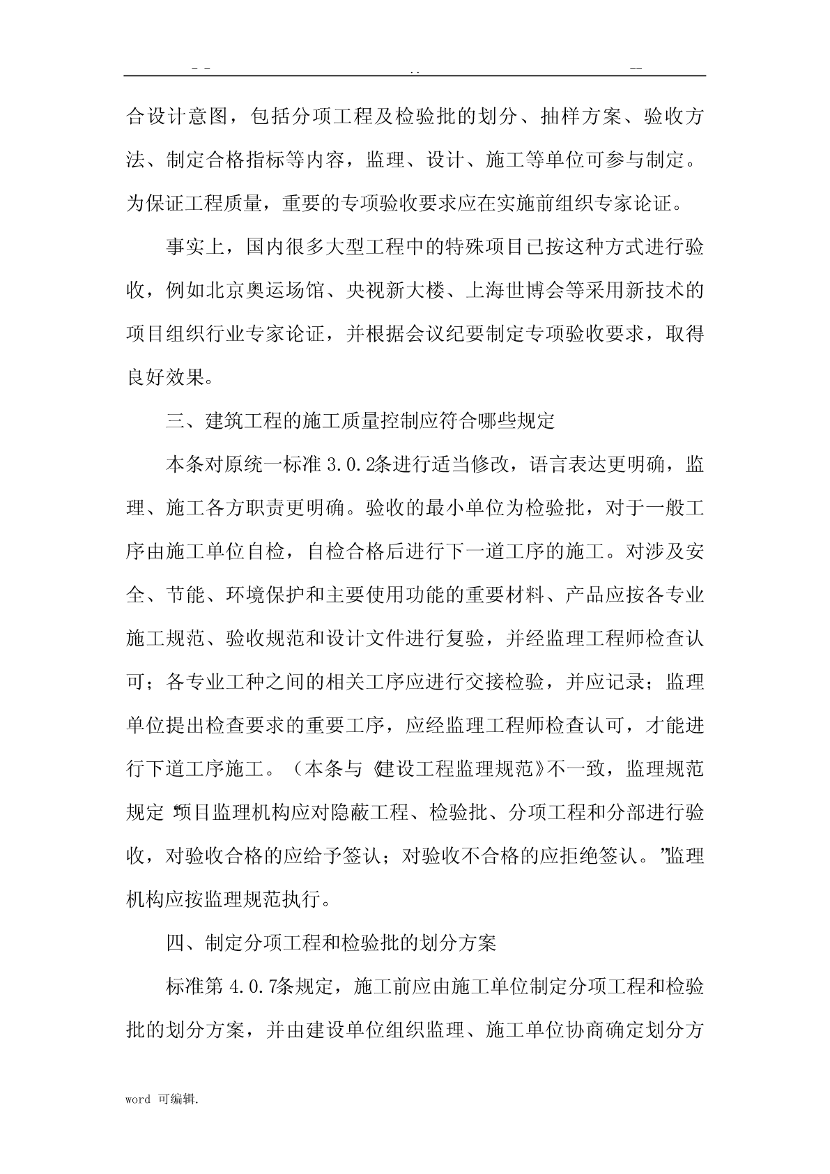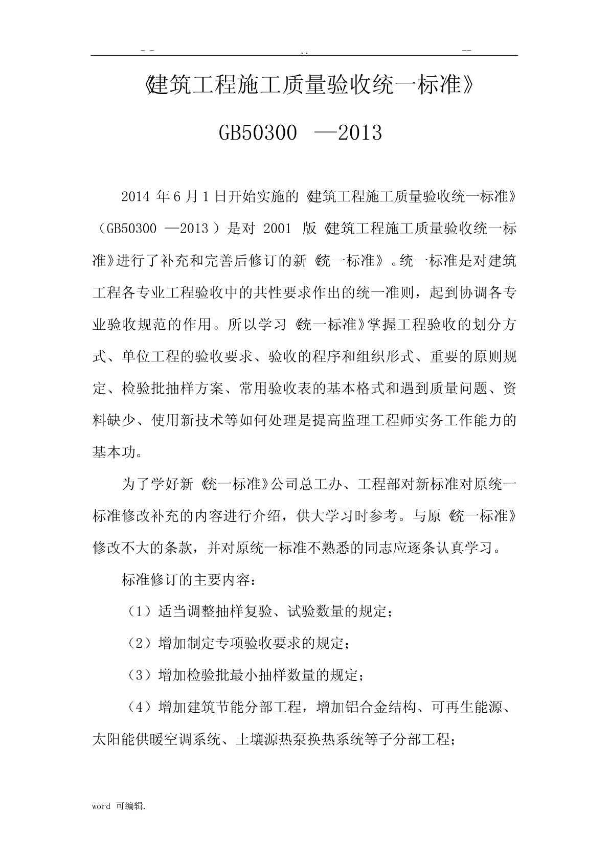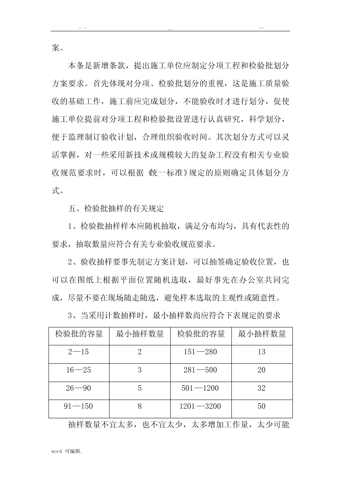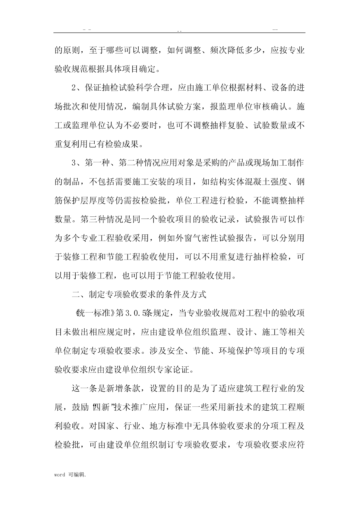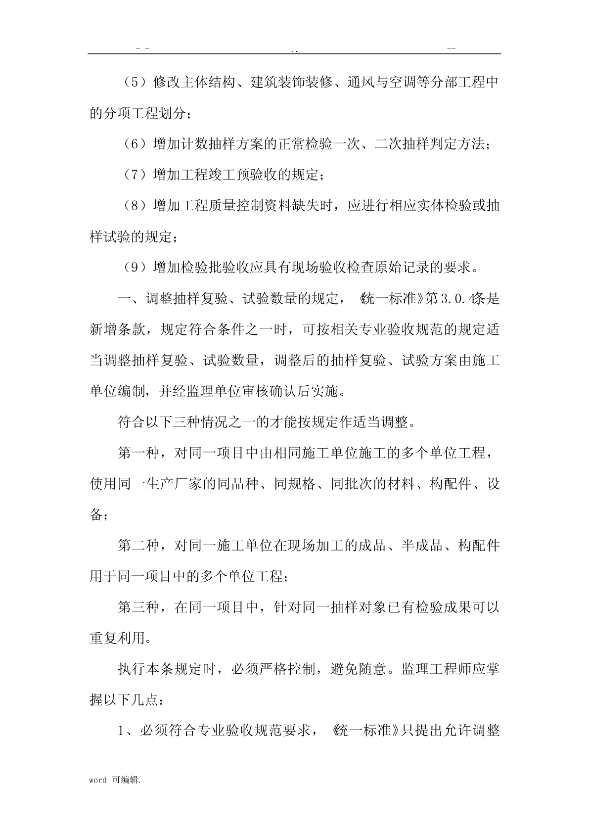 --..--《建筑工程施工质量验收统一标准》GB50300—20132014年6月1日开始实施的《建筑工程施工质量验收统一标准》(GB50300—2013)是对2001版《建筑工程施工质量验收统一标准》进行了补充和完善后修订的新《统一标准》。统一标准是对建筑工程各专业工程验收中的共性要求作出的统一准则,起到协调各专业验收规范的作用。所以学习《统一标准》掌握工程验收的划分方式、单位工程的验收要求、验收的程序和组织形式、重要的原则规定、检验批抽样方案、常用验收表的基本格式和遇到质量问题、资料缺少、使用新技术等如何处理是提高监理工程师实务工作能力的基本功。为了学好新《统一标准》公司总工办、工程部对新标准对原统一标准修改补充的内容进行介绍,供大学习时参考。与原《统一标准》修改不大的条款,并对原统一标准不熟悉的同志应逐条认真学习。标准修订的主要内容:(1)适当调整抽样复验、试验数量的规定;(2)增加制定专项验收要求的规定;(3)增加检验批最小抽样数量的规定;(4)增加建筑节能分部工程,增加铝合金结构、可再生能源、太阳能供暖空调系统、土壤源热泵换热系统等子分部工程;word可编辑.--..--(5)修改主体结构、建筑装饰装修、通风与空调等分部工程中的分项工程划分;(6)增加计数抽样方案的正常检验一次、二次抽样判定方法;(7)增加工程竣工预验收的规定;(8)增加工程质量控制资料缺失时,应进行相应实体检验或抽样试验的规定;(9)增加检验批验收应具有现场验收检查原始记录的要求。一、调整抽样复验、试验数量的规定,《统一标准》第3.0.4条是新增条款,规定符合条件之一时,可按相关专业验收规范的规定适当调整抽样复验、试验数量,调整后的抽样复验、试验方案由施工单位编制,并经监理单位审核确认后实施。符合以下三种情况之一的才能按规定作适当调整。第一种,对同一项目中由相同施工单位施工的多个单位工程,使用同一生产厂家的同品种、同规格、同批次的材料、构配件、设备;第二种,对同一施工单位在现场加工的成品、半成品、构配件用于同一项目中的多个单位工程;第三种,在同一项目中,针对同一抽样对象已有检验成果可以重复利用。执行本条规定时,必须严格控制,避免随意。监理工程师应掌握以下几点:1、必须符合专业验收规范要求,《统一标准》只提出允许调整word可编辑.--..--的原则,至于哪些可以调整,如何调整、频次降低多少,应按专业验收规范根据具体项目确定。2、保证抽检试验科学合理,应由施工单位根据材料、设备的进场批次和使用情况,编制具体试验方案,报监理单位审核确认。施工或监理单位认为不必要时,也可不调整抽样复验、试验数量或不重复利用已有检验成果。3、第一种、第二种情况应用对象是采购的产品或现场加工制作的制品,不包括需要施工安装的项目,如结构实体混凝土强度、钢筋保护层厚度等仍需按检验批,单位工程进行检验,不能调整抽样数量。第三种情况是同一个验收项目的验收记录,试验报告可以作为多个专业工程验收采用,例如外窗气密性试验报告,可以分别用于装修工程和节能工程验收使用,可以不用重复进行抽样检验,可以用于装修工程,也可以用于节能工程验收使用。二、制定专项验收要求的条件及方式《统一标准》第3.0.5条规定,当专业验收规范对工程中的验收项目未做出相应规定时,应由建设单位组织监理、设计、施工等相关单位制定专项验收要求。涉及安全、节能、环境保护等项目的专项验收要求应由建设单位组织专家论证。这一条是新增条款,设置的目的是为了适应建筑工程行业的发展,鼓励“四新”技术推广应用,保证一些采用新技术的建筑工程顺利验收。对国家、行业、地方标准中无具体验收要求的分项工程及检验批,可由建设单位组织制订专项验收要求,专项验收要求应符word可编辑.--..--合设计意图,包括分项工程及检验批的划分、抽样方案、验收方法、制定合格指标等内容,监理、设计、施工等单位可参与制定。为保证工程质量,重要的专项验收要求应在实施前组织专家论证。事实上,国内很多大型工程中的特殊项目已按这种方式进行验收,例如北京奥运场馆、央视新大楼、上海世博会等采用新技术的项目组织行业专家论证,并根据会议纪要制定专项验收要求,取得良好效果。三、建筑工程的施工质量控制应符合哪些规定本条对原统一标准3.0.2条进行适当修改,语言表达更明确,监理、施工各方职责更明确。验收的最小单位为检验批,对于一般工序由施工单位自检,自检合格后进行下一道工序的施工。对涉及安全、节能、环境保护和主要使用功能的重要材料、产品应按各专业施工规范、验收规范和设计文件进行复验,并经监理工程师检查认可;各专业工种之间的相关工序应进行交接检验,并应记录;监理单位提出检查要求的重要工序,应经监理工程师检查认可,才能进行下道工序施工。(本条与《建设工程监理规范》不一致,监理规范规定“项目监理机