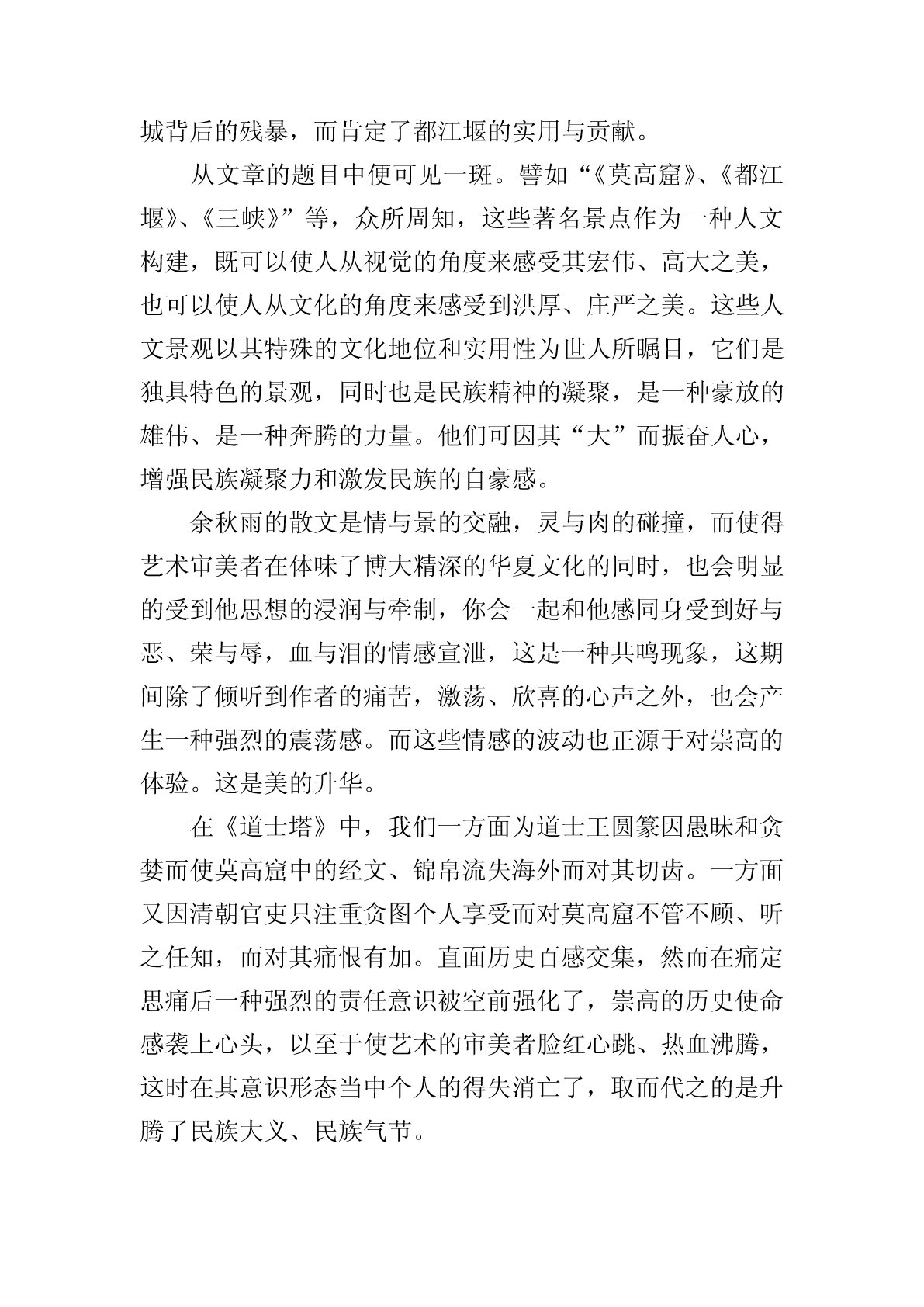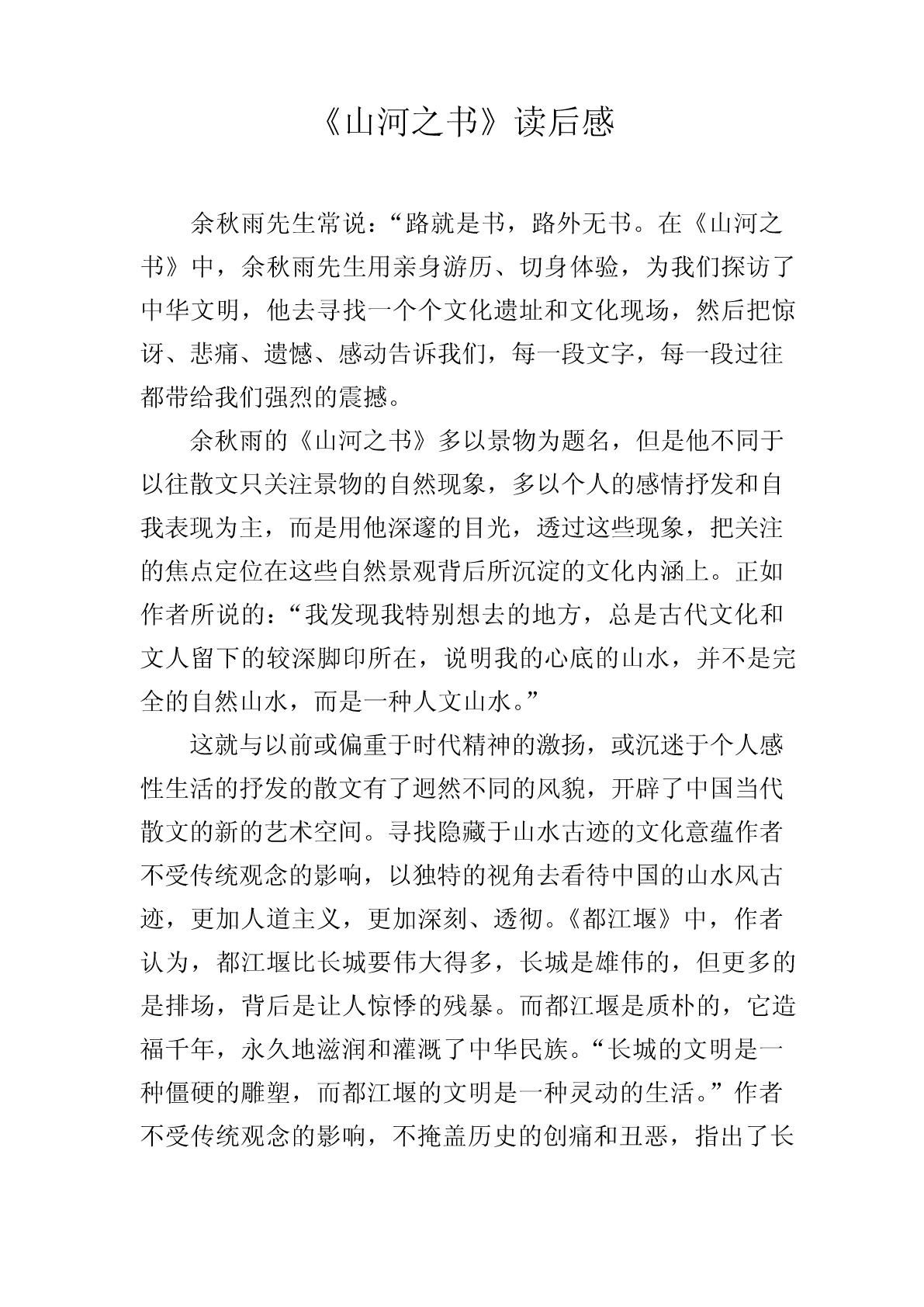 《山河之书》读后感余秋雨先生常说:“路就是书,路外无书。在《山河之书》中,余秋雨先生用亲身游历、切身体验,为我们探访了中华文明,他去寻找一个个文化遗址和文化现场,然后把惊讶、悲痛、遗憾、感动告诉我们,每一段文字,每一段过往都带给我们强烈的震撼。余秋雨的《山河之书》多以景物为题名,但是他不同于以往散文只关注景物的自然现象,多以个人的感情抒发和自我表现为主,而是用他深邃的目光,透过这些现象,把关注的焦点定位在这些自然景观背后所沉淀的文化内涵上。正如作者所说的:“我发现我特别想去的地方,总是古代文化和文人留下的较深脚印所在,说明我的心底的山水,并不是完全的自然山水,而是一种人文山水。”这就与以前或偏重于时代精神的激扬,或沉迷于个人感性生活的抒发的散文有了迥然不同的风貌,开辟了中国当代散文的新的艺术空间。寻找隐藏于山水古迹的文化意蕴作者不受传统观念的影响,以独特的视角去看待中国的山水风古迹,更加人道主义,更加深刻、透彻。《都江堰》中,作者认为,都江堰比长城要伟大得多,长城是雄伟的,但更多的是排场,背后是让人惊悸的残暴。而都江堰是质朴的,它造福千年,永久地滋润和灌溉了中华民族。“长城的文明是一种僵硬的雕塑,而都江堰的文明是一种灵动的生活。”作者不受传统观念的影响,不掩盖历史的创痛和丑恶,指出了长城背后的残暴,而肯定了都江堰的实用与贡献。从文章的题目中便可见一斑。譬如“《莫高窟》、《都江堰》、《三峡》”等,众所周知,这些著名景点作为一种人文构建,既可以使人从视觉的角度来感受其宏伟、高大之美,也可以使人从文化的角度来感受到洪厚、庄严之美。这些人文景观以其特殊的文化地位和实用性为世人所瞩目,它们是独具特色的景观,同时也是民族精神的凝聚,是一种豪放的雄伟、是一种奔腾的力量。他们可因其“大”而振奋人心,增强民族凝聚力和激发民族的自豪感。余秋雨的散文是情与景的交融,灵与肉的碰撞,而使得艺术审美者在体味了博大精深的华夏文化的同时,也会明显的受到他思想的浸润与牵制,你会一起和他感同身受到好与恶、荣与辱,血与泪的情感宣泄,这是一种共鸣现象,这期间除了倾听到作者的痛苦,激荡、欣喜的心声之外,也会产生一种强烈的震荡感。而这些情感的波动也正源于对崇高的体验。这是美的升华。在《道士塔》中,我们一方面为道士王圆篆因愚昧和贪婪而使莫高窟中的经文、锦帛流失海外而对其切齿。一方面又因清朝官吏只注重贪图个人享受而对莫高窟不管不顾、听之任知,而对其痛恨有加。直面历史百感交集,然而在痛定思痛后一种强烈的责任意识被空前强化了,崇高的历史使命感袭上心头,以至于使艺术的审美者脸红心跳、热血沸腾,这时在其意识形态当中个人的得失消亡了,取而代之的是升腾了民族大义、民族气节。