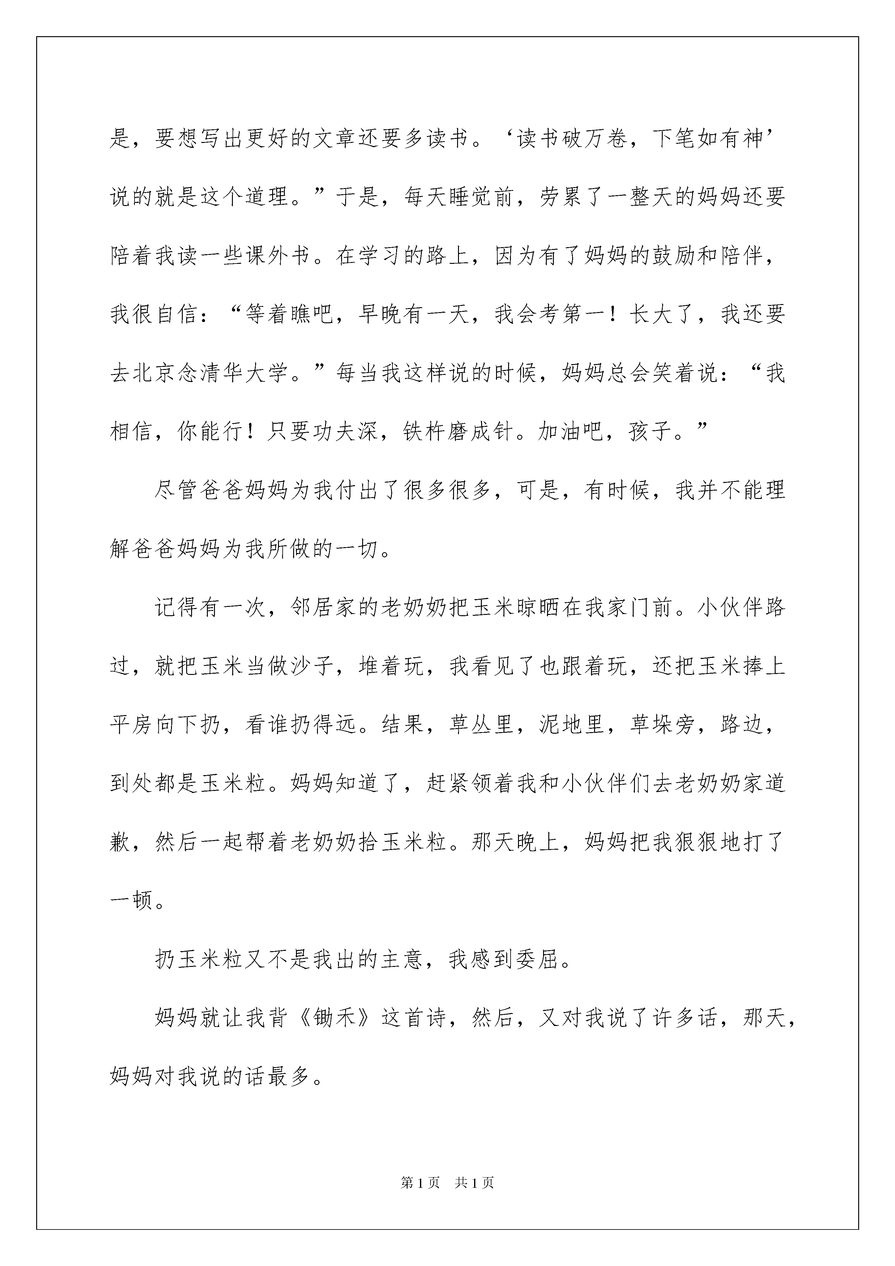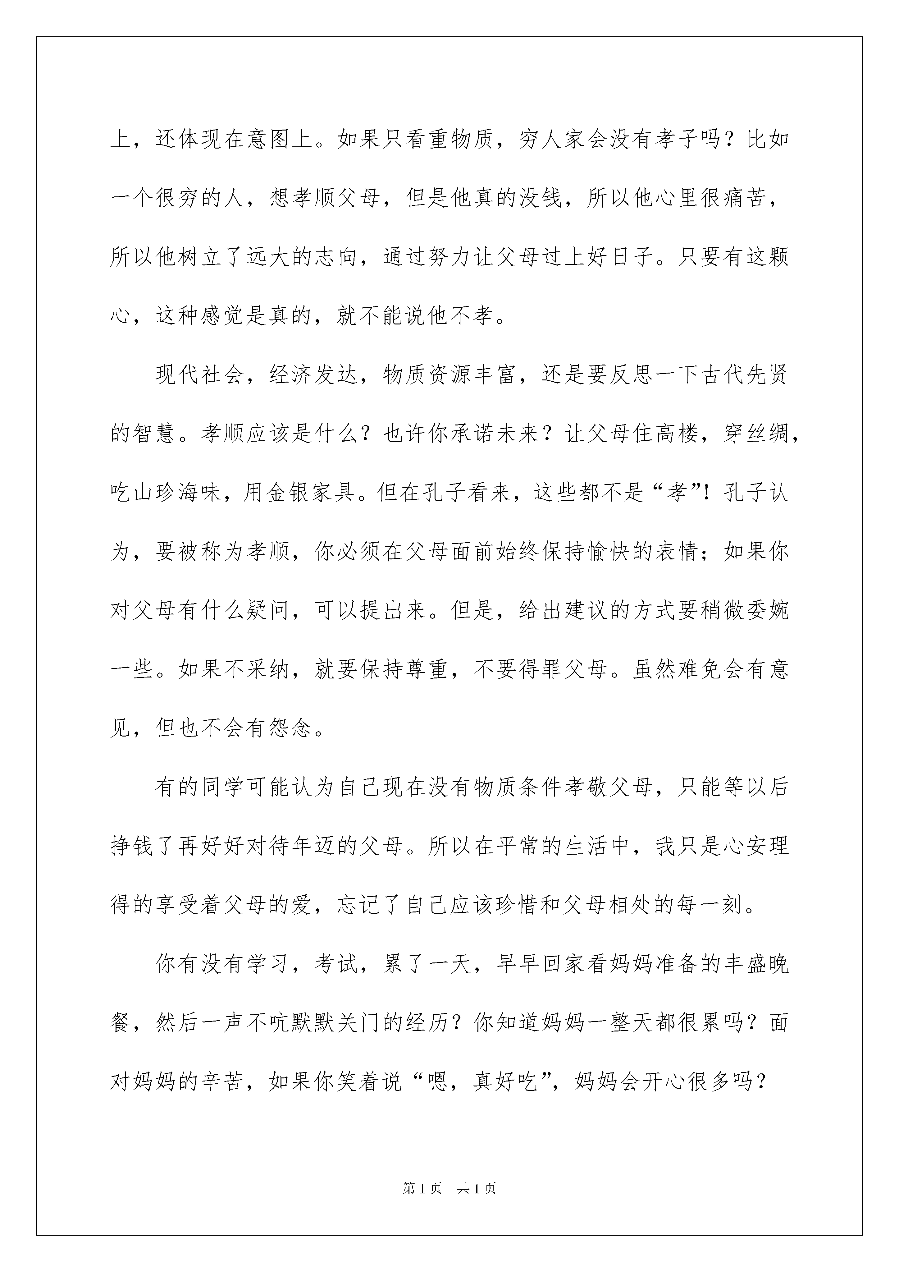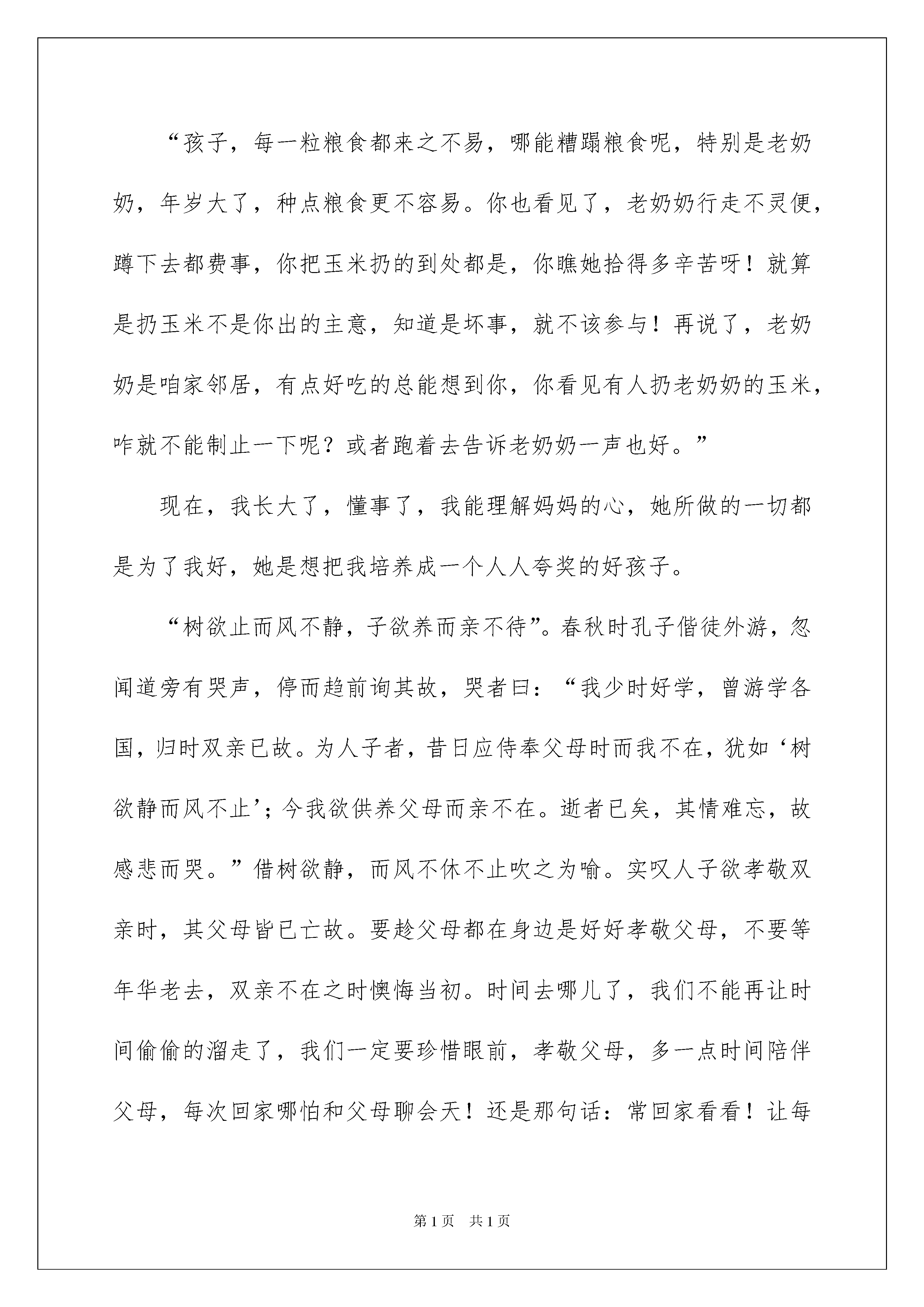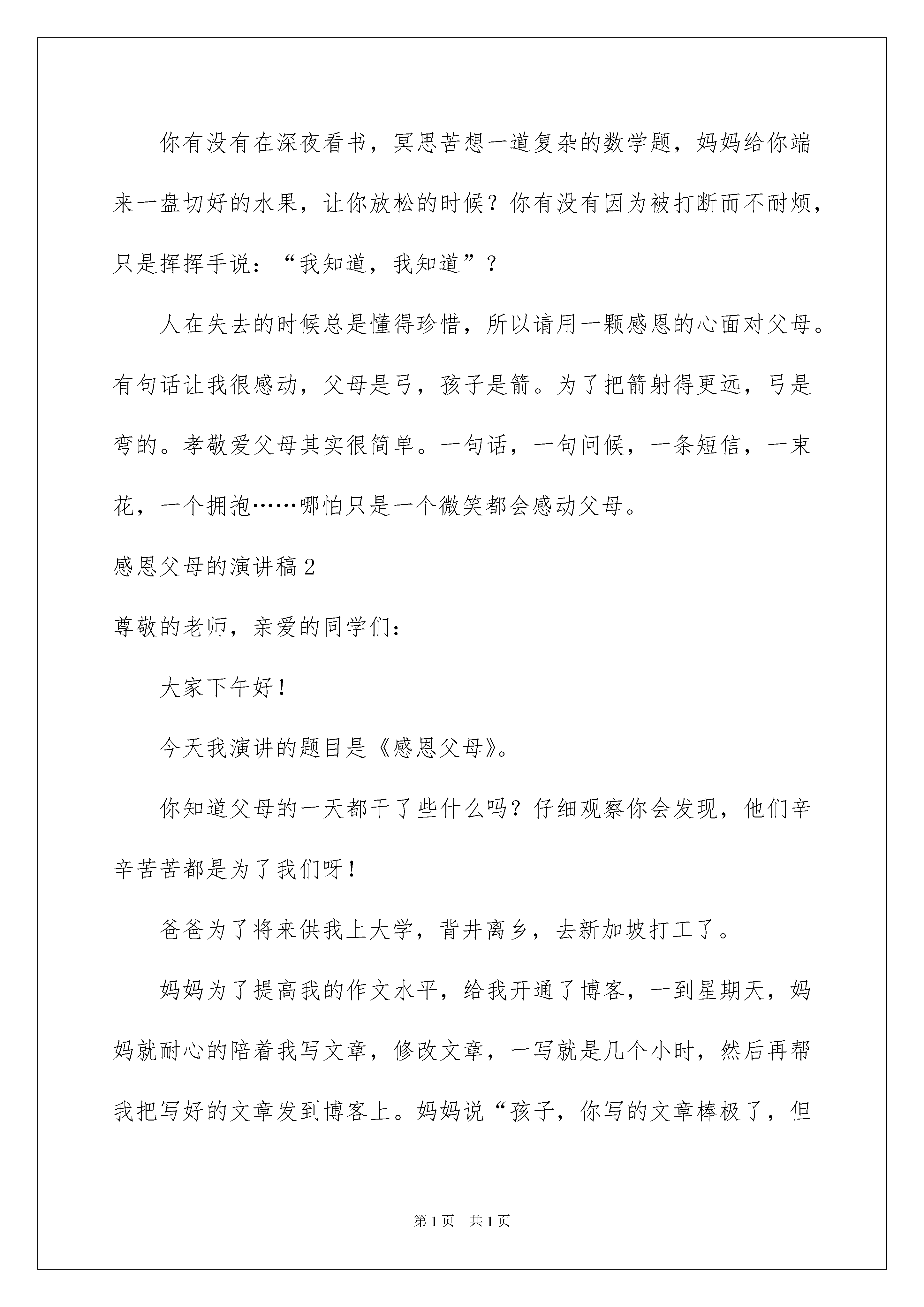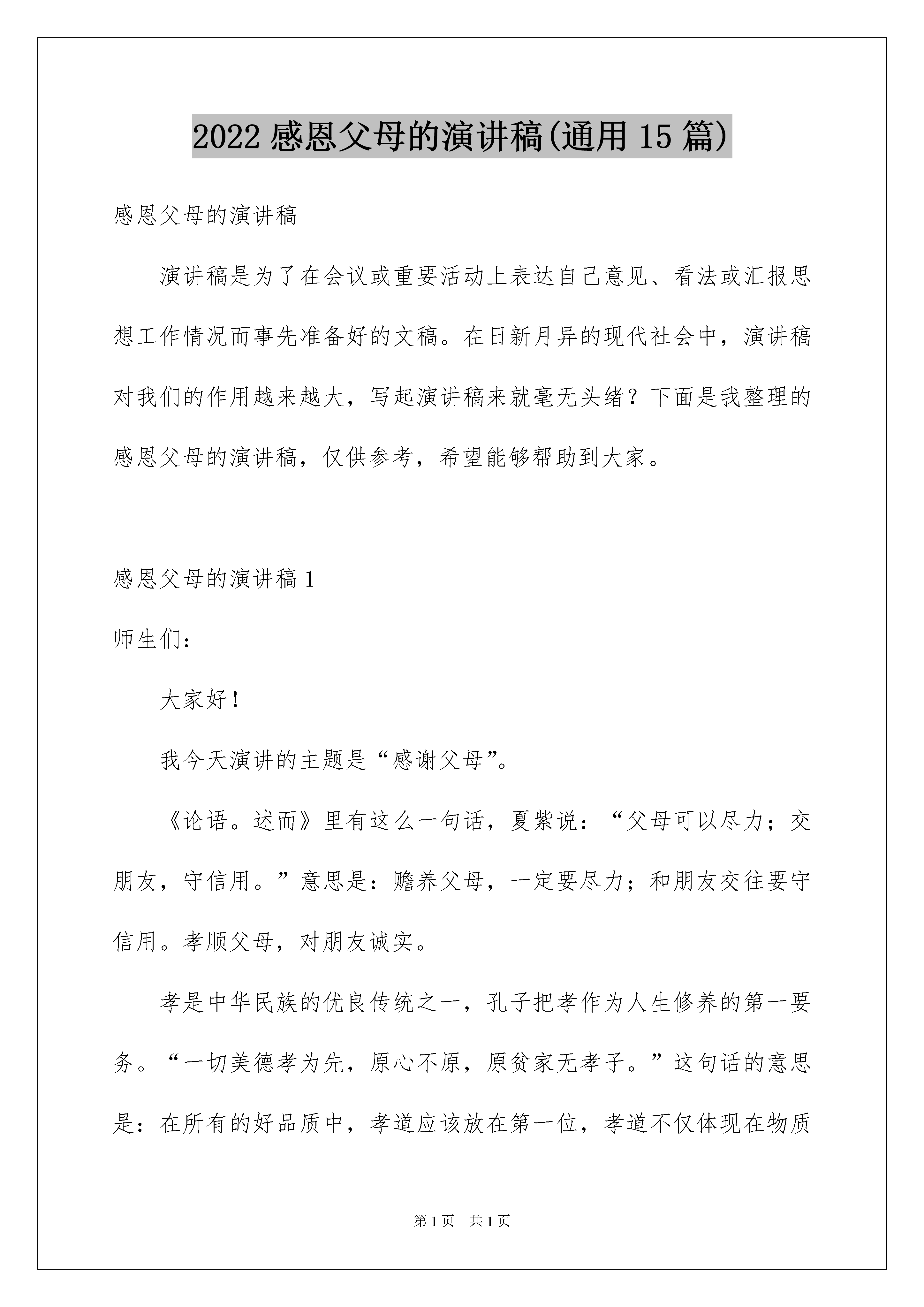2022感恩父母的演讲稿(通用15篇)感恩父母的演讲稿演讲稿是为了在会议或重要活动上表达自己意见、看法或汇报思想工作情况而事先准备好的文稿。在日新月异的现代社会中,演讲稿对我们的作用越来越大,写起演讲稿来就毫无头绪?下面是我整理的感恩父母的演讲稿,仅供参考,希望能够帮助到大家。感恩父母的演讲稿1师生们:大家好!我今天演讲的主题是“感谢父母”。《论语。述而》里有这么一句话,夏紫说:“父母可以尽力;交朋友,守信用。”意思是:赡养父母,一定要尽力;和朋友交往要守信用。孝顺父母,对朋友诚实。孝是中华民族的优良传统之一,孔子把孝作为人生修养的第一要务。“一切美德孝为先,原心不原,原贫家无孝子。”这句话的意思是:在所有的好品质中,孝道应该放在第一位,孝道不仅体现在物质上,还体现在意图上。如果只看重物质,穷人家会没有孝子吗?比如一个很穷的人,想孝顺父母,但是他真的没钱,所以他心里很痛苦,所以他树立了远大的志向,通过努力让父母过上好日子。只要有这颗心,这种感觉是真的,就不能说他不孝。现代社会,经济发达,物质资源丰富,还是要反思一下古代先贤的智慧。孝顺应该是什么?也许你承诺未来?让父母住高楼,穿丝绸,吃山珍海味,用金银家具。但在孔子看来,这些都不是“孝”!孔子认为,要被称为孝顺,你必须在父母面前始终保持愉快的表情;如果你对父母有什么疑问,可以提出来。但是,给出建议的方式要稍微委婉一些。如果不采纳,就要保持尊重,不要得罪父母。虽然难免会有意见,但也不会有怨念。有的同学可能认为自己现在没有物质条件孝敬父母,只能等以后挣钱了再好好对待年迈的父母。所以在平常的生活中,我只是心安理得的享受着父母的爱,忘记了自己应该珍惜和父母相处的每一刻。你有没有学习,考试,累了一天,早早回家看妈妈准备的丰盛晚餐,然后一声不吭默默关门的经历?你知道妈妈一整天都很累吗?面对妈妈的辛苦,如果你笑着说“嗯,真好吃”,妈妈会开心很多吗?你有没有在深夜看书,冥思苦想一道复杂的数学题,妈妈给你端来一盘切好的水果,让你放松的时候?你有没有因为被打断而不耐烦,只是挥挥手说:“我知道,我知道”?人在失去的时候总是懂得珍惜,所以请用一颗感恩的心面对父母。有句话让我很感动,父母是弓,孩子是箭。为了把箭射得更远,弓是弯的。孝敬爱父母其实很简单。一句话,一句问候,一条短信,一束花,一个拥抱……哪怕只是一个微笑都会感动父母。感恩父母的演讲稿2尊敬的老师,亲爱的同学们:大家下午好!今天我演讲的题目是《感恩父母》。你知道父母的一天都干了些什么吗?仔细观察你会发现,他们辛辛苦苦都是为了我们呀!爸爸为了将来供我上大学,背井离乡,去新加坡打工了。妈妈为了提高我的作文水平,给我开通了博客,一到星期天,妈妈就耐心的陪着我写文章,修改文章,一写就是几个小时,然后再帮我把写好的文章发到博客上。妈妈说“孩子,你写的文章棒极了,但是,要想写出更好的文章还要多读书。‘读书破万卷,下笔如有神’说的就是这个道理。”于是,每天睡觉前,劳累了一整天的妈妈还要陪着我读一些课外书。在学习的路上,因为有了妈妈的鼓励和陪伴,我很自信:“等着瞧吧,早晚有一天,我会考第一!长大了,我还要去北京念清华大学。”每当我这样说的时候,妈妈总会笑着说:“我相信,你能行!只要功夫深,铁杵磨成针。加油吧,孩子。”尽管爸爸妈妈为我付出了很多很多,可是,有时候,我并不能理解爸爸妈妈为我所做的一切。记得有一次,邻居家的老奶奶把玉米晾晒在我家门前。小伙伴路过,就把玉米当做沙子,堆着玩,我看见了也跟着玩,还把玉米捧上平房向下扔,看谁扔得远。结果,草丛里,泥地里,草垛旁,路边,到处都是玉米粒。妈妈知道了,赶紧领着我和小伙伴们去老奶奶家道歉,然后一起帮着老奶奶拾玉米粒。那天晚上,妈妈把我狠狠地打了一顿。扔玉米粒又不是我出的主意,我感到委屈。妈妈就让我背《锄禾》这首诗,然后,又对我说了许多话,那天,妈妈对我说的话最多。“孩子,每一粒粮食都来之不易,哪能糟蹋粮食呢,特别是老奶奶,年岁大了,种点粮食更不容易。你也看见了,老奶奶行走不灵便,蹲下去都费事,你把玉米扔的到处都是,你瞧她拾得多辛苦呀!就算是扔玉米不是你出的主意,知道是坏事,就不该参与!再说了,老奶奶是咱家邻居,有点好吃的总能想到你,你看见有人扔老奶奶的玉米,咋就不能制止一下呢?或者跑着去告诉老奶奶一声也好。”现在,我长大了,懂事了,我能理解妈妈的心,她所做的一切都是为了我好,她是想把我培养成一个人人夸奖的好孩子。“树欲止而风不静,子欲养而亲不待”。春秋时孔子偕徒外游,忽闻道旁有哭声,停而趋前询其故,哭者曰:“我少时好学,曾游学各国,归时双亲已故。为人子者,昔日应
