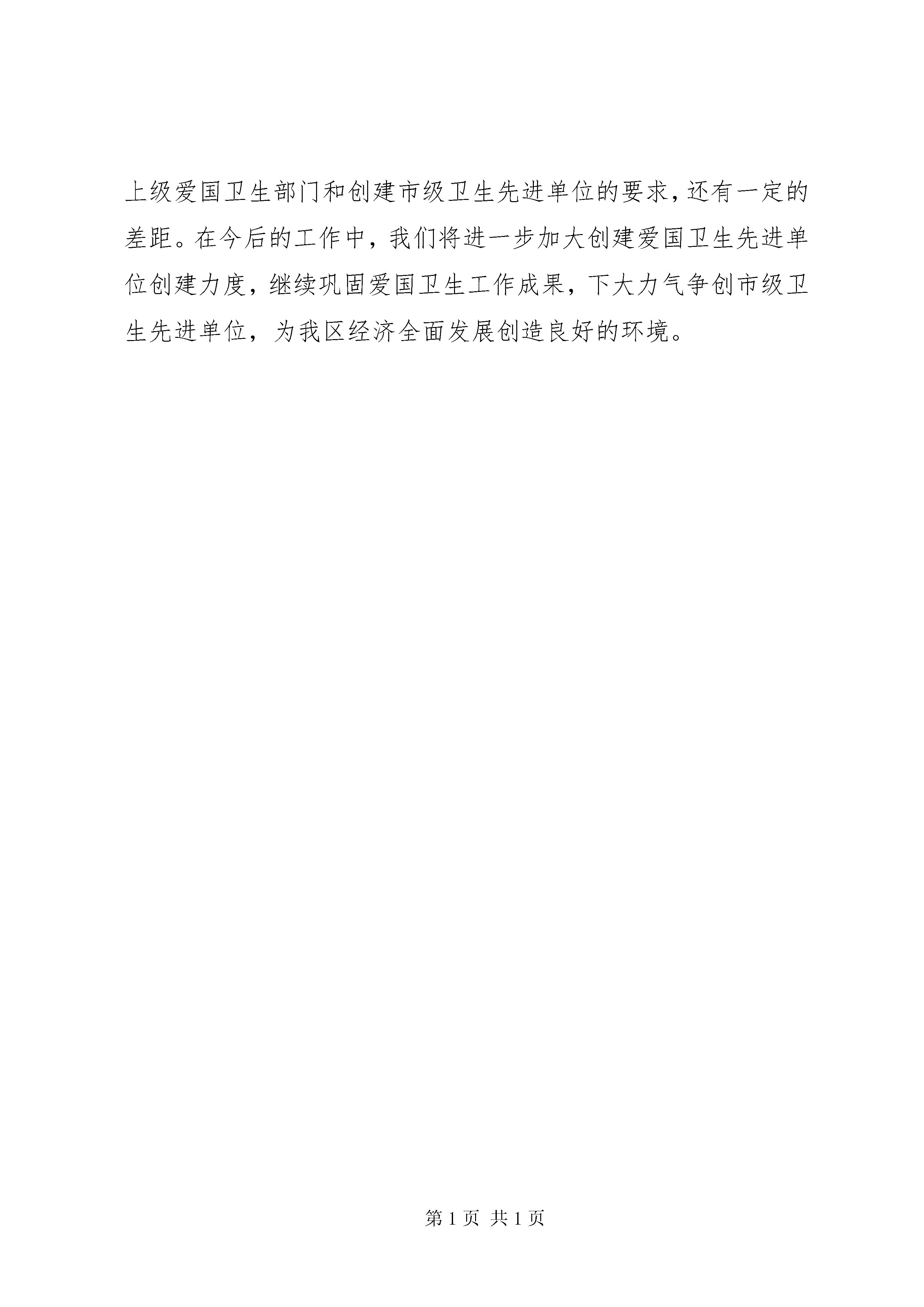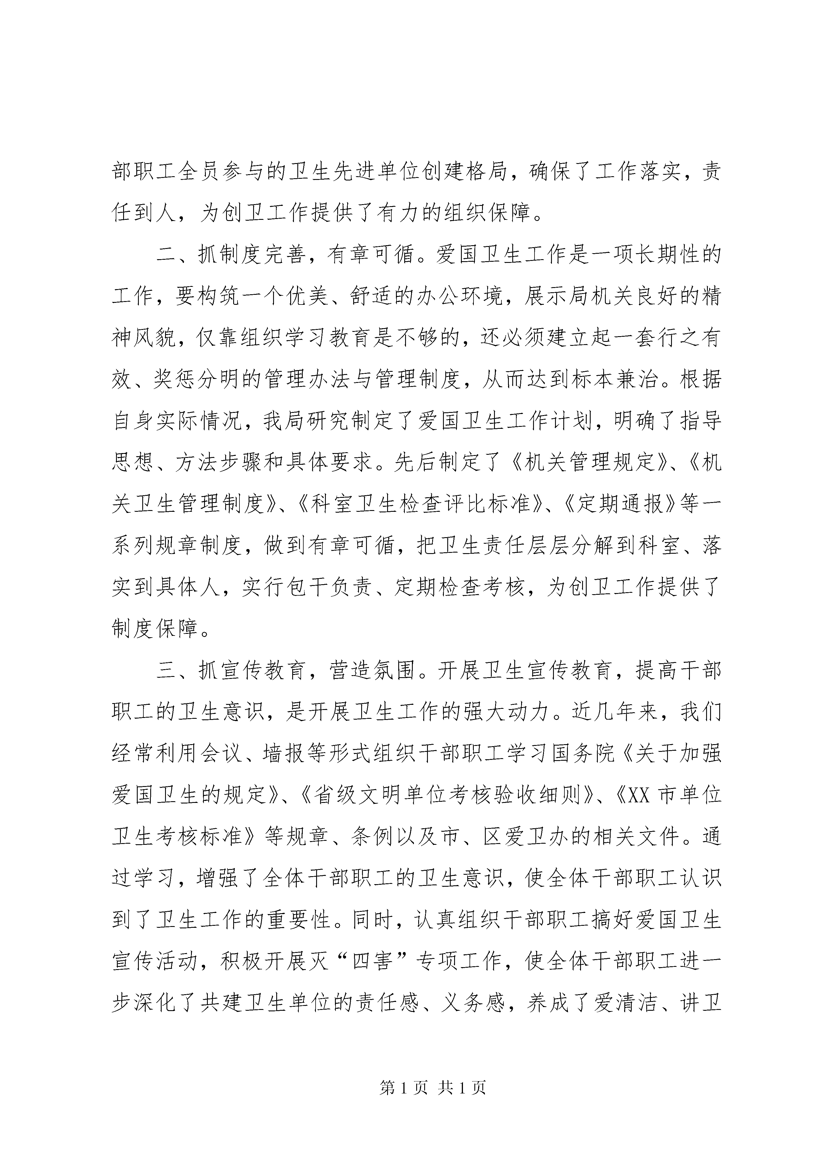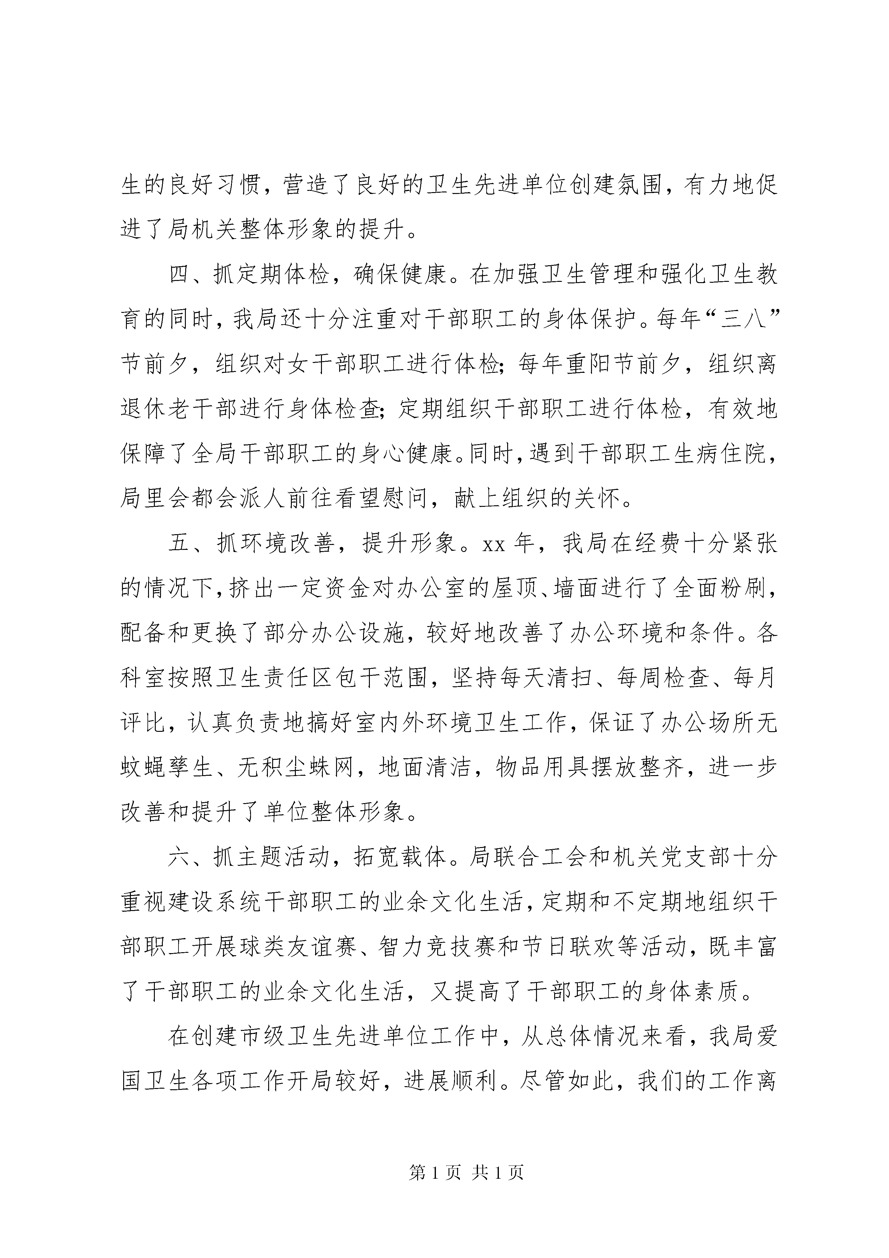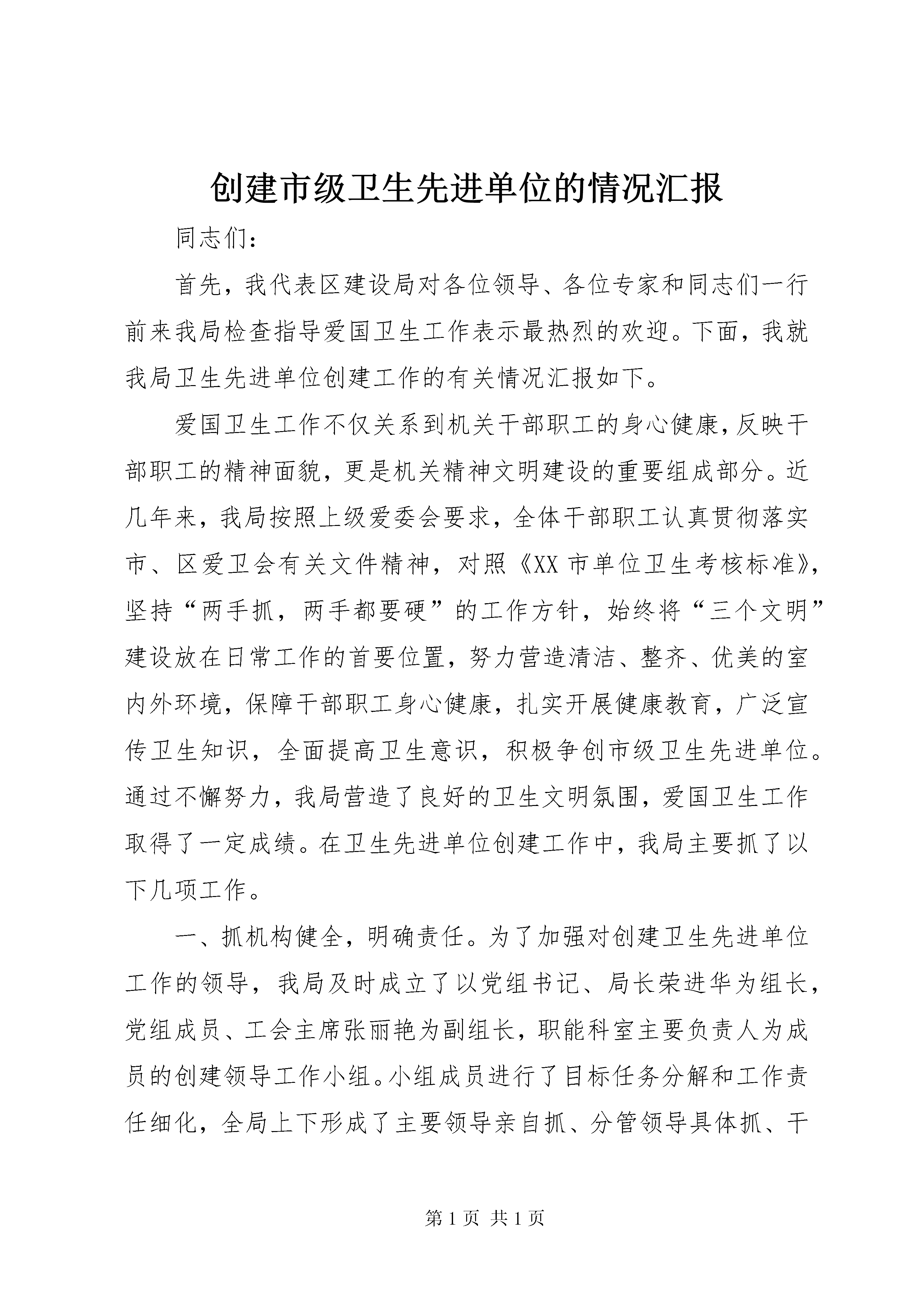 创建市级卫生先进单位的情况汇报同志们:首先,我代表区建设局对各位领导、各位专家和同志们一行前来我局检查指导爱国卫生工作表示最热烈的欢迎。下面,我就我局卫生先进单位创建工作的有关情况汇报如下。爱国卫生工作不仅关系到机关干部职工的身心健康,反映干部职工的精神面貌,更是机关精神文明建设的重要组成部分。近几年来,我局按照上级爱委会要求,全体干部职工认真贯彻落实市、区爱卫会有关文件精神,对照《XX市单位卫生考核标准》,坚持“两手抓,两手都要硬”的工作方针,始终将“三个文明”建设放在日常工作的首要位置,努力营造清洁、整齐、优美的室内外环境,保障干部职工身心健康,扎实开展健康教育,广泛宣传卫生知识,全面提高卫生意识,积极争创市级卫生先进单位。通过不懈努力,我局营造了良好的卫生文明氛围,爱国卫生工作取得了一定成绩。在卫生先进单位创建工作中,我局主要抓了以下几项工作。一、抓机构健全,明确责任。为了加强对创建卫生先进单位工作的领导,我局及时成立了以党组书记、局长荣进华为组长,党组成员、工会主席张丽艳为副组长,职能科室主要负责人为成员的创建领导工作小组。小组成员进行了目标任务分解和工作责任细化,全局上下形成了主要领导亲自抓、分管领导具体抓、干部职工全员参与的卫生先进单位创建格局,确保了工作落实,责任到人,为创卫工作提供了有力的组织保障。二、抓制度完善,有章可循。爱国卫生工作是一项长期性的工作,要构筑一个优美、舒适的办公环境,展示局机关良好的精神风貌,仅靠组织学习教育是不够的,还必须建立起一套行之有效、奖惩分明的管理办法与管理制度,从而达到标本兼治。根据自身实际情况,我局研究制定了爱国卫生工作计划,明确了指导思想、方法步骤和具体要求。先后制定了《机关管理规定》、《机关卫生管理制度》、《科室卫生检查评比标准》、《定期通报》等一系列规章制度,做到有章可循,把卫生责任层层分解到科室、落实到具体人,实行包干负责、定期检查考核,为创卫工作提供了制度保障。三、抓宣传教育,营造氛围。开展卫生宣传教育,提高干部职工的卫生意识,是开展卫生工作的强大动力。近几年来,我们经常利用会议、墙报等形式组织干部职工学习国务院《关于加强爱国卫生的规定》、《省级文明单位考核验收细则》、《XX市单位卫生考核标准》等规章、条例以及市、区爱卫办的相关文件。通过学习,增强了全体干部职工的卫生意识,使全体干部职工认识到了卫生工作的重要性。同时,认真组织干部职工搞好爱国卫生宣传活动,积极开展灭“四害”专项工作,使全体干部职工进一步深化了共建卫生单位的责任感、义务感,养成了爱清洁、讲卫生的良好习惯,营造了良好的卫生先进单位创建氛围,有力地促进了局机关整体形象的提升。四、抓定期体检,确保健康。在加强卫生管理和强化卫生教育的同时,我局还十分注重对干部职工的身体保护。每年“三八”节前夕,组织对女干部职工进行体检;每年重阳节前夕,组织离退休老干部进行身体检查;定期组织干部职工进行体检,有效地保障了全局干部职工的身心健康。同时,遇到干部职工生病住院,局里会都会派人前往看望慰问,献上组织的关怀。五、抓环境改善,提升形象。xx年,我局在经费十分紧张的情况下,挤出一定资金对办公室的屋顶、墙面进行了全面粉刷,配备和更换了部分办公设施,较好地改善了办公环境和条件。各科室按照卫生责任区包干范围,坚持每天清扫、每周检查、每月评比,认真负责地搞好室内外环境卫生工作,保证了办公场所无蚊蝇孳生、无积尘蛛网,地面清洁,物品用具摆放整齐,进一步改善和提升了单位整体形象。六、抓主题活动,拓宽载体。局联合工会和机关党支部十分重视建设系统干部职工的业余文化生活,定期和不定期地组织干部职工开展球类友谊赛、智力竞技赛和节日联欢等活动,既丰富了干部职工的业余文化生活,又提高了干部职工的身体素质。在创建市级卫生先进单位工作中,从总体情况来看,我局爱国卫生各项工作开局较好,进展顺利。尽管如此,我们的工作离上级爱国卫生部门和创建市级卫生先进单位的要求,还有一定的差距。在今后的工作中,我们将进一步加大创建爱国卫生先进单位创建力度,继续巩固爱国卫生工作成果,下大力气争创市级卫生先进单位,为我区经济全面发展创造良好的环境。