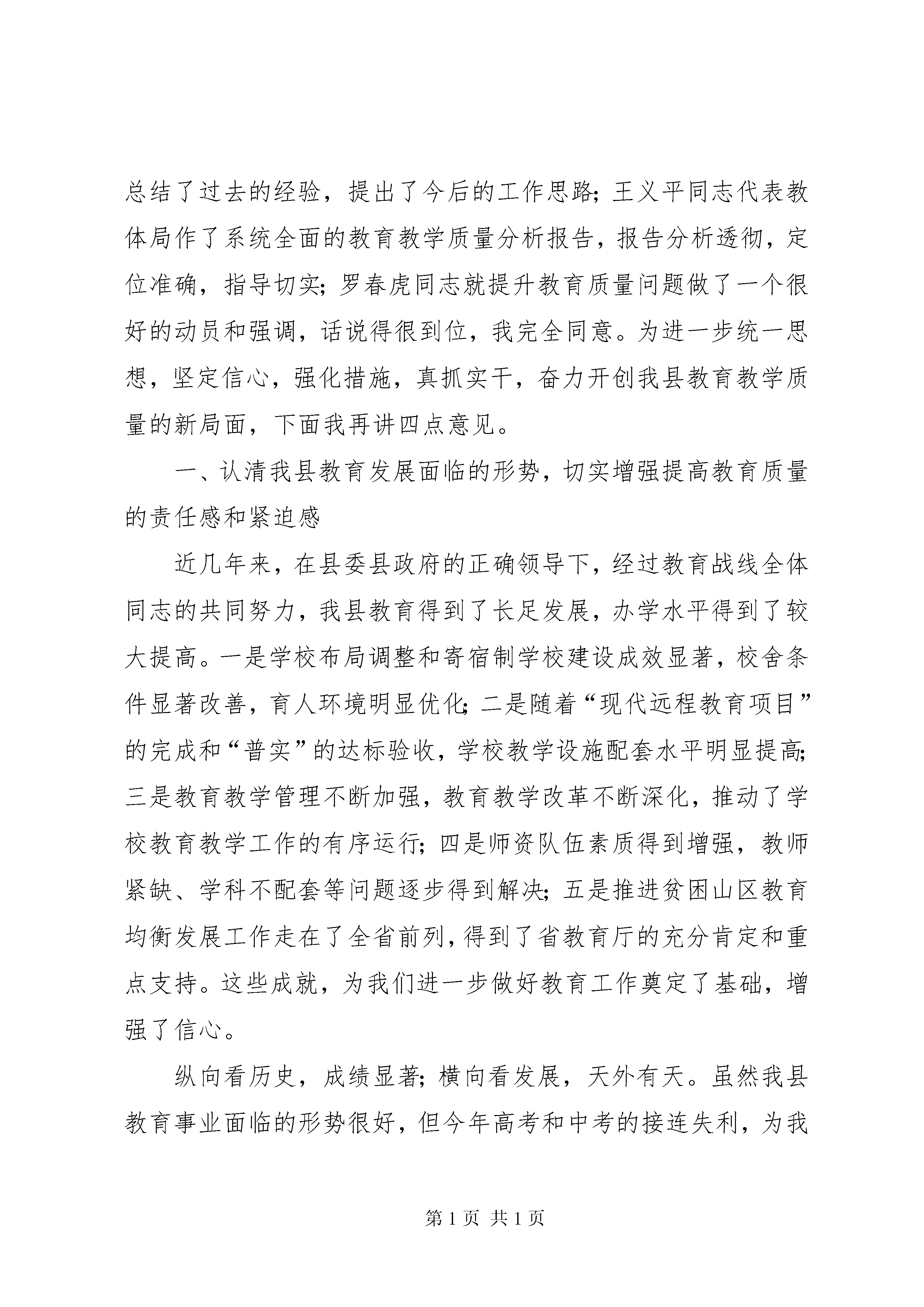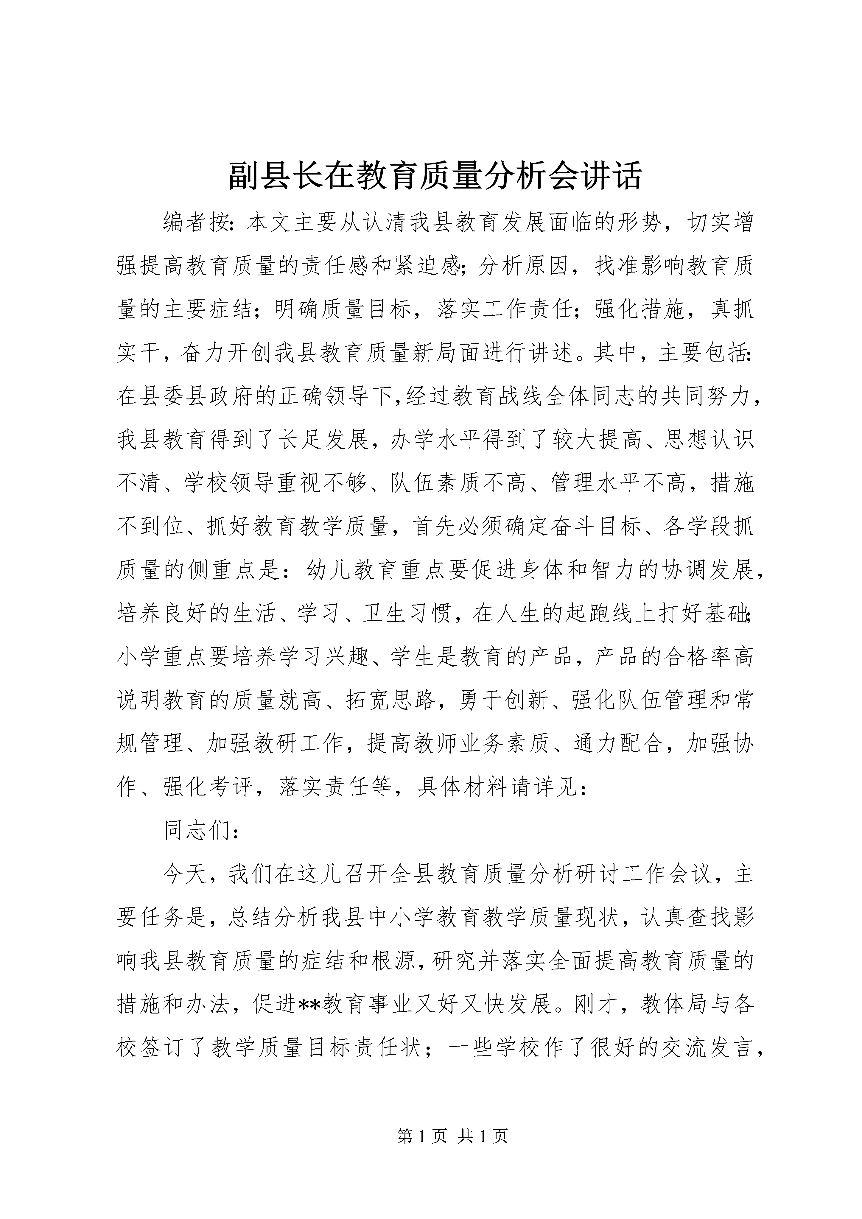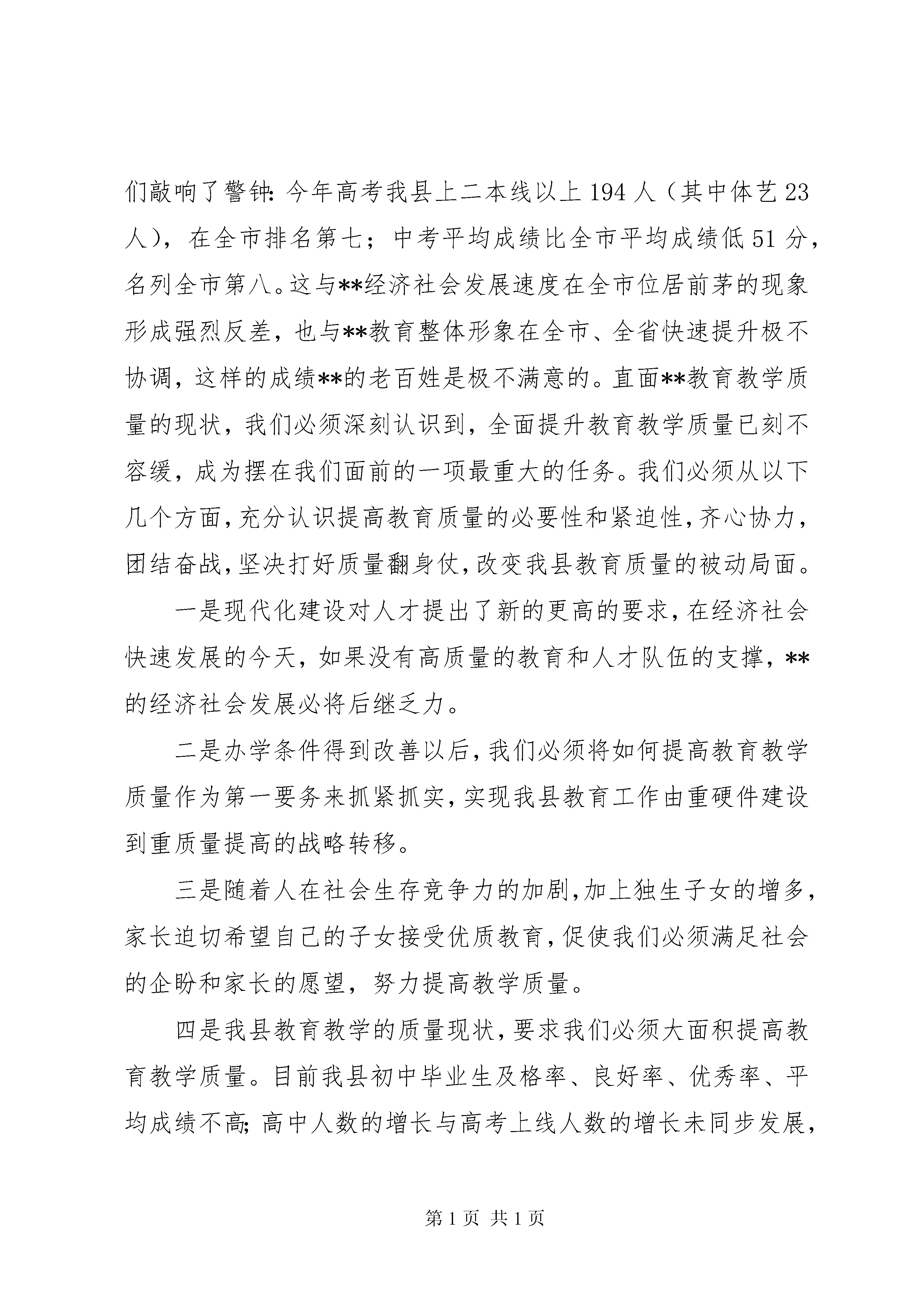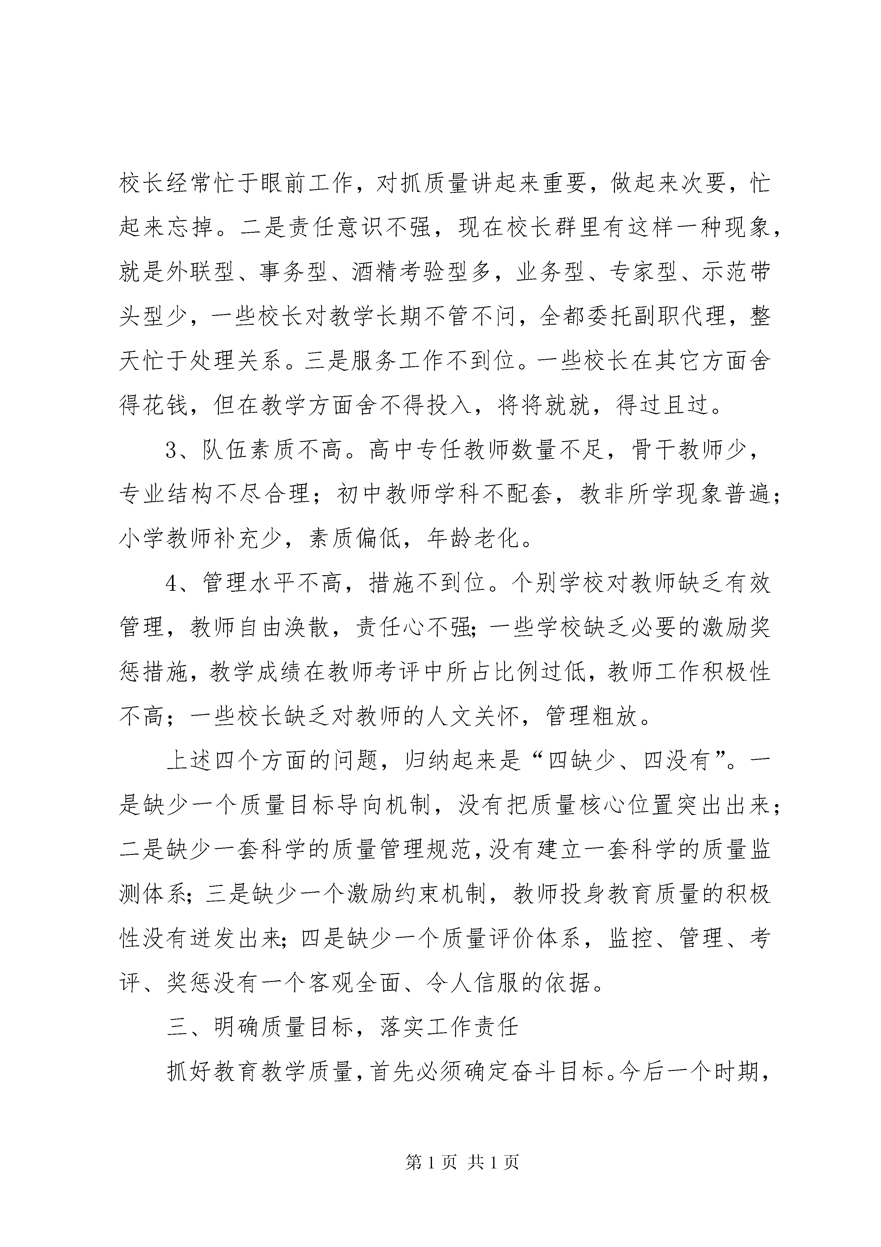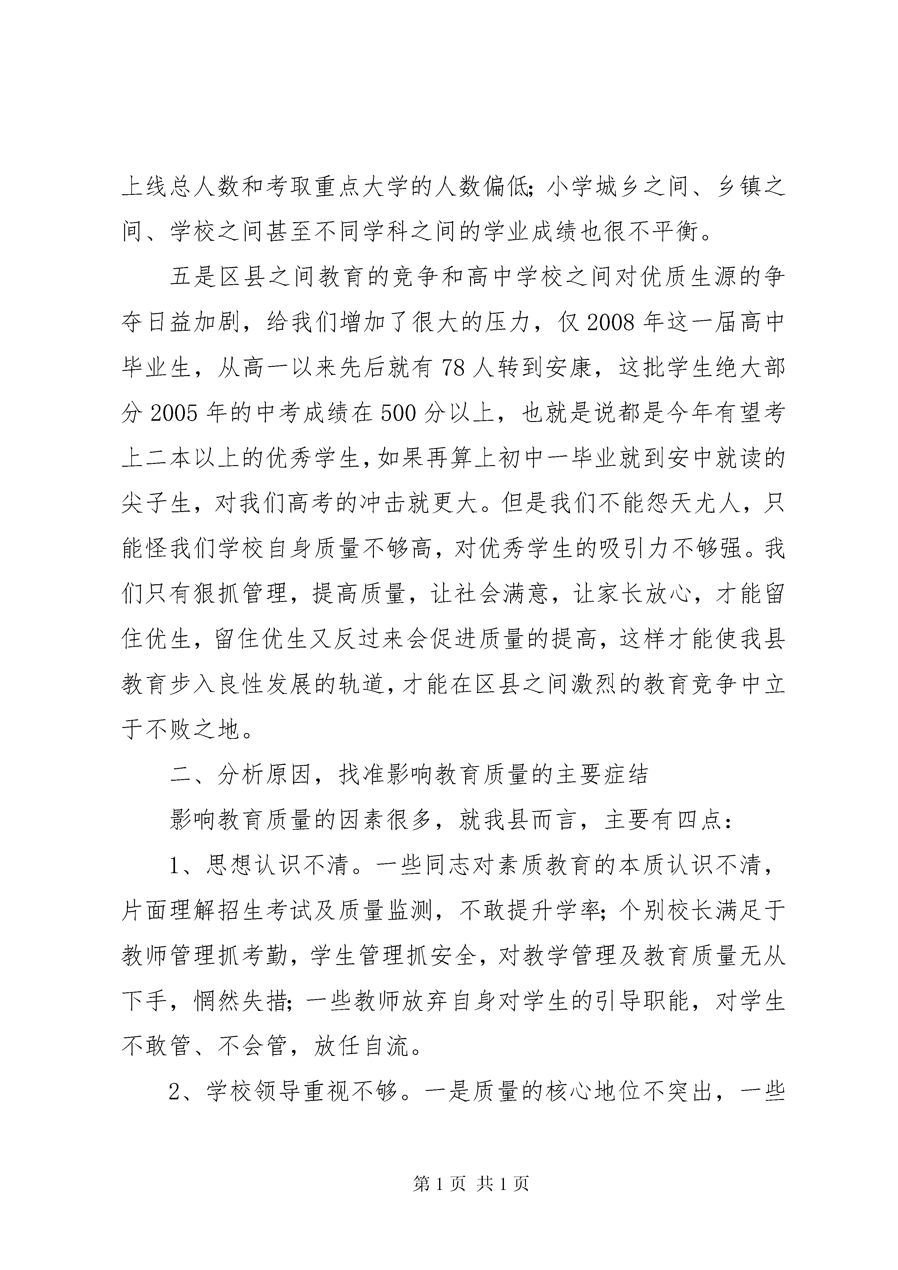 副县长在教育质量分析会讲话编者按:本文主要从认清我县教育发展面临的形势,切实增强提高教育质量的责任感和紧迫感;分析原因,找准影响教育质量的主要症结;明确质量目标,落实工作责任;强化措施,真抓实干,奋力开创我县教育质量新局面进行讲述。其中,主要包括:在县委县政府的正确领导下,经过教育战线全体同志的共同努力,我县教育得到了长足发展,办学水平得到了较大提高、思想认识不清、学校领导重视不够、队伍素质不高、管理水平不高,措施不到位、抓好教育教学质量,首先必须确定奋斗目标、各学段抓质量的侧重点是:幼儿教育重点要促进身体和智力的协调发展,培养良好的生活、学习、卫生习惯,在人生的起跑线上打好基础;小学重点要培养学习兴趣、学生是教育的产品,产品的合格率高说明教育的质量就高、拓宽思路,勇于创新、强化队伍管理和常规管理、加强教研工作,提高教师业务素质、通力配合,加强协作、强化考评,落实责任等,具体材料请详见:同志们:今天,我们在这儿召开全县教育质量分析研讨工作会议,主要任务是,总结分析我县中小学教育教学质量现状,认真查找影响我县教育质量的症结和根源,研究并落实全面提高教育质量的措施和办法,促进**教育事业又好又快发展。刚才,教体局与各校签订了教学质量目标责任状;一些学校作了很好的交流发言,总结了过去的经验,提出了今后的工作思路;王义平同志代表教体局作了系统全面的教育教学质量分析报告,报告分析透彻,定位准确,指导切实;罗春虎同志就提升教育质量问题做了一个很好的动员和强调,话说得很到位,我完全同意。为进一步统一思想,坚定信心,强化措施,真抓实干,奋力开创我县教育教学质量的新局面,下面我再讲四点意见。一、认清我县教育发展面临的形势,切实增强提高教育质量的责任感和紧迫感近几年来,在县委县政府的正确领导下,经过教育战线全体同志的共同努力,我县教育得到了长足发展,办学水平得到了较大提高。一是学校布局调整和寄宿制学校建设成效显著,校舍条件显著改善,育人环境明显优化;二是随着“现代远程教育项目”的完成和“普实”的达标验收,学校教学设施配套水平明显提高;三是教育教学管理不断加强,教育教学改革不断深化,推动了学校教育教学工作的有序运行;四是师资队伍素质得到增强,教师紧缺、学科不配套等问题逐步得到解决;五是推进贫困山区教育均衡发展工作走在了全省前列,得到了省教育厅的充分肯定和重点支持。这些成就,为我们进一步做好教育工作奠定了基础,增强了信心。纵向看历史,成绩显著;横向看发展,天外有天。虽然我县教育事业面临的形势很好,但今年高考和中考的接连失利,为我们敲响了警钟:今年高考我县上二本线以上194人(其中体艺23人),在全市排名第七;中考平均成绩比全市平均成绩低51分,名列全市第八。这与**经济社会发展速度在全市位居前茅的现象形成强烈反差,也与**教育整体形象在全市、全省快速提升极不协调,这样的成绩**的老百姓是极不满意的。直面**教育教学质量的现状,我们必须深刻认识到,全面提升教育教学质量已刻不容缓,成为摆在我们面前的一项最重大的任务。我们必须从以下几个方面,充分认识提高教育质量的必要性和紧迫性,齐心协力,团结奋战,坚决打好质量翻身仗,改变我县教育质量的被动局面。一是现代化建设对人才提出了新的更高的要求,在经济社会快速发展的今天,如果没有高质量的教育和人才队伍的支撑,**的经济社会发展必将后继乏力。二是办学条件得到改善以后,我们必须将如何提高教育教学质量作为第一要务来抓紧抓实,实现我县教育工作由重硬件建设到重质量提高的战略转移。三是随着人在社会生存竞争力的加剧,加上独生子女的增多,家长迫切希望自己的子女接受优质教育,促使我们必须满足社会的企盼和家长的愿望,努力提高教学质量。四是我县教育教学的质量现状,要求我们必须大面积提高教育教学质量。目前我县初中毕业生及格率、良好率、优秀率、平均成绩不高;高中人数的增长与高考上线人数的增长未同步发展,上线总人数和考取重点大学的人数偏低;小学城乡之间、乡镇之间、学校之间甚至不同学科之间的学业成绩也很不平衡。五是区县之间教育的竞争和高中学校之间对优质生源的争夺日益加剧,给我们增加了很大的压力,仅2008年这一届高中毕业生,从高一以来先后就有78人转到安康,这批学生绝大部分2005年的中考成绩在500分以上,也就是说都是今年有望考上二本以上的优秀学生,如果再算上初中一毕业就到安中就读的尖子生,对我们高考的冲击就更大。但是我们不能怨天尤人,只能怪我们学校自身质量不够高,对优秀学生的吸引力不够强。我们只有狠抓管理,提高质量,让社会满意,让家长放心,才能留住优生,留住优生又反过来会促进质量的提高,这样才能使我县教育步入良性发展的轨道,才能在区县之间激烈的教育竞争中立于不败之地。二、分析原因,找准影响教育质量的主要症结影响教育