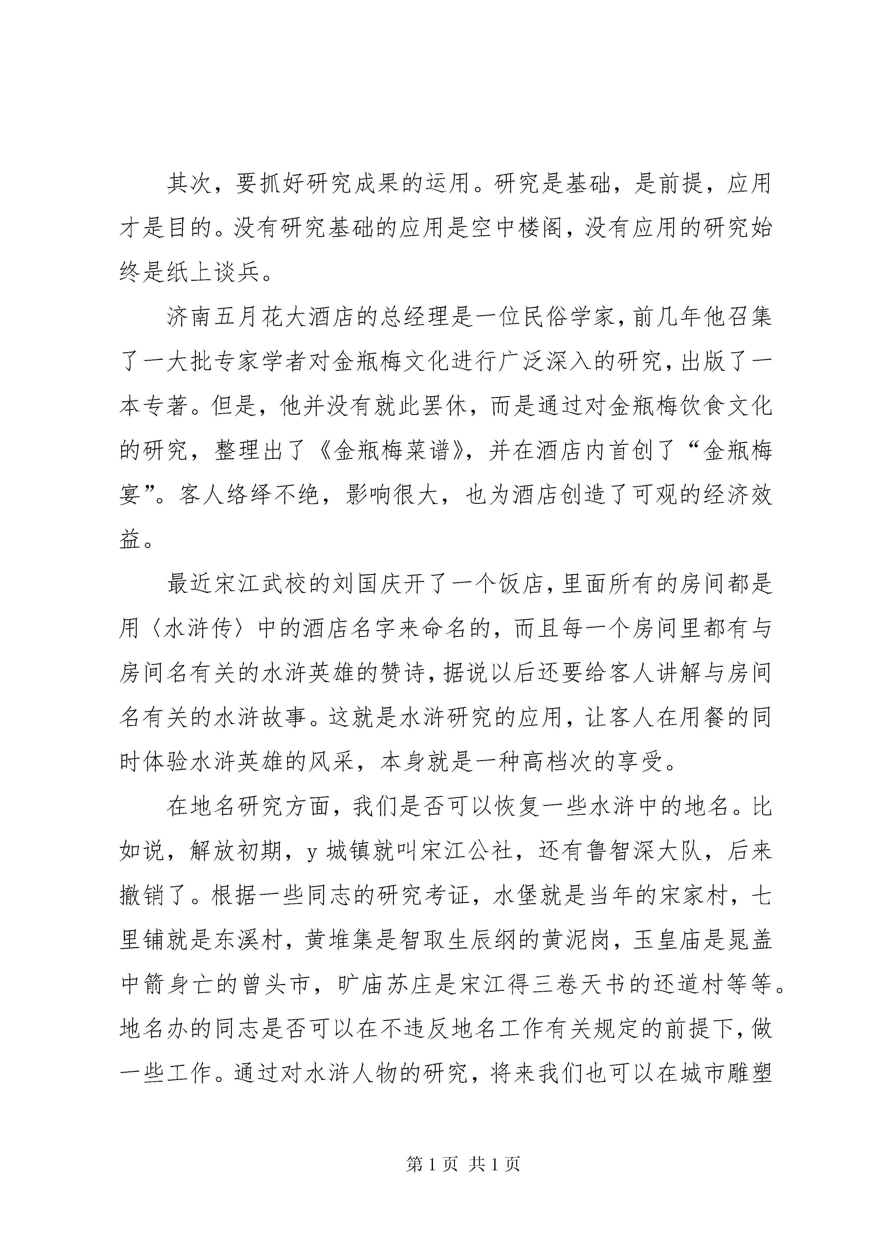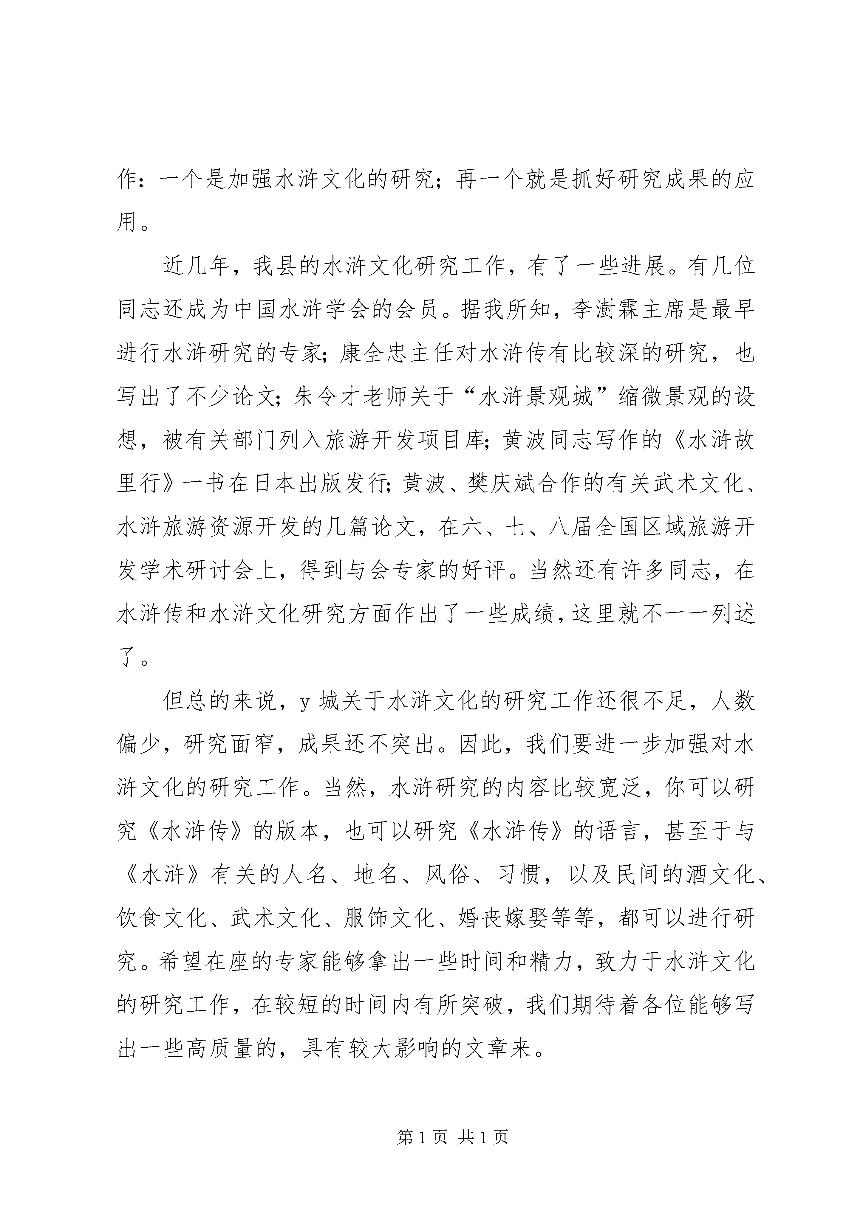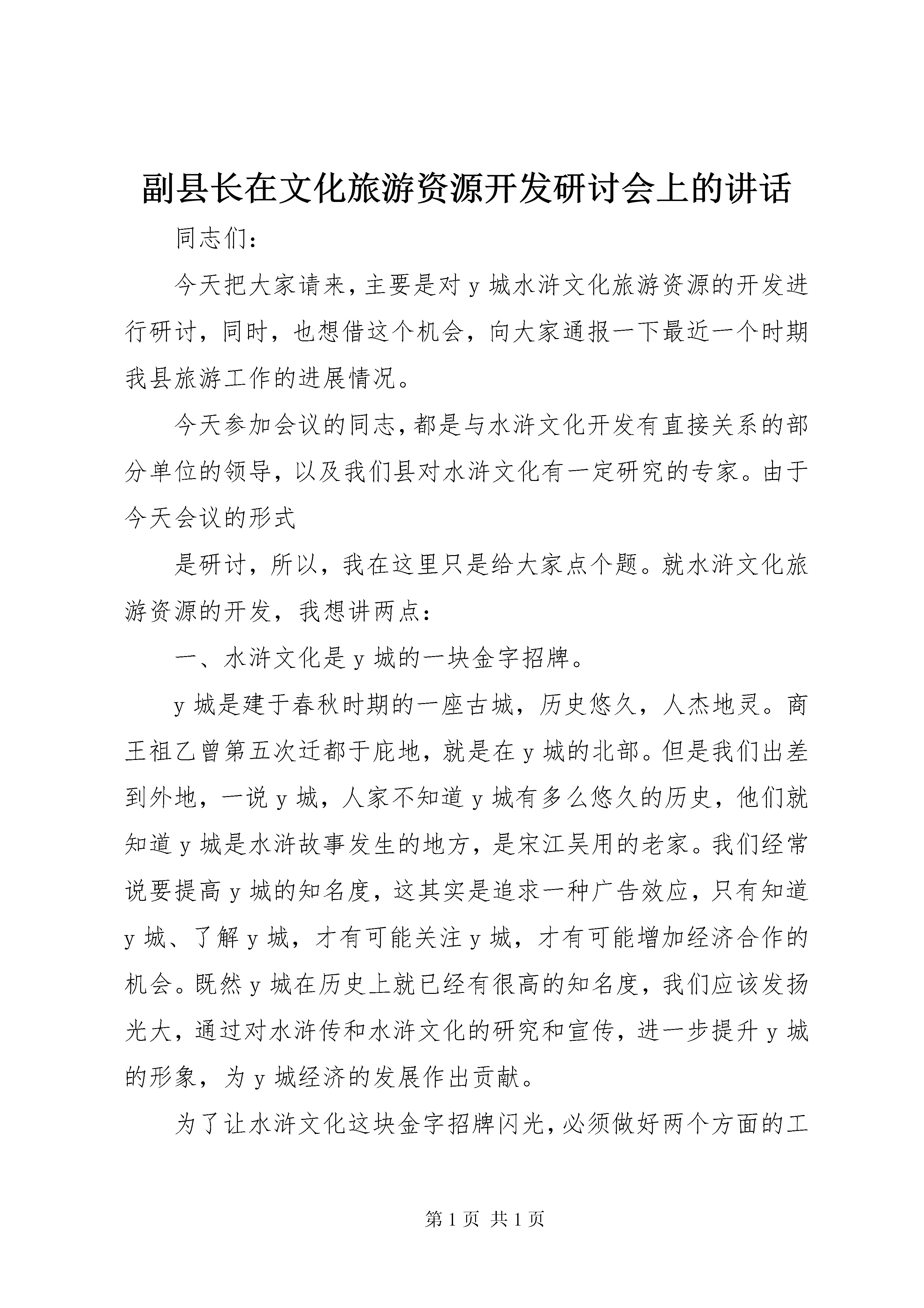 副县长在文化旅游资源开发研讨会上的讲话同志们:今天把大家请来,主要是对y城水浒文化旅游资源的开发进行研讨,同时,也想借这个机会,向大家通报一下最近一个时期我县旅游工作的进展情况。今天参加会议的同志,都是与水浒文化开发有直接关系的部分单位的领导,以及我们县对水浒文化有一定研究的专家。由于今天会议的形式是研讨,所以,我在这里只是给大家点个题。就水浒文化旅游资源的开发,我想讲两点:一、水浒文化是y城的一块金字招牌。y城是建于春秋时期的一座古城,历史悠久,人杰地灵。商王祖乙曾第五次迁都于庇地,就是在y城的北部。但是我们出差到外地,一说y城,人家不知道y城有多么悠久的历史,他们就知道y城是水浒故事发生的地方,是宋江吴用的老家。我们经常说要提高y城的知名度,这其实是追求一种广告效应,只有知道y城、了解y城,才有可能关注y城,才有可能增加经济合作的机会。既然y城在历史上就已经有很高的知名度,我们应该发扬光大,通过对水浒传和水浒文化的研究和宣传,进一步提升y城的形象,为y城经济的发展作出贡献。为了让水浒文化这块金字招牌闪光,必须做好两个方面的工作:一个是加强水浒文化的研究;再一个就是抓好研究成果的应用。近几年,我县的水浒文化研究工作,有了一些进展。有几位同志还成为中国水浒学会的会员。据我所知,李澍霖主席是最早进行水浒研究的专家;康全忠主任对水浒传有比较深的研究,也写出了不少论文;朱令才老师关于“水浒景观城”缩微景观的设想,被有关部门列入旅游开发项目库;黄波同志写作的《水浒故里行》一书在日本出版发行;黄波、樊庆斌合作的有关武术文化、水浒旅游资源开发的几篇论文,在六、七、八届全国区域旅游开发学术研讨会上,得到与会专家的好评。当然还有许多同志,在水浒传和水浒文化研究方面作出了一些成绩,这里就不一一列述了。但总的来说,y城关于水浒文化的研究工作还很不足,人数偏少,研究面窄,成果还不突出。因此,我们要进一步加强对水浒文化的研究工作。当然,水浒研究的内容比较宽泛,你可以研究《水浒传》的版本,也可以研究《水浒传》的语言,甚至于与《水浒》有关的人名、地名、风俗、习惯,以及民间的酒文化、饮食文化、武术文化、服饰文化、婚丧嫁娶等等,都可以进行研究。希望在座的专家能够拿出一些时间和精力,致力于水浒文化的研究工作,在较短的时间内有所突破,我们期待着各位能够写出一些高质量的,具有较大影响的文章来。其次,要抓好研究成果的运用。研究是基础,是前提,应用才是目的。没有研究基础的应用是空中楼阁,没有应用的研究始终是纸上谈兵。济南五月花大酒店的总经理是一位民俗学家,前几年他召集了一大批专家学者对金瓶梅文化进行广泛深入的研究,出版了一本专著。但是,他并没有就此罢休,而是通过对金瓶梅饮食文化的研究,整理出了《金瓶梅菜谱》,并在酒店内首创了“金瓶梅宴”。客人络绎不绝,影响很大,也为酒店创造了可观的经济效益。最近宋江武校的刘国庆开了一个饭店,里面所有的房间都是用〈水浒传〉中的酒店名字来命名的,而且每一个房间里都有与房间名有关的水浒英雄的赞诗,据说以后还要给客人讲解与房间名有关的水浒故事。这就是水浒研究的应用,让客人在用餐的同时体验水浒英雄的风采,本身就是一种高档次的享受。在地名研究方面,我们是否可以恢复一些水浒中的地名。比如说,解放初期,y城镇就叫宋江公社,还有鲁智深大队,后来撤销了。根据一些同志的研究考证,水堡就是当年的宋家村,七里铺就是东溪村,黄堆集是智取生辰纲的黄泥岗,玉皇庙是晁盖中箭身亡的曾头市,旷庙苏庄是宋江得三卷天书的还道村等等。地名办的同志是否可以在不违反地名工作有关规定的前提下,做一些工作。通过对水浒人物的研究,将来我们也可以在城市雕塑方面搞一些水浒人物的群雕;商场商店也可以鼓励使用与水浒有关的名称,有关部门也可以采取一些鼓励的措施。提高知名度,要讲究因地制宜,靠大规模城市建设来与外地特别是发达地区争雄,那是不自量力,靠经济发达来提高竞争也是不现实的。因此,必须从特色上下工夫,y城最大的特色,就是水浒文化。所以,提高y城的知名度,我认为,必须抓住水浒文化大做文章。通过一些体现水浒文化特色的建筑、城市雕塑、街道和商场名称等等,让游客一进y城,就能感受到浓郁的水浒文化氛围,感受到水浒英雄义气豪爽的气息,留下难忘的印象。如何利用水浒文化这块金字招牌,提升y城的形象,为y城经济发展服务,是我们今天这个会议的主题,也是大家今后一个时期的重要工作。二、水浒文化旅游资源的开发,是y城旅游工作的方向说到旅游,首先要解决一个观念问题。有人认为,现在y城要搞旅游,那是“叫花子玩猴”,