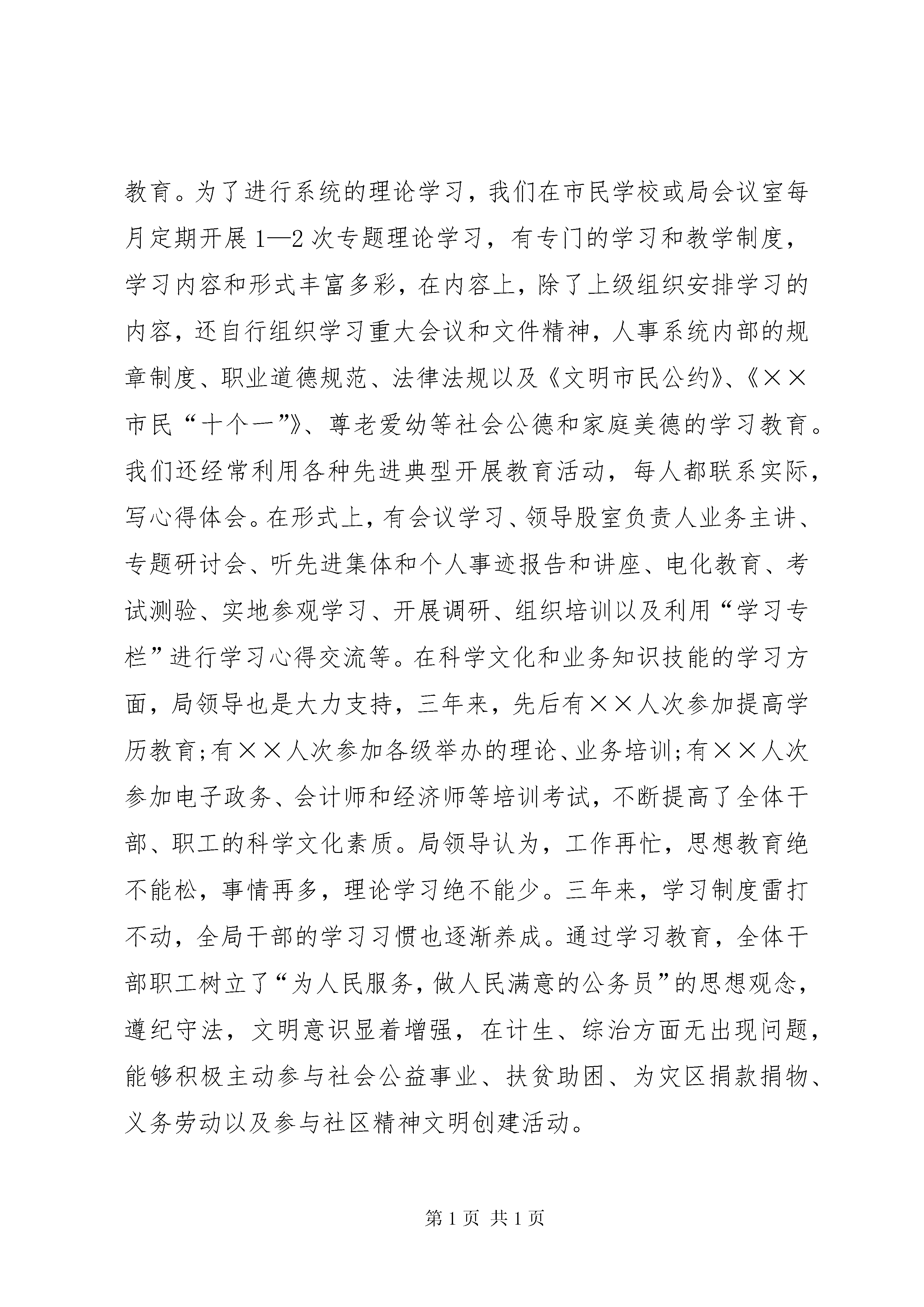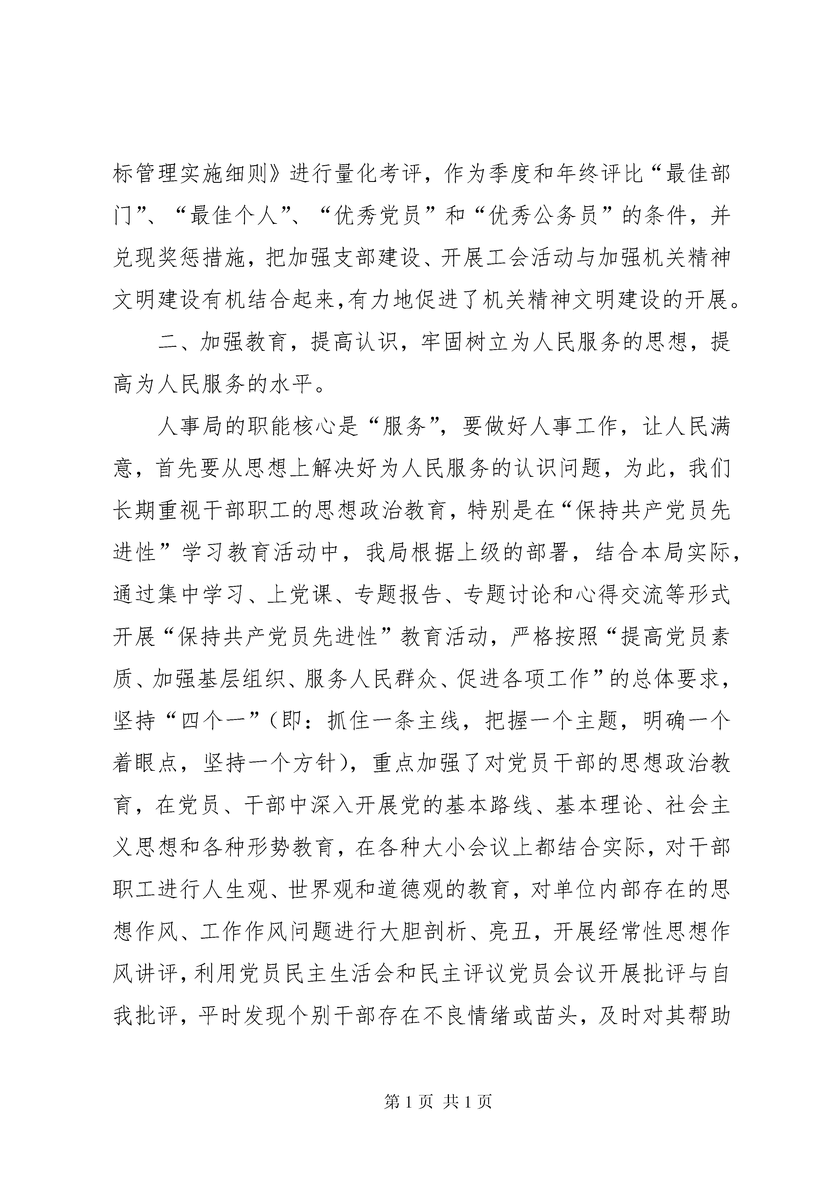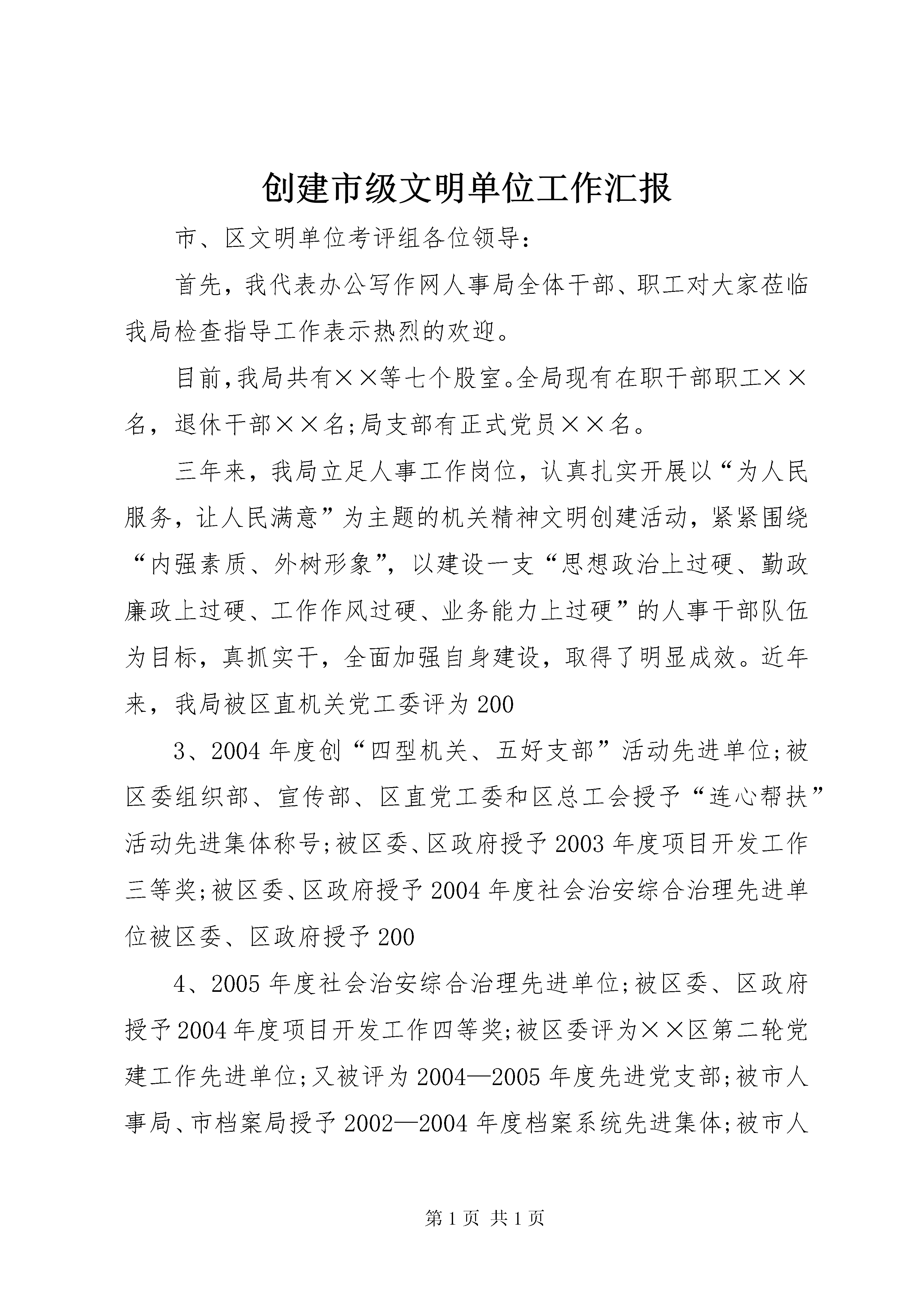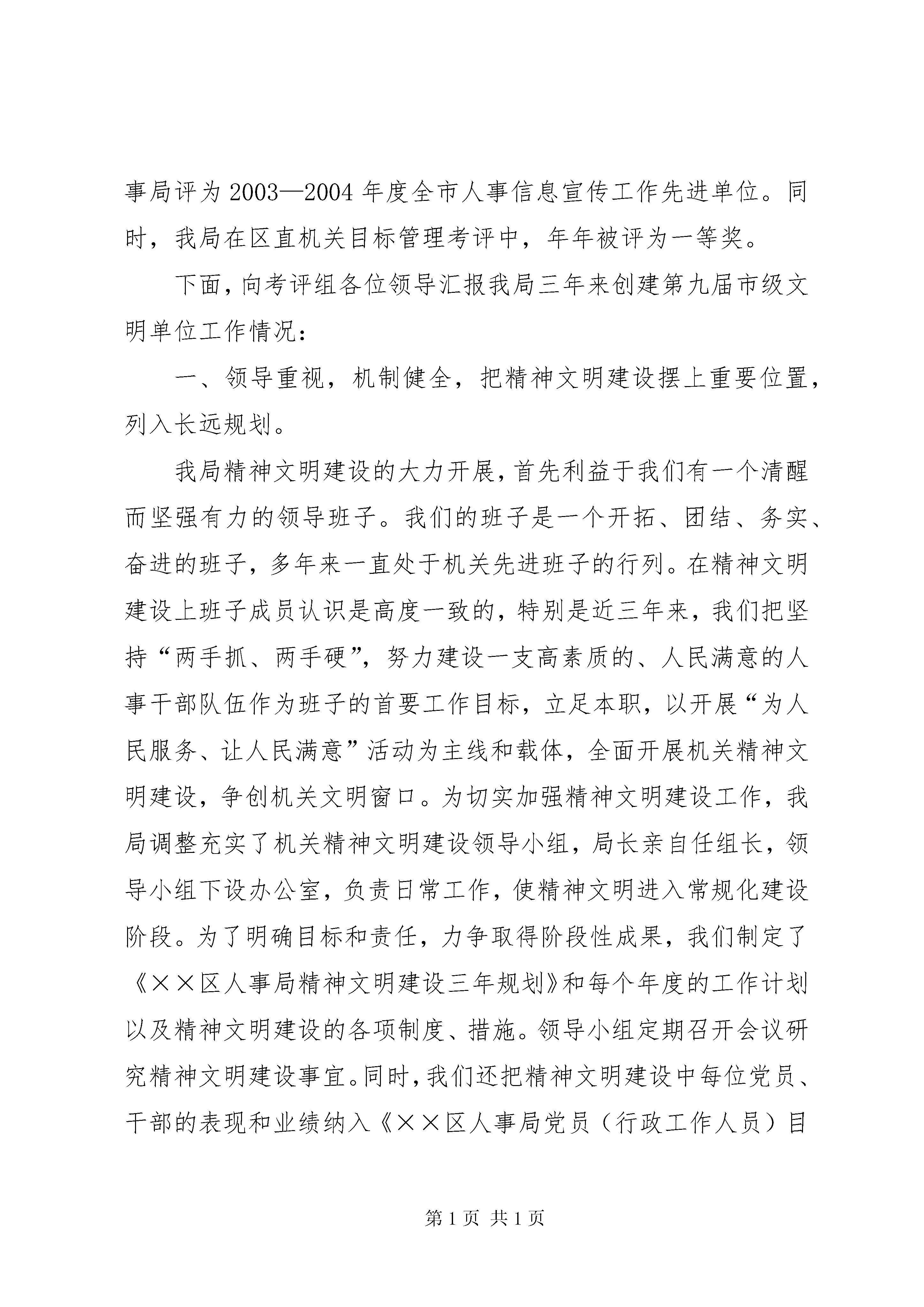 创建市级文明单位工作汇报市、区文明单位考评组各位领导:首先,我代表办公写作网人事局全体干部、职工对大家莅临我局检查指导工作表示热烈的欢迎。目前,我局共有××等七个股室。全局现有在职干部职工××名,退休干部××名;局支部有正式党员××名。三年来,我局立足人事工作岗位,认真扎实开展以“为人民服务,让人民满意”为主题的机关精神文明创建活动,紧紧围绕“内强素质、外树形象”,以建设一支“思想政治上过硬、勤政廉政上过硬、工作作风过硬、业务能力上过硬”的人事干部队伍为目标,真抓实干,全面加强自身建设,取得了明显成效。近年来,我局被区直机关党工委评为2003、2004年度创“四型机关、五好支部”活动先进单位;被区委组织部、宣传部、区直党工委和区总工会授予“连心帮扶”活动先进集体称号;被区委、区政府授予2003年度项目开发工作三等奖;被区委、区政府授予2004年度社会治安综合治理先进单位被区委、区政府授予2004、2005年度社会治安综合治理先进单位;被区委、区政府授予2004年度项目开发工作四等奖;被区委评为××区第二轮党建工作先进单位;又被评为2004—2005年度先进党支部;被市人事局、市档案局授予2002—2004年度档案系统先进集体;被市人事局评为2003—2004年度全市人事信息宣传工作先进单位。同时,我局在区直机关目标管理考评中,年年被评为一等奖。下面,向考评组各位领导汇报我局三年来创建第九届市级文明单位工作情况:一、领导重视,机制健全,把精神文明建设摆上重要位置,列入长远规划。我局精神文明建设的大力开展,首先利益于我们有一个清醒而坚强有力的领导班子。我们的班子是一个开拓、团结、务实、奋进的班子,多年来一直处于机关先进班子的行列。在精神文明建设上班子成员认识是高度一致的,特别是近三年来,我们把坚持“两手抓、两手硬”,努力建设一支高素质的、人民满意的人事干部队伍作为班子的首要工作目标,立足本职,以开展“为人民服务、让人民满意”活动为主线和载体,全面开展机关精神文明建设,争创机关文明窗口。为切实加强精神文明建设工作,我局调整充实了机关精神文明建设领导小组,局长亲自任组长,领导小组下设办公室,负责日常工作,使精神文明进入常规化建设阶段。为了明确目标和责任,力争取得阶段性成果,我们制定了《××区人事局精神文明建设三年规划》和每个年度的工作计划以及精神文明建设的各项制度、措施。领导小组定期召开会议研究精神文明建设事宜。同时,我们还把精神文明建设中每位党员、干部的表现和业绩纳入《××区人事局党员(行政工作人员)目标管理实施细则》进行量化考评,作为季度和年终评比“最佳部门”、“最佳个人”、“优秀党员”和“优秀公务员”的条件,并兑现奖惩措施,把加强支部建设、开展工会活动与加强机关精神文明建设有机结合起来,有力地促进了机关精神文明建设的开展。二、加强教育,提高认识,牢固树立为人民服务的思想,提高为人民服务的水平。人事局的职能核心是“服务”,要做好人事工作,让人民满意,首先要从思想上解决好为人民服务的认识问题,为此,我们长期重视干部职工的思想政治教育,特别是在“保持共产党员先进性”学习教育活动中,我局根据上级的部署,结合本局实际,通过集中学习、上党课、专题报告、专题讨论和心得交流等形式开展“保持共产党员先进性”教育活动,严格按照“提高党员素质、加强基层组织、服务人民群众、促进各项工作”的总体要求,坚持“四个一”(即:抓住一条主线,把握一个主题,明确一个着眼点,坚持一个方针),重点加强了对党员干部的思想政治教育,在党员、干部中深入开展党的基本路线、基本理论、社会主义思想和各种形势教育,在各种大小会议上都结合实际,对干部职工进行人生观、世界观和道德观的教育,对单位内部存在的思想作风、工作作风问题进行大胆剖析、亮丑,开展经常性思想作风讲评,利用党员民主生活会和民主评议党员会议开展批评与自我批评,平时发现个别干部存在不良情绪或苗头,及时对其帮助教育。为了进行系统的理论学习,我们在市民学校或局会议室每月定期开展1—2次专题理论学习,有专门的学习和教学制度,学习内容和形式丰富多彩,在内容上,除了上级组织安排学习的内容,还自行组织学习重大会议和文件精神,人事系统内部的规章制度、职业道德规范、法律法规以及《文明市民公约》、《××市民“十个一”》、尊老爱幼等社会公德和家庭美德的学习教育。我们还经常利用各种先进典型开展教育活动,每人都联系实际,写心得体会。在形式上,有会议学习、领导股室负责人业务主讲、专题研讨会、听先进集体和个人事迹报告和讲座、电化教育、考试测验、实地参观学习、开展调研、组织培训以及利用“学习专栏”进行学习心得交流等。在科学文化和业务知识技能的学习方面,局领导也是大力支持,三年来,先后有××人次参加提高学历教育;有××人次参加各