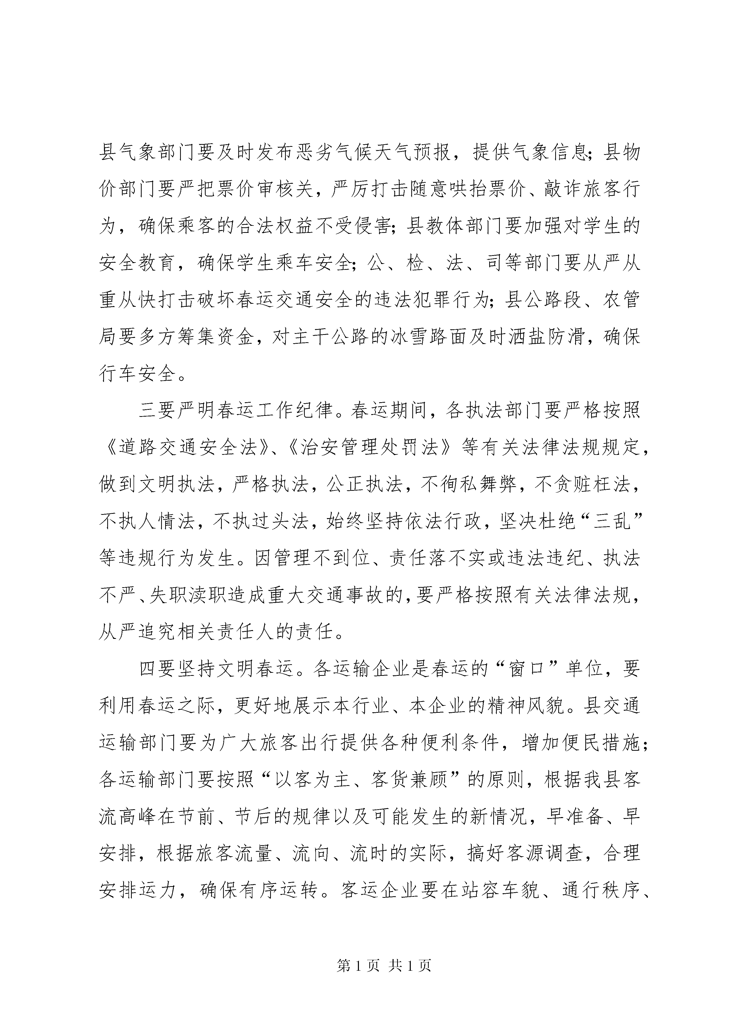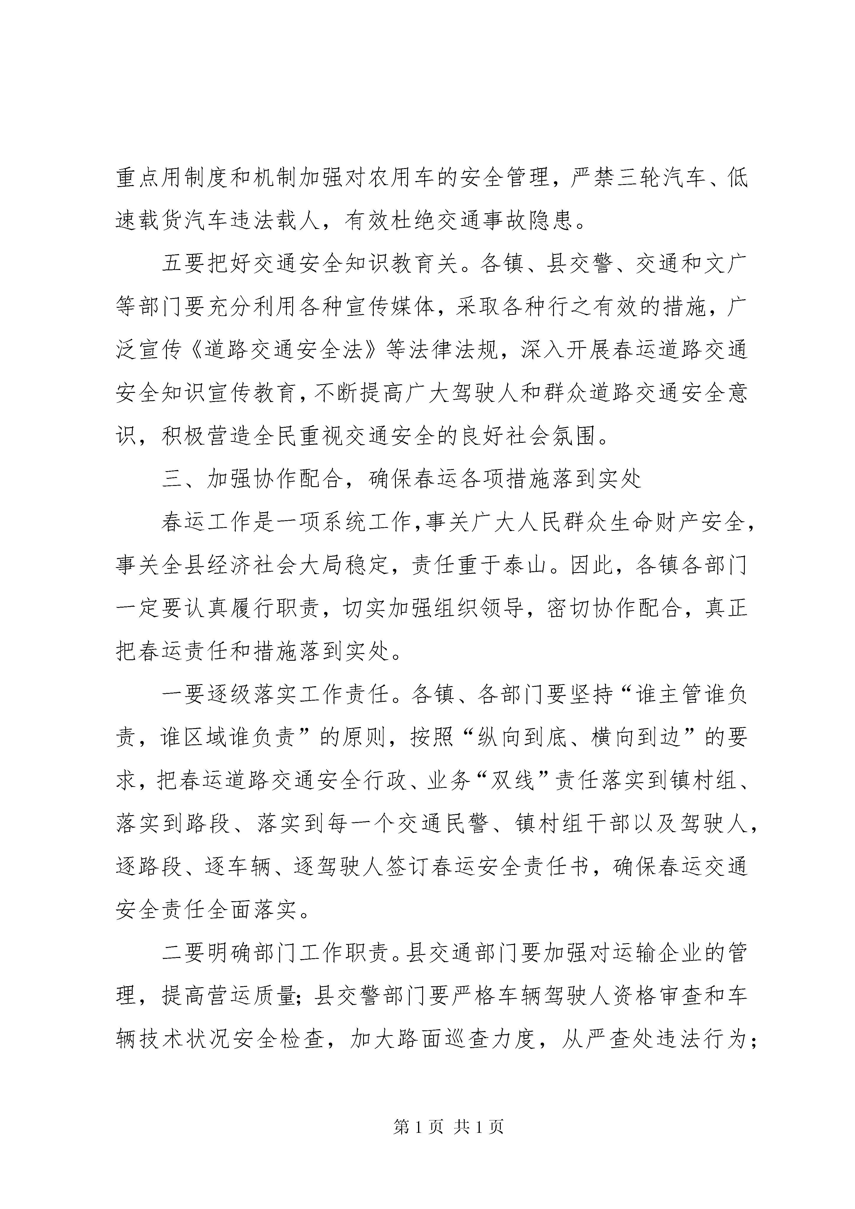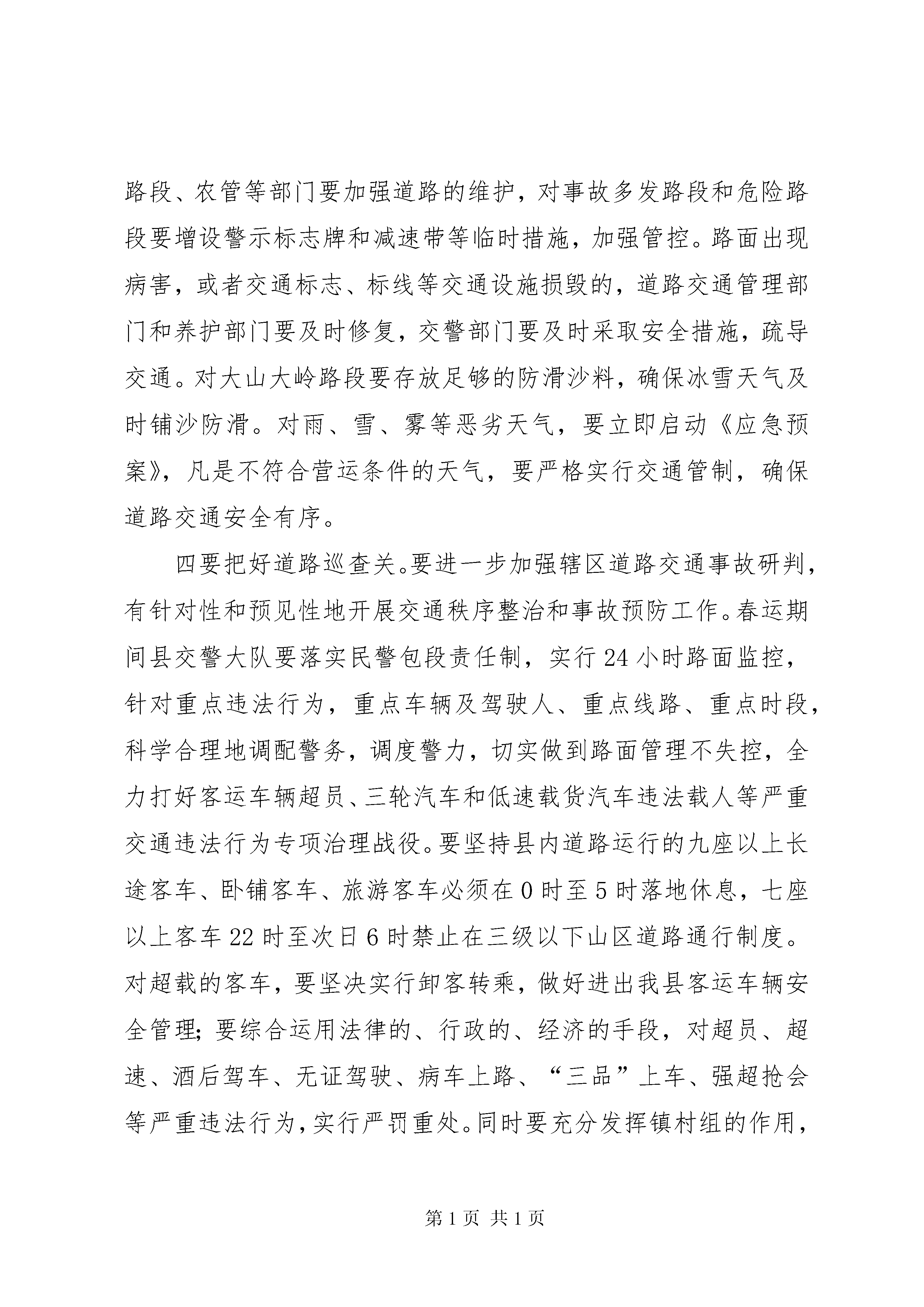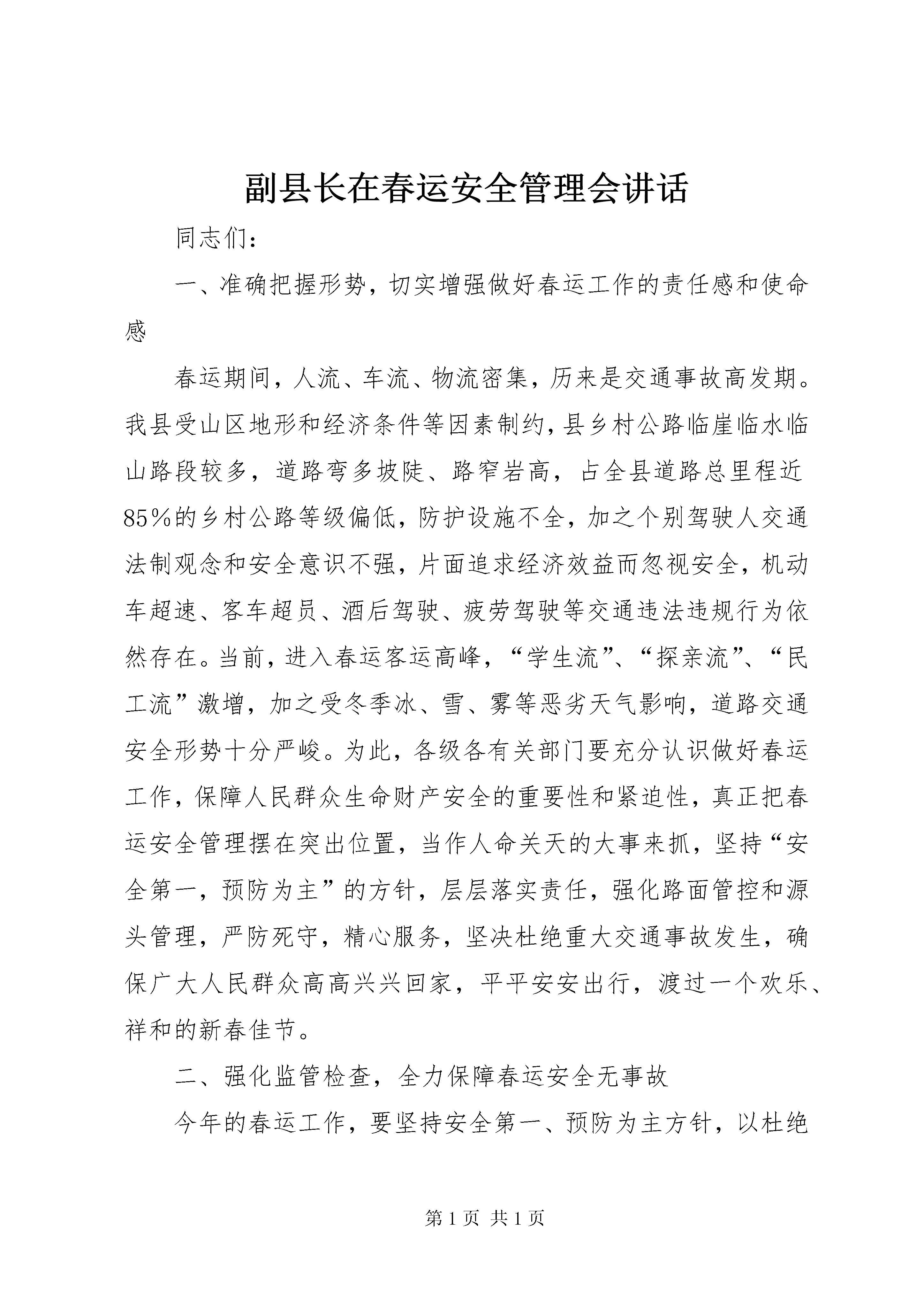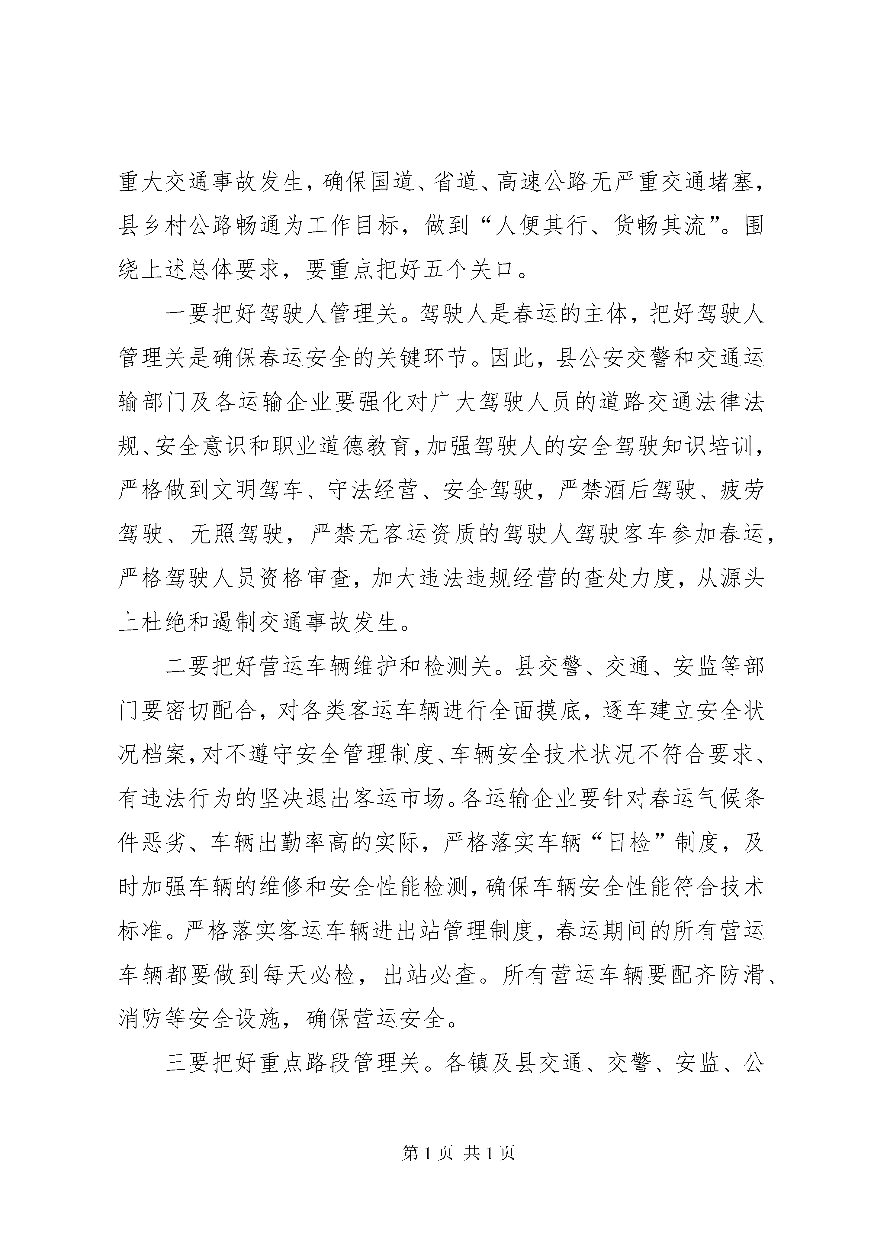 副县长在春运安全管理会讲话同志们:一、准确把握形势,切实增强做好春运工作的责任感和使命感春运期间,人流、车流、物流密集,历来是交通事故高发期。我县受山区地形和经济条件等因素制约,县乡村公路临崖临水临山路段较多,道路弯多坡陡、路窄岩高,占全县道路总里程近85%的乡村公路等级偏低,防护设施不全,加之个别驾驶人交通法制观念和安全意识不强,片面追求经济效益而忽视安全,机动车超速、客车超员、酒后驾驶、疲劳驾驶等交通违法违规行为依然存在。当前,进入春运客运高峰,“学生流”、“探亲流”、“民工流”激增,加之受冬季冰、雪、雾等恶劣天气影响,道路交通安全形势十分严峻。为此,各级各有关部门要充分认识做好春运工作,保障人民群众生命财产安全的重要性和紧迫性,真正把春运安全管理摆在突出位置,当作人命关天的大事来抓,坚持“安全第一,预防为主”的方针,层层落实责任,强化路面管控和源头管理,严防死守,精心服务,坚决杜绝重大交通事故发生,确保广大人民群众高高兴兴回家,平平安安出行,渡过一个欢乐、祥和的新春佳节。二、强化监管检查,全力保障春运安全无事故今年的春运工作,要坚持安全第一、预防为主方针,以杜绝重大交通事故发生,确保国道、省道、高速公路无严重交通堵塞,县乡村公路畅通为工作目标,做到“人便其行、货畅其流”。围绕上述总体要求,要重点把好五个关口。一要把好驾驶人管理关。驾驶人是春运的主体,把好驾驶人管理关是确保春运安全的关键环节。因此,县公安交警和交通运输部门及各运输企业要强化对广大驾驶人员的道路交通法律法规、安全意识和职业道德教育,加强驾驶人的安全驾驶知识培训,严格做到文明驾车、守法经营、安全驾驶,严禁酒后驾驶、疲劳驾驶、无照驾驶,严禁无客运资质的驾驶人驾驶客车参加春运,严格驾驶人员资格审查,加大违法违规经营的查处力度,从源头上杜绝和遏制交通事故发生。二要把好营运车辆维护和检测关。县交警、交通、安监等部门要密切配合,对各类客运车辆进行全面摸底,逐车建立安全状况档案,对不遵守安全管理制度、车辆安全技术状况不符合要求、有违法行为的坚决退出客运市场。各运输企业要针对春运气候条件恶劣、车辆出勤率高的实际,严格落实车辆“日检”制度,及时加强车辆的维修和安全性能检测,确保车辆安全性能符合技术标准。严格落实客运车辆进出站管理制度,春运期间的所有营运车辆都要做到每天必检,出站必查。所有营运车辆要配齐防滑、消防等安全设施,确保营运安全。三要把好重点路段管理关。各镇及县交通、交警、安监、公路段、农管等部门要加强道路的维护,对事故多发路段和危险路段要增设警示标志牌和减速带等临时措施,加强管控。路面出现病害,或者交通标志、标线等交通设施损毁的,道路交通管理部门和养护部门要及时修复,交警部门要及时采取安全措施,疏导交通。对大山大岭路段要存放足够的防滑沙料,确保冰雪天气及时铺沙防滑。对雨、雪、雾等恶劣天气,要立即启动《应急预案》,凡是不符合营运条件的天气,要严格实行交通管制,确保道路交通安全有序。四要把好道路巡查关。要进一步加强辖区道路交通事故研判,有针对性和预见性地开展交通秩序整治和事故预防工作。春运期间县交警大队要落实民警包段责任制,实行24小时路面监控,针对重点违法行为,重点车辆及驾驶人、重点线路、重点时段,科学合理地调配警务,调度警力,切实做到路面管理不失控,全力打好客运车辆超员、三轮汽车和低速载货汽车违法载人等严重交通违法行为专项治理战役。要坚持县内道路运行的九座以上长途客车、卧铺客车、旅游客车必须在0时至5时落地休息,七座以上客车22时至次日6时禁止在三级以下山区道路通行制度。对超载的客车,要坚决实行卸客转乘,做好进出我县客运车辆安全管理;要综合运用法律的、行政的、经济的手段,对超员、超速、酒后驾车、无证驾驶、病车上路、“三品”上车、强超抢会等严重违法行为,实行严罚重处。同时要充分发挥镇村组的作用,重点用制度和机制加强对农用车的安全管理,严禁三轮汽车、低速载货汽车违法载人,有效杜绝交通事故隐患。五要把好交通安全知识教育关。各镇、县交警、交通和文广等部门要充分利用各种宣传媒体,采取各种行之有效的措施,广泛宣传《道路交通安全法》等法律法规,深入开展春运道路交通安全知识宣传教育,不断提高广大驾驶人和群众道路交通安全意识,积极营造全民重视交通安全的良好社会氛围。三、加强协作配合,确保春运各项措施落到实处春运工作是一项系统工作,事关广大人民群众生命财产安全,事关全县经济社会大局稳定,责任重于泰山。因此,各镇各部门一定要认真履行职责,切实加强组织领导,密切协作配合,真正把春运责任和措施落到实处。一要逐级落实工作责任。各镇、各部门要坚持“谁主管谁负责,谁区域谁负责”的原则,按照“纵向到底、横向到边”的要求,把春运道路交通安全行政、业务“双线”责任落实到镇村组、落