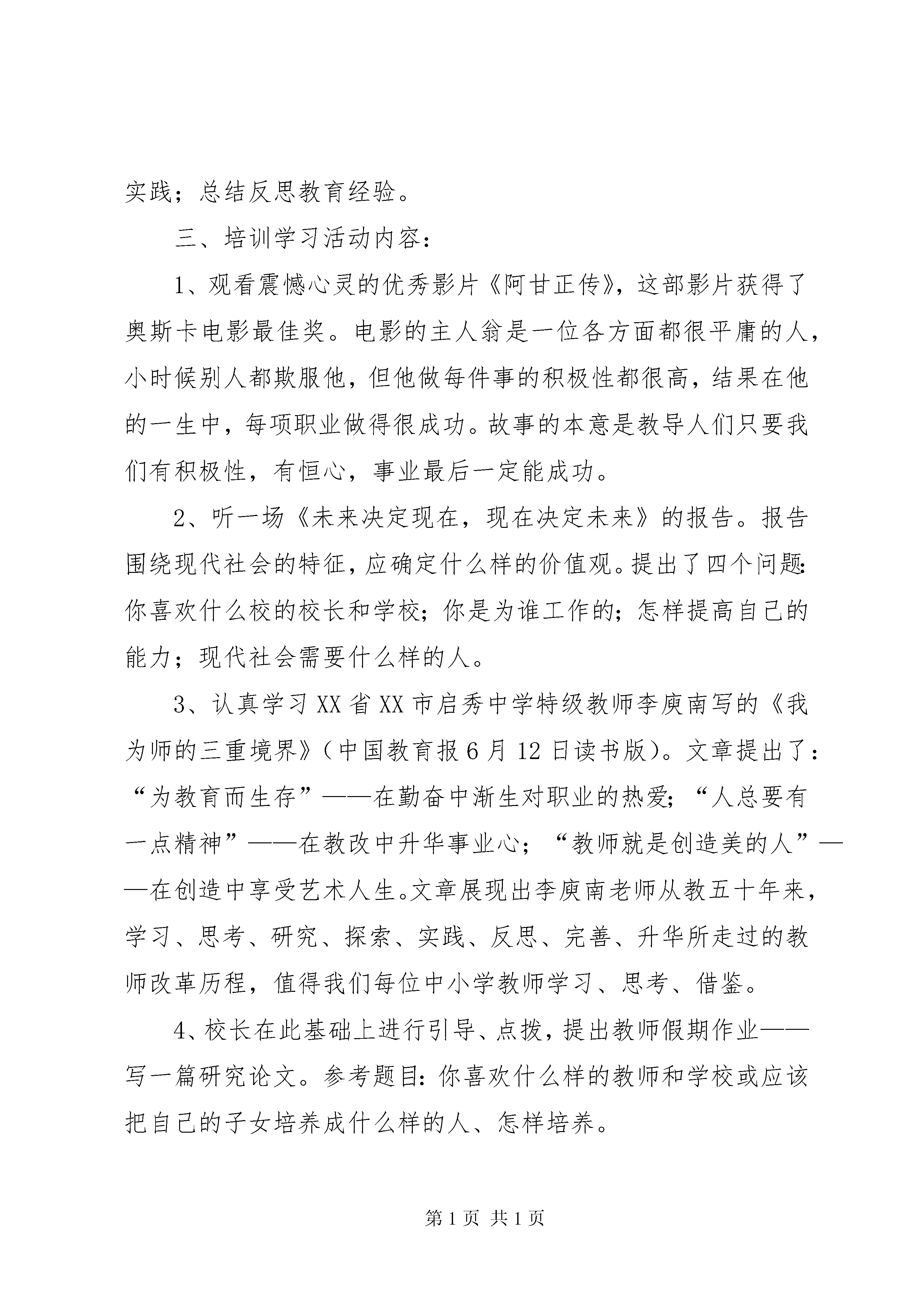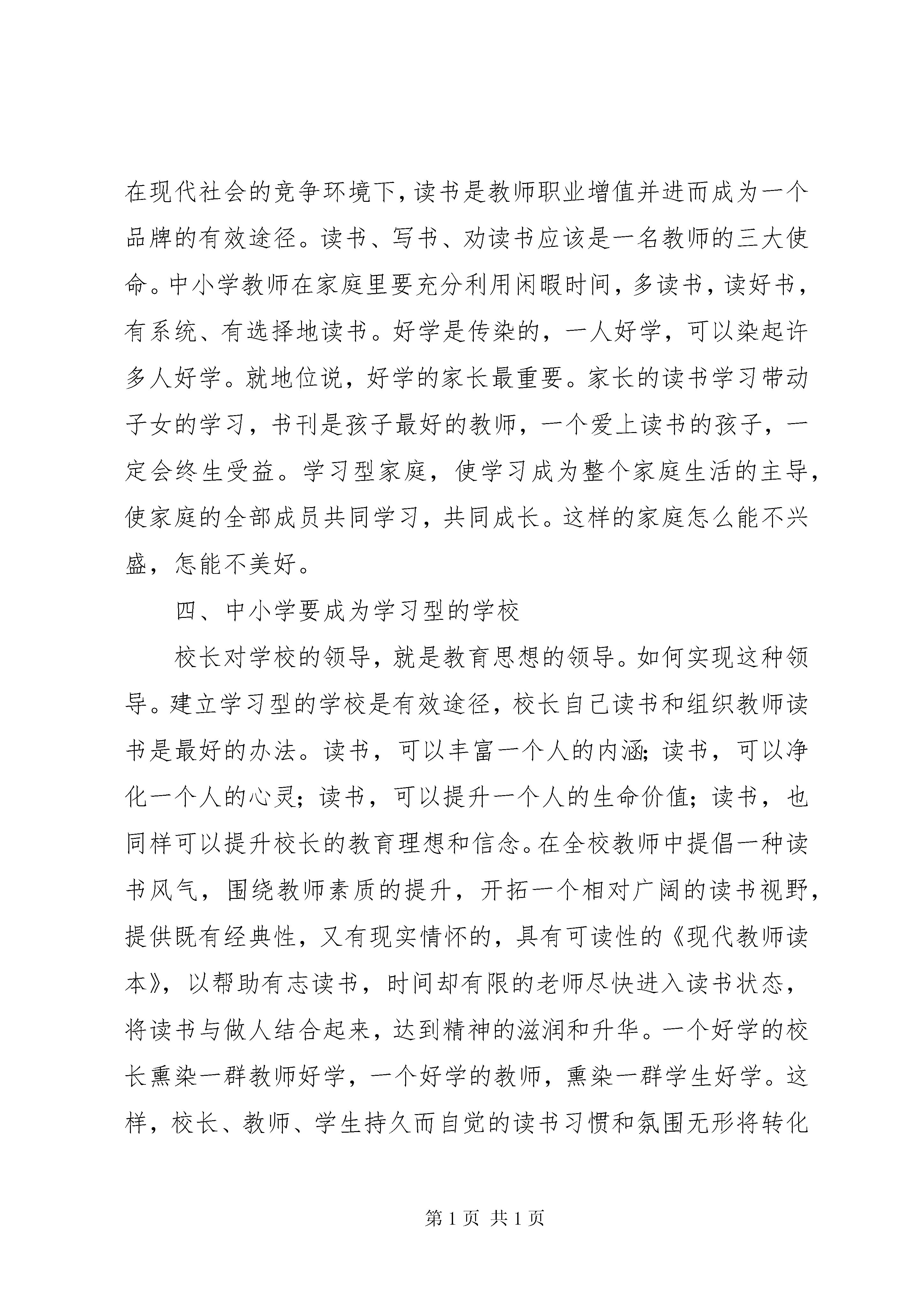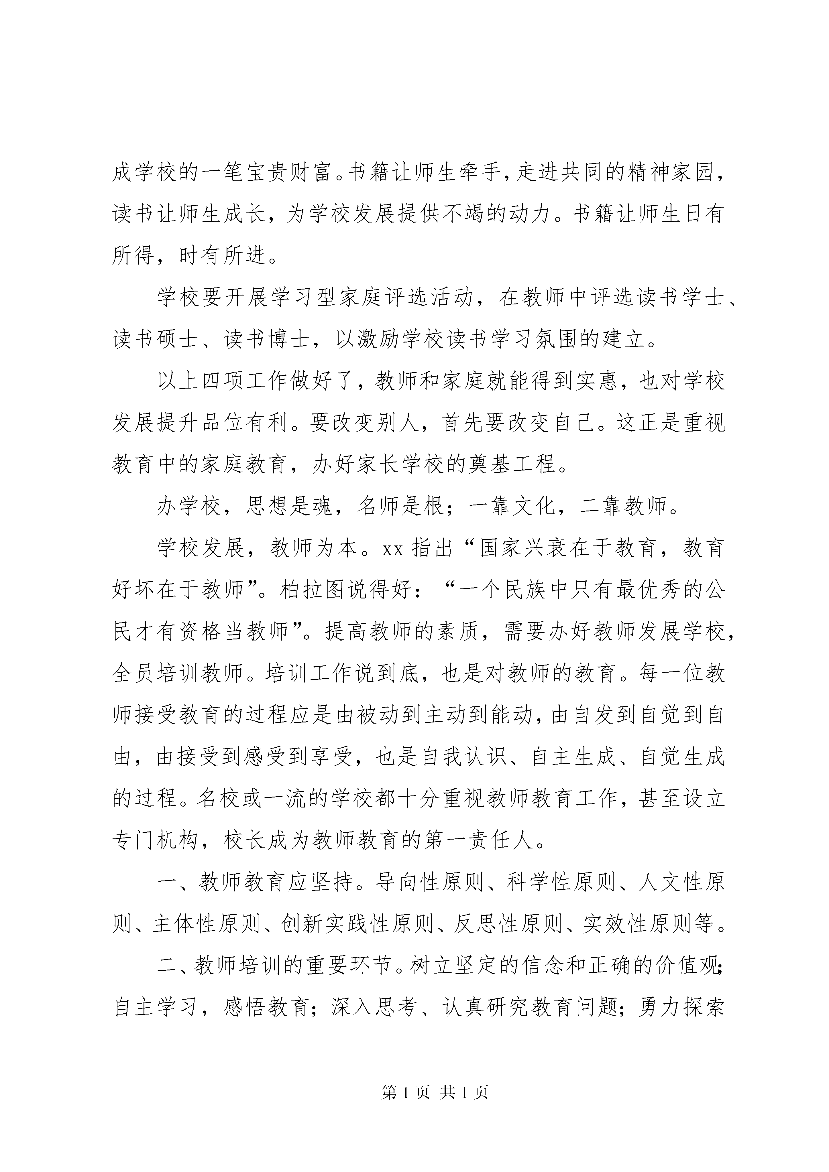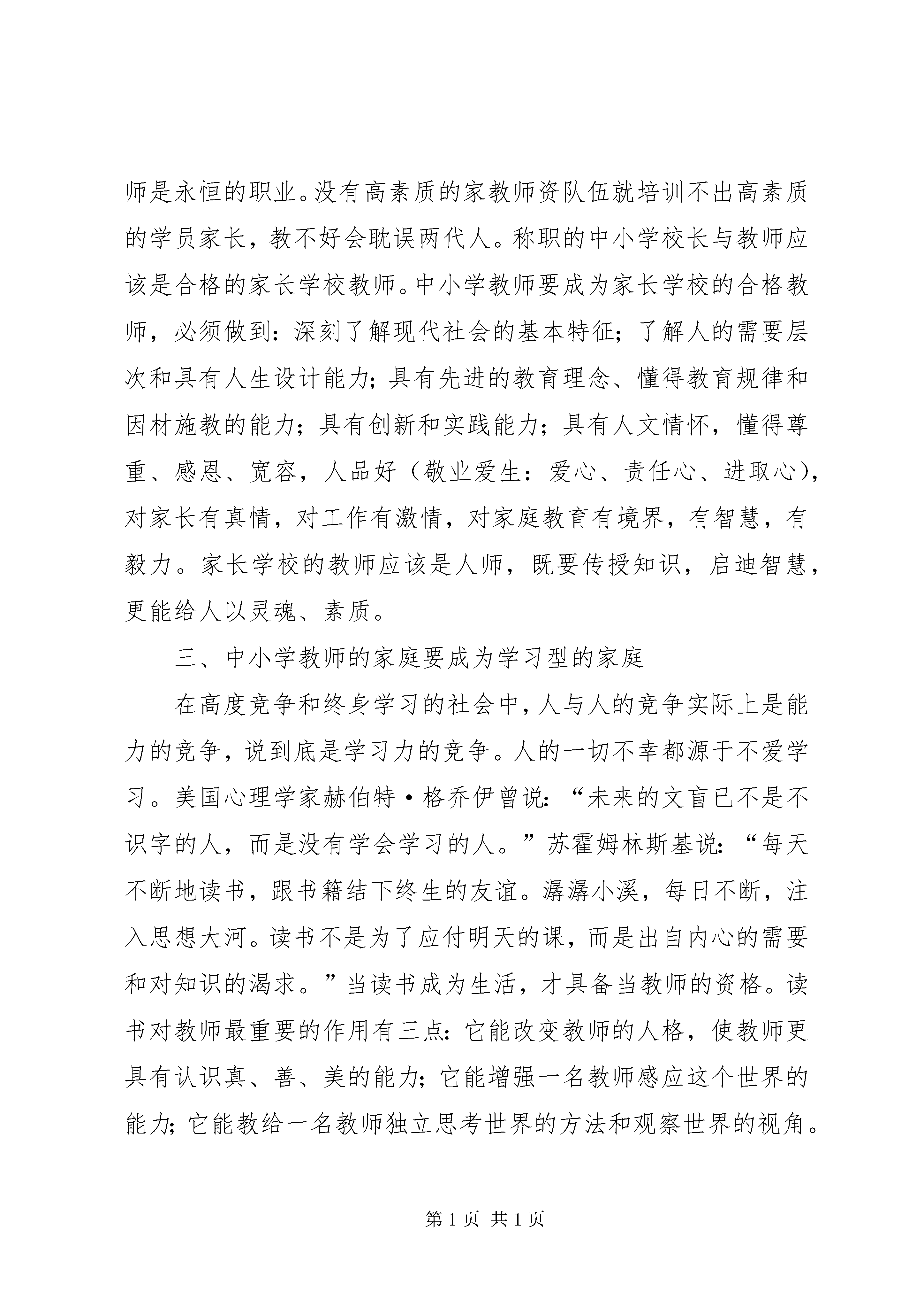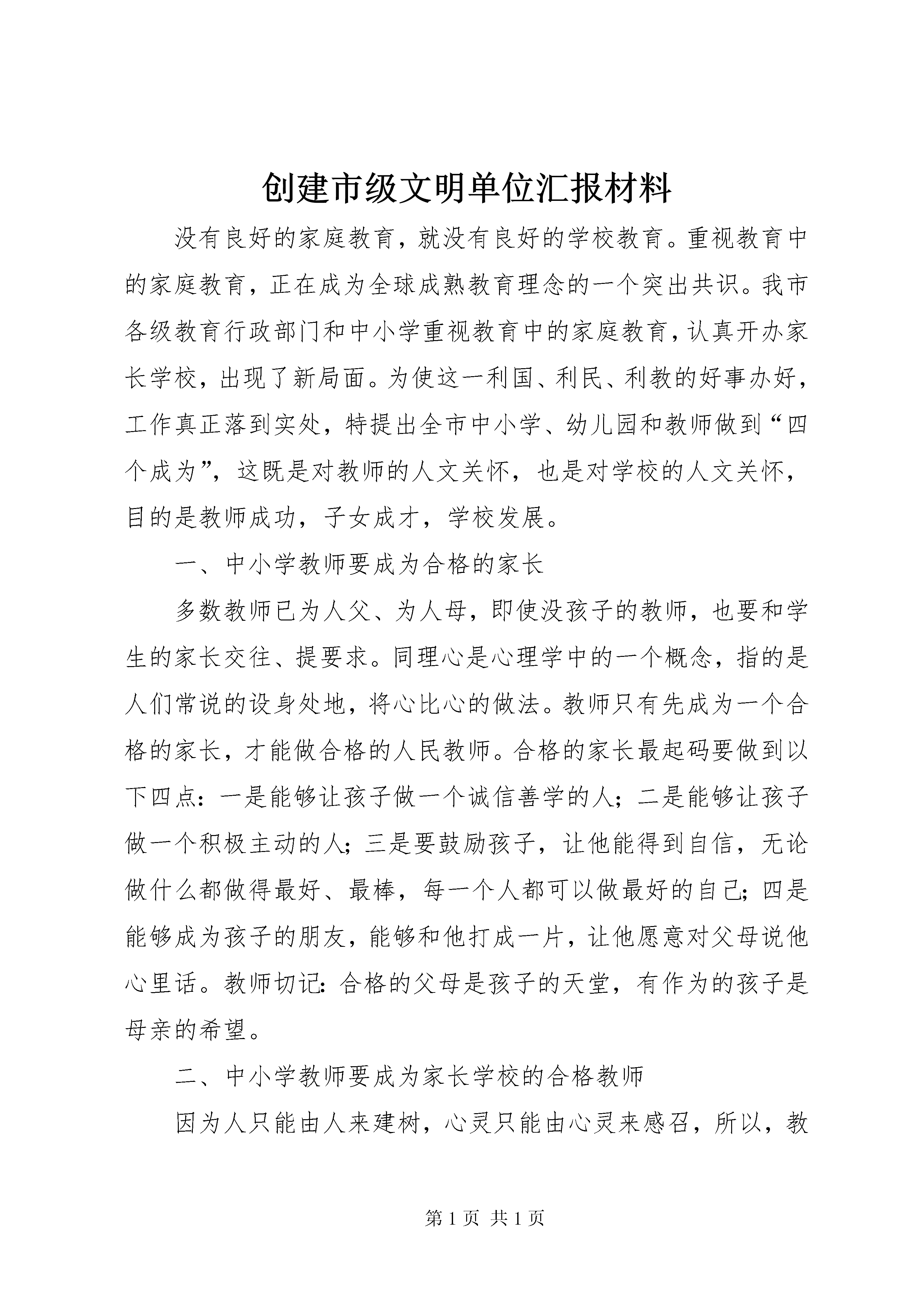 创建市级文明单位汇报材料没有良好的家庭教育,就没有良好的学校教育。重视教育中的家庭教育,正在成为全球成熟教育理念的一个突出共识。我市各级教育行政部门和中小学重视教育中的家庭教育,认真开办家长学校,出现了新局面。为使这一利国、利民、利教的好事办好,工作真正落到实处,特提出全市中小学、幼儿园和教师做到“四个成为”,这既是对教师的人文关怀,也是对学校的人文关怀,目的是教师成功,子女成才,学校发展。一、中小学教师要成为合格的家长多数教师已为人父、为人母,即使没孩子的教师,也要和学生的家长交往、提要求。同理心是心理学中的一个概念,指的是人们常说的设身处地,将心比心的做法。教师只有先成为一个合格的家长,才能做合格的人民教师。合格的家长最起码要做到以下四点:一是能够让孩子做一个诚信善学的人;二是能够让孩子做一个积极主动的人;三是要鼓励孩子,让他能得到自信,无论做什么都做得最好、最棒,每一个人都可以做最好的自己;四是能够成为孩子的朋友,能够和他打成一片,让他愿意对父母说他心里话。教师切记:合格的父母是孩子的天堂,有作为的孩子是母亲的希望。二、中小学教师要成为家长学校的合格教师因为人只能由人来建树,心灵只能由心灵来感召,所以,教师是永恒的职业。没有高素质的家教师资队伍就培训不出高素质的学员家长,教不好会耽误两代人。称职的中小学校长与教师应该是合格的家长学校教师。中小学教师要成为家长学校的合格教师,必须做到:深刻了解现代社会的基本特征;了解人的需要层次和具有人生设计能力;具有先进的教育理念、懂得教育规律和因材施教的能力;具有创新和实践能力;具有人文情怀,懂得尊重、感恩、宽容,人品好(敬业爱生:爱心、责任心、进取心),对家长有真情,对工作有激情,对家庭教育有境界,有智慧,有毅力。家长学校的教师应该是人师,既要传授知识,启迪智慧,更能给人以灵魂、素质。三、中小学教师的家庭要成为学习型的家庭在高度竞争和终身学习的社会中,人与人的竞争实际上是能力的竞争,说到底是学习力的竞争。人的一切不幸都源于不爱学习。美国心理学家赫伯特·格乔伊曾说:“未来的文盲已不是不识字的人,而是没有学会学习的人。”苏霍姆林斯基说:“每天不断地读书,跟书籍结下终生的友谊。潺潺小溪,每日不断,注入思想大河。读书不是为了应付明天的课,而是出自内心的需要和对知识的渴求。”当读书成为生活,才具备当教师的资格。读书对教师最重要的作用有三点:它能改变教师的人格,使教师更具有认识真、善、美的能力;它能增强一名教师感应这个世界的能力;它能教给一名教师独立思考世界的方法和观察世界的视角。在现代社会的竞争环境下,读书是教师职业增值并进而成为一个品牌的有效途径。读书、写书、劝读书应该是一名教师的三大使命。中小学教师在家庭里要充分利用闲暇时间,多读书,读好书,有系统、有选择地读书。好学是传染的,一人好学,可以染起许多人好学。就地位说,好学的家长最重要。家长的读书学习带动子女的学习,书刊是孩子最好的教师,一个爱上读书的孩子,一定会终生受益。学习型家庭,使学习成为整个家庭生活的主导,使家庭的全部成员共同学习,共同成长。这样的家庭怎么能不兴盛,怎能不美好。四、中小学要成为学习型的学校校长对学校的领导,就是教育思想的领导。如何实现这种领导。建立学习型的学校是有效途径,校长自己读书和组织教师读书是最好的办法。读书,可以丰富一个人的内涵;读书,可以净化一个人的心灵;读书,可以提升一个人的生命价值;读书,也同样可以提升校长的教育理想和信念。在全校教师中提倡一种读书风气,围绕教师素质的提升,开拓一个相对广阔的读书视野,提供既有经典性,又有现实情怀的,具有可读性的《现代教师读本》,以帮助有志读书,时间却有限的老师尽快进入读书状态,将读书与做人结合起来,达到精神的滋润和升华。一个好学的校长熏染一群教师好学,一个好学的教师,熏染一群学生好学。这样,校长、教师、学生持久而自觉的读书习惯和氛围无形将转化成学校的一笔宝贵财富。书籍让师生牵手,走进共同的精神家园,读书让师生成长,为学校发展提供不竭的动力。书籍让师生日有所得,时有所进。学校要开展学习型家庭评选活动,在教师中评选读书学士、读书硕士、读书博士,以激励学校读书学习氛围的建立。以上四项工作做好了,教师和家庭就能得到实惠,也对学校发展提升品位有利。要改变别人,首先要改变自己。这正是重视教育中的家庭教育,办好家长学校的奠基工程。办学校,思想是魂,名师是根;一靠文化,二靠教师。学校发展,教师为本。xx指出“国家兴衰在于教育,教育好坏在于教师”。柏拉图说得好:“一个民族中只有最优秀的公民才有资格当教师”。提高教师的素质,需要办好教师发展学校,全员培训教师。培训工作说到底,也是对教师的教育。每一位教师接受教育的过程应是由被动到主动到能动,由自发到自觉到自由,由接受