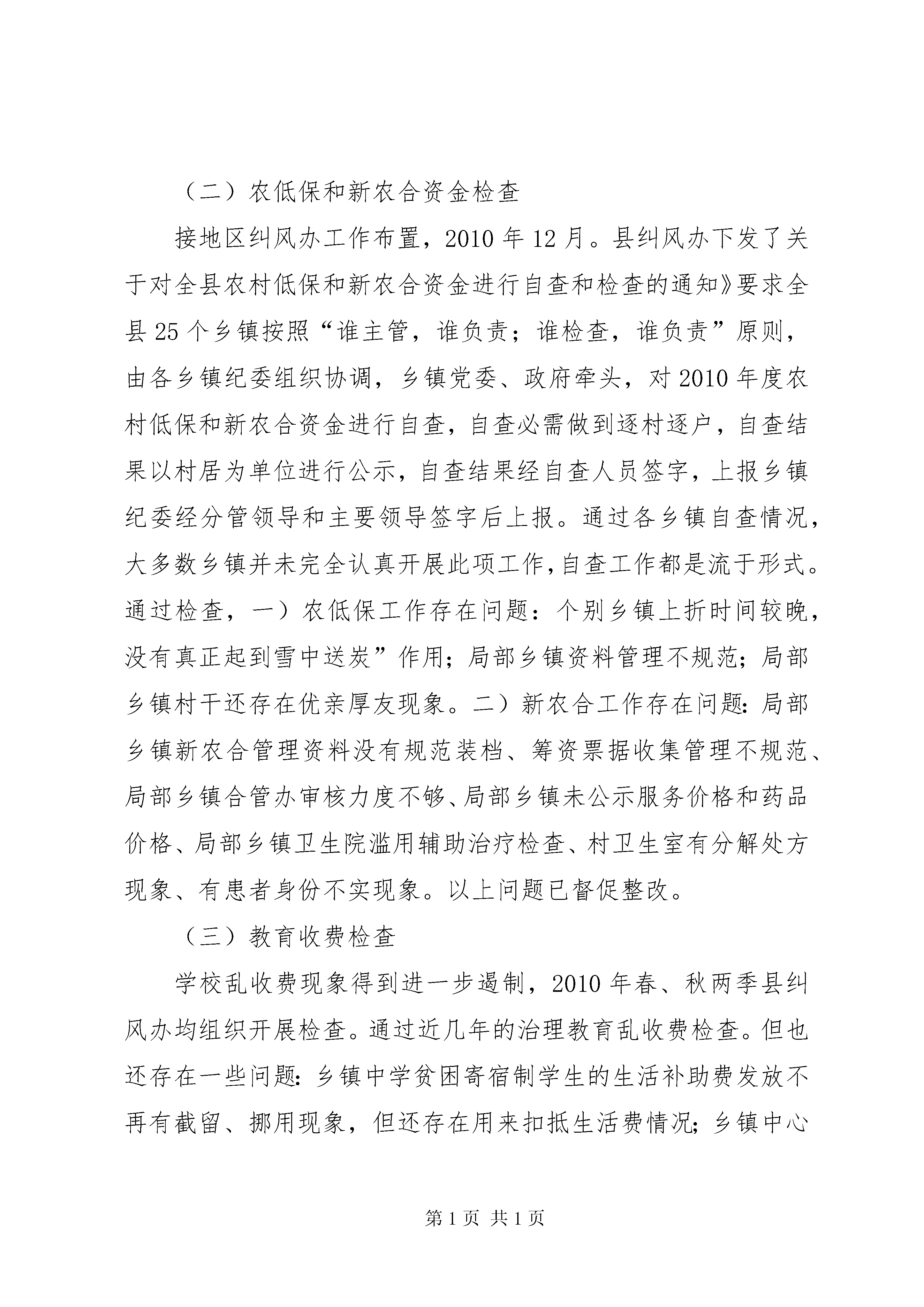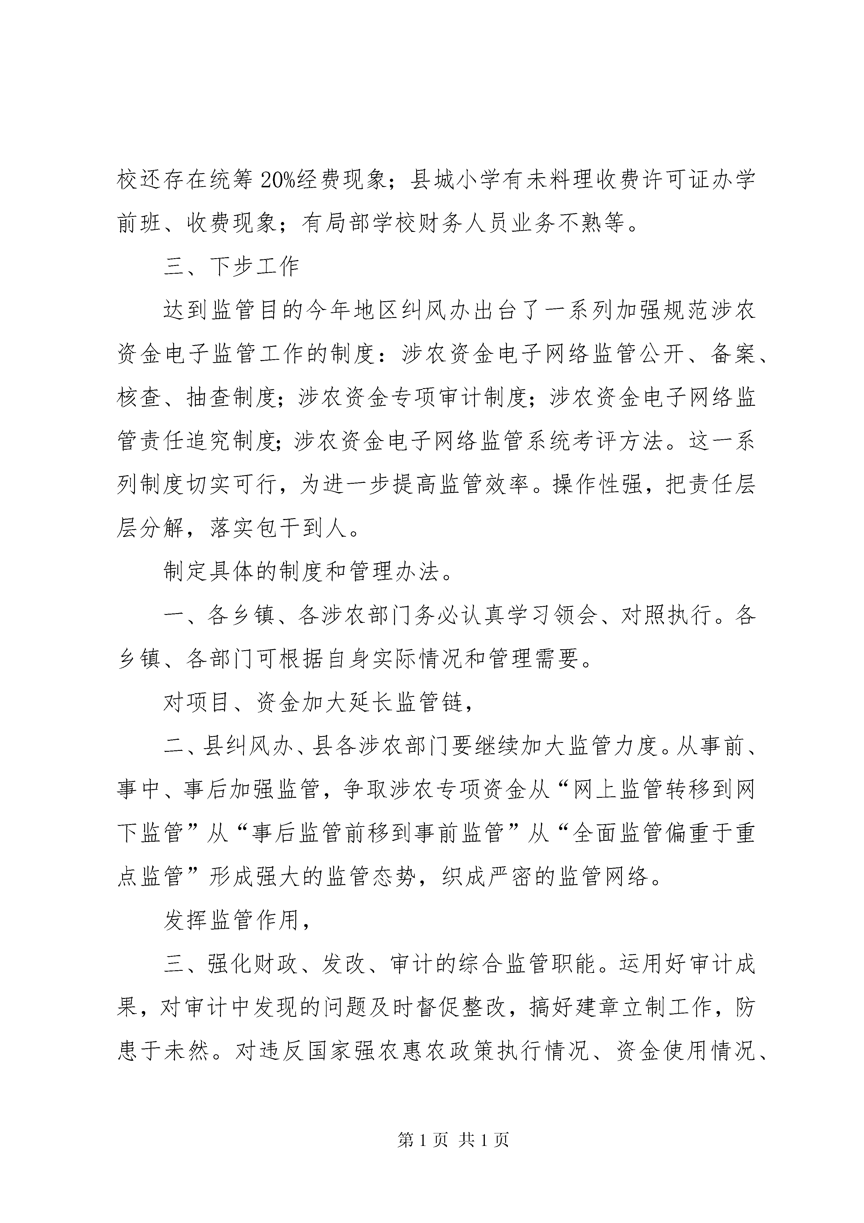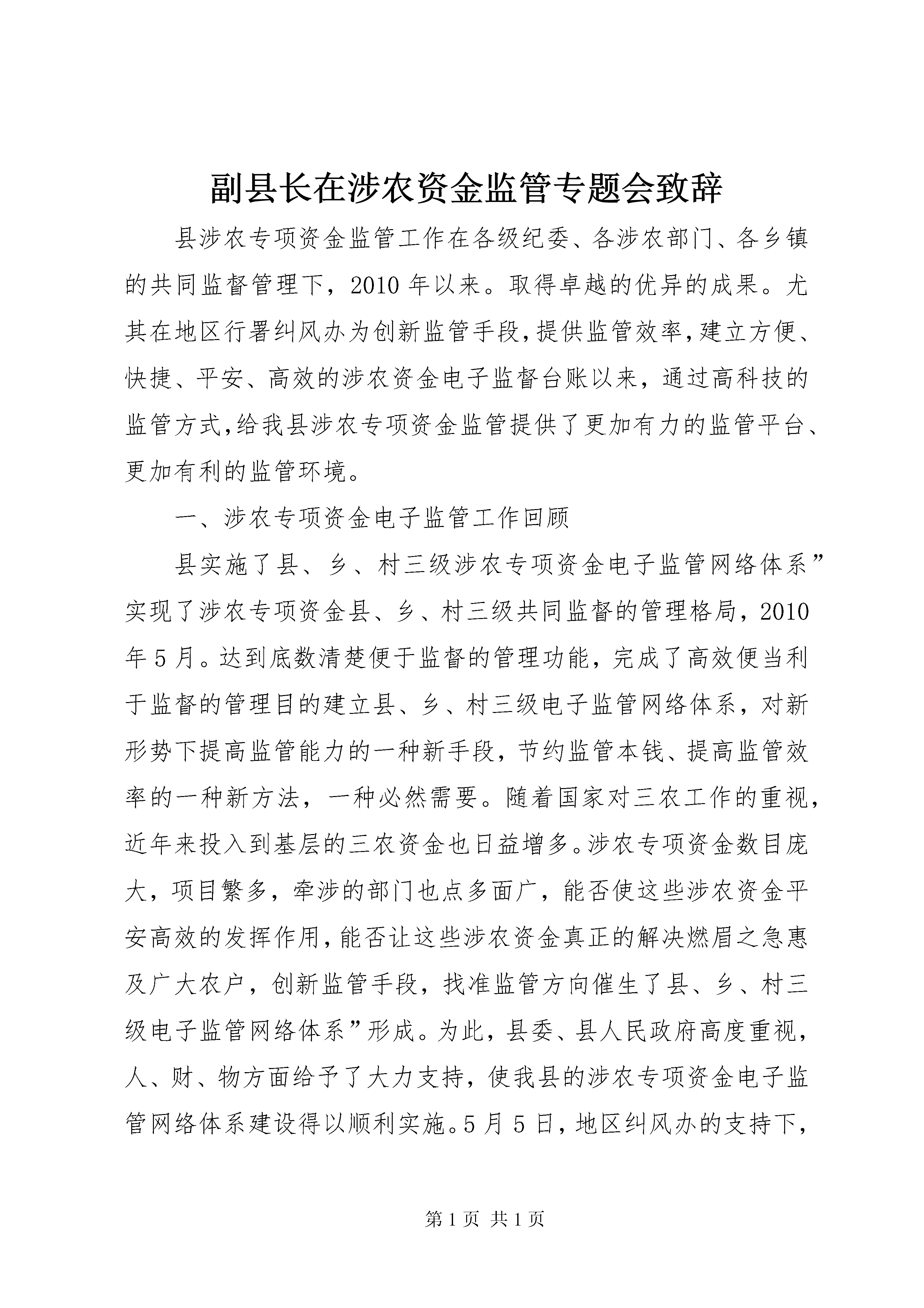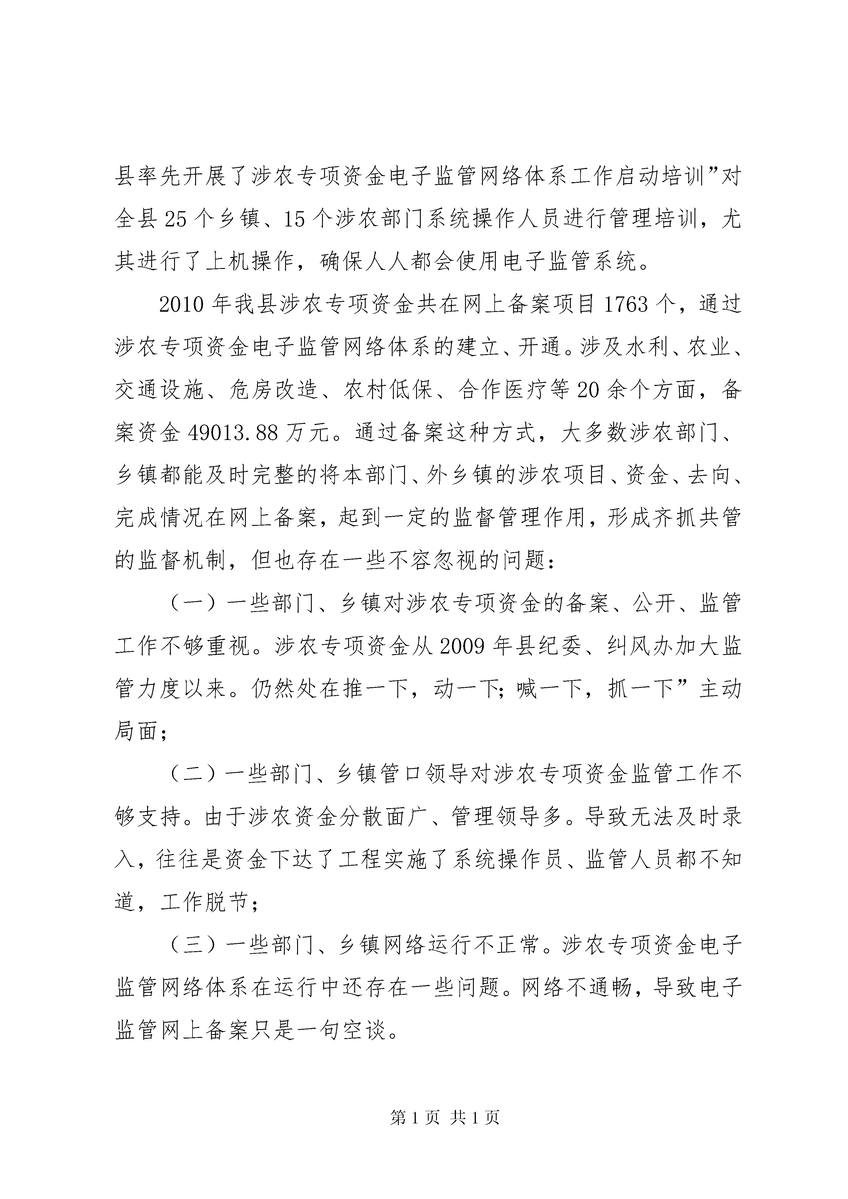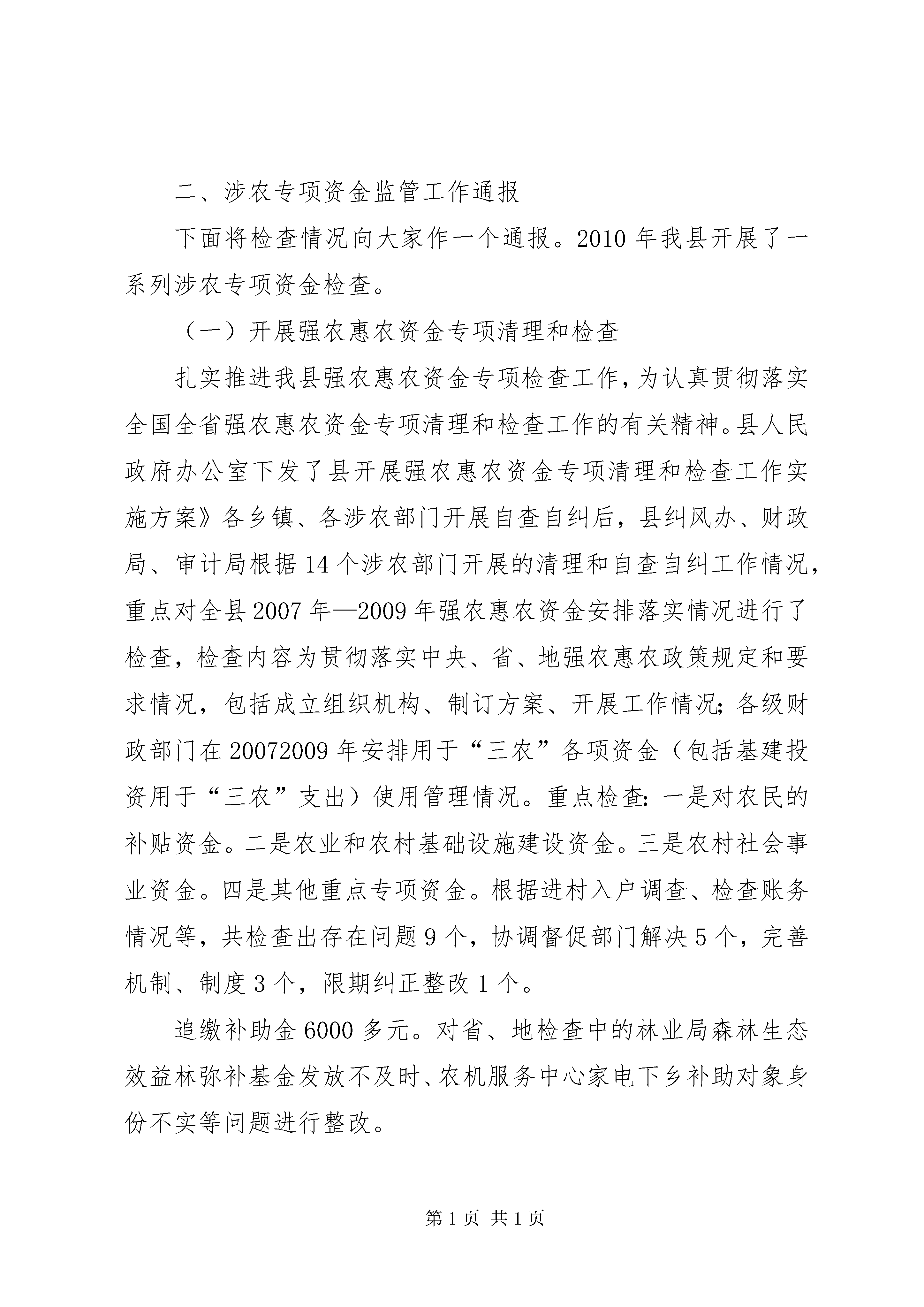 副县长在涉农资金监管专题会致辞县涉农专项资金监管工作在各级纪委、各涉农部门、各乡镇的共同监督管理下,2010年以来。取得卓越的优异的成果。尤其在地区行署纠风办为创新监管手段,提供监管效率,建立方便、快捷、平安、高效的涉农资金电子监督台账以来,通过高科技的监管方式,给我县涉农专项资金监管提供了更加有力的监管平台、更加有利的监管环境。一、涉农专项资金电子监管工作回顾县实施了县、乡、村三级涉农专项资金电子监管网络体系”实现了涉农专项资金县、乡、村三级共同监督的管理格局,2010年5月。达到底数清楚便于监督的管理功能,完成了高效便当利于监督的管理目的建立县、乡、村三级电子监管网络体系,对新形势下提高监管能力的一种新手段,节约监管本钱、提高监管效率的一种新方法,一种必然需要。随着国家对三农工作的重视,近年来投入到基层的三农资金也日益增多。涉农专项资金数目庞大,项目繁多,牵涉的部门也点多面广,能否使这些涉农资金平安高效的发挥作用,能否让这些涉农资金真正的解决燃眉之急惠及广大农户,创新监管手段,找准监管方向催生了县、乡、村三级电子监管网络体系”形成。为此,县委、县人民政府高度重视,人、财、物方面给予了大力支持,使我县的涉农专项资金电子监管网络体系建设得以顺利实施。5月5日,地区纠风办的支持下,县率先开展了涉农专项资金电子监管网络体系工作启动培训”对全县25个乡镇、15个涉农部门系统操作人员进行管理培训,尤其进行了上机操作,确保人人都会使用电子监管系统。2010年我县涉农专项资金共在网上备案项目1763个,通过涉农专项资金电子监管网络体系的建立、开通。涉及水利、农业、交通设施、危房改造、农村低保、合作医疗等20余个方面,备案资金49013.88万元。通过备案这种方式,大多数涉农部门、乡镇都能及时完整的将本部门、外乡镇的涉农项目、资金、去向、完成情况在网上备案,起到一定的监督管理作用,形成齐抓共管的监督机制,但也存在一些不容忽视的问题:(一)一些部门、乡镇对涉农专项资金的备案、公开、监管工作不够重视。涉农专项资金从2009年县纪委、纠风办加大监管力度以来。仍然处在推一下,动一下;喊一下,抓一下”主动局面;(二)一些部门、乡镇管口领导对涉农专项资金监管工作不够支持。由于涉农资金分散面广、管理领导多。导致无法及时录入,往往是资金下达了工程实施了系统操作员、监管人员都不知道,工作脱节;(三)一些部门、乡镇网络运行不正常。涉农专项资金电子监管网络体系在运行中还存在一些问题。网络不通畅,导致电子监管网上备案只是一句空谈。二、涉农专项资金监管工作通报下面将检查情况向大家作一个通报。2010年我县开展了一系列涉农专项资金检查。(一)开展强农惠农资金专项清理和检查扎实推进我县强农惠农资金专项检查工作,为认真贯彻落实全国全省强农惠农资金专项清理和检查工作的有关精神。县人民政府办公室下发了县开展强农惠农资金专项清理和检查工作实施方案》各乡镇、各涉农部门开展自查自纠后,县纠风办、财政局、审计局根据14个涉农部门开展的清理和自查自纠工作情况,重点对全县2007年—2009年强农惠农资金安排落实情况进行了检查,检查内容为贯彻落实中央、省、地强农惠农政策规定和要求情况,包括成立组织机构、制订方案、开展工作情况;各级财政部门在20072009年安排用于“三农”各项资金(包括基建投资用于“三农”支出)使用管理情况。重点检查:一是对农民的补贴资金。二是农业和农村基础设施建设资金。三是农村社会事业资金。四是其他重点专项资金。根据进村入户调查、检查账务情况等,共检查出存在问题9个,协调督促部门解决5个,完善机制、制度3个,限期纠正整改1个。追缴补助金6000多元。对省、地检查中的林业局森林生态效益林弥补基金发放不及时、农机服务中心家电下乡补助对象身份不实等问题进行整改。(二)农低保和新农合资金检查接地区纠风办工作布置,2010年12月。县纠风办下发了关于对全县农村低保和新农合资金进行自查和检查的通知》要求全县25个乡镇按照“谁主管,谁负责;谁检查,谁负责”原则,由各乡镇纪委组织协调,乡镇党委、政府牵头,对2010年度农村低保和新农合资金进行自查,自查必需做到逐村逐户,自查结果以村居为单位进行公示,自查结果经自查人员签字,上报乡镇纪委经分管领导和主要领导签字后上报。通过各乡镇自查情况,大多数乡镇并未完全认真开展此项工作,自查工作都是流于形式。通过检查,一)农低保工作存在问题:个别乡镇上折时间较晚,没有真正起到雪中送炭”作用;局部乡镇资料管理不规范;局部乡镇村干还存在优亲厚友现象。二)新农合工作存在问题:局部乡镇新农合管理资料没有规范装档、筹资票据收集管理不规范、局部乡镇合管办审核力度不够、局部乡镇未公示服务价格和药品价格、局部乡镇卫生院滥用辅助治疗检查、村卫
