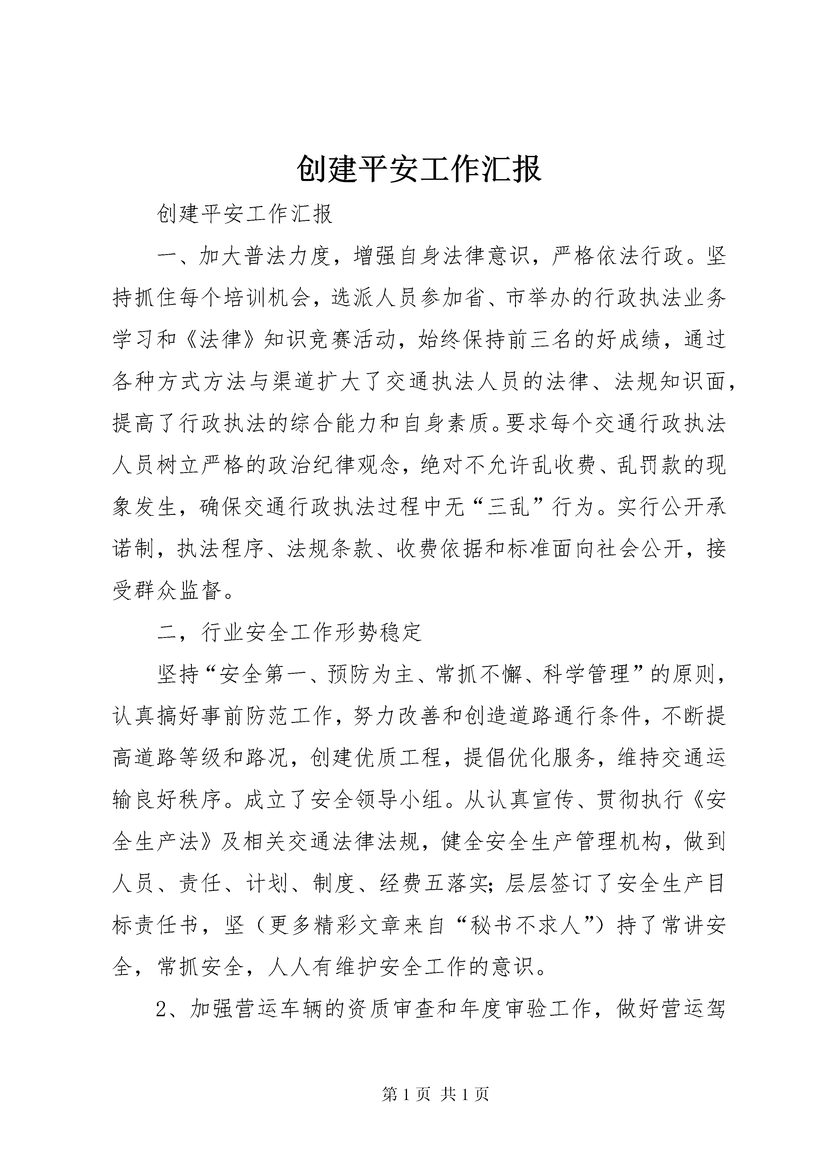 创建平安工作汇报创建平安工作汇报一、加大普法力度,增强自身法律意识,严格依法行政。坚持抓住每个培训机会,选派人员参加省、市举办的行政执法业务学习和《法律》知识竞赛活动,始终保持前三名的好成绩,通过各种方式方法与渠道扩大了交通执法人员的法律、法规知识面,提高了行政执法的综合能力和自身素质。要求每个交通行政执法人员树立严格的政治纪律观念,绝对不允许乱收费、乱罚款的现象发生,确保交通行政执法过程中无“三乱”行为。实行公开承诺制,执法程序、法规条款、收费依据和标准面向社会公开,接受群众监督。二,行业安全工作形势稳定坚持“安全第一、预防为主、常抓不懈、科学管理”的原则,认真搞好事前防范工作,努力改善和创造道路通行条件,不断提高道路等级和路况,创建优质工程,提倡优化服务,维持交通运输良好秩序。成立了安全领导小组。从认真宣传、贯彻执行《安全生产法》及相关交通法律法规,健全安全生产管理机构,做到人员、责任、计划、制度、经费五落实;层层签订了安全生产目标责任书,坚(更多精彩文章来自“秘书不求人”)持了常讲安全,常抓安全,人人有维护安全工作的意识。2、加强营运车辆的资质审查和年度审验工作,做好营运驾驶员从业资格培训管理,做到持证上岗,车辆检测不漏检,并如实填写检测报告。达不到安全行车技术要求的车辆,一律不准运行。车辆出站不超员,严格检查登记签字制度。3、加强超限运输检查工作,文明执法、严格管理。4、进一步督促乡镇政府完善乡镇船舶安全管理责任,加强船员的培训、船员适任证书的考核管理工作及船舶登记检验工作,做到不漏检,取缔私自造船和“三无”船舶。5、对渡口、公园、风景旅游区等水域的水上交通进行安全管理,实行现场监管,确保水上安全。6、认真组织开展各项专项治理整顿工作,开展季节性和经常性安全检查,组织行业检查每年不少于4次。7、加强道路养护和管理,及时处理路面各种病害,消除不安全隐患,对危险路段落实专人监控并设置警示标志。加大路政巡查力度,消除各种路障和非公路标牌,制止乱挖、乱占、乱建等蚕食公路的行为,积极创造安全文明的通行环境。8、必须建立重大事故隐患和危险源数据库,并进行严密监控。同时,制定科学的事故应急预案,提高处置突发事故的能力,努力把事故损失降低到最低限度。9、广泛开展安全生产宣传教育,组织大型安全生产宣传活动每年不少于2次,职工受教面达98%以上。加强安全生产管理人员业务培训和领导干部安全培训,认真组织好当年“安全生产月”、“交通安全宣传月”活动。10、半年和年终向县政府XX县区安委会办公室写出书面专题报告。