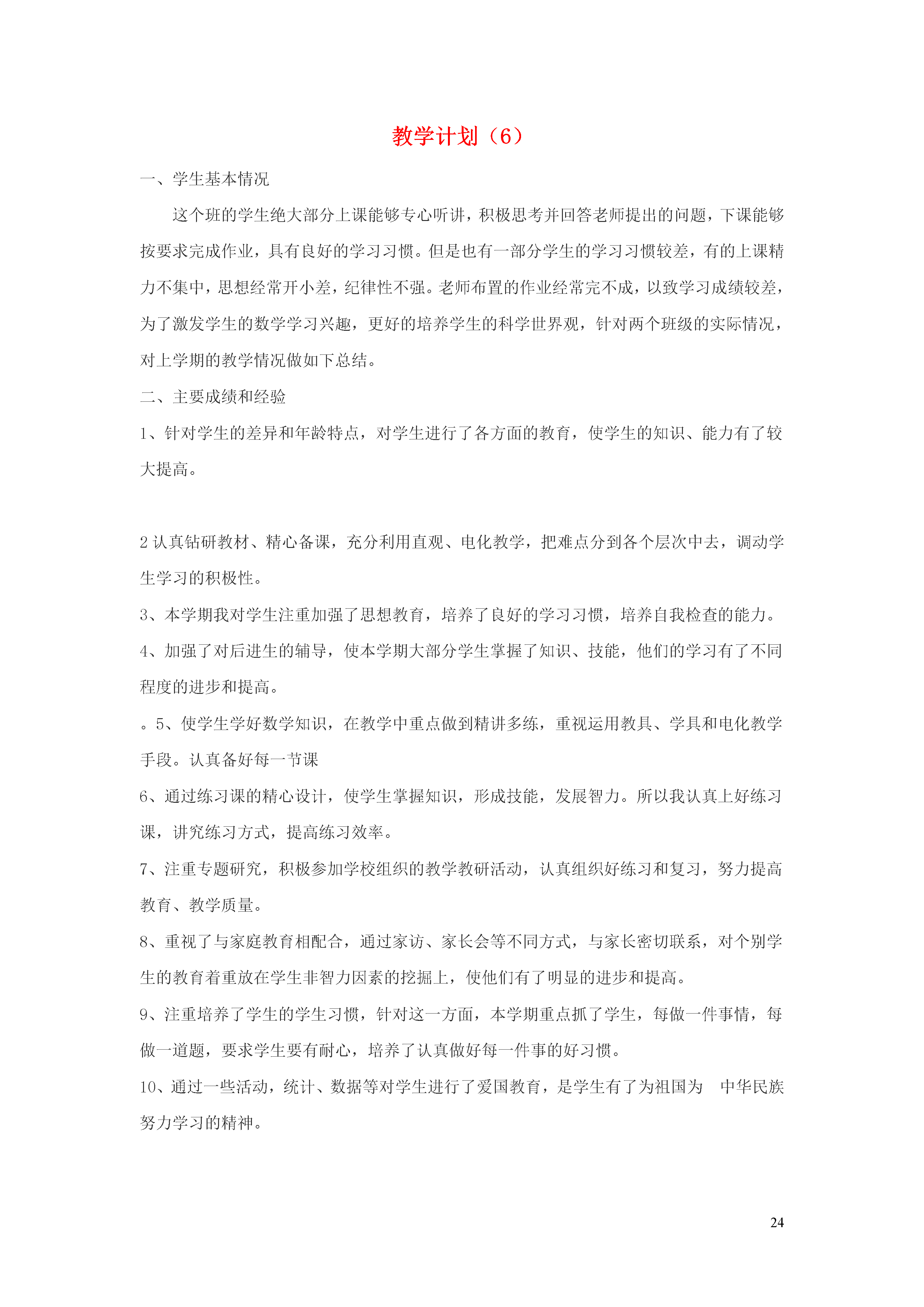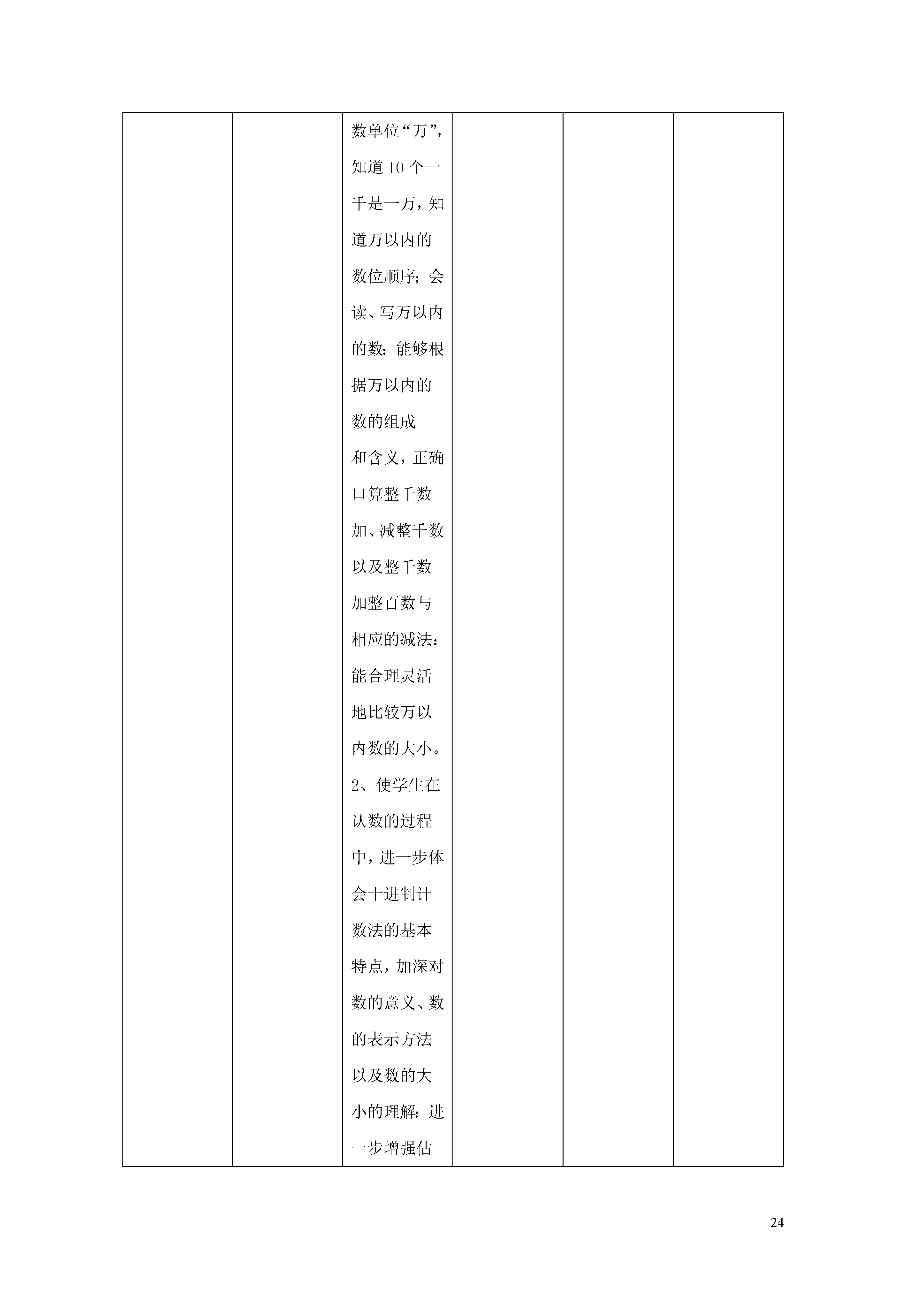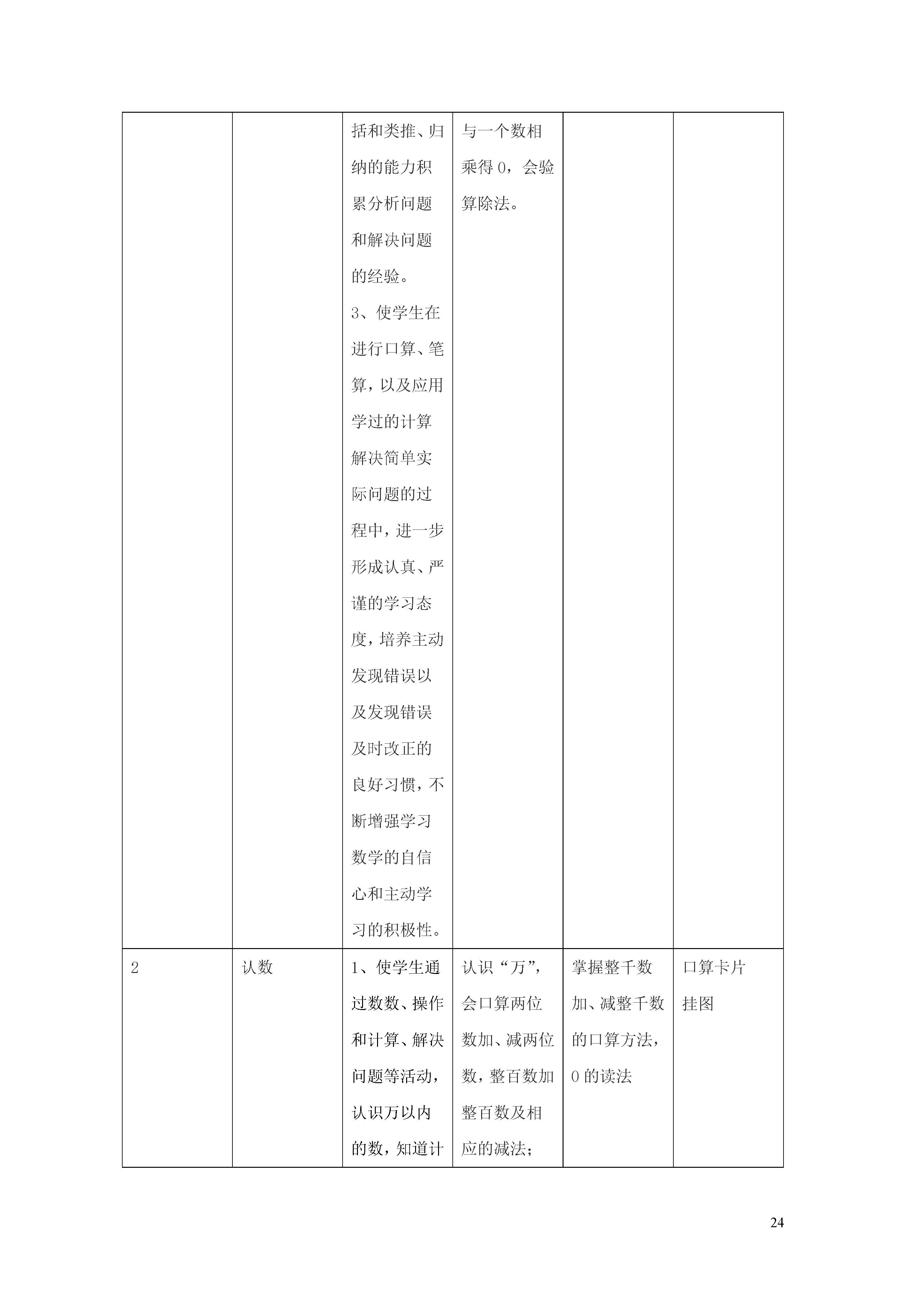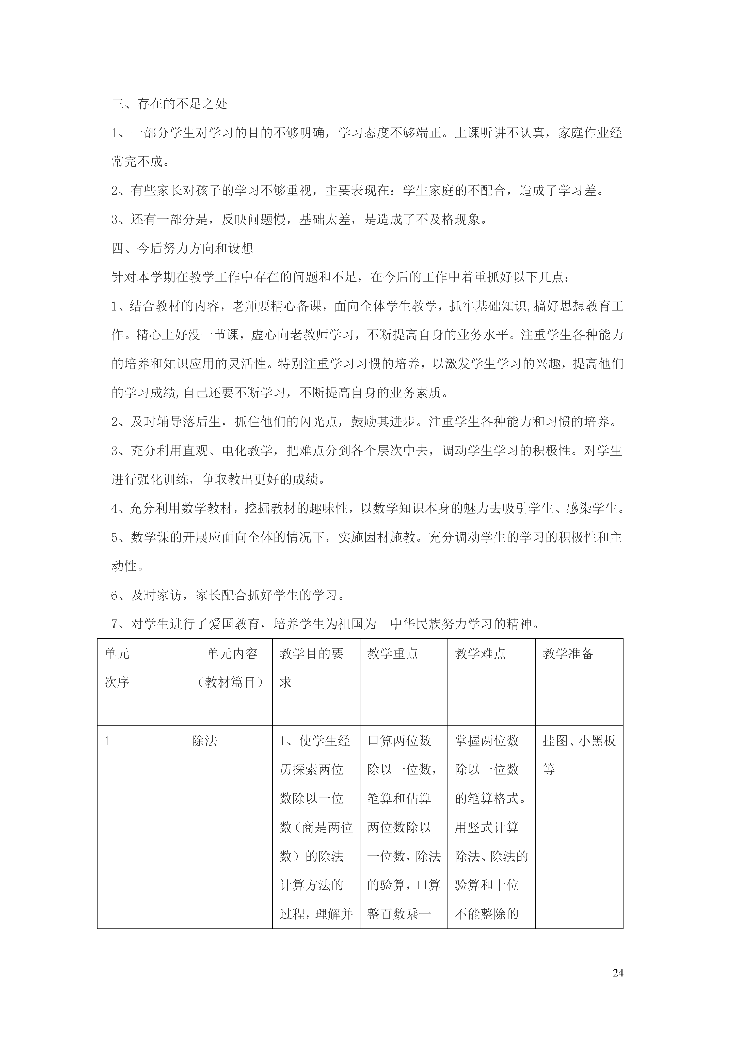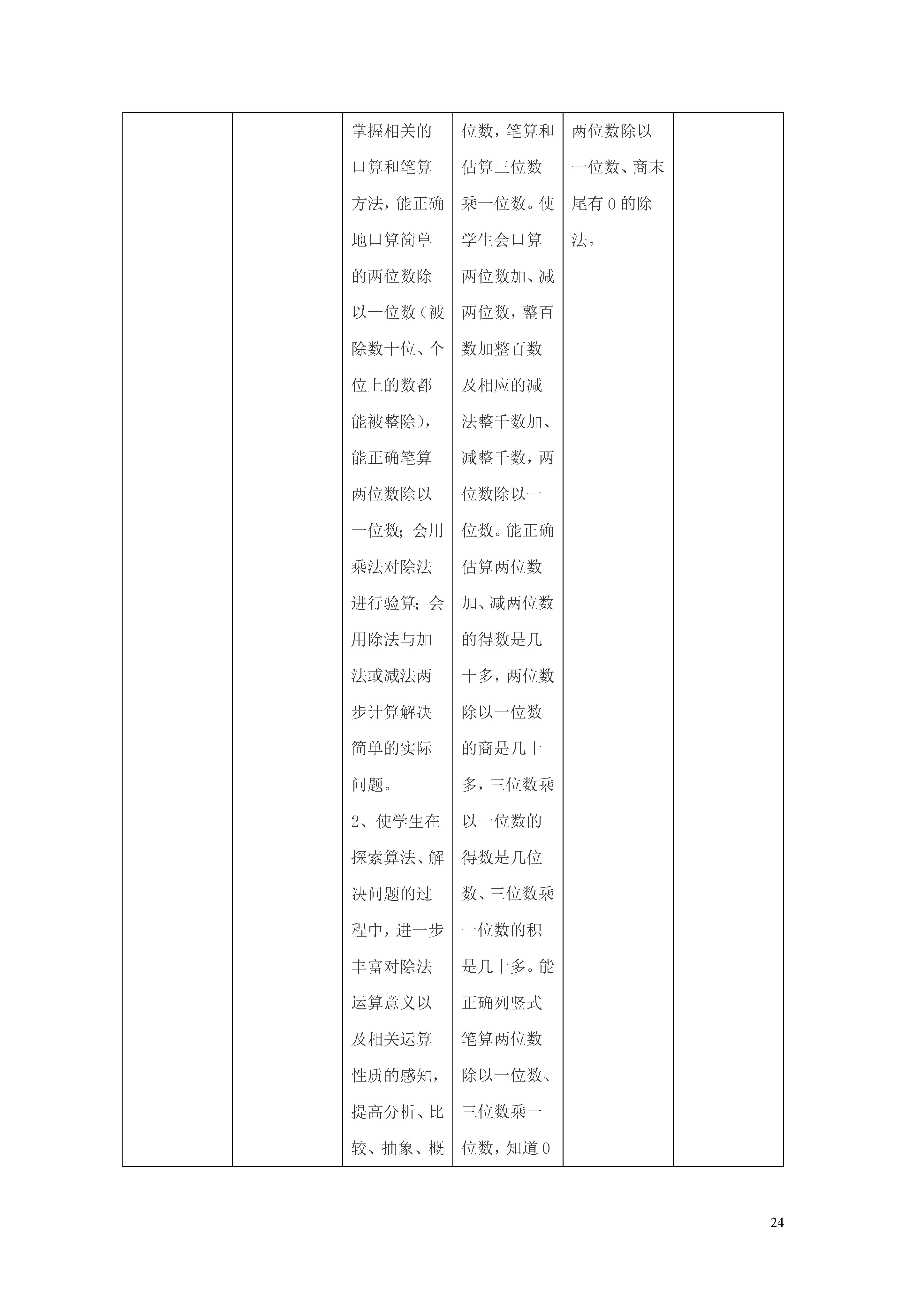 24教学计划(6)一、学生基本情况这个班的学生绝大部分上课能够专心听讲,积极思考并回答老师提出的问题,下课能够按要求完成作业,具有良好的学习习惯。但是也有一部分学生的学习习惯较差,有的上课精力不集中,思想经常开小差,纪律性不强。老师布置的作业经常完不成,以致学习成绩较差,为了激发学生的数学学习兴趣,更好的培养学生的科学世界观,针对两个班级的实际情况,对上学期的教学情况做如下总结。二、主要成绩和经验1、针对学生的差异和年龄特点,对学生进行了各方面的教育,使学生的知识、能力有了较大提高。2认真钻研教材、精心备课,充分利用直观、电化教学,把难点分到各个层次中去,调动学生学习的积极性。3、本学期我对学生注重加强了思想教育,培养了良好的学习习惯,培养自我检查的能力。4、加强了对后进生的辅导,使本学期大部分学生掌握了知识、技能,他们的学习有了不同程度的进步和提高。。5、使学生学好数学知识,在教学中重点做到精讲多练,重视运用教具、学具和电化教学手段。认真备好每一节课6、通过练习课的精心设计,使学生掌握知识,形成技能,发展智力。所以我认真上好练习课,讲究练习方式,提高练习效率。7、注重专题研究,积极参加学校组织的教学教研活动,认真组织好练习和复习,努力提高教育、教学质量。8、重视了与家庭教育相配合,通过家访、家长会等不同方式,与家长密切联系,对个别学生的教育着重放在学生非智力因素的挖掘上,使他们有了明显的进步和提高。9、注重培养了学生的学生习惯,针对这一方面,本学期重点抓了学生,每做一件事情,每做一道题,要求学生要有耐心,培养了认真做好每一件事的好习惯。10、通过一些活动,统计、数据等对学生进行了爱国教育,是学生有了为祖国为中华民族努力学习的精神。三、存在的不足之处1、一部分学生对学习的目的不够明确,学习态度不够端正。上课听讲不认真,家庭作业经常完不成。2、有些家长对孩子的学习不够重视,主要表现在:学生家庭的不配合,造成了学习差。3、还有一部分是,反映问题慢,基础太差,是造成了不及格现象。四、今后努力方向和设想针对本学期在教学工作中存在的问题和不足,在今后的工作中着重抓好以下几点:1、结合教材的内容,老师要精心备课,面向全体学生教学,抓牢基础知识,搞好思想教育工作。精心上好没一节课,虚心向老教师学习,不断提高自身的业务水平。注重学生各种能力的培养和知识应用的灵活性。特别注重学习习惯的培养,以激发学生学习的兴趣,提高他们的学习成绩,自己还要不断学习,不断提高自身的业务素质。2、及时辅导落后生,抓住他们的闪光点,鼓励其进步。注重学生各种能力和习惯的培养。3、充分利用直观、电化教学,把难点分到各个层次中去,调动学生学习的积极性。对学生进行强化训练,争取教出更好的成绩。4、充分利用数学教材,挖掘教材的趣味性,以数学知识本身的魅力去吸引学生、感染学生。5、数学课的开展应面向全体的情况下,实施因材施教。充分调动学生的学习的积极性和主动性。6、及时家访,家长配合抓好学生的学习。7、对学生进行了爱国教育,培养学生为祖国为中华民族努力学习的精神。单元次序单元内容(教材篇目)教学目的要求教学重点教学难点教学准备1除法使学生经历探索两位数除以一位数(商是两位数)的除法计算方法的过程,理解并掌握相关的口算和笔算方法,能正确地口算简单的两位数除以一位数(被除数十位、个位上的数都能被整除),能正确笔算两位数除以一位数;会用乘法对除法进行验算;会用除法与加法或减法两步计算解决简单的实际问题。使学生在探索算法、解决问题的过程中,进一步丰富对除法运算意义以及相关运算性质的感知,提高分析、比较、抽象、概括和类推、归纳的能力积累分析问题和解决问题的经验。3、使学生在进行口算、笔算,以及应用学过的计算解决简单实际问题的过程中,进一步形成认真、严谨的学习态度,培养主动发现错误以及发现错误及时改正的良好习惯,不断增强学习数学的自信心和主动学习的积极性。口算两位数除以一位数,笔算和估算两位数除以一位数,除法的验算,口算整百数乘一位数,笔算和估算三位数乘一位数。使学生会口算两位数加、减两位数,整百数加整百数及相应的减法整千数加、减整千数,两位数除以一位数。能正确估算两位数加、减两位数的得数是几十多,两位数除以一位数的商是几十多,三位数乘以一位数的得数是几位数、三位数乘一位数的积是几十多。能正确列竖式笔算两位数除以一位数、三位数乘一位数,知道0与一个数相乘得0,会验算除法。掌握两位数除以一位数的笔算格式。用竖式计算除法、除法的验算和十位不能整除的两位数除以一位数、商末尾有0的除法。挂图、小黑板等2认数使学生通过数数、操作和计算、解