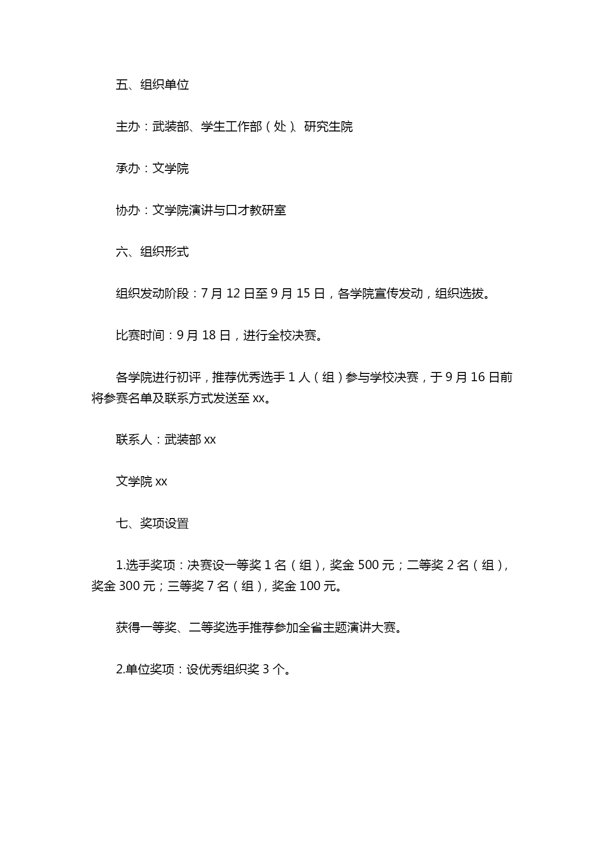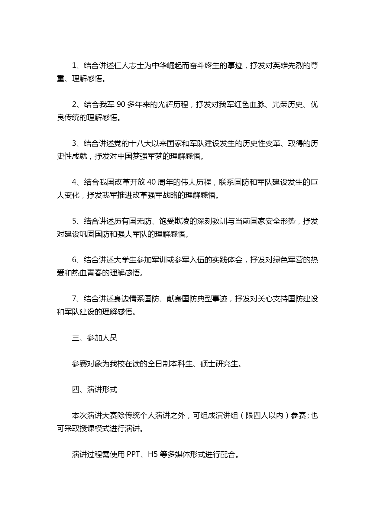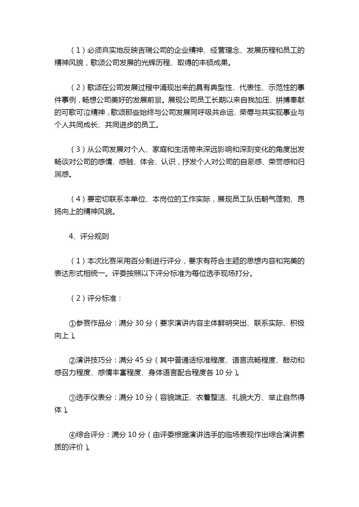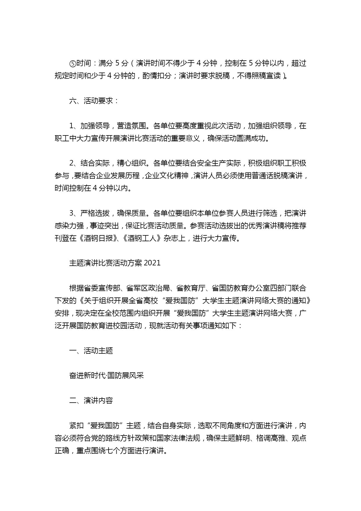 主题演讲比赛活动方案2021为了更好地弘扬公司的企业文化,让更多的员工可以更好的感知到公司的企业文化,特意举办这样的一次“我与企业共成长”的演讲比赛。一、活动背景:结合xx公司“铁山精神”,为充分展示青年职工的精神风貌,进一步激发广大员工爱岗敬业、奉献的热情,推动公司又好又快发展,公司团总支决定组织开展“我与企业共成长”为主题的演讲比赛。二、活动主题:“我与企业共成长”三、活动对象:xx公司全体团员青年四、活动组织:xx公司团总支五、活动具体安排:1、活动地点xx公司会议室2、活动时间:20xx年x月x日3、演讲稿要求(1)必须真实地反映吉瑞公司的企业精神、经营理念、发展历程和员工的精神风貌,歌颂公司发展的光辉历程、取得的丰硕成果。(2)歌颂在公司发展过程中涌现出来的具有典型性、代表性、示范性的事件事例,畅想公司美好的发展前景。展现公司员工长期以来自我加压、拼搏奉献的可歌可泣精神,歌颂那些始终与公司发展同呼吸共命运、荣辱与共实现事业与个人共同成长、共同进步的员工。(3)从公司发展对个人、家庭和生活带来深远影响和深刻变化的角度出发畅谈对公司的感情、感触、体会、认识,抒发个人对公司的自豪感、荣誉感和归属感。(4)要密切联系本单位、本岗位的工作实际,展现员工队伍朝气蓬勃、昂扬向上的精神风貌。4、评分规则(1)本次比赛采用百分制进行评分,要求有符合主题的思想内容和完美的表达形式相统一。评委按照以下评分标准为每位选手现场打分。(2)评分标准:①参赛作品分:满分30分(要求演讲内容主体鲜明突出、联系实际、积极向上)。②演讲技巧分:满分45分(其中普通话标准程度、语言流畅程度、鼓动和感召力程度、感情丰富程度、身体语言配合程度各10分)。③选手仪表分:满分10分(容貌端正、衣着整洁、礼貌大方、举止自然得体)。④综合评分:满分10分(由评委根据演讲选手的临场表现作出综合演讲素质的评价)。⑤时间:满分5分(演讲时间不得少于4分钟,控制在5分钟以内,超过规定时间和少于4分钟的,酌情扣分;演讲时要求脱稿,不得照稿宣读)。六、活动要求:1、加强领导,营造氛围。各单位要高度重视此次活动,加强组织领导,在职工中大力宣传开展演讲比赛活动的重要意义,确保活动圆满成功。2、结合实际,精心组织。各单位要结合安全生产实际,积极组织职工积极参与,要结合企业发展历程,企业文化精神,演讲人员必须使用普通话脱稿演讲,时间控制在4分钟以内。3、严格选拔,确保质量。各单位要组织本单位参赛人员进行筛选,把演讲感染力强,事迹突出,保证比赛活动质量。参赛活动选拔出的优秀演讲稿将推荐刊登在《酒钢日报》、《酒钢工人》杂志上,进行大力宣传。主题演讲比赛活动方案2021根据省委宣传部、省军区政治局、省教育厅、省国防教育办公室四部门联合下发的《关于组织开展全省高校“爱我国防”大学生主题演讲网络大赛的通知》安排,现决定在全校范围内组织开展“爱我国防”大学生主题演讲网络大赛,广泛开展国防教育进校园活动,现就活动有关事项通知如下:一、活动主题奋进新时代·国防展风采二、演讲内容紧扣“爱我国防”主题,结合自身实际,选取不同角度和方面进行演讲,内容必须符合党的路线方针政策和国家法律法规,确保主题鲜明、格调高雅、观点正确,重点围绕七个方面进行演讲。1、结合讲述仁人志士为中华崛起而奋斗终生的事迹,抒发对英雄先烈的尊重、理解感悟。2、结合我军90多年来的光辉历程,抒发对我军红色血脉、光荣历史、优良传统的理解感悟。3、结合讲述党的十八大以来国家和军队建设发生的历史性变革、取得的历史性成就,抒发对中国梦强军梦的理解感悟。4、结合我国改革开放40周年的伟大历程,联系国防和军队建设发生的巨大变化,抒发我军推进改革强军战略的理解感悟。5、结合讲述历有国无防、饱受欺凌的深刻教训与当前国家安全形势,抒发对建设巩固国防和强大军队的理解感悟。6、结合讲述大学生参加军训或参军入伍的实践体会,抒发对绿色军营的热爱和热血青春的理解感悟。7、结合讲述身边情系国防、献身国防典型事迹,抒发对关心支持国防建设和军队建设的理解感悟。三、参加人员参赛对象为我校在读的全日制本科生、硕士研究生。四、演讲形式本次演讲大赛除传统个人演讲之外,可组成演讲组(限四人以内)参赛;也可采取授课模式进行演讲。演讲过程需使用PPT、H5等多媒体形式进行配合。五、组织单位主办:武装部、学生工作部(处)、研究生院承办:文学院协办:文学院演讲与口才教研室六、组织形式组织发动阶段:7月12日至9月15日,各学院宣传发动,组织选拔。比赛时间:9月18日,进行全校决赛。各学院进行初评,推荐优秀选手1人(组)参与学校决赛,于9月16日前将参赛名单及联系方式发送至xx。联系人:武装部xx文学院xx七、奖项设置1.选手奖项:决赛设一等奖1名(组),奖金500元;二等奖2名(组),奖金