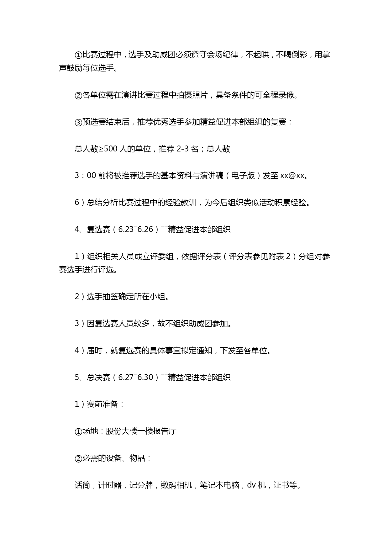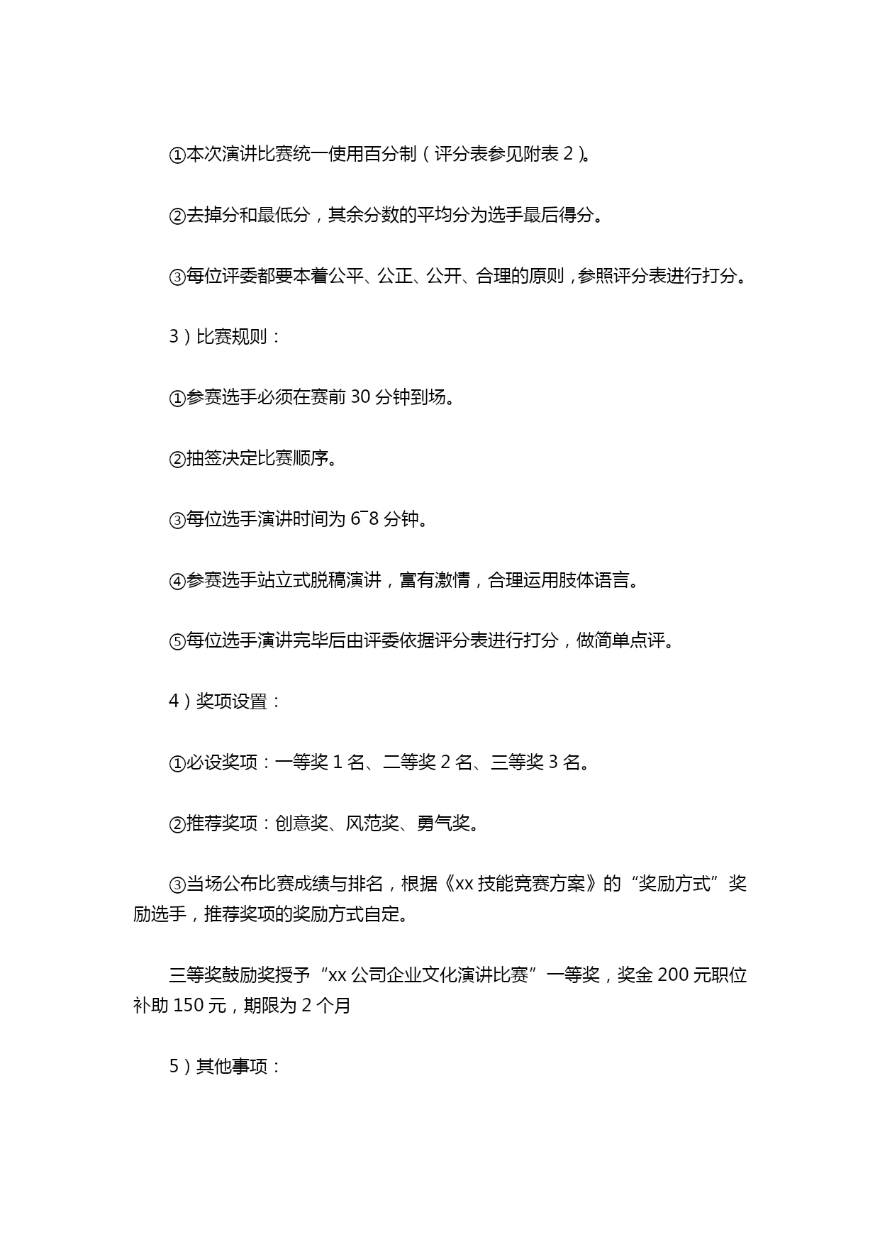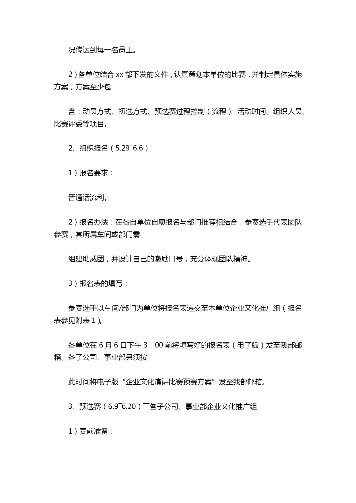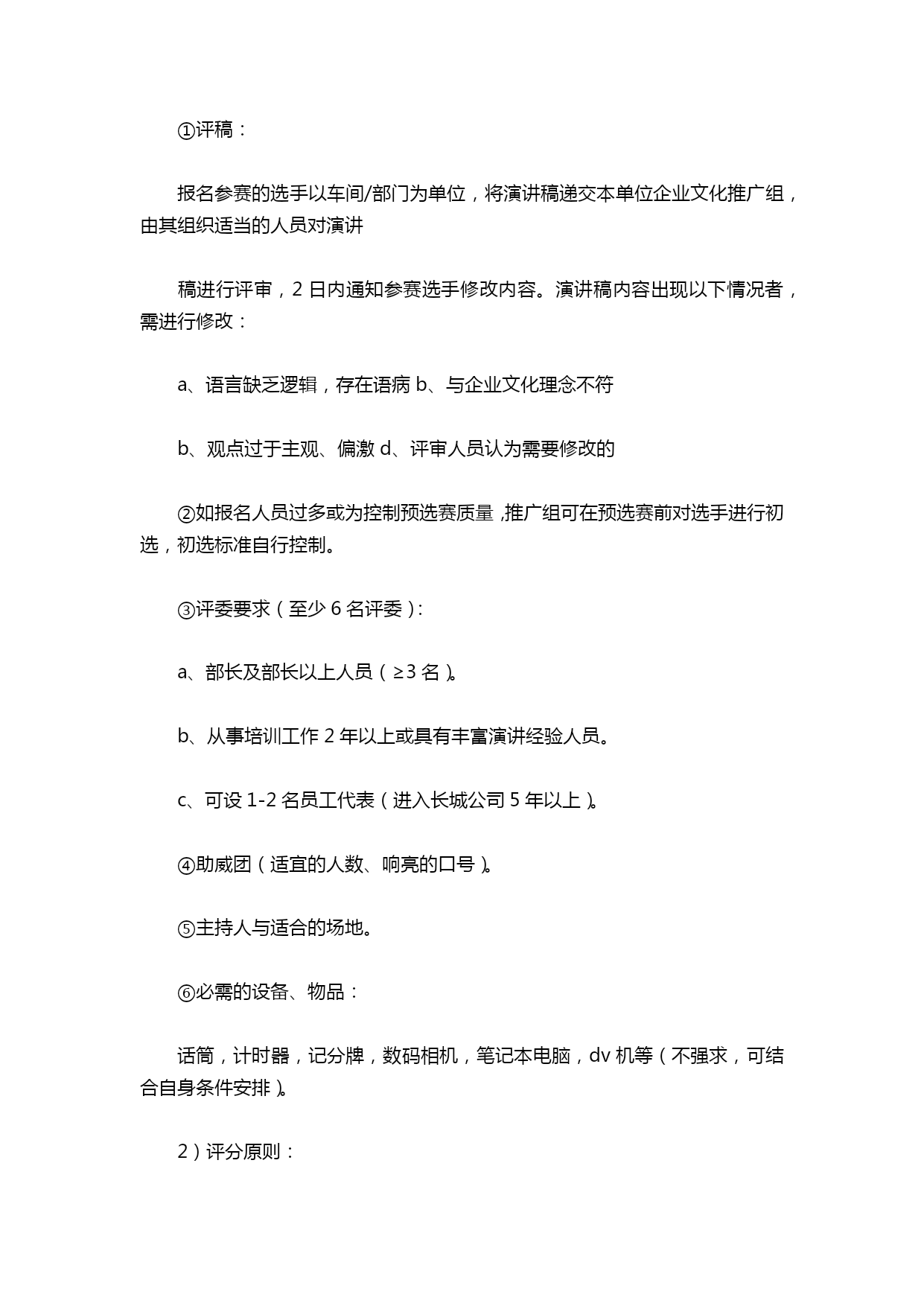 公司演讲比赛策划方案进一步增强员工对企业的认同感与归属感。宣传公司企业文化,丰富员工业余文化生活,浓厚学习氛围。提高员工综合素质,展现xx人风采。一、活动范围股份公司及各子公司、事业部。二、活动时间20xx年5月26日――6月30日。三、组织机构主办单位:xx部;协办单位:各子公司、事业部企业文化推广组。四、演讲主题本次演讲的主题为《我心目中的xx――企业文化演讲比赛》,参赛选手以企业文化理念为核心内容,撰写演讲稿,题目自拟、具有鲜明特点。五、活动流程及说明1、赛前动员(5.26―5.28)1)发放企业文化演讲比赛方案与实施细则等相关文件,各单位通过通知、班前会等形式将报名参赛情况传达到每一名员工。2)各单位结合xx部下发的文件,认真策划本单位的比赛,并制定具体实施方案,方案至少包含:动员方式、初选方式、预选赛过程控制(流程)、活动时间、组织人员、比赛评委等项目。2、组织报名(5.29―6.6)1)报名要求:普通话流利。2)报名办法:在各自单位自愿报名与部门推荐相结合,参赛选手代表团队参赛,其所属车间或部门需组建助威团,并设计自己的激励口号,充分体现团队精神。3)报名表的填写:参赛选手以车间/部门为单位将报名表递交至本单位企业文化推广组(报名表参见附表1)。各单位在6月6日下午3:00前将填写好的报名表(电子版)发至我部邮箱。各子公司、事业部另须按此时间将电子版“企业文化演讲比赛预赛方案”发至我部邮箱。3、预选赛(6.9―6.20)――各子公司、事业部企业文化推广组1)赛前准备:①评稿:报名参赛的选手以车间/部门为单位,将演讲稿递交本单位企业文化推广组,由其组织适当的人员对演讲稿进行评审,2日内通知参赛选手修改内容。演讲稿内容出现以下情况者,需进行修改:a、语言缺乏逻辑,存在语病b、与企业文化理念不符b、观点过于主观、偏激d、评审人员认为需要修改的②如报名人员过多或为控制预选赛质量,推广组可在预选赛前对选手进行初选,初选标准自行控制。③评委要求(至少6名评委):a、部长及部长以上人员(≥3名)。b、从事培训工作2年以上或具有丰富演讲经验人员。c、可设1-2名员工代表(进入长城公司5年以上)。④助威团(适宜的人数、响亮的口号)。⑤主持人与适合的场地。⑥必需的设备、物品:话筒,计时器,记分牌,数码相机,笔记本电脑,dv机等(不强求,可结合自身条件安排)。2)评分原则:①本次演讲比赛统一使用百分制(评分表参见附表2)。②去掉分和最低分,其余分数的平均分为选手最后得分。③每位评委都要本着公平、公正、公开、合理的原则,参照评分表进行打分。3)比赛规则:①参赛选手必须在赛前30分钟到场。②抽签决定比赛顺序。③每位选手演讲时间为6―8分钟。④参赛选手站立式脱稿演讲,富有激情,合理运用肢体语言。⑤每位选手演讲完毕后由评委依据评分表进行打分,做简单点评。4)奖项设置:①必设奖项:一等奖1名、二等奖2名、三等奖3名。②推荐奖项:创意奖、风范奖、勇气奖。③当场公布比赛成绩与排名,根据《xx技能竞赛方案》的“奖励方式”奖励选手,推荐奖项的奖励方式自定。三等奖鼓励奖授予“xx公司企业文化演讲比赛”一等奖,奖金200元职位补助150元,期限为2个月5)其他事项:①比赛过程中,选手及助威团必须遵守会场纪律,不起哄,不喝倒彩,用掌声鼓励每位选手。②各单位需在演讲比赛过程中拍摄照片,具备条件的可全程录像。③预选赛结束后,推荐优秀选手参加精益促进本部组织的复赛:总人数≥500人的单位,推荐2-3名;总人数3:00前将被推荐选手的基本资料与演讲稿(电子版)发至xx@xx。6)总结分析比赛过程中的经验教训,为今后组织类似活动积累经验。4、复选赛(6.23―6.26)――精益促进本部组织1)组织相关人员成立评委组,依据评分表(评分表参见附表2)分组对参赛选手进行评选。2)选手抽签确定所在小组。3)因复选赛人员较多,故不组织助威团参加。4)届时,就复选赛的具体事宜拟定通知,下发至各单位。5、总决赛(6.27―6.30)――精益促进本部组织1)赛前准备:①场地:股份大楼一楼报告厅②必需的设备、物品:话筒,计时器,记分牌,数码相机,笔记本电脑,dv机,证书等。③评委组成:本部部长级2名,子公司部长级3名,特约评委1名。④助威团:a、每个助威团需有自己的口号,且口号简洁有力;b、精益促进本部根据入围决赛的选手数量确定每位选手的助威团人数。⑤主持人1-2名。2)评分原则:①本次演讲比赛统一使用百分制(评分表参见附表2)。②去掉分和最低分,取其余分数的平均值为选手最后得分。③每位评委都要本着公平、公正、公开、合理的原则,参照评分表进行打分。3)比赛规则:①参赛选手必须在赛前30分钟到场。②抽签决定比赛顺序。③每位选手演讲时间为6―8分钟。④参赛选手站立式脱稿演讲,富有激情,合理运